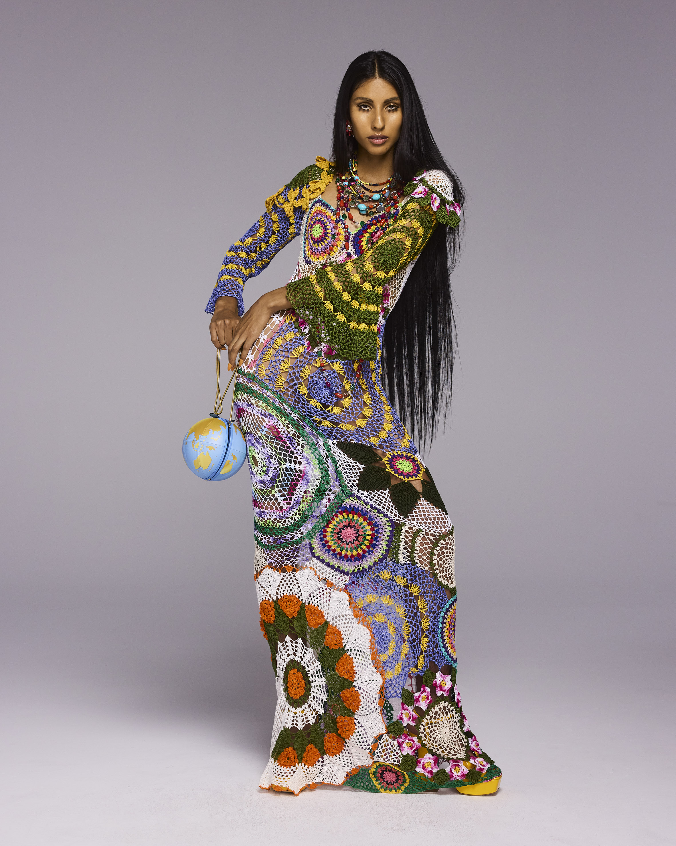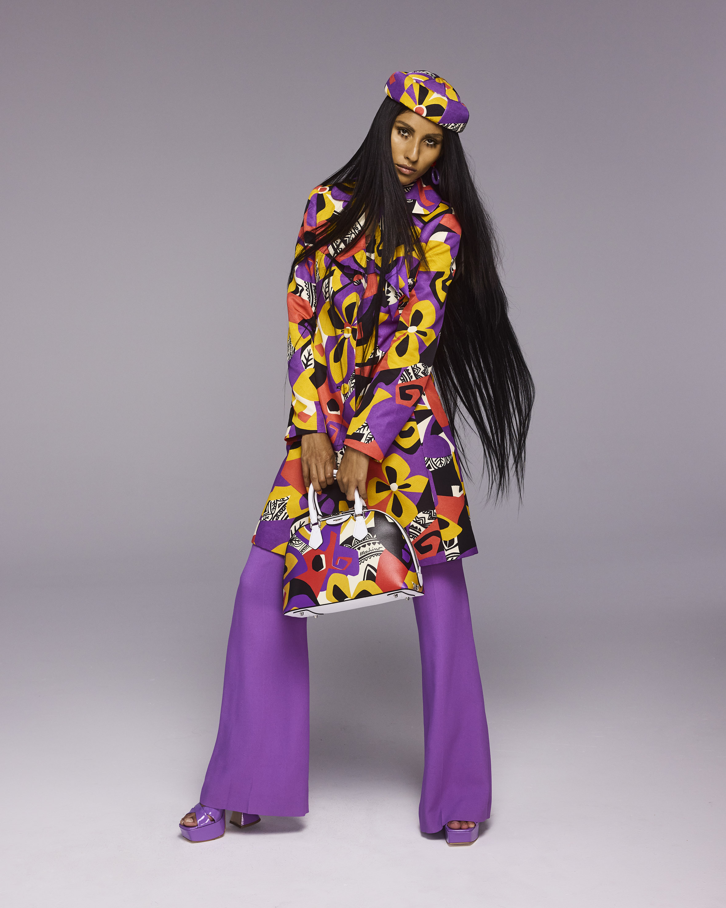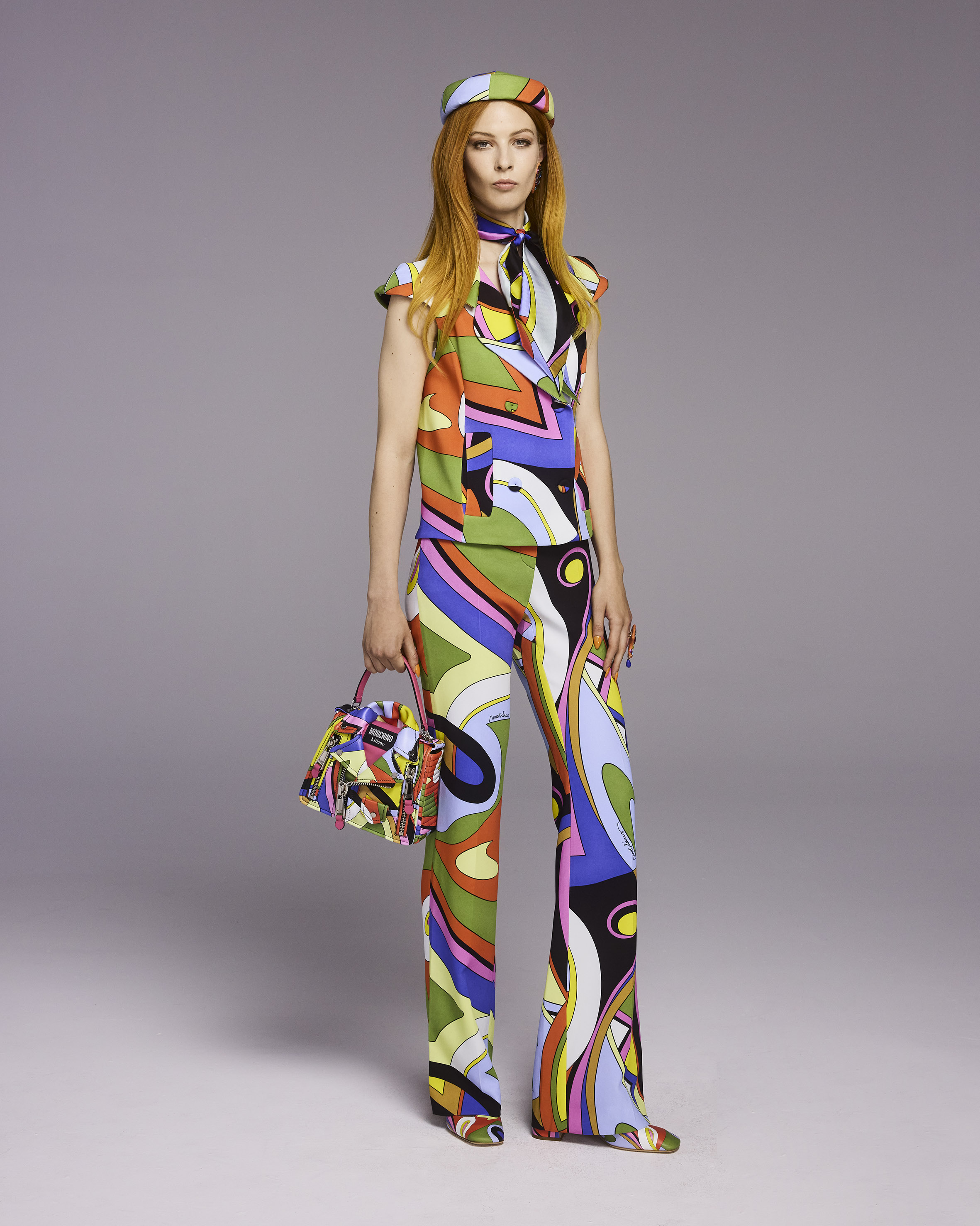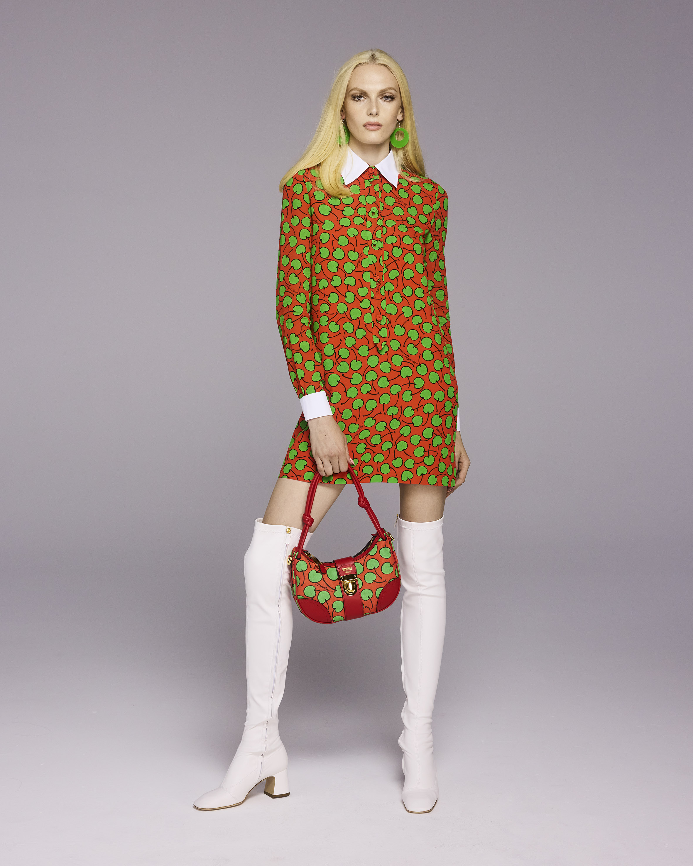 Crochet pieces add to the vintage vibes – in some cases, they’re quilted together, depicting flowers, smiley faces, and a version of Moschino’s teddy bear. Mixed in retro airport upholstery patterns, wavy jacquards and polka-dot embroideries enhance the atmosphere across a maxi-dress, a bra top, leggy trousers, a beret and much more. The accessories, too, take a trip down memory lane, particularly with Moschino-fied flight bags and Bakelite-bright costume jewelry.