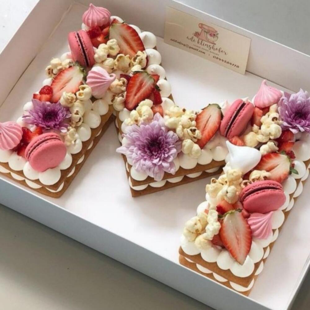A cake with a stunning design: the letter ‘M’ adorned with playful macarons, juicy strawberries, and fresh flowers is sure to impress. Its intricate details and delicious layers make it an unforgettable gift that’s bound to delight.