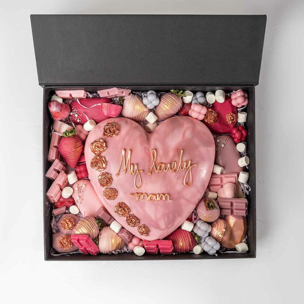 An indulgent selection to make her day even sweeter. This Mother’s Day box unveils an array of beautifully crafted confections, from chocolate-covered strawberries to heart-shaped chocolates, all thoughtfully designed to create a memorable experience.