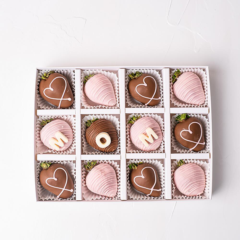Celebrate your mum with the sweet elegance of chocolate-covered strawberries, where playful heart designs and chocolate letters add a heartfelt touch. This box of 12 is perfect for sharing, offering a delightful mix of indulgence and love.