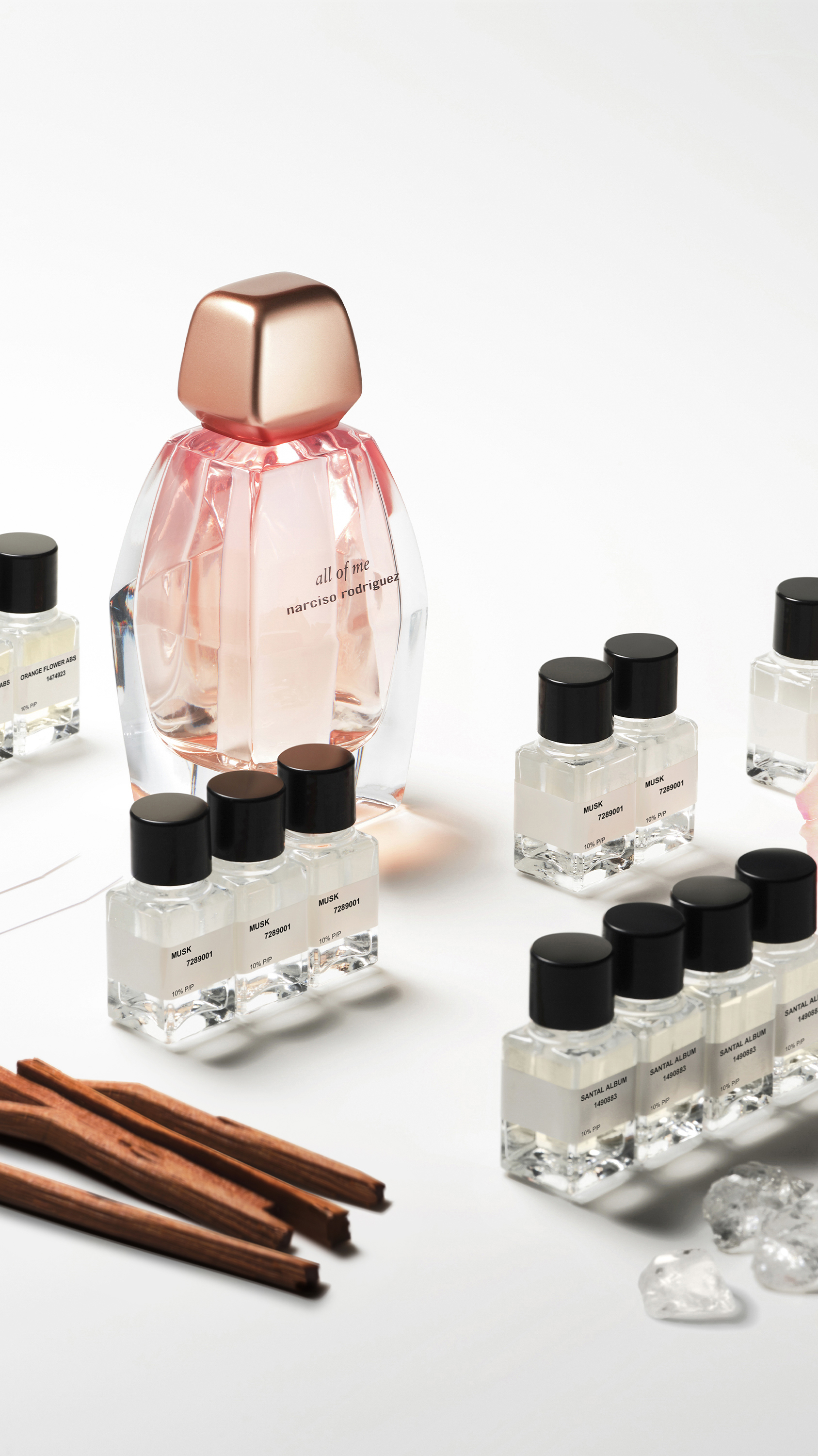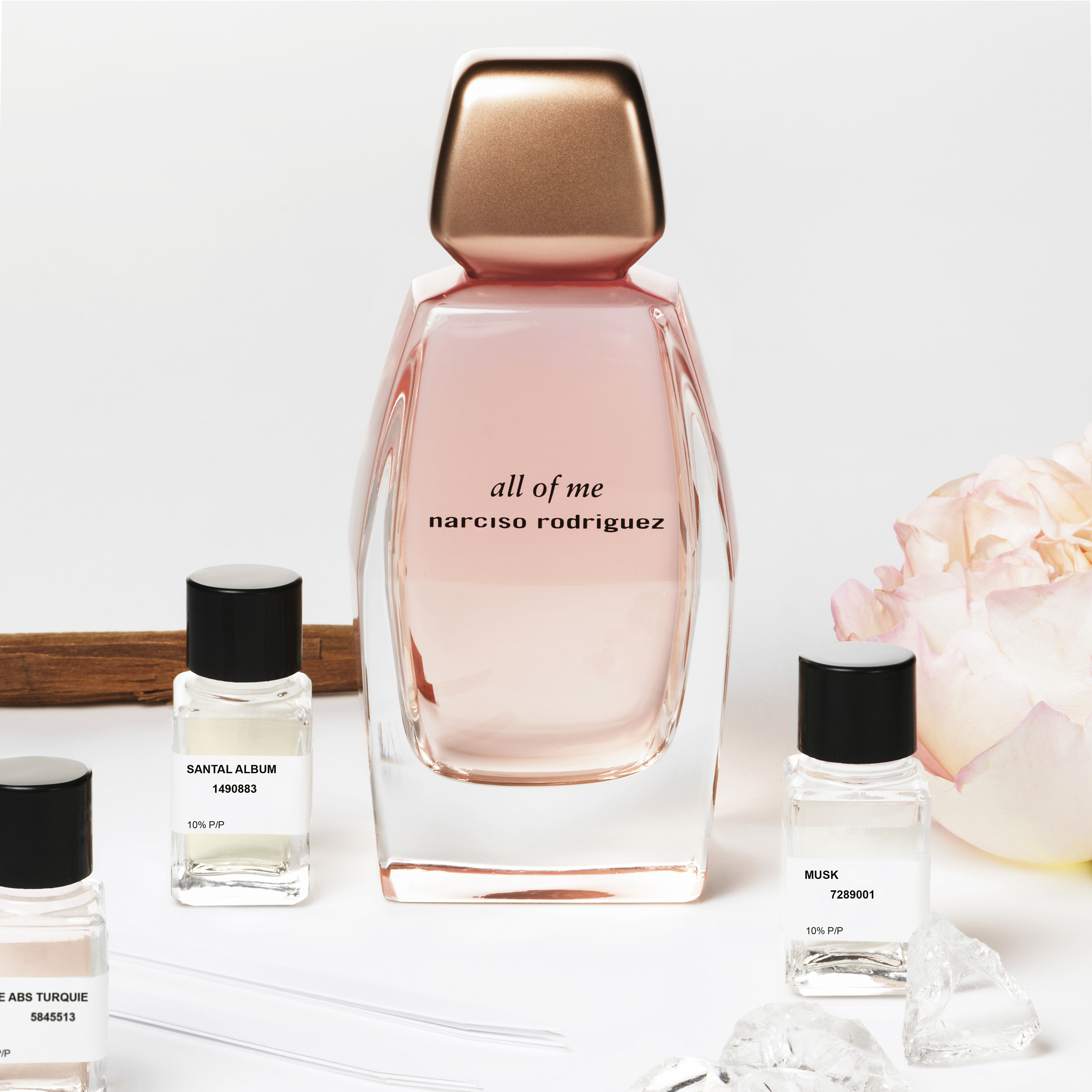 all of me is presented in an elegant prismatic bottle, conceived and sketched by Narciso Rodriguez himself. It maintains the architectural spirit that has become a signature of narciso rodriguez parfums, while bringing a distinctly feminine quality to the design. Geometric and yet curvaceous, the prismatic bottle symbolizes the many facets of each individual woman – the full spectrum of her colors diffracted through its kaleidoscopic form. Finished with a soft rose-gold cap, the all of me bottle is a precious object of artistry, radiating with a pure luminosity that celebrates the sublime blush-hued fragrance within.