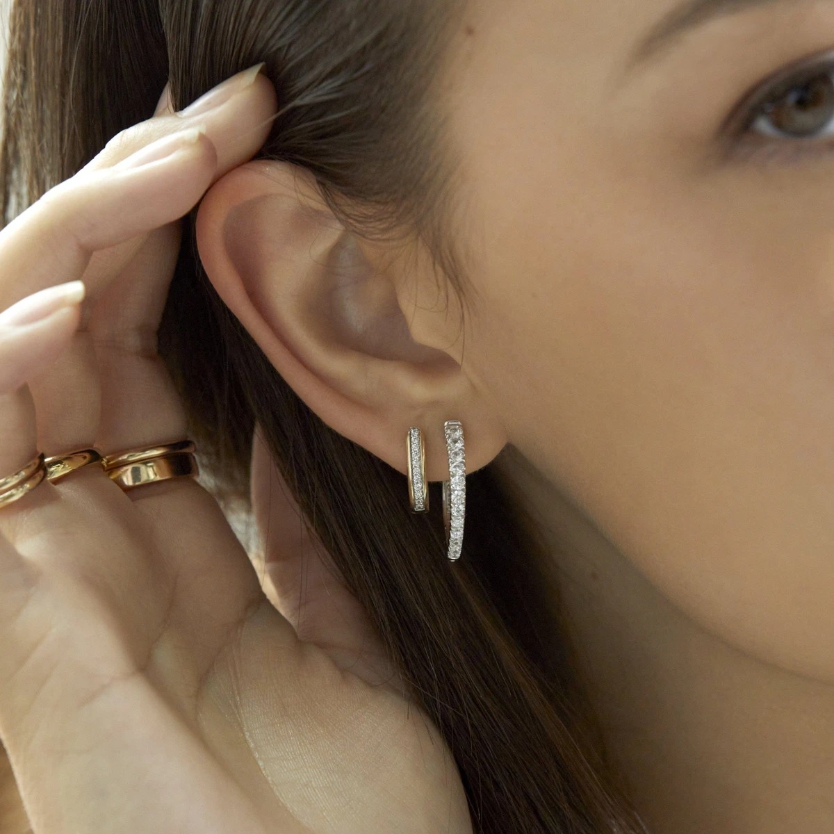 A bold band of prong-set round brilliant-cut diamonds goes around the ear lobe, held in place by a hinged ear post, the new Diamond Hoops are a perfect match.