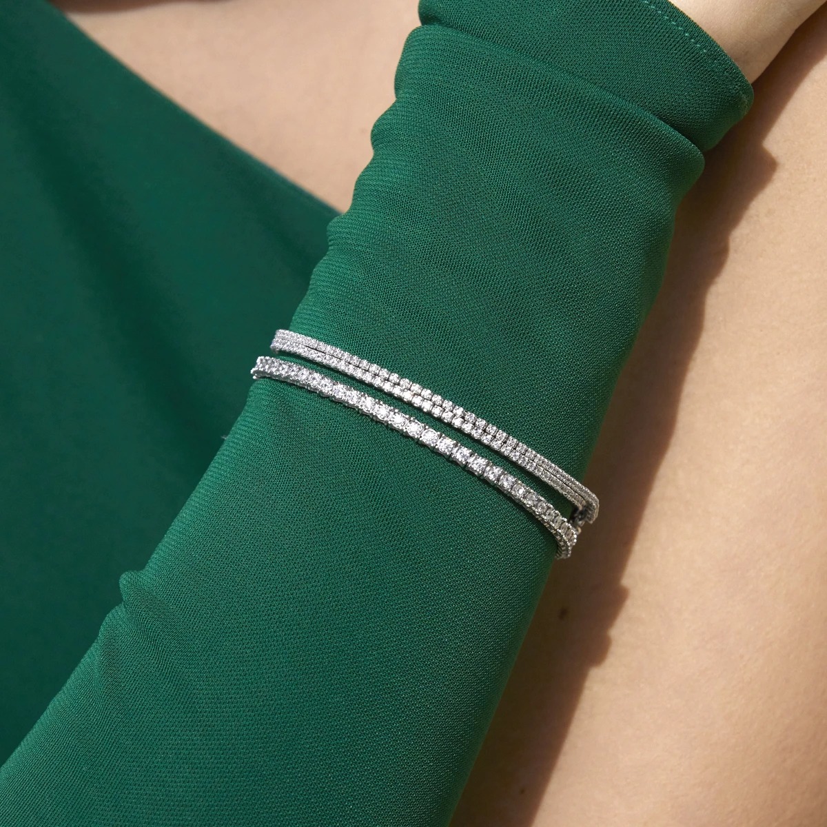 Designed and hand-assembled in classic sense of luxury that’s sure to have everyone in a racquet, one full carat of sparkling white round brilliant diamonds firmly clasps to encircle your wrist in glittering style, quality, and classic opulence. 54-62 diamonds, each hand selected and miracle set by master jewelers is a no strings attached good-call.