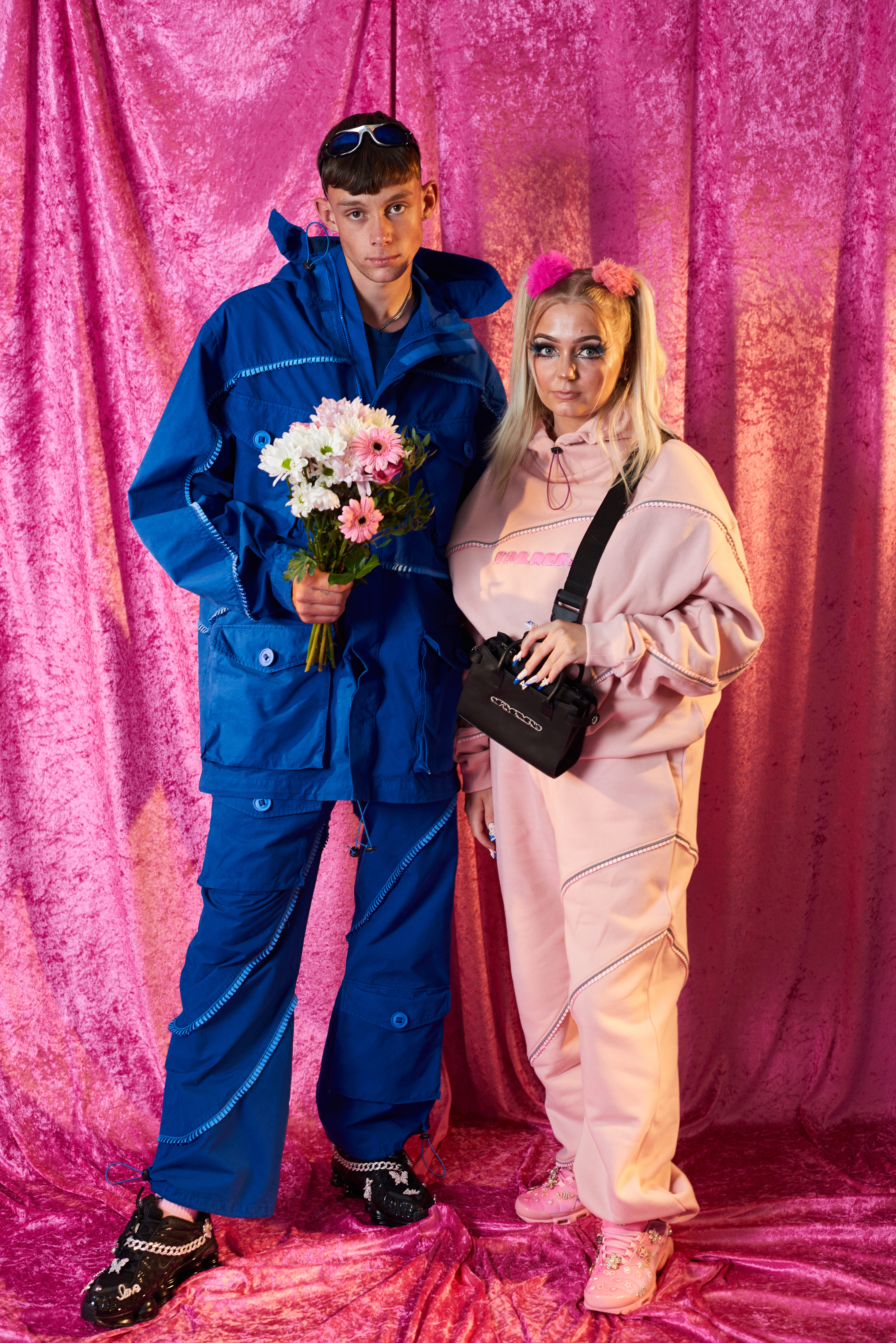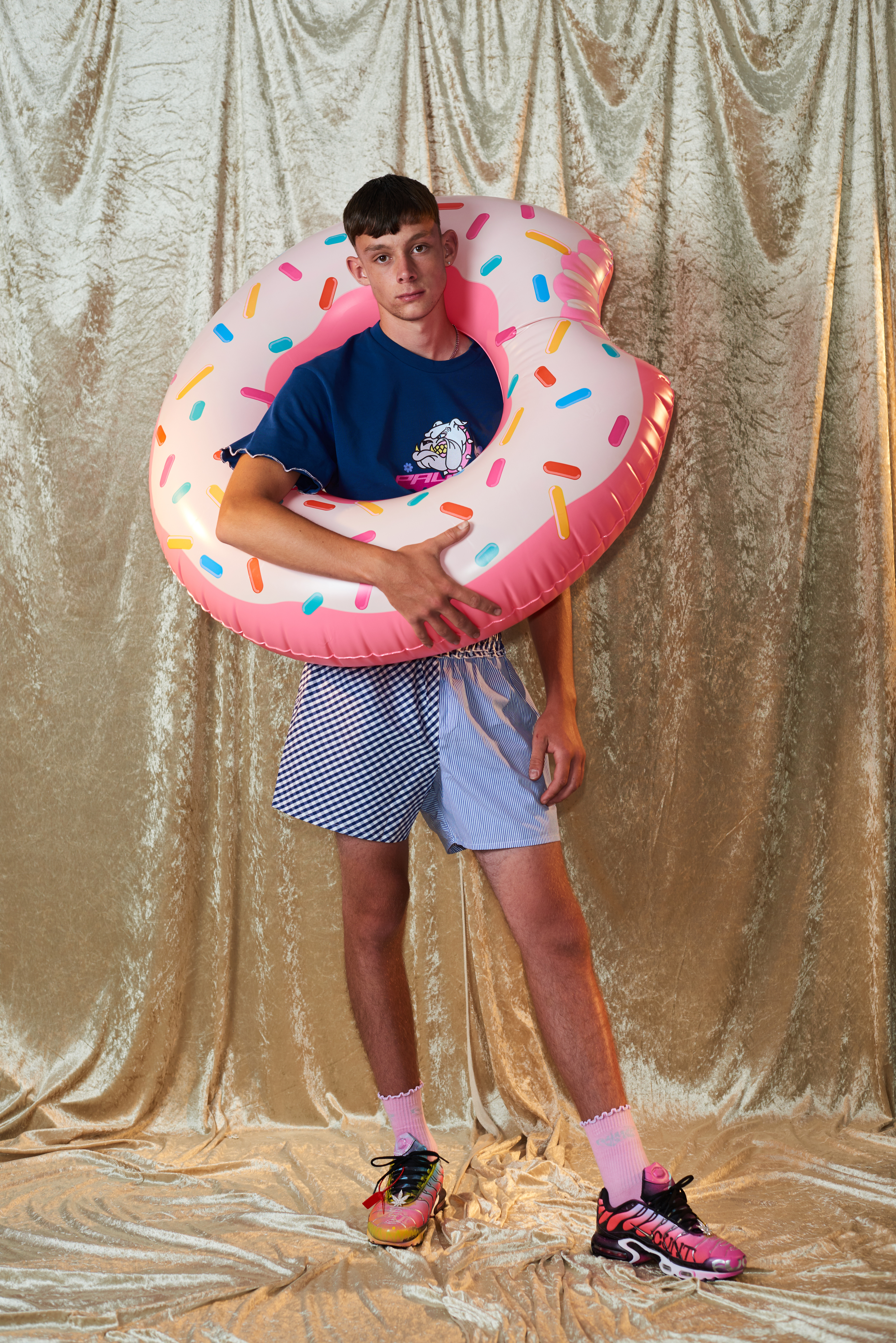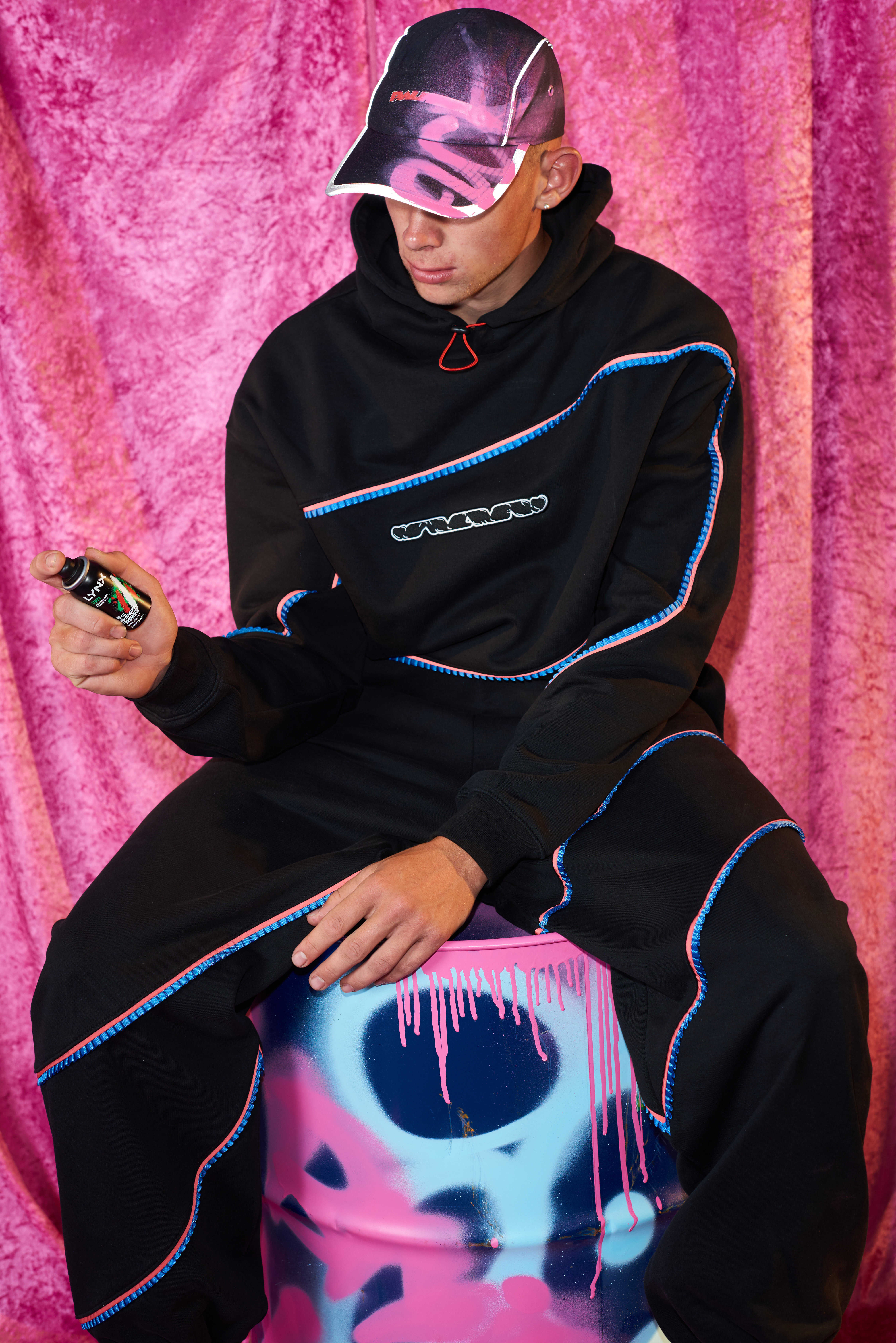 You will find new developments of PALMER-UK signature detailing such as the layered piping with frilly ribbon that appears across the tracksuits, floral buttons on the shirts, plus the ruffled plackets and waistbands; softening the tougher side of masculinity. A bright and playful colour palette; perfect for Spring/Summer, including graphic T’s & Tank Tops whose caricature artworks were designed by a local artist Dean Humphries, holding a sense of nostalgia as they point us to the noughties era and the ‘UK’s’ boy racing culture. Ubiquitous branding also comes through confidently this season, with the result showcasing numerous variations of PALMER embroidered logo’s but with an added cute twist of graphic hearts & flowers.
