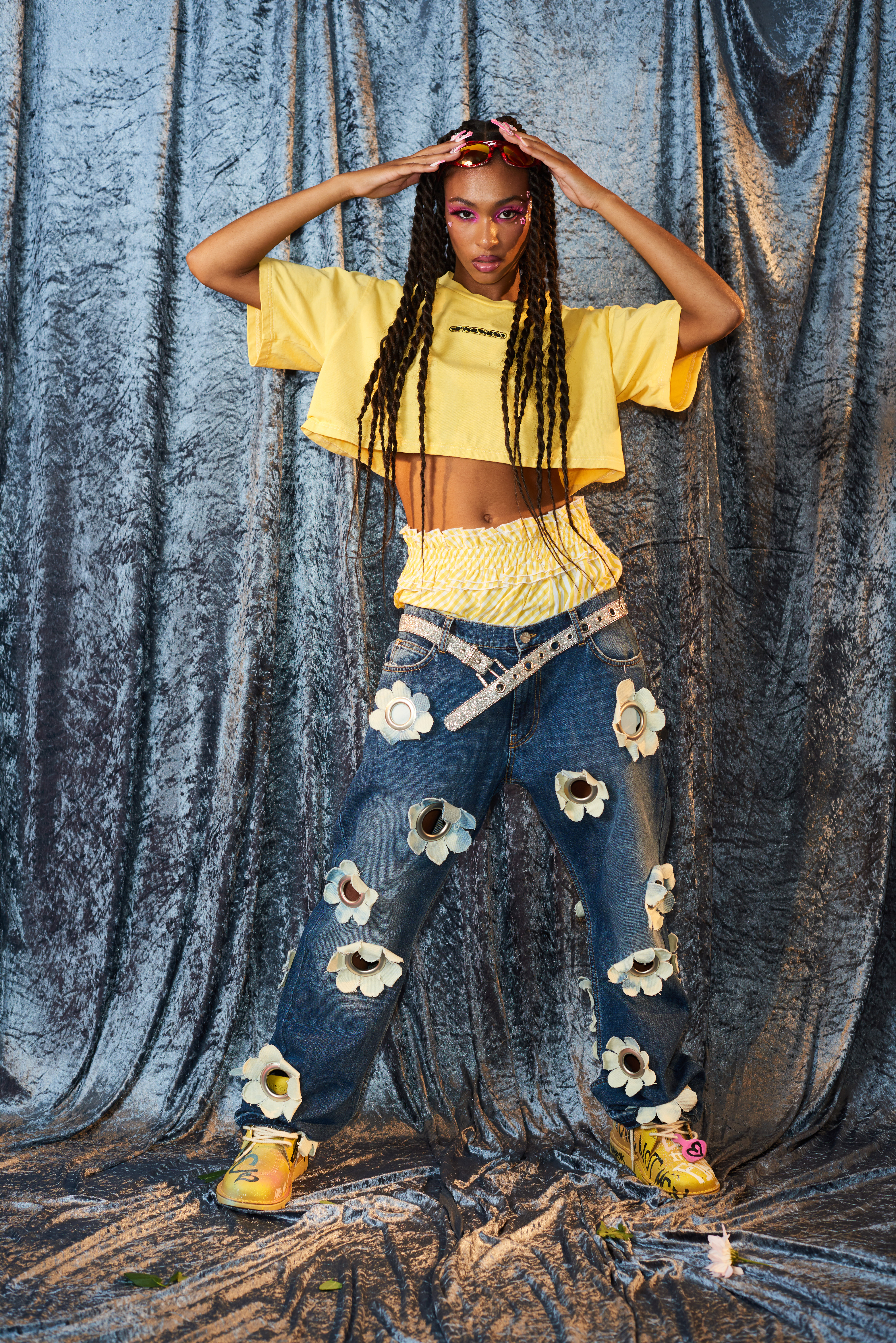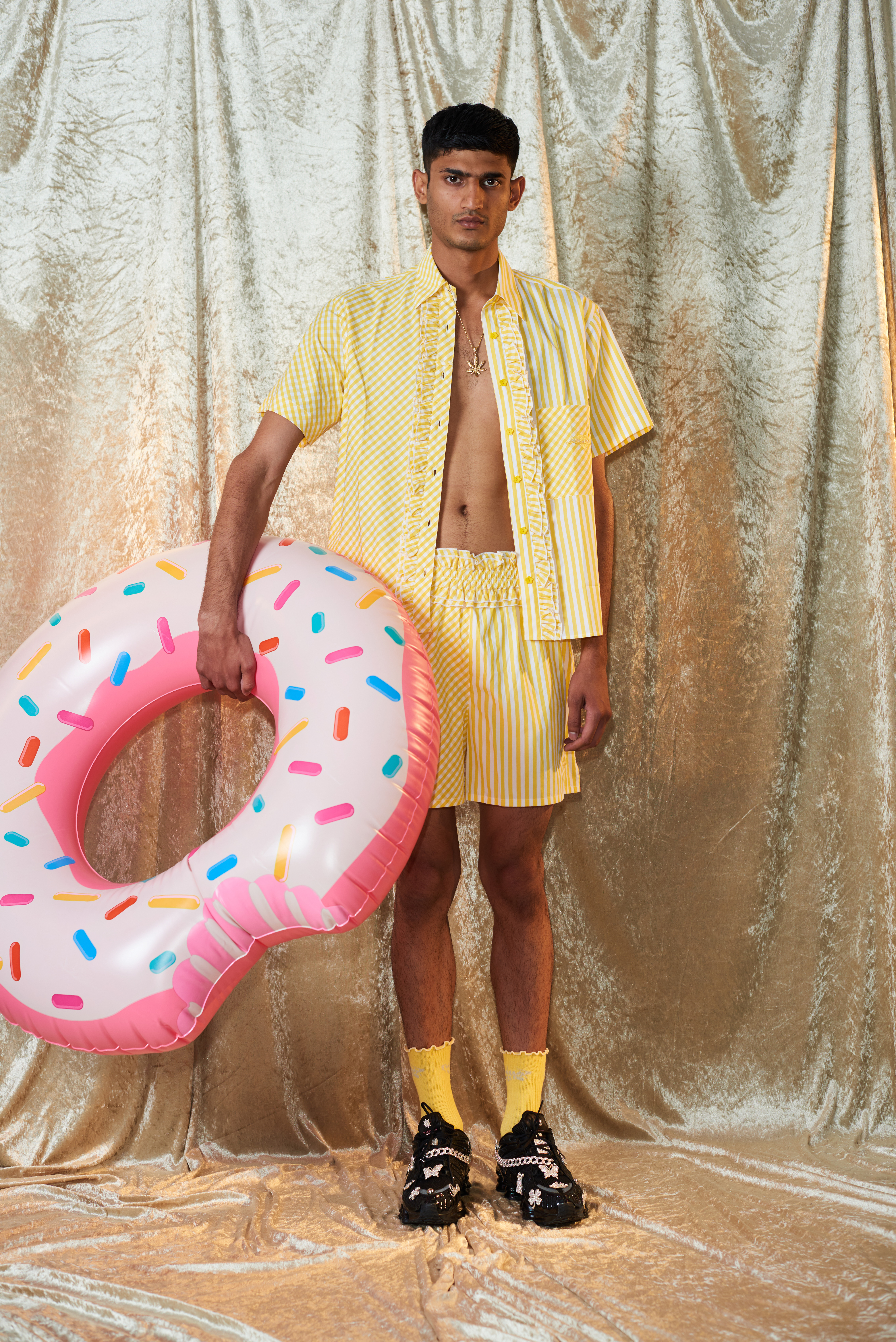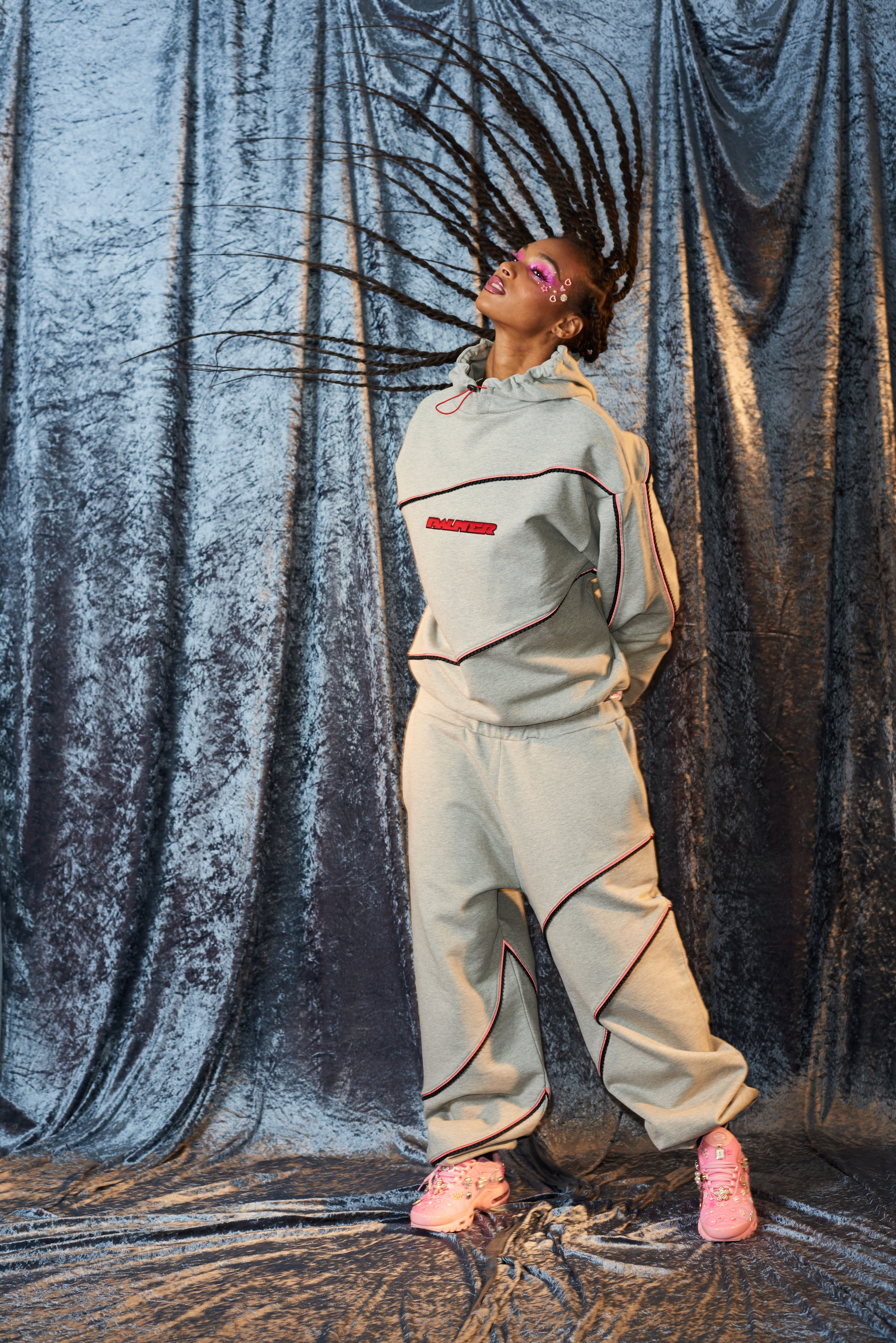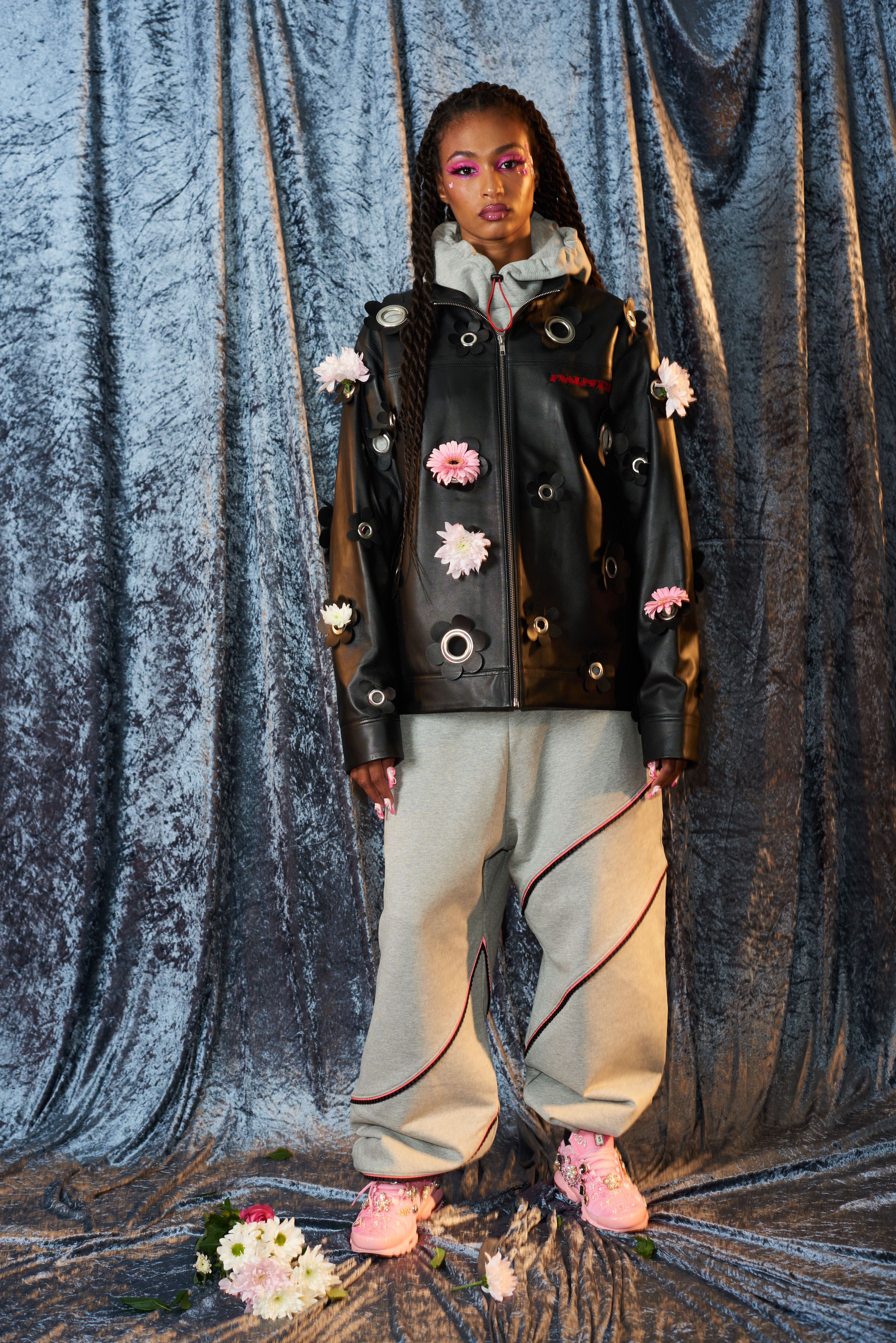 You will find new developments of PALMER-UK signature detailing such as the layered piping with frilly ribbon that appears across the tracksuits, floral buttons on the shirts, plus the ruffled plackets and waistbands; softening the tougher side of masculinity. A bright and playful colour palette; perfect for Spring/Summer, including graphic T’s & Tank Tops whose caricature artworks were designed by a local artist Dean Humphries, holding a sense of nostalgia as they point us to the noughties era and the ‘UK’s’ boy racing culture. Ubiquitous branding also comes through confidently this season, with the result showcasing numerous variations of PALMER embroidered logo’s but with an added cute twist of graphic hearts & flowers.