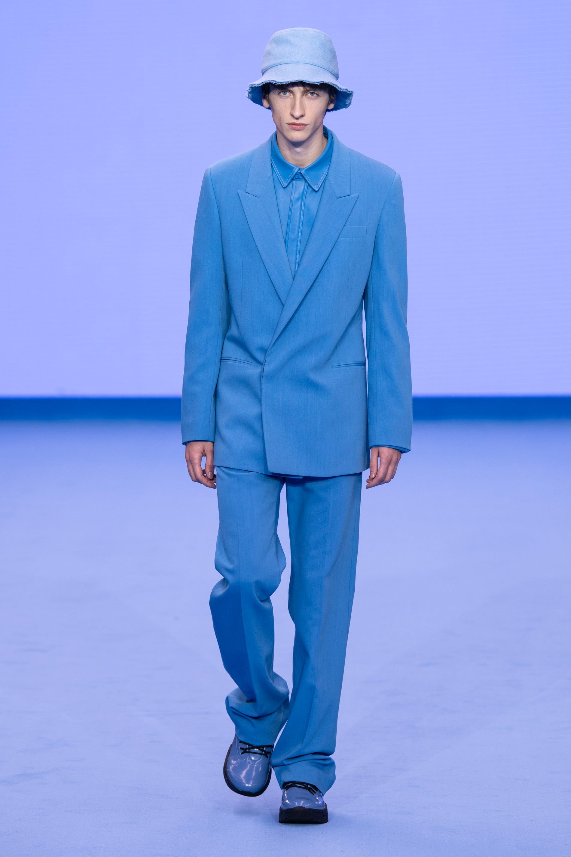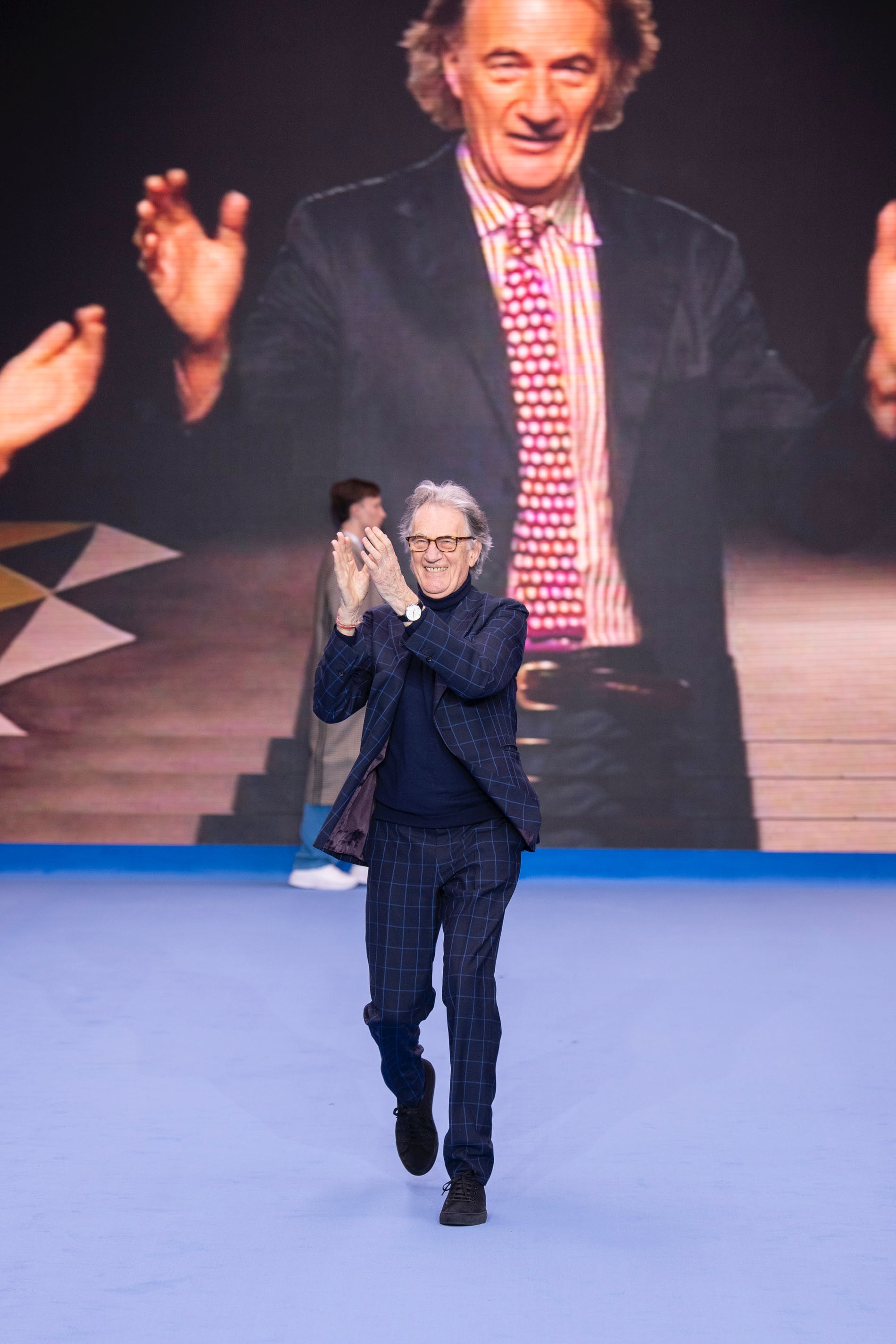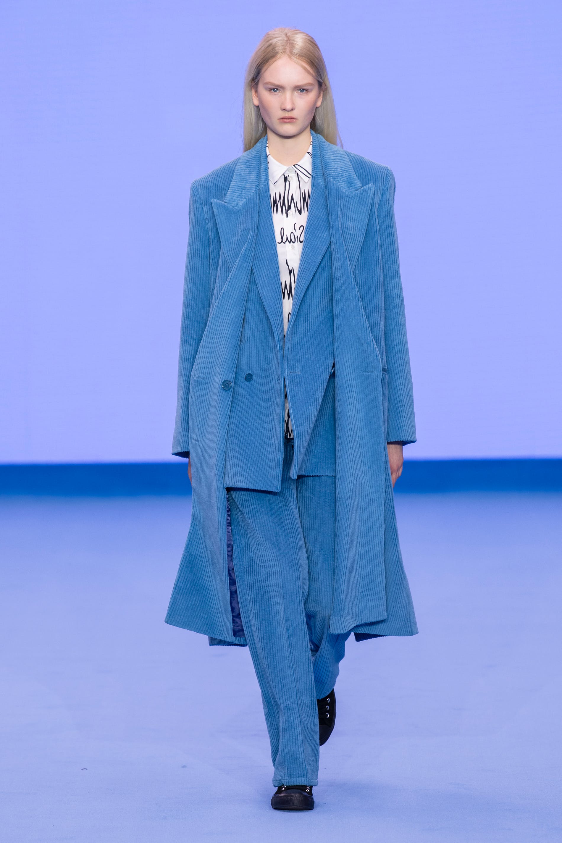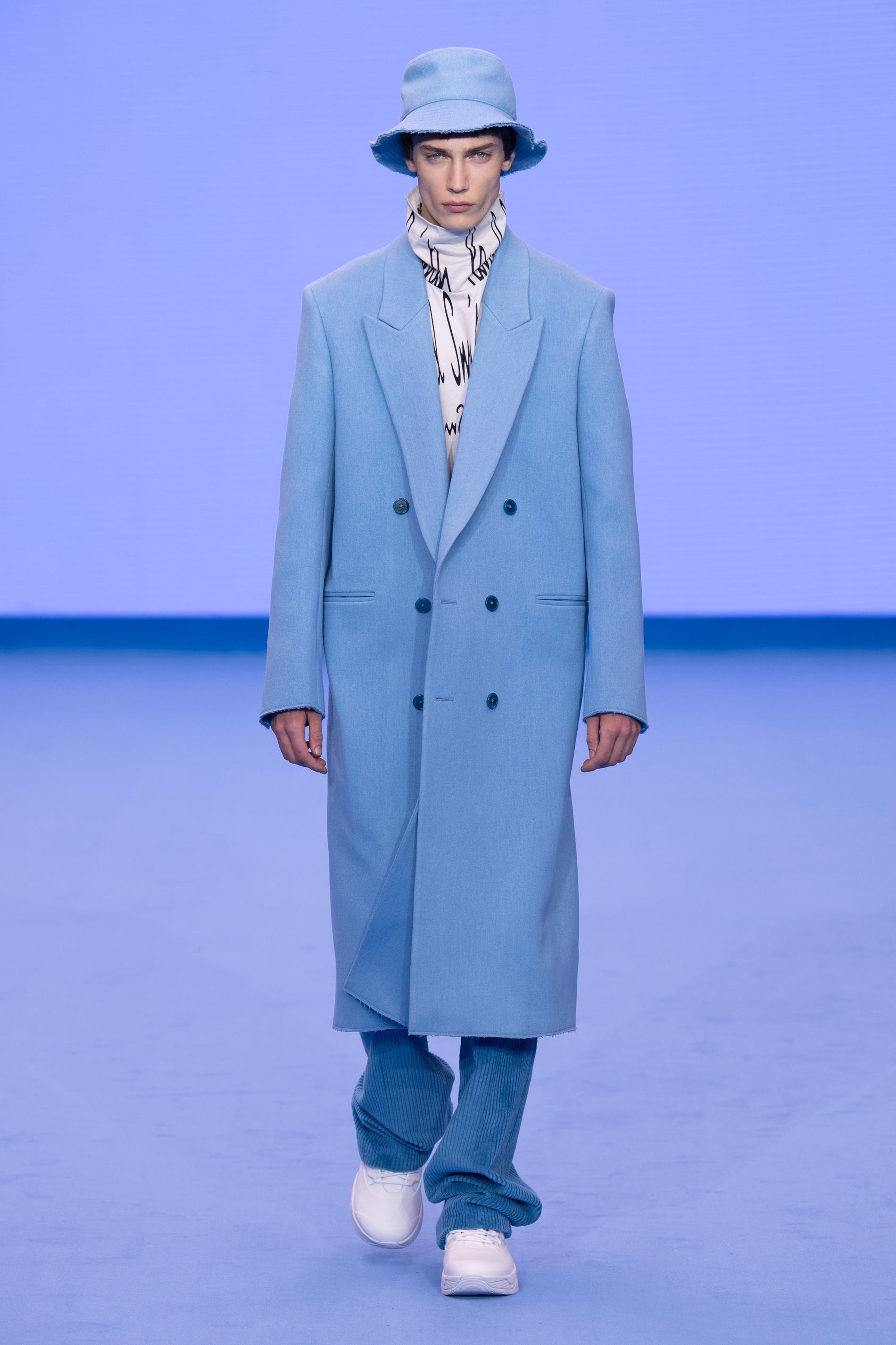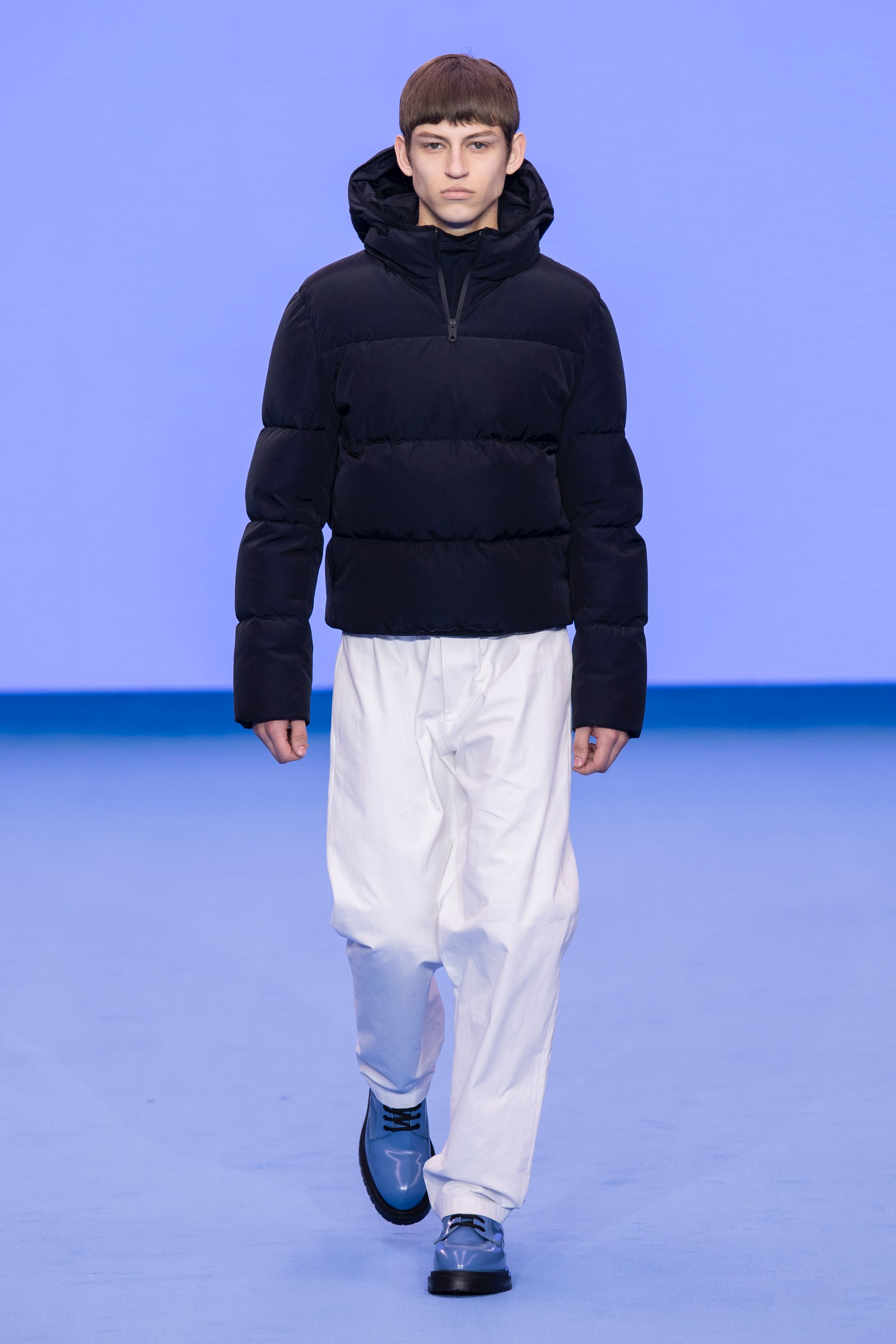 This spirit of reinvention returns when check and houndstooth tailoring is British in its feel but has the fluidity of lightweight Italian cloths. A heavy jumbo corduroy in the predominant sky blue injects cloud-like bounce into the collection and elsewhere proportions are exaggerated in puffer jackets and trainers to create an air of dreamy fantasy. Denim–a regular feature of Paul Smith catwalk collections–appears raw, indigo-washed and overdyed with a floral camouflage. Shearling coats nod to Paul’s dandyish pals wearing their Grandmas’ fur coats in the Seventies.