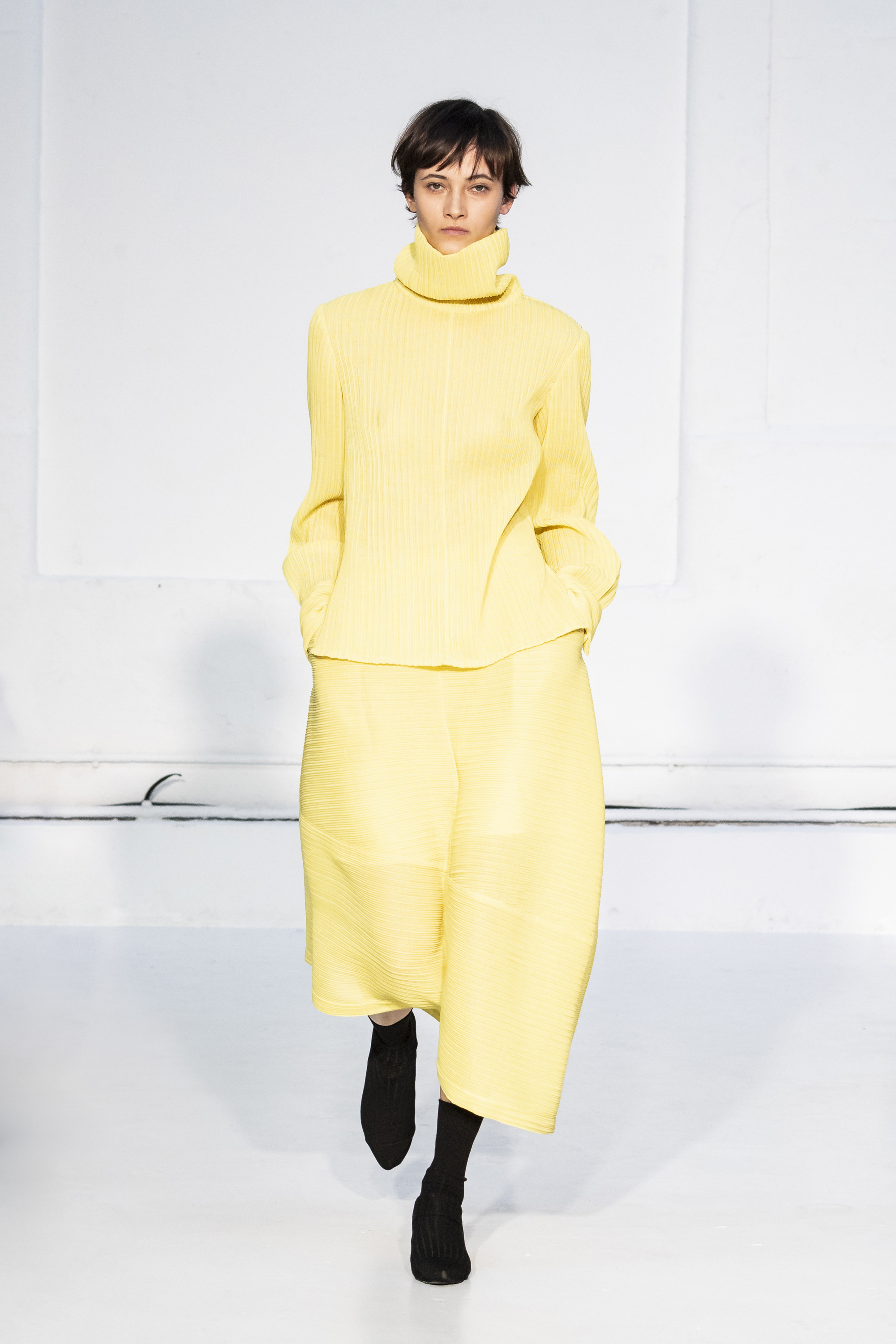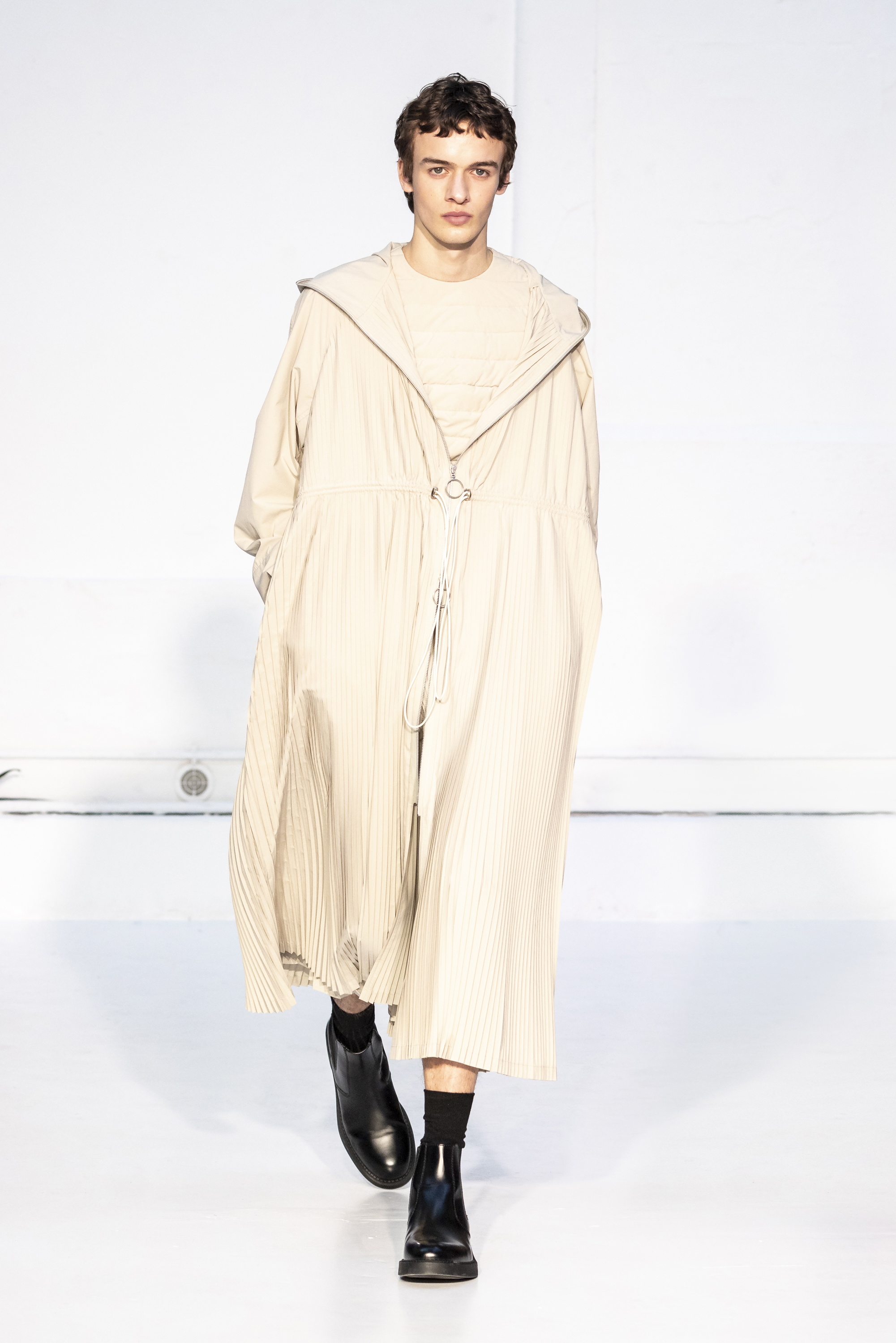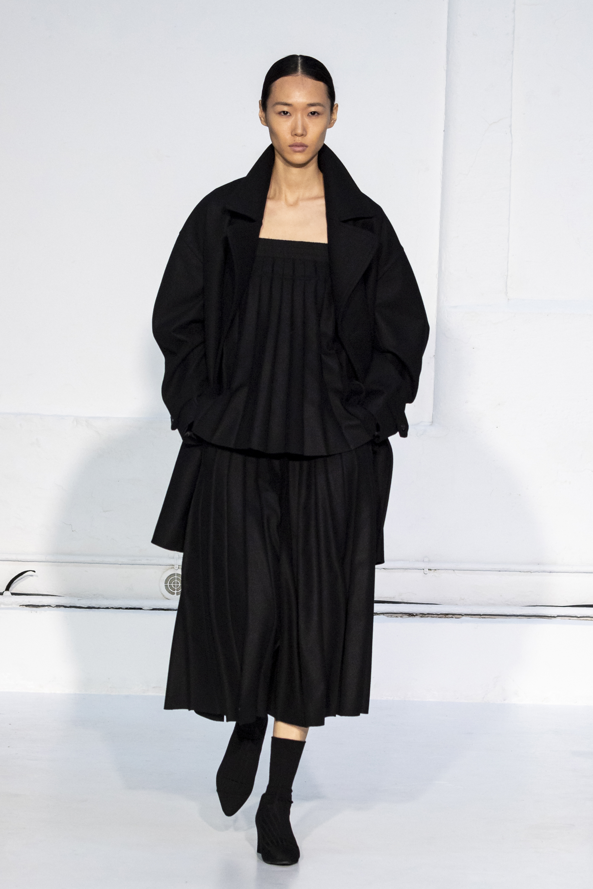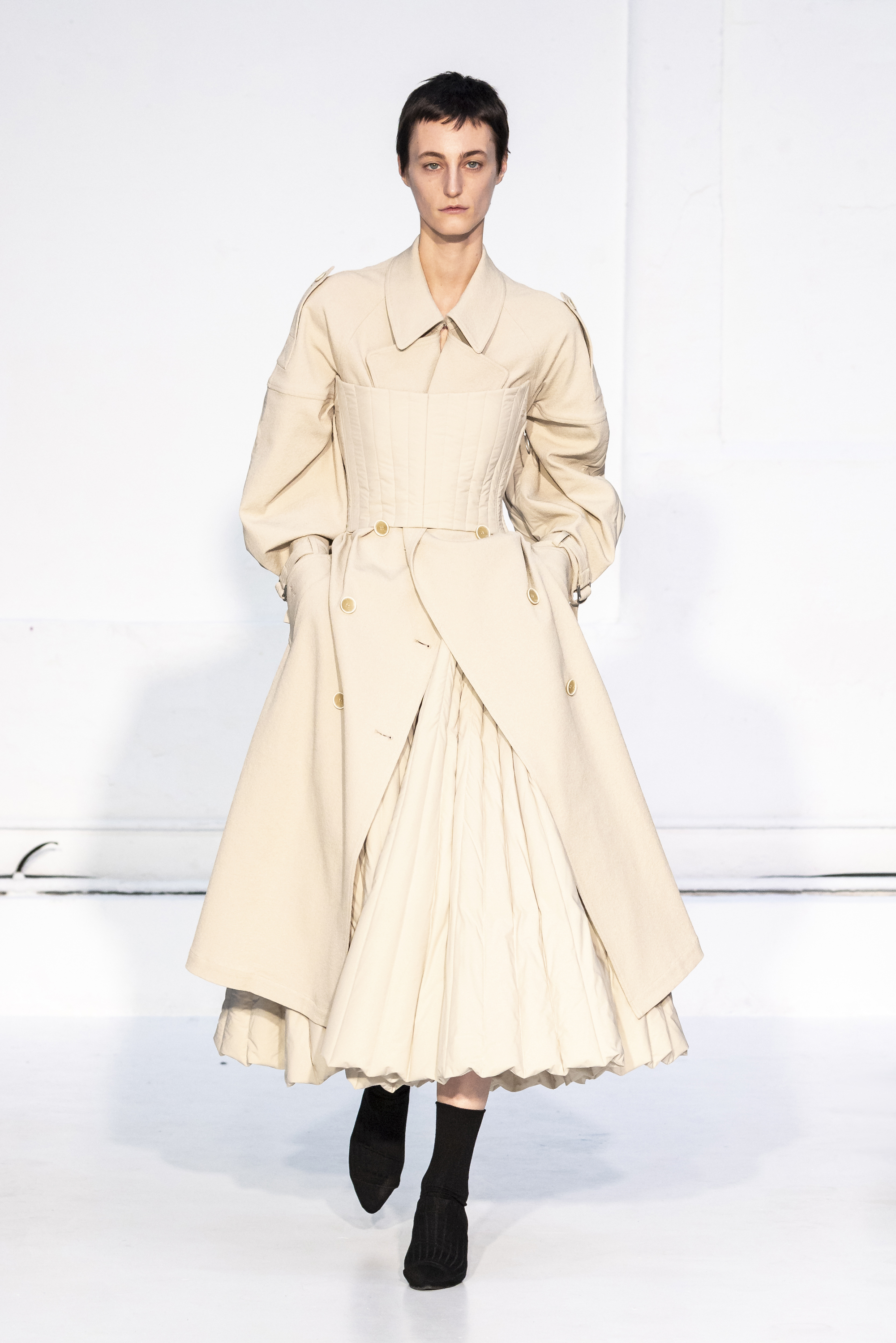 The corset silhouetted with sharp lines, the accordion-like skirt that can be fluidly stretched, the dramatically designed hemline of the coat, the purposely placed tab and the fluffy gigot sleeves......these are all marks found by DAWEI from the past within the palace. Meanwhile, the hand-sewn sunray pleats has added a stately dimension to the collection. Like winding rivers, the pleats horizontally or vertically spread over the pieces. Following the undulation of the body, the curves of elegance are depicting spontaneously.