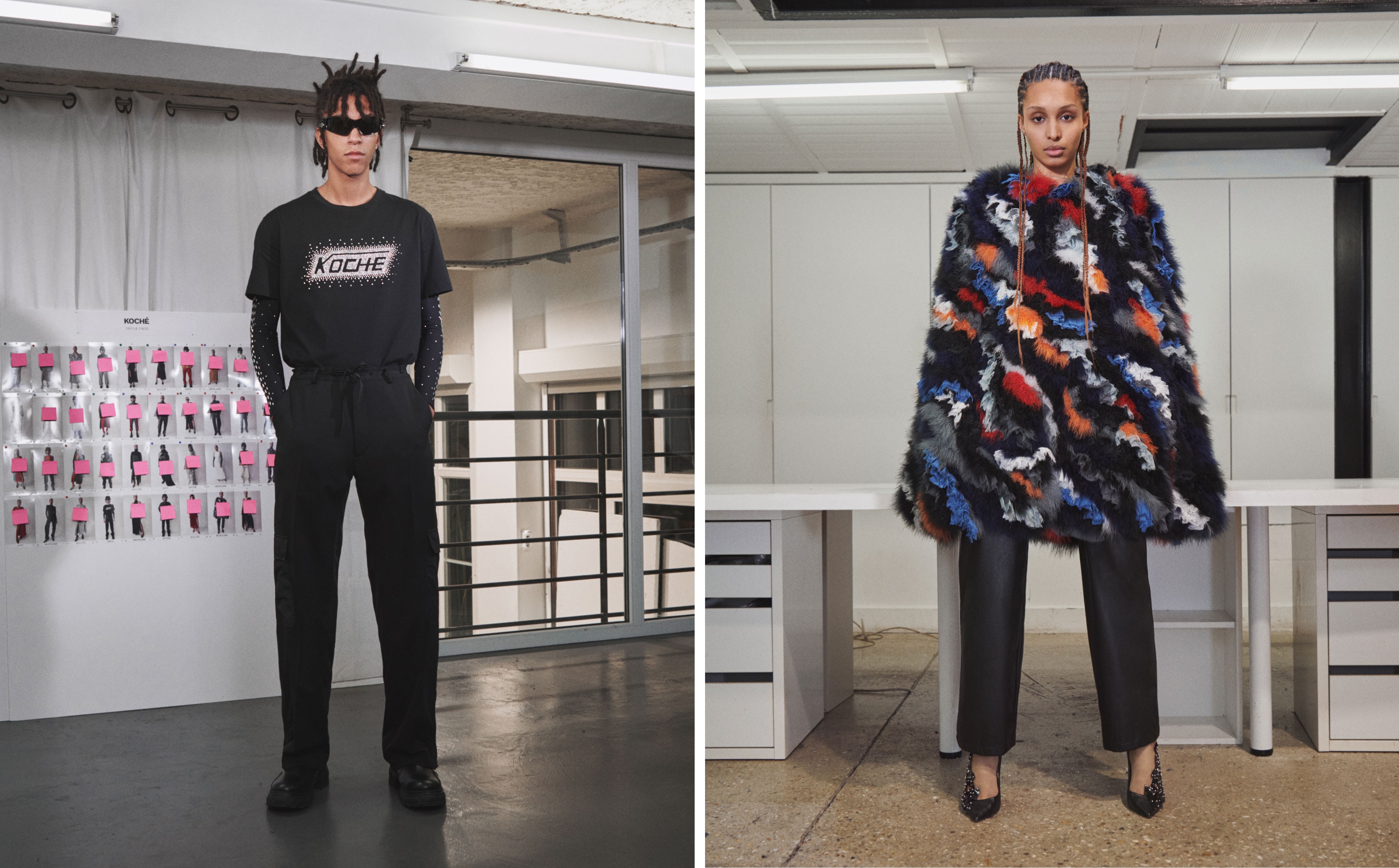 And like every season, unique pieces were created in the studio. A touch of Haute Couture like this special multicoloured coat made with Lemarié feathers on an organza’s mousseline and airtex base. Hours and hours of work that represent a strong aspect of KOCHÉ, the alliance of couture flamboyance and modern attitude.