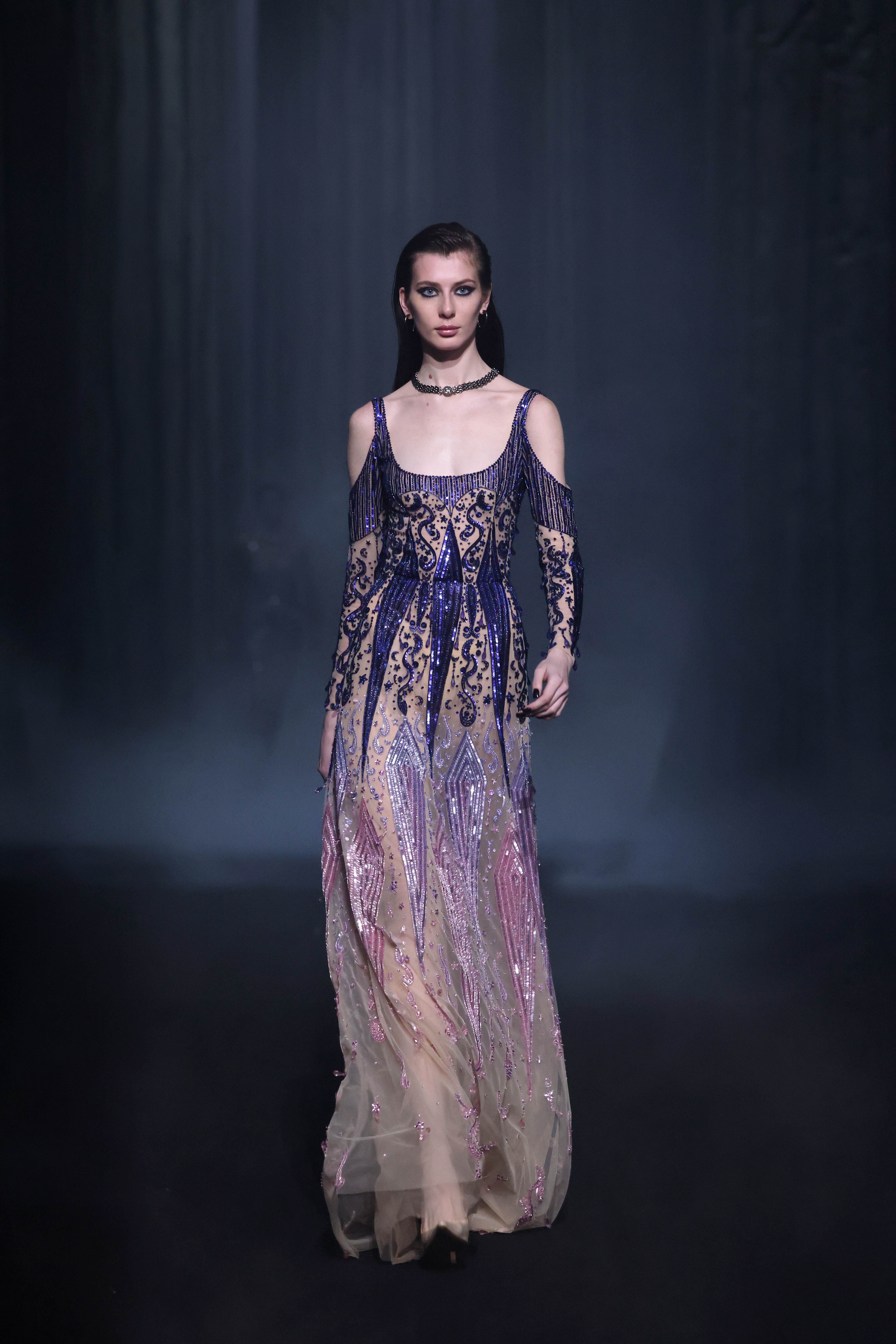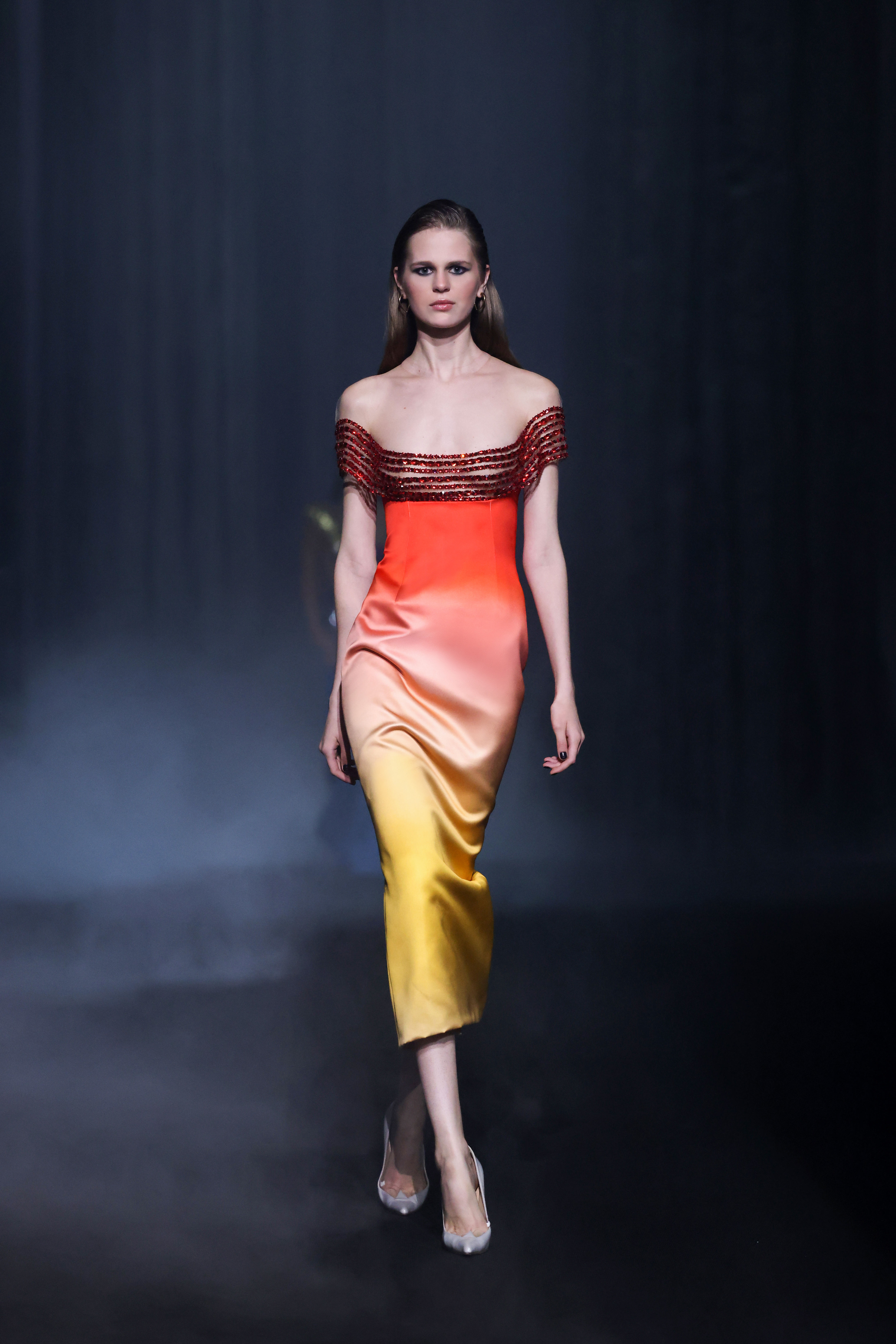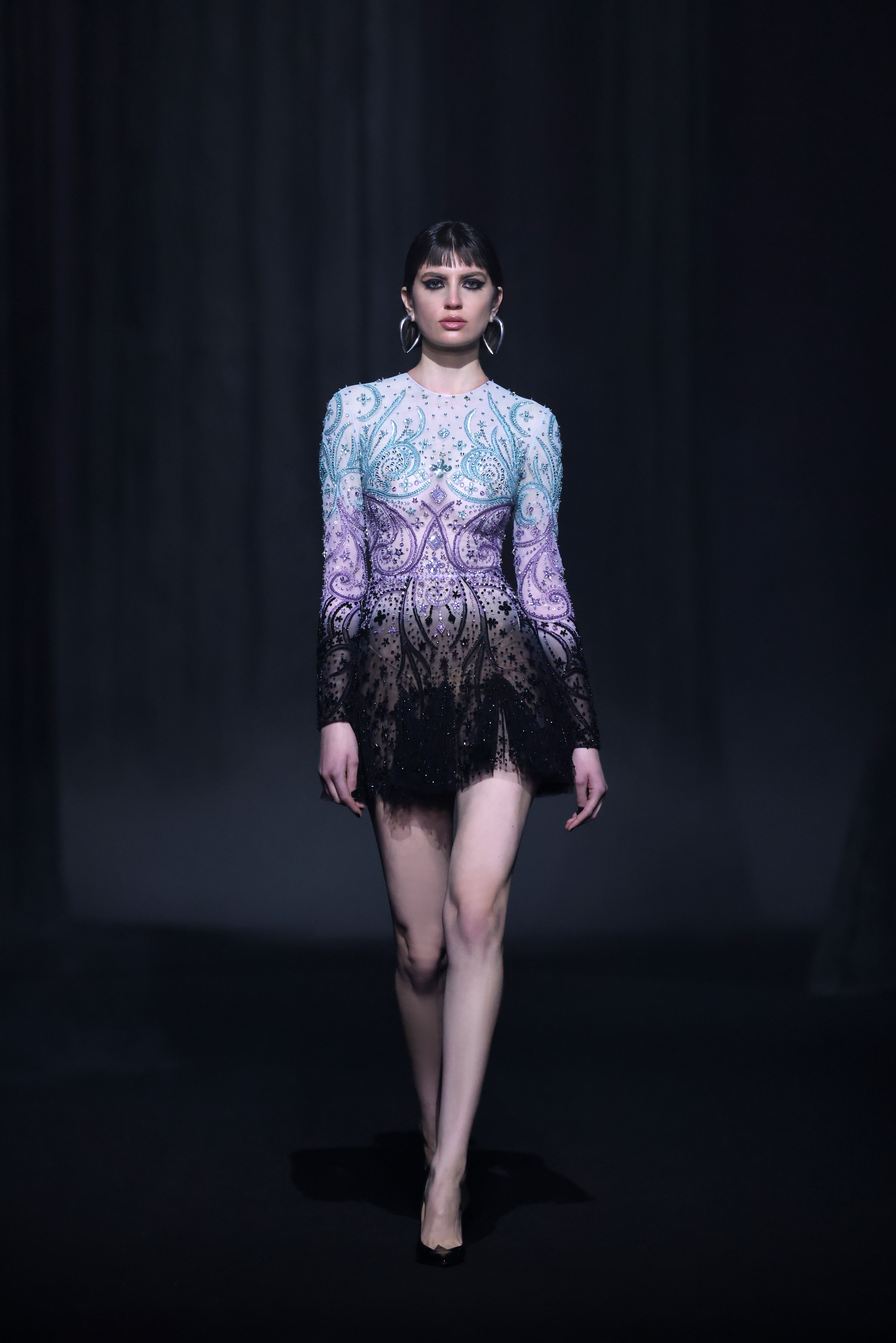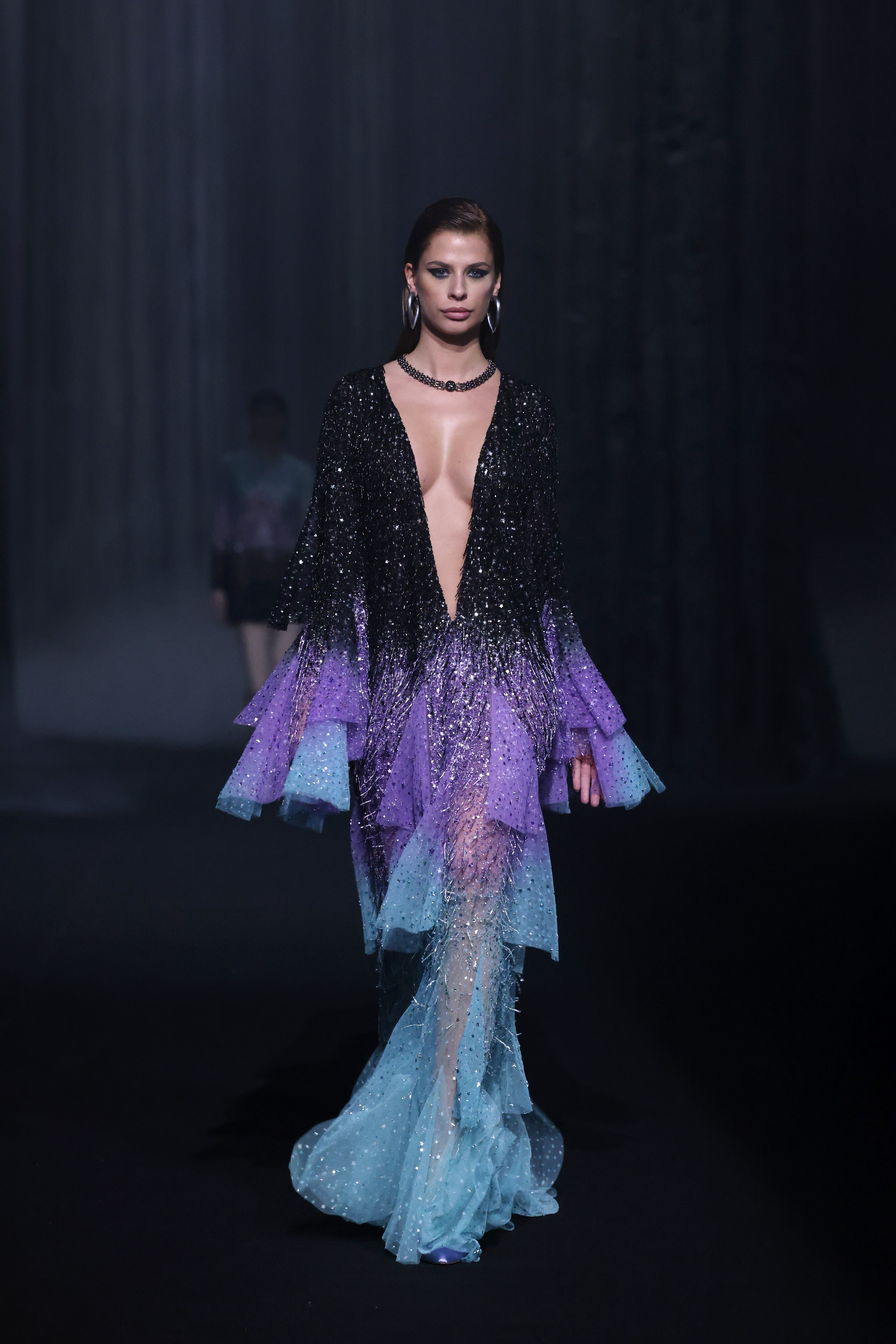 Digging deep into the rich vocabulary of the vampire world, this collection marks a shift away from the usual upbeat references but remains true to the arresting intensity of the Maison Georges Hobeika style. Edgy details bring their sense of spectacle to nearly a hundred looks – including men’s silhouettes – for a captivating seasonal collection. Two dégradé colour schemes play with the changing shades of sunrise and sunset, with a warmer palette of reds, oranges and greens representing the early morning and more dramatic purples, blues and blacks for a crepuscular feel. The trademark Hobeika orchid is a key motif, along with tattoo illusion effects using the shapes of the moon and stars. The rich embroidery which is part of the house’s DNA plays with delicate flower detailing and a three-dimensional effect akin to a fantastical dragon skin.