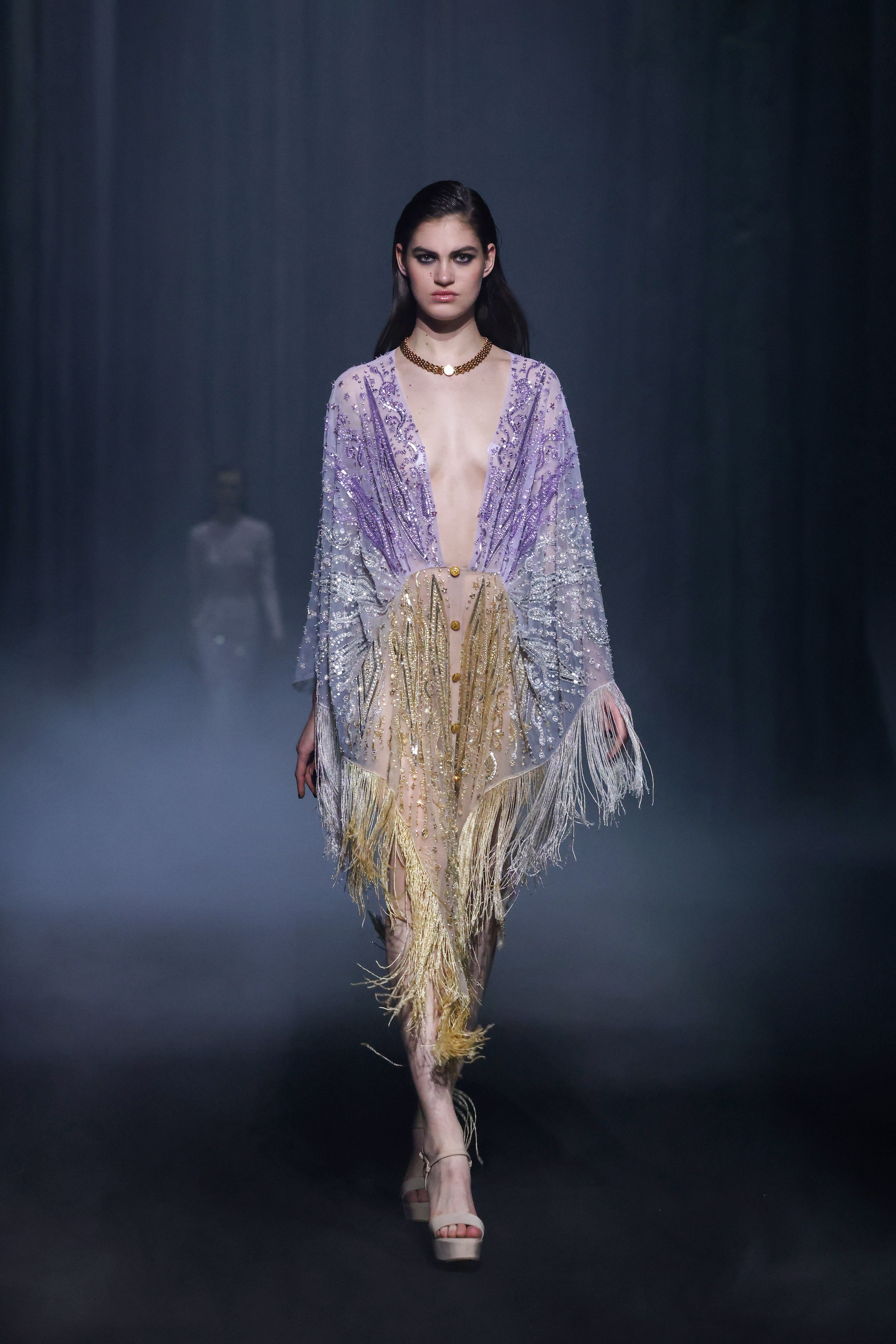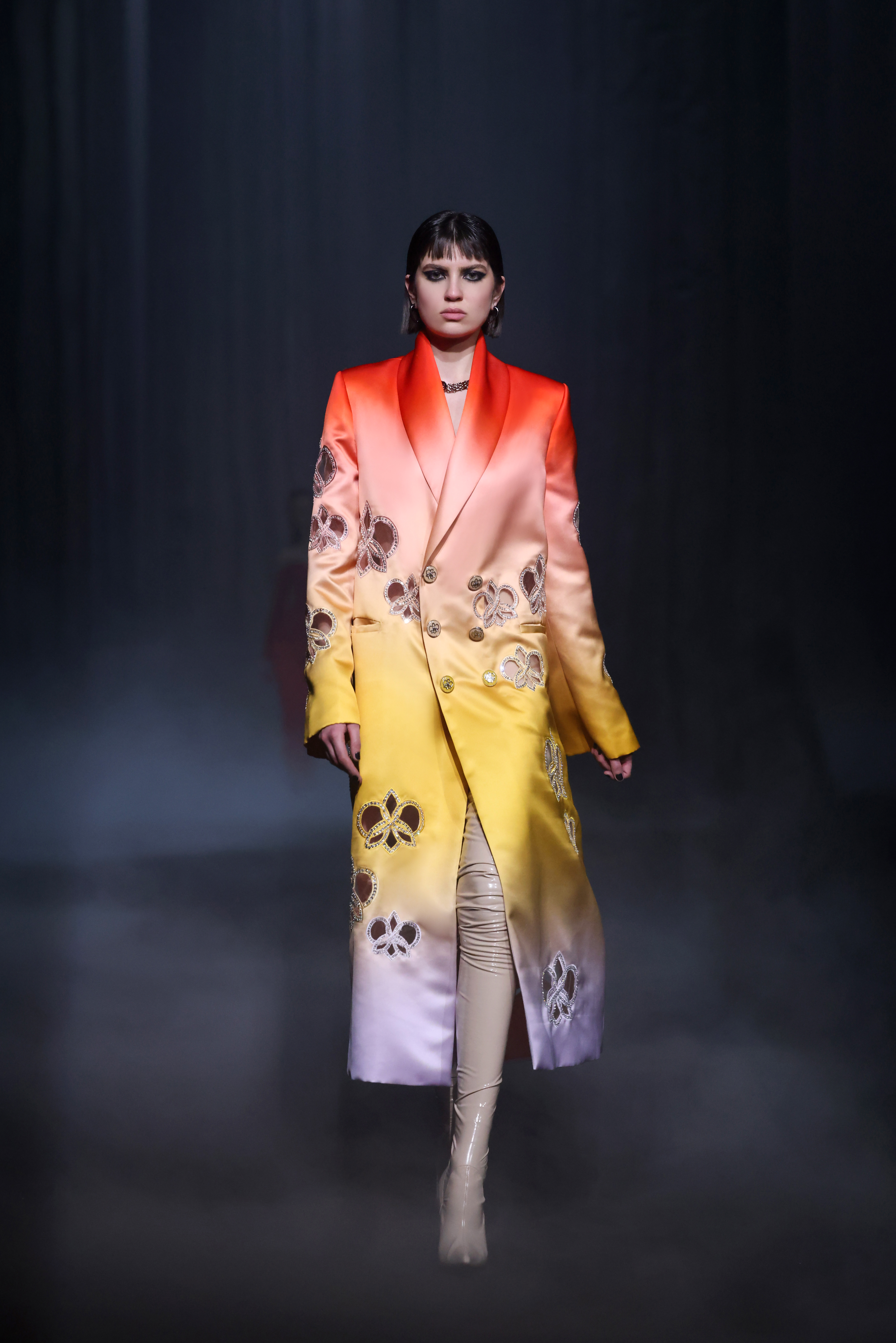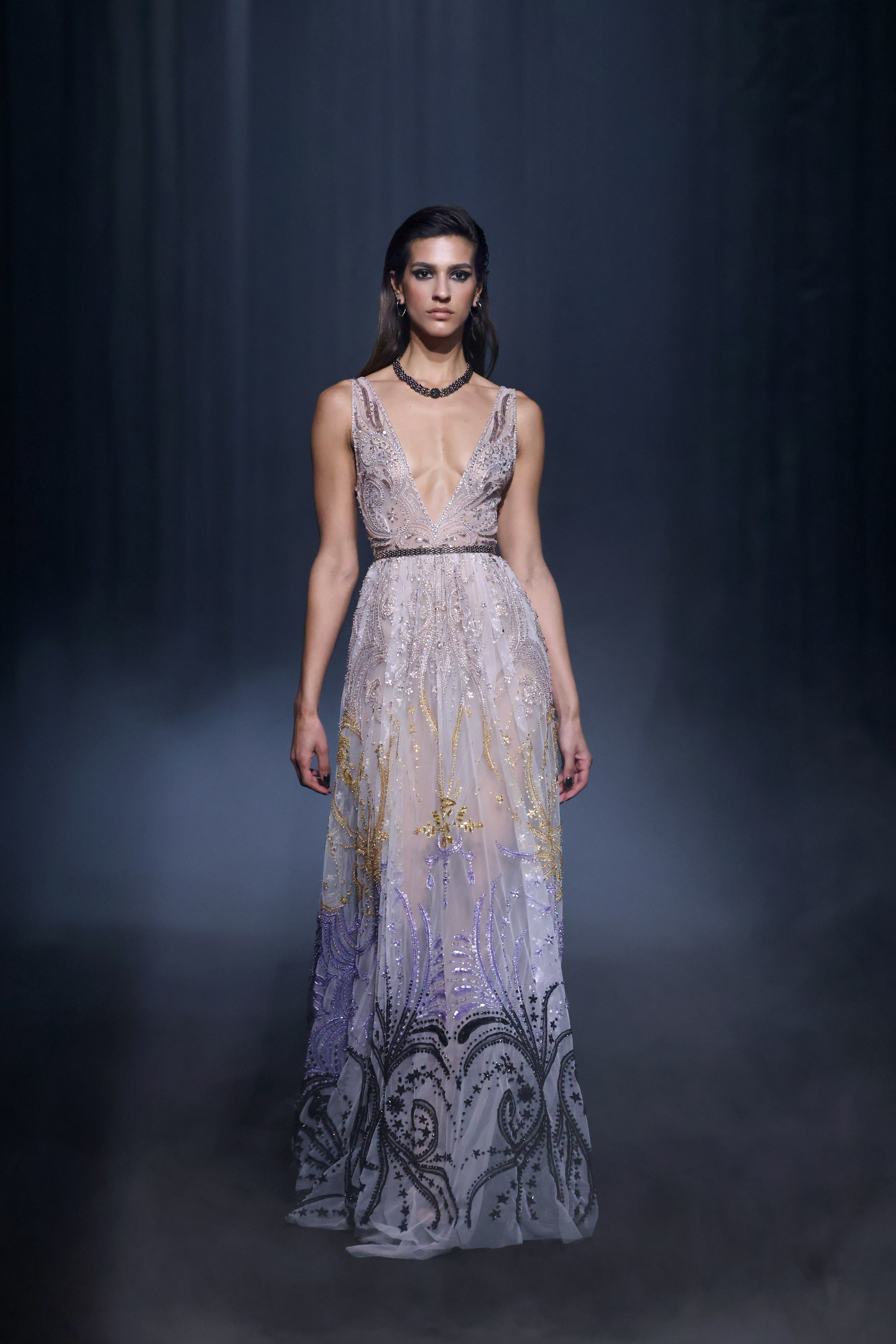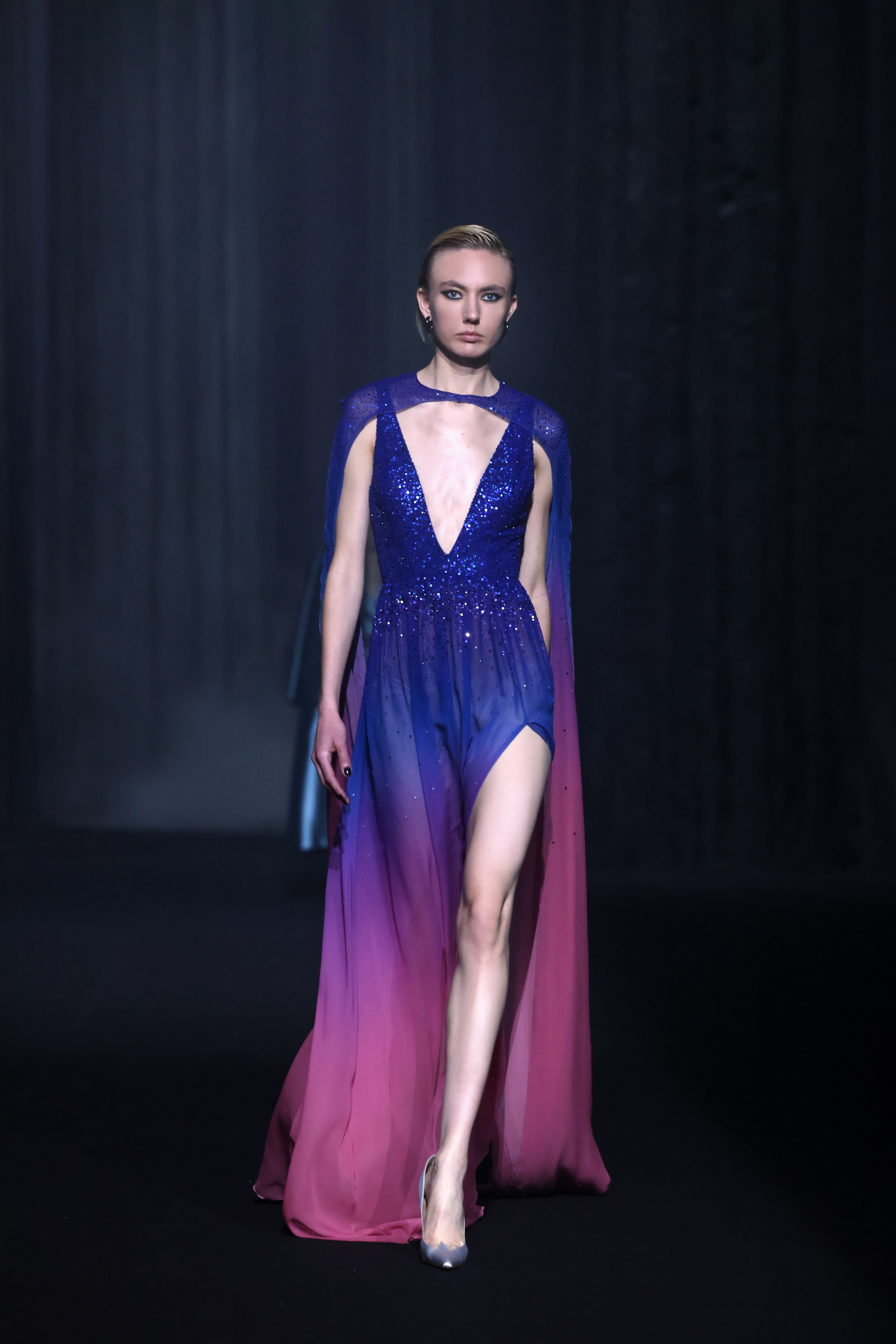 Digging deep into the rich vocabulary of the vampire world, this collection marks a shift away from the usual upbeat references but remains true to the arresting intensity of the Maison Georges Hobeika style. Edgy details bring their sense of spectacle to nearly a hundred looks – including men’s silhouettes – for a captivating seasonal collection. Two dégradé colour schemes play with the changing shades of sunrise and sunset, with a warmer palette of reds, oranges and greens representing the early morning and more dramatic purples, blues and blacks for a crepuscular feel. The trademark Hobeika orchid is a key motif, along with tattoo illusion effects using the shapes of the moon and stars. The rich embroidery which is part of the house’s DNA plays with delicate flower detailing and a three-dimensional effect akin to a fantastical dragon skin.