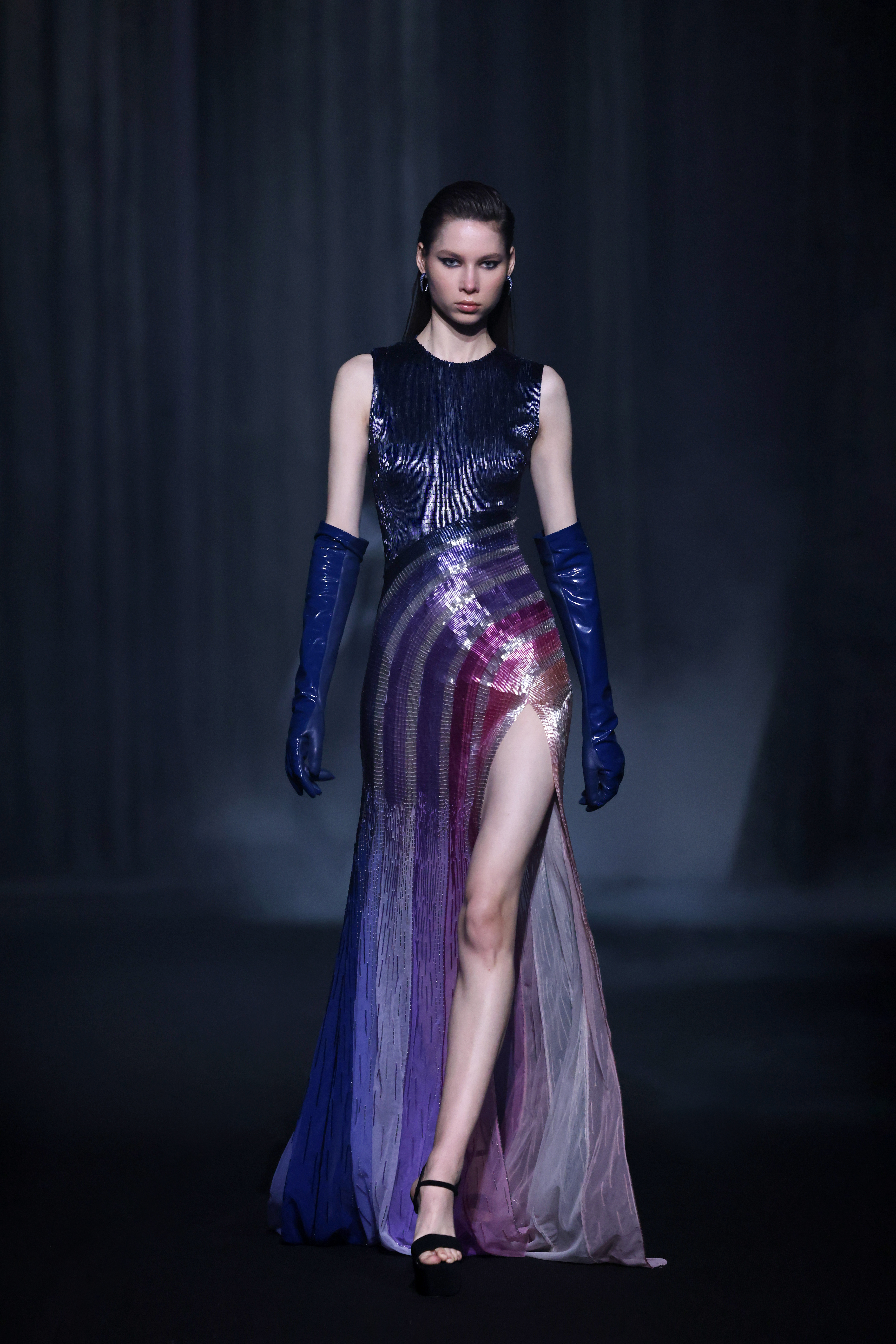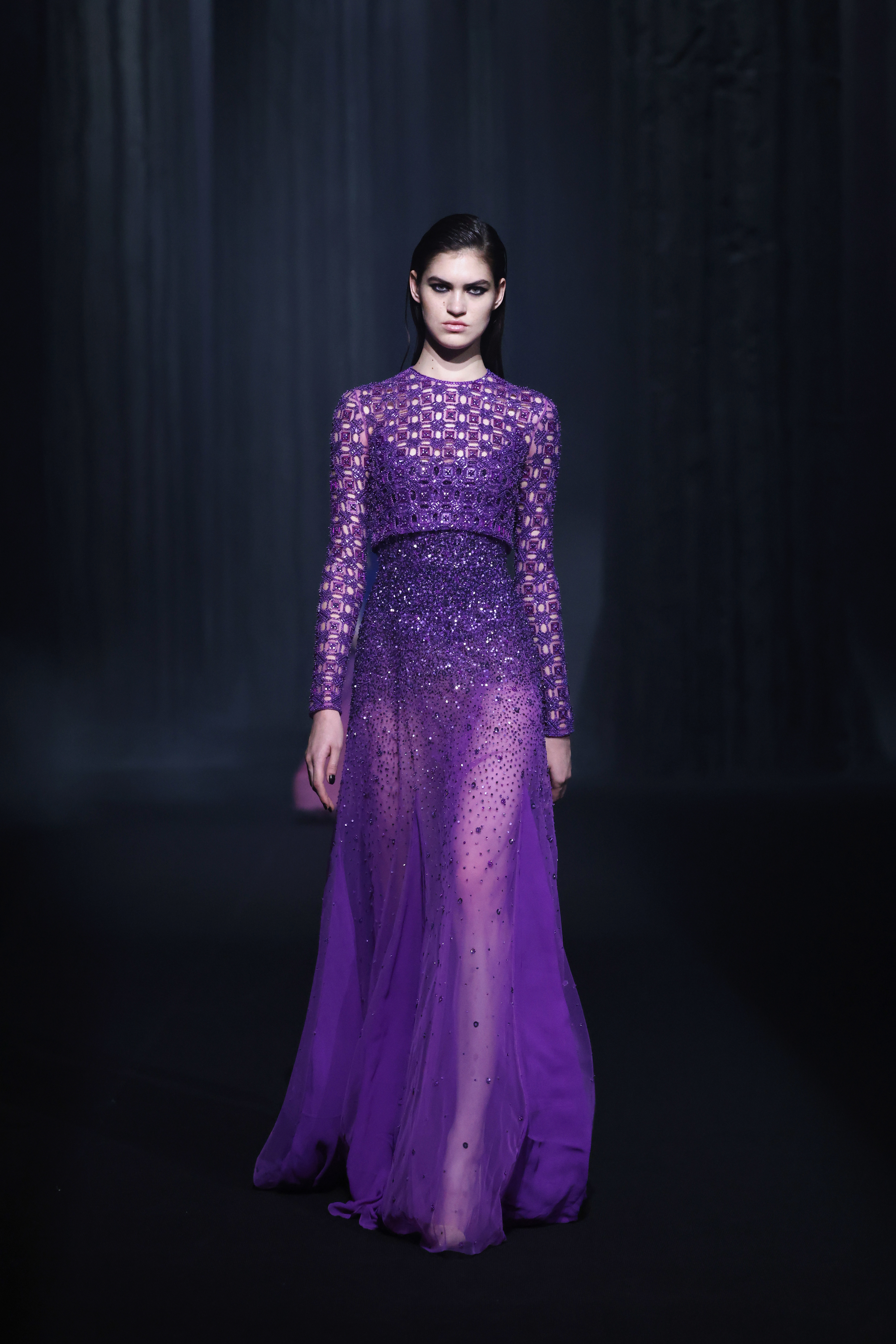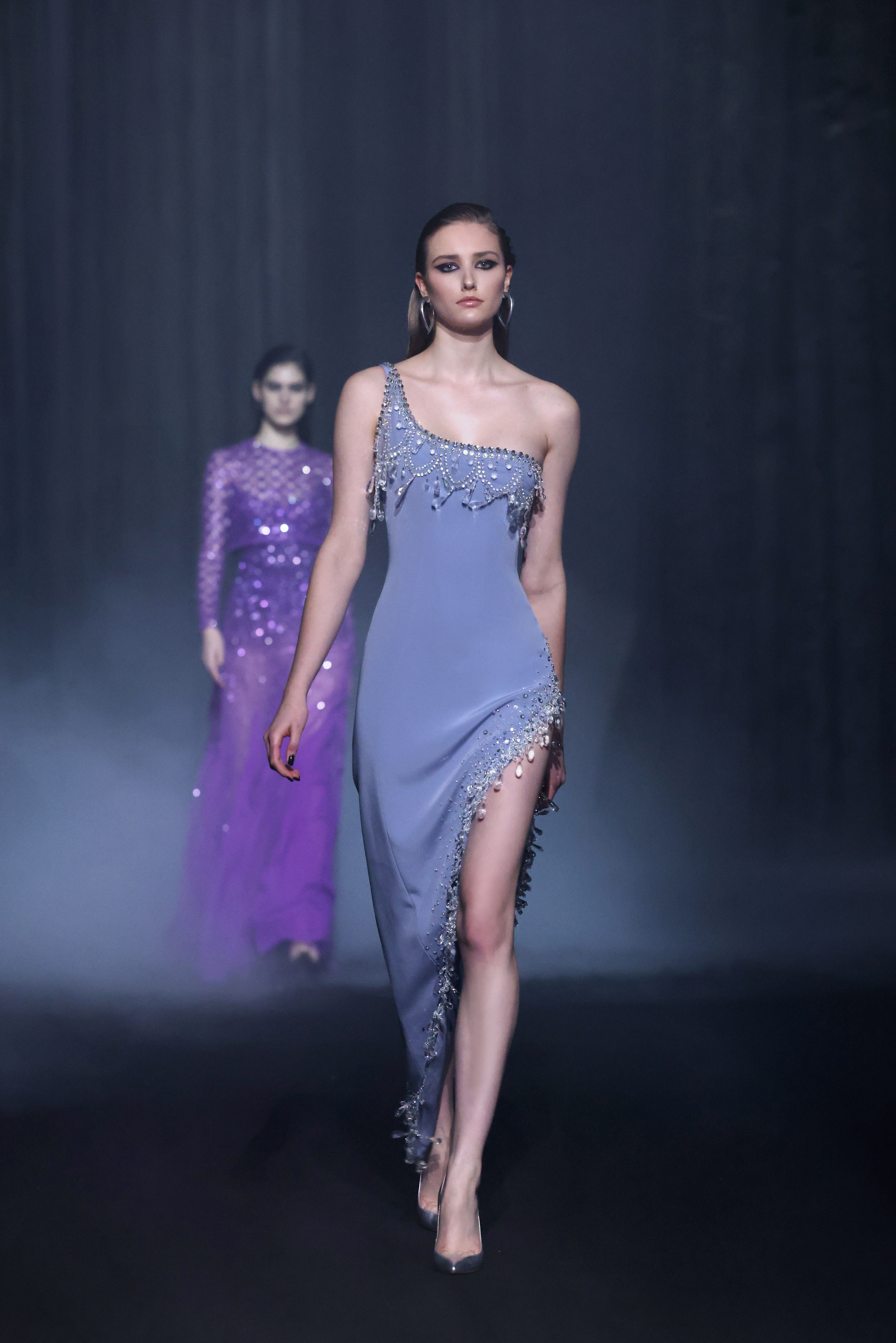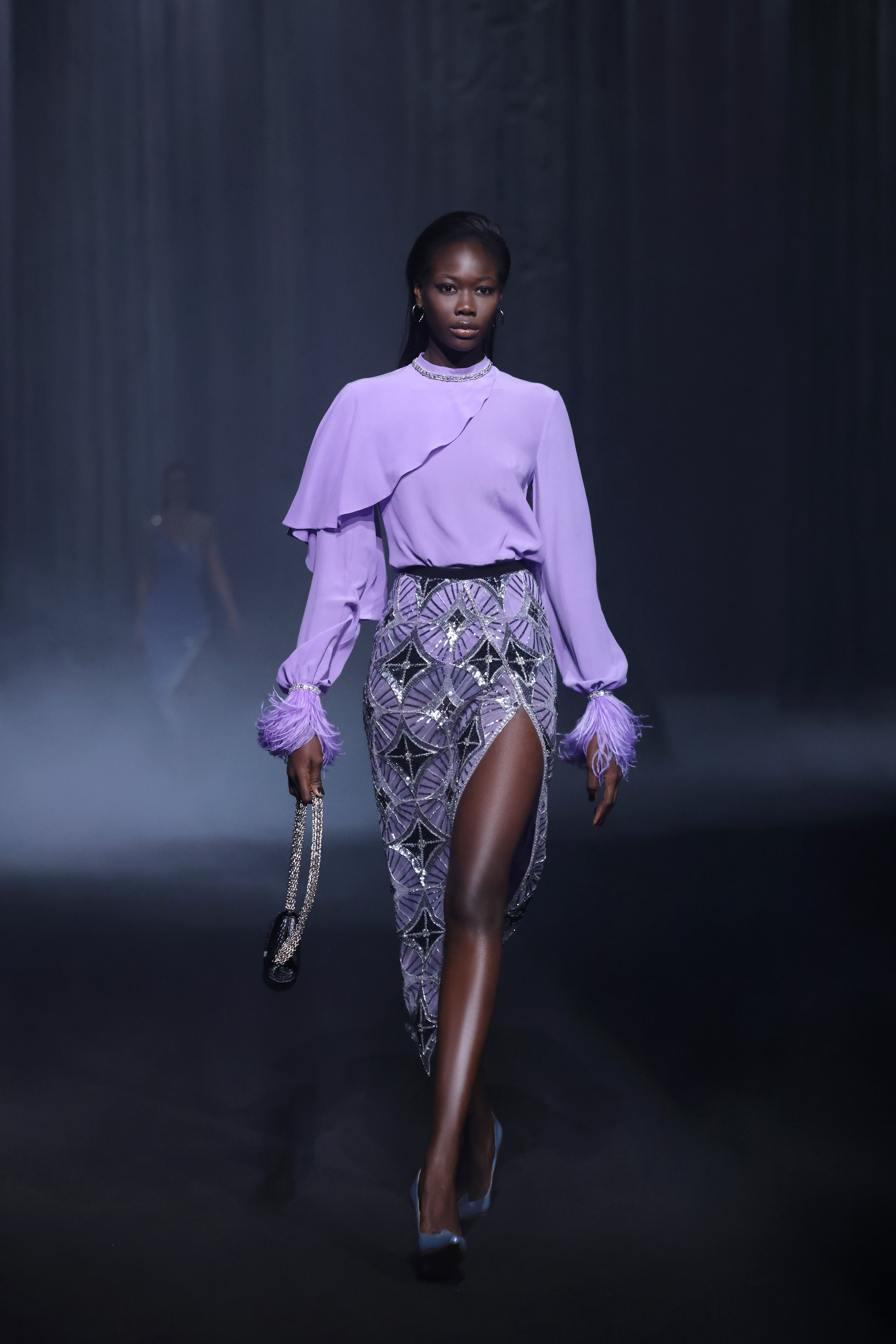 Digging deep into the rich vocabulary of the vampire world, this collection marks a shift away from the usual upbeat references but remains true to the arresting intensity of the Maison Georges Hobeika style. Edgy details bring their sense of spectacle to nearly a hundred looks – including men’s silhouettes – for a captivating seasonal collection. Two dégradé colour schemes play with the changing shades of sunrise and sunset, with a warmer palette of reds, oranges and greens representing the early morning and more dramatic purples, blues and blacks for a crepuscular feel. The trademark Hobeika orchid is a key motif, along with tattoo illusion effects using the shapes of the moon and stars. The rich embroidery which is part of the house’s DNA plays with delicate flower detailing and a three-dimensional effect akin to a fantastical dragon skin.