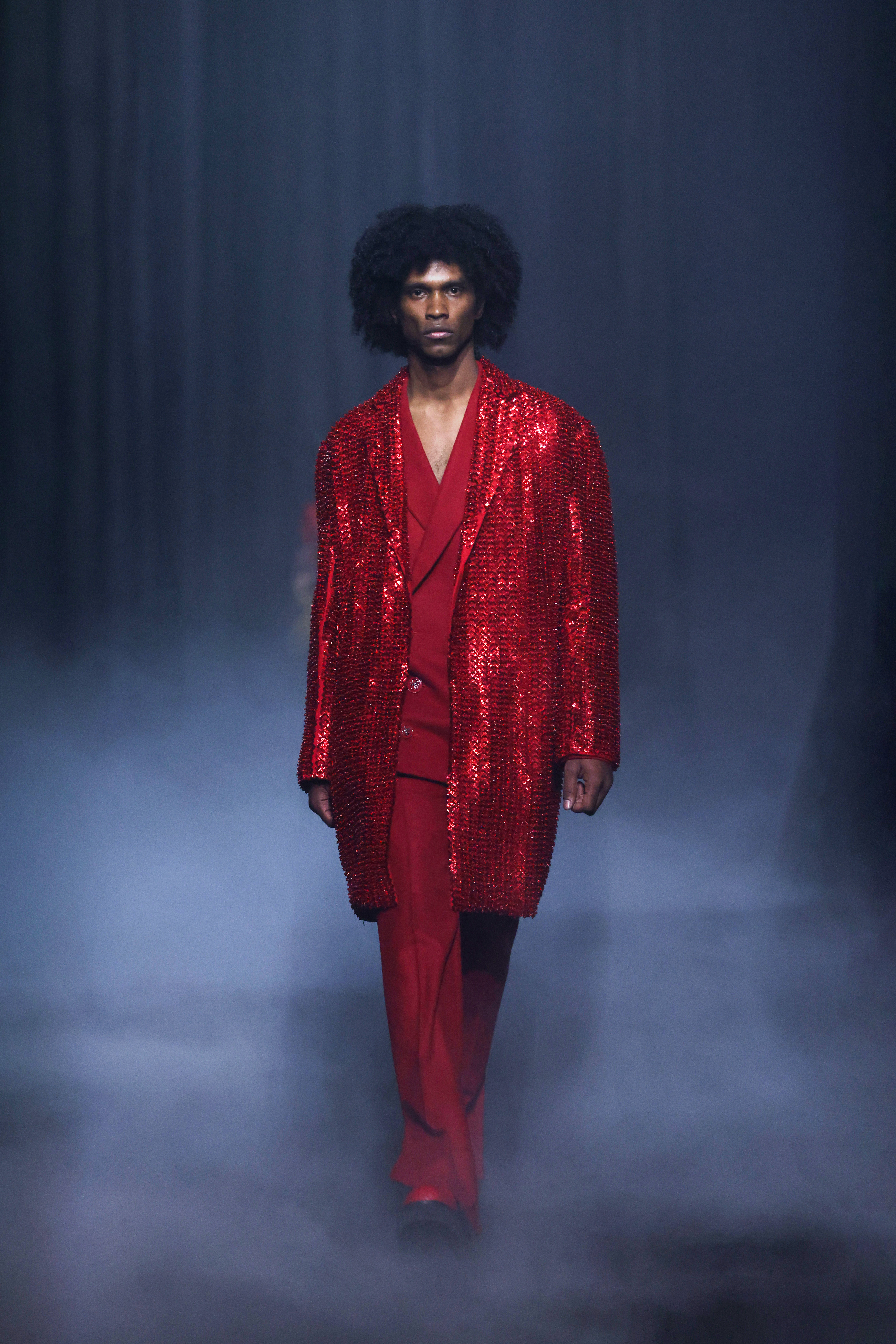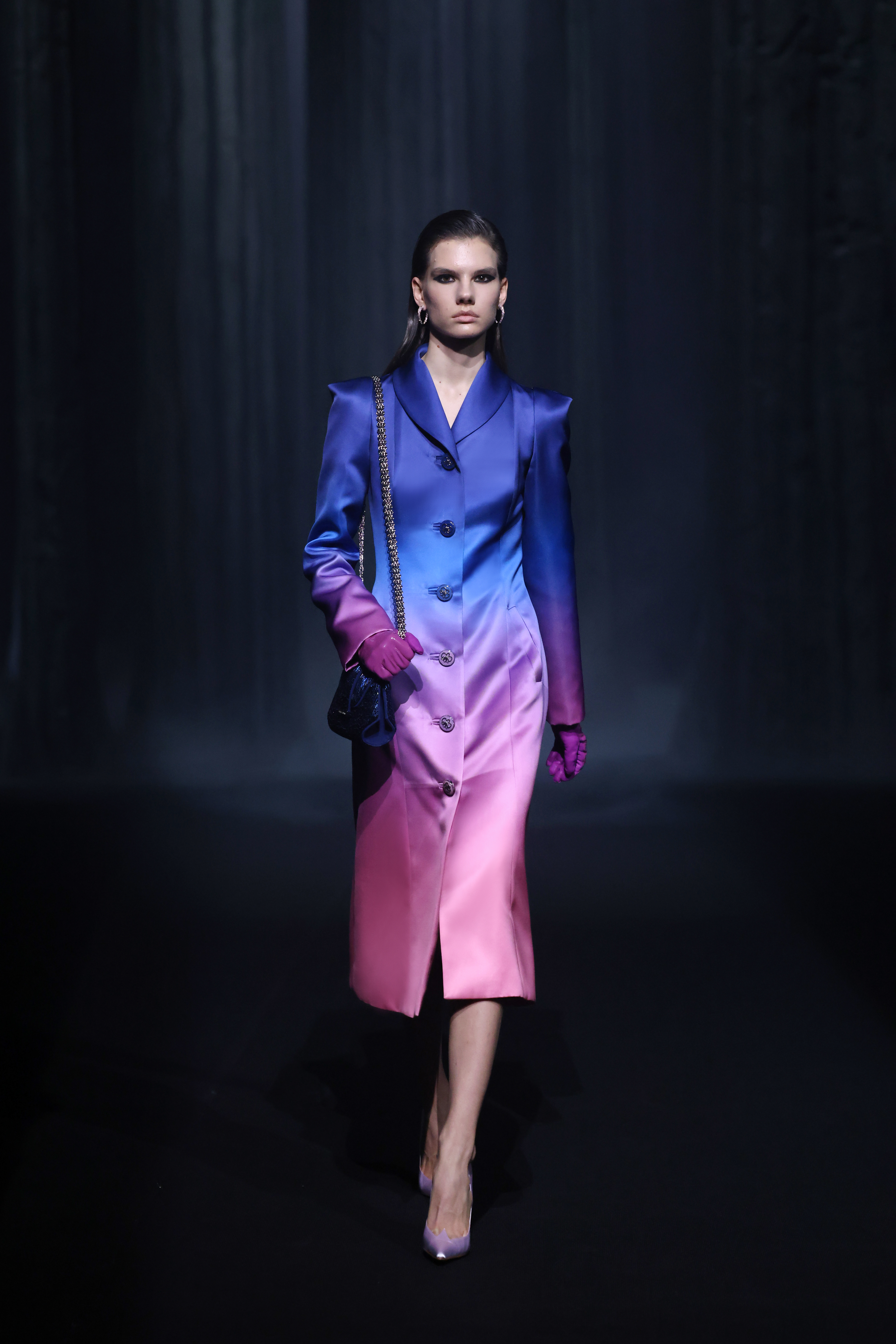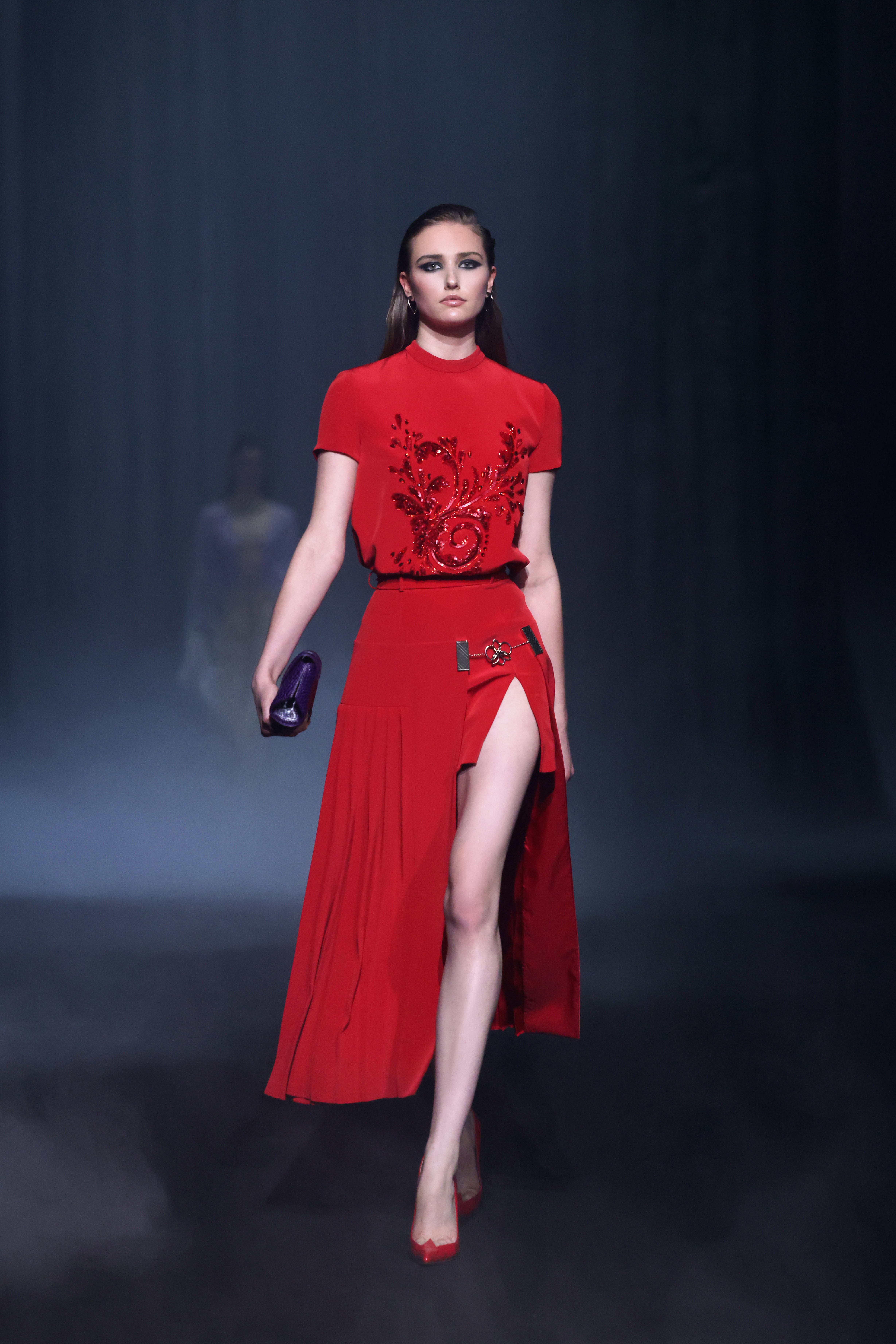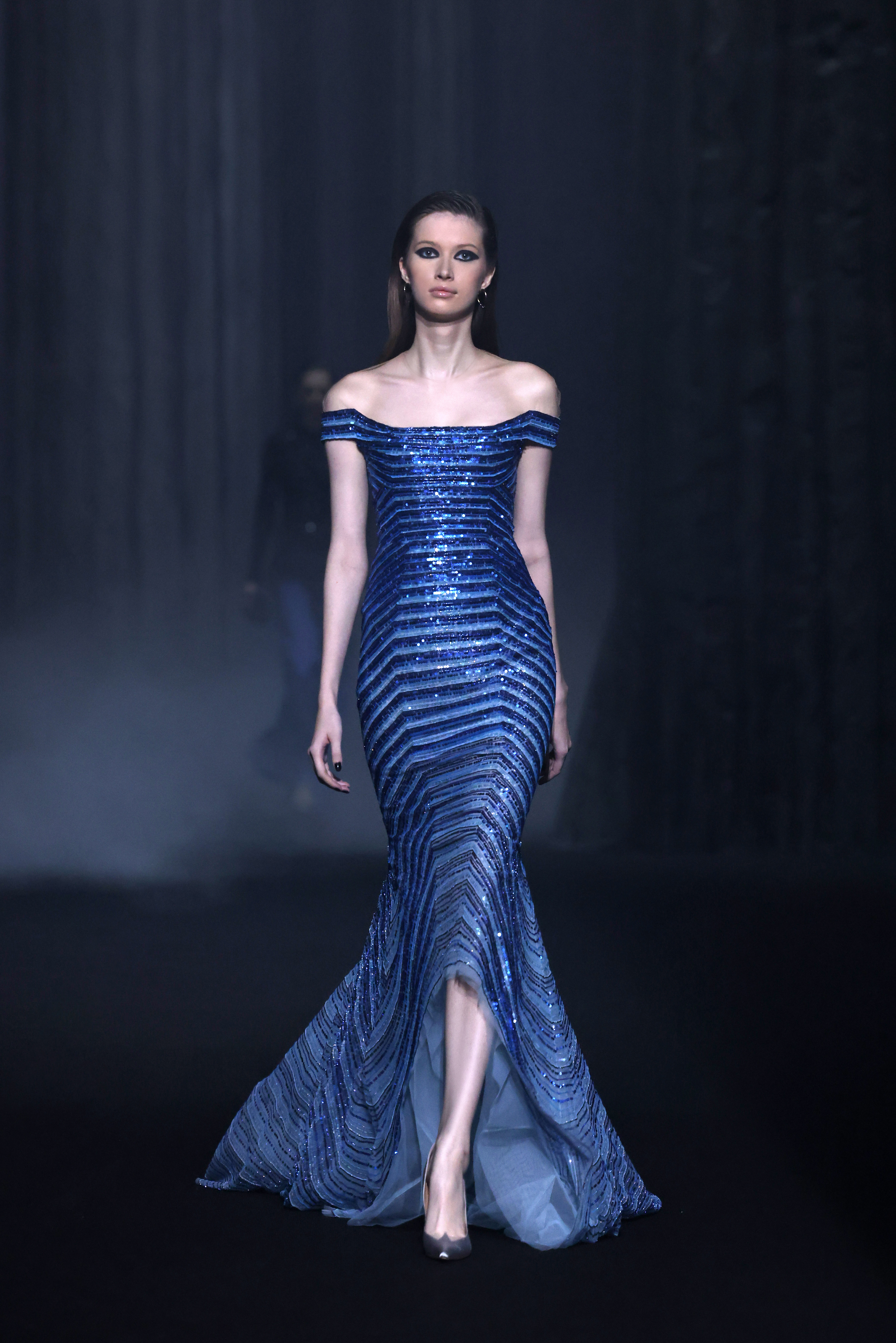 Digging deep into the rich vocabulary of the vampire world, this collection marks a shift away from the usual upbeat references but remains true to the arresting intensity of the Maison Georges Hobeika style. Edgy details bring their sense of spectacle to nearly a hundred looks – including men’s silhouettes – for a captivating seasonal collection. Two dégradé colour schemes play with the changing shades of sunrise and sunset, with a warmer palette of reds, oranges and greens representing the early morning and more dramatic purples, blues and blacks for a crepuscular feel. The trademark Hobeika orchid is a key motif, along with tattoo illusion effects using the shapes of the moon and stars. The rich embroidery which is part of the house’s DNA plays with delicate flower detailing and a three-dimensional effect akin to a fantastical dragon skin.