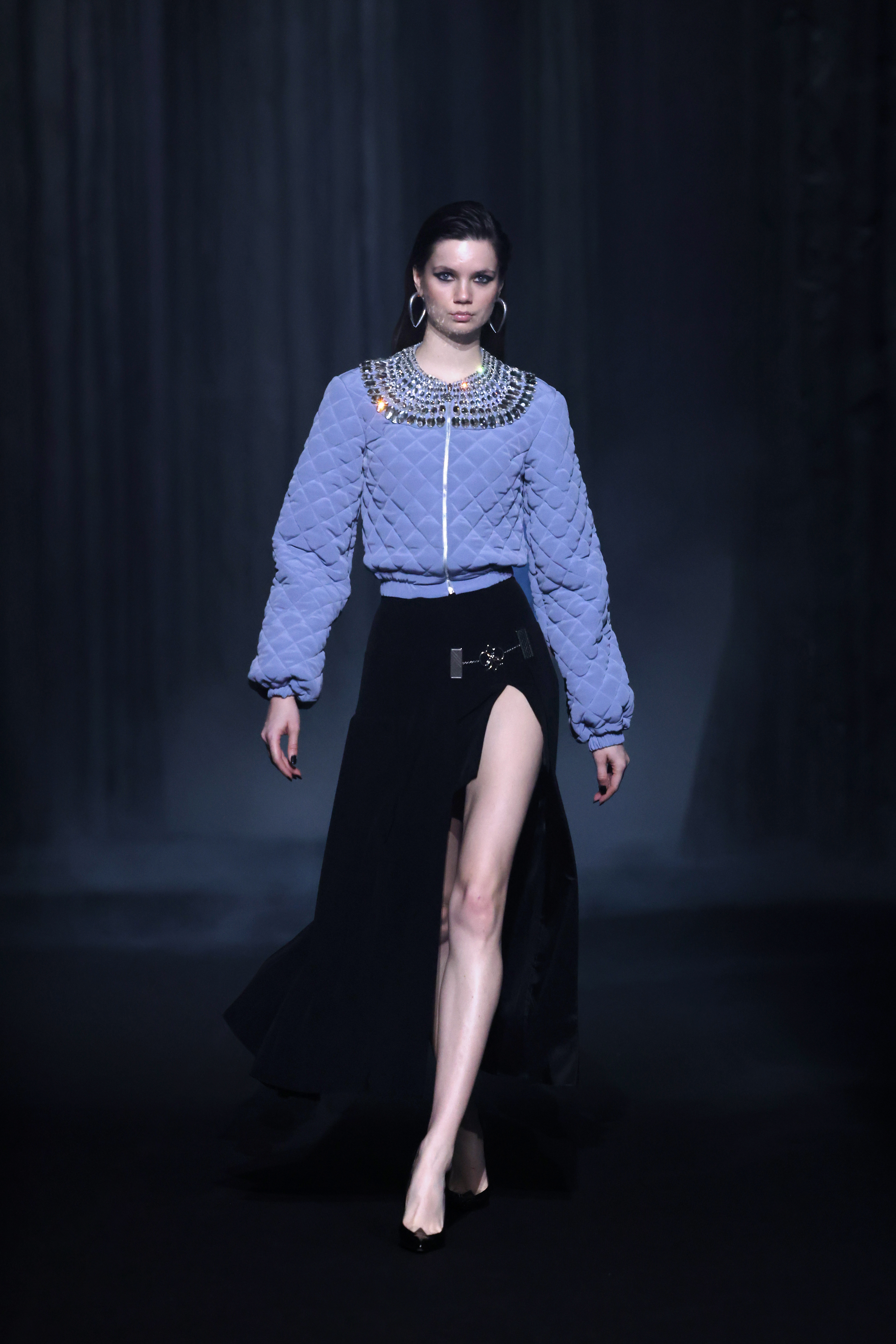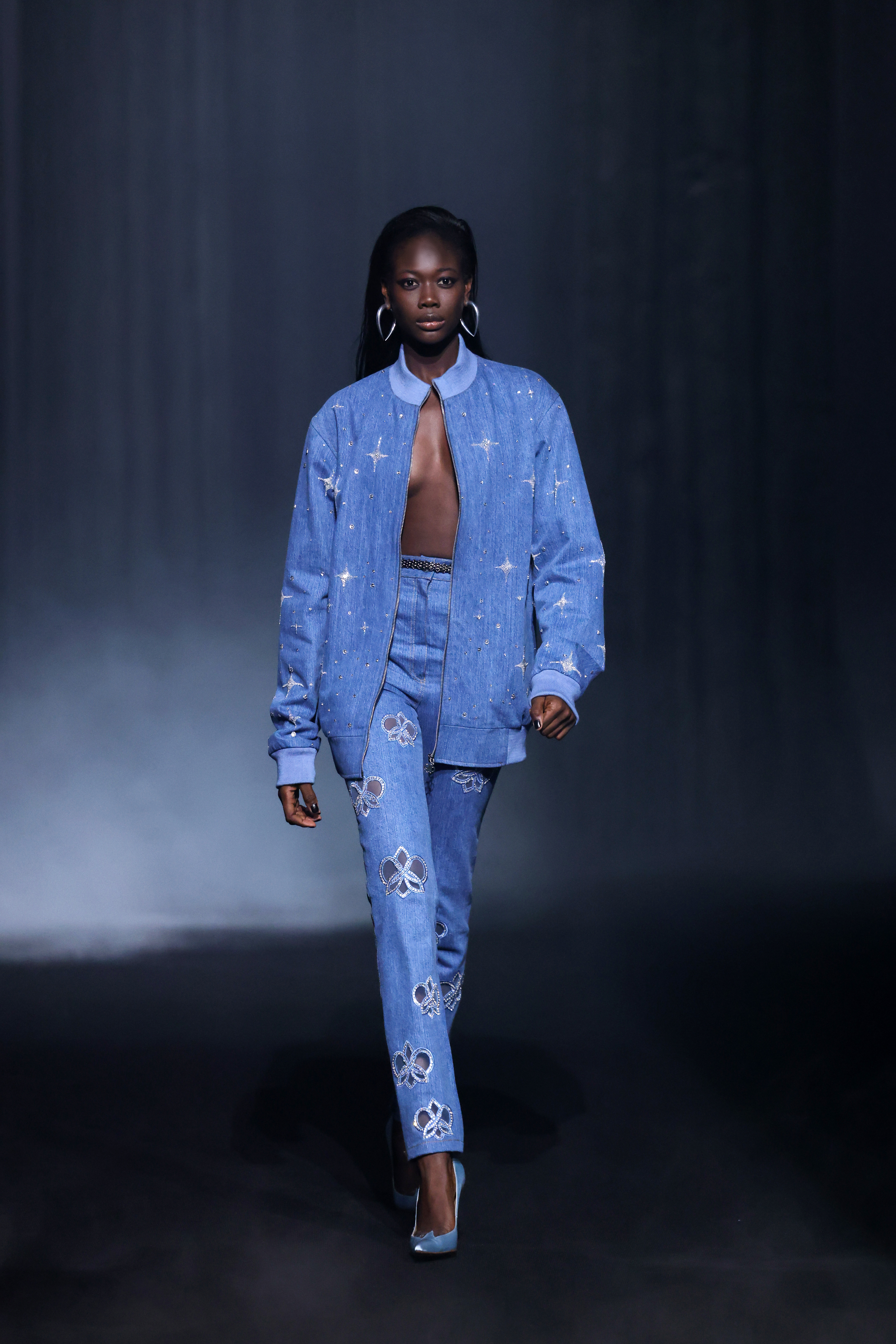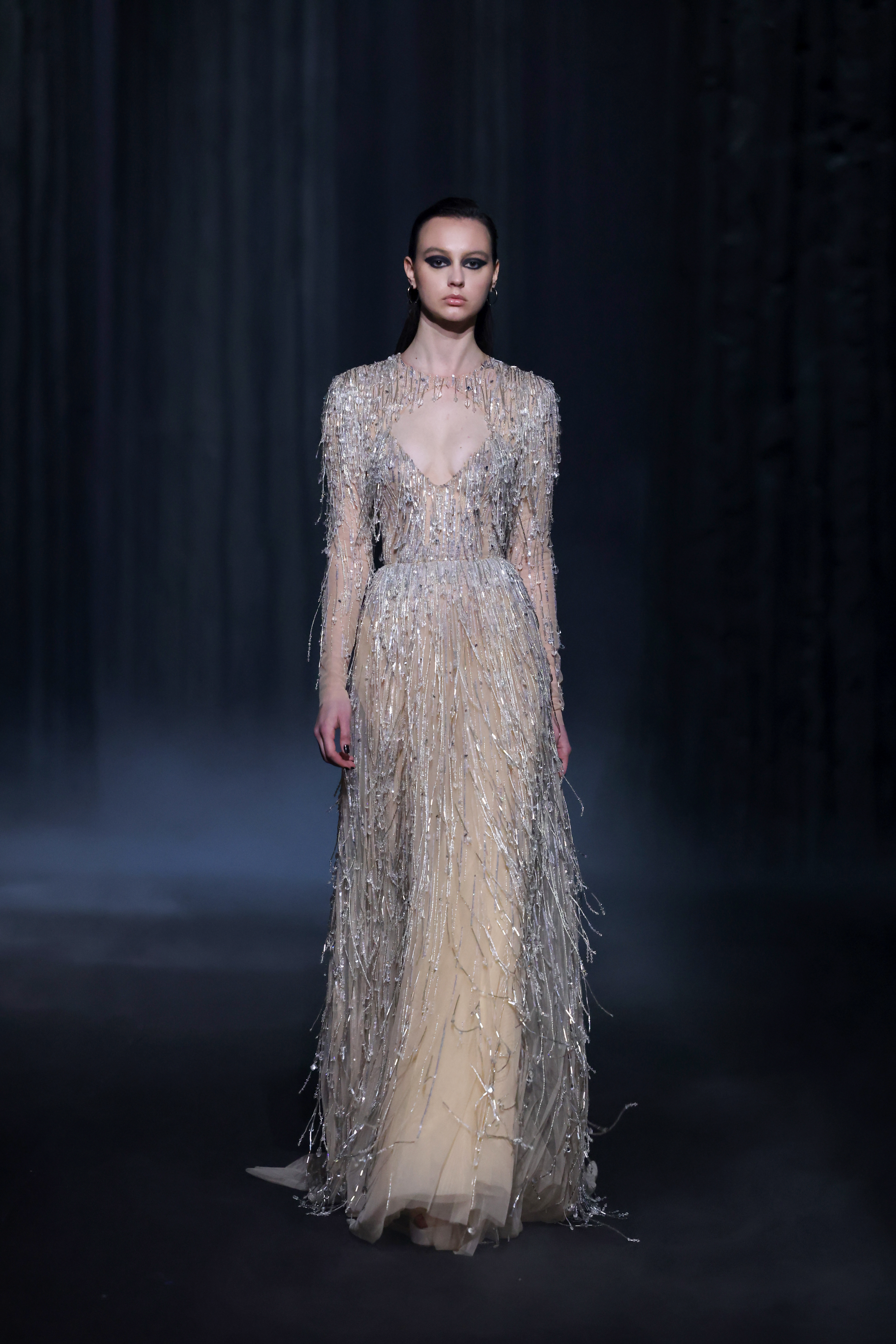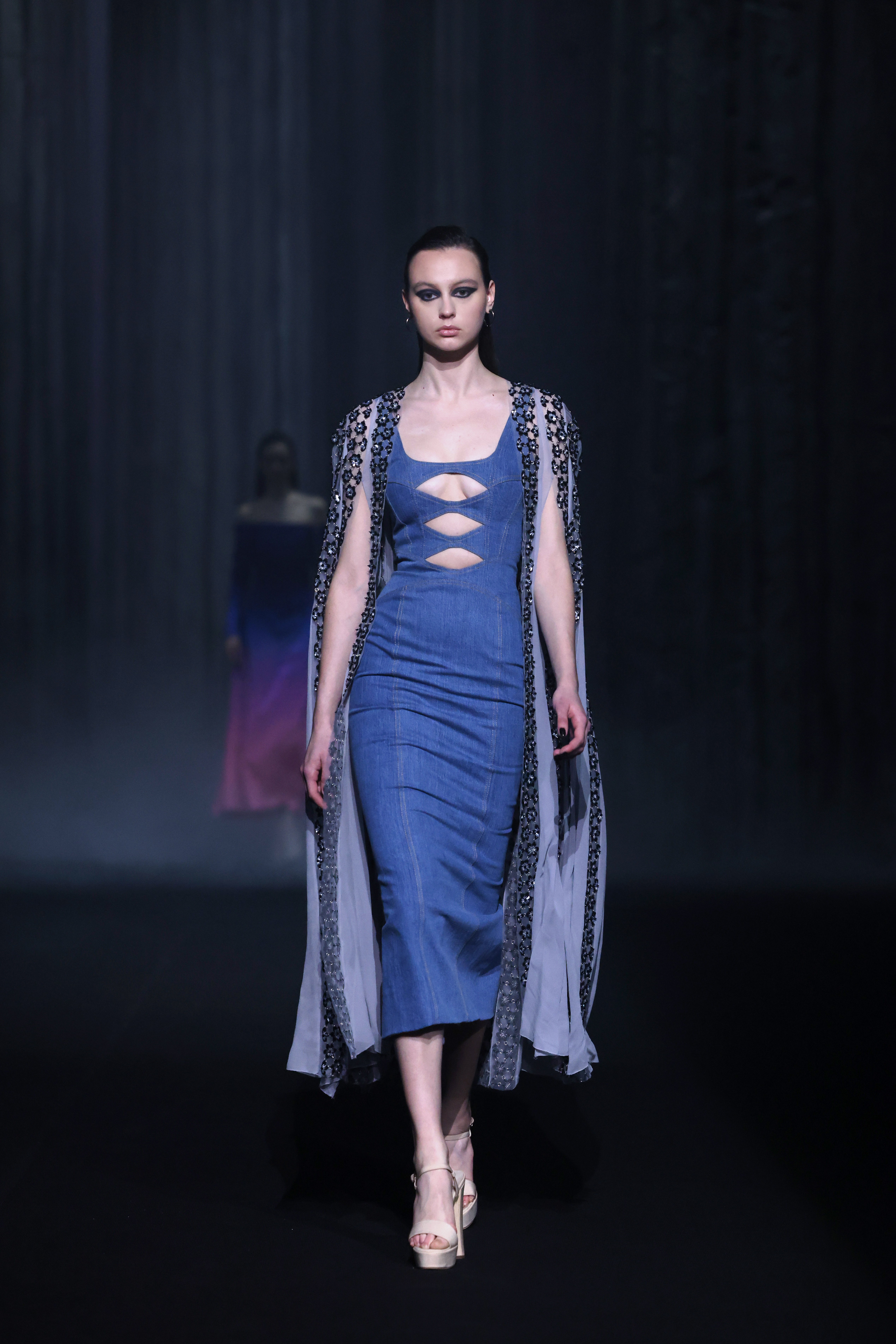 While references are resolutely other-worldly, shapes and materials bring a sense of reality to ornate silhouettes, with playful bomber jackets and the omnipresence of denim – a first for the Maison – treated here as a base for embroidery and dramatic shapes. Sweeping dresses offer butterfly detailing at the neckline, and nude trompe-l’œil pieces add a sense of spectacle. Sparkle comes from chain detailing on garments as well as interlinked chain necklaces and belts, with glittering vampire fangs featured as earrings. These creatures of the night come and inhabit the day with the poise and panache that are quintessential to Maison Georges Hobeika.