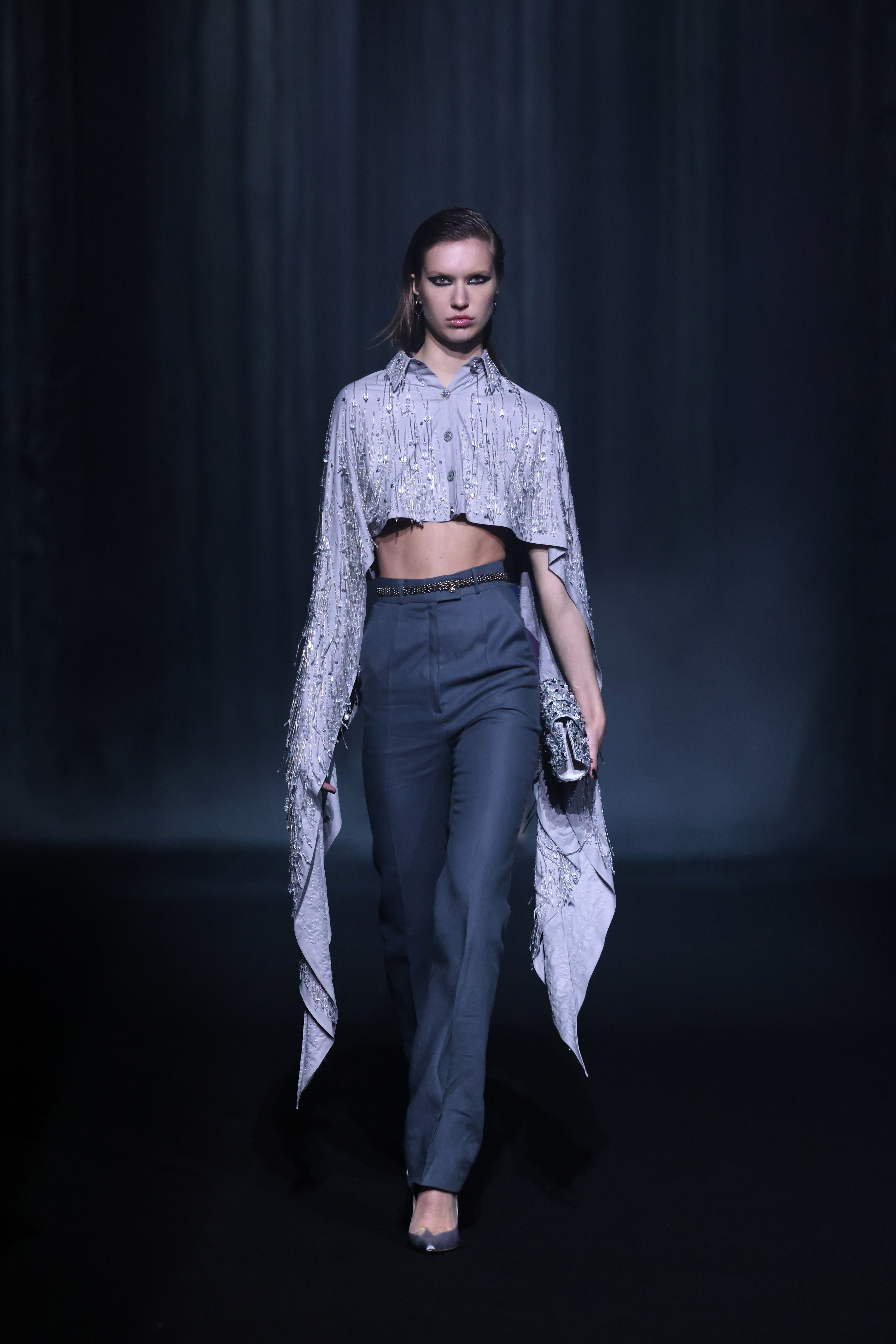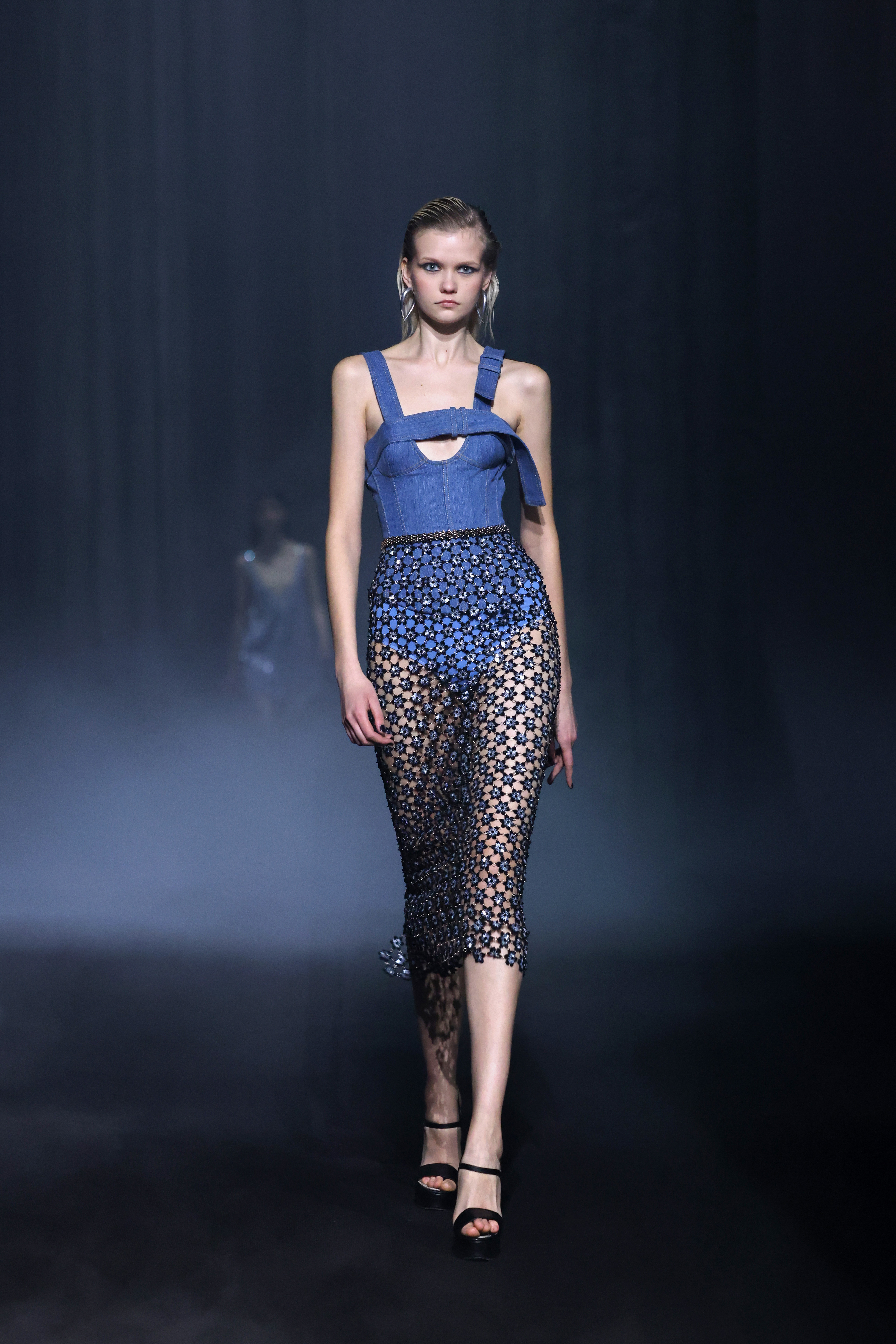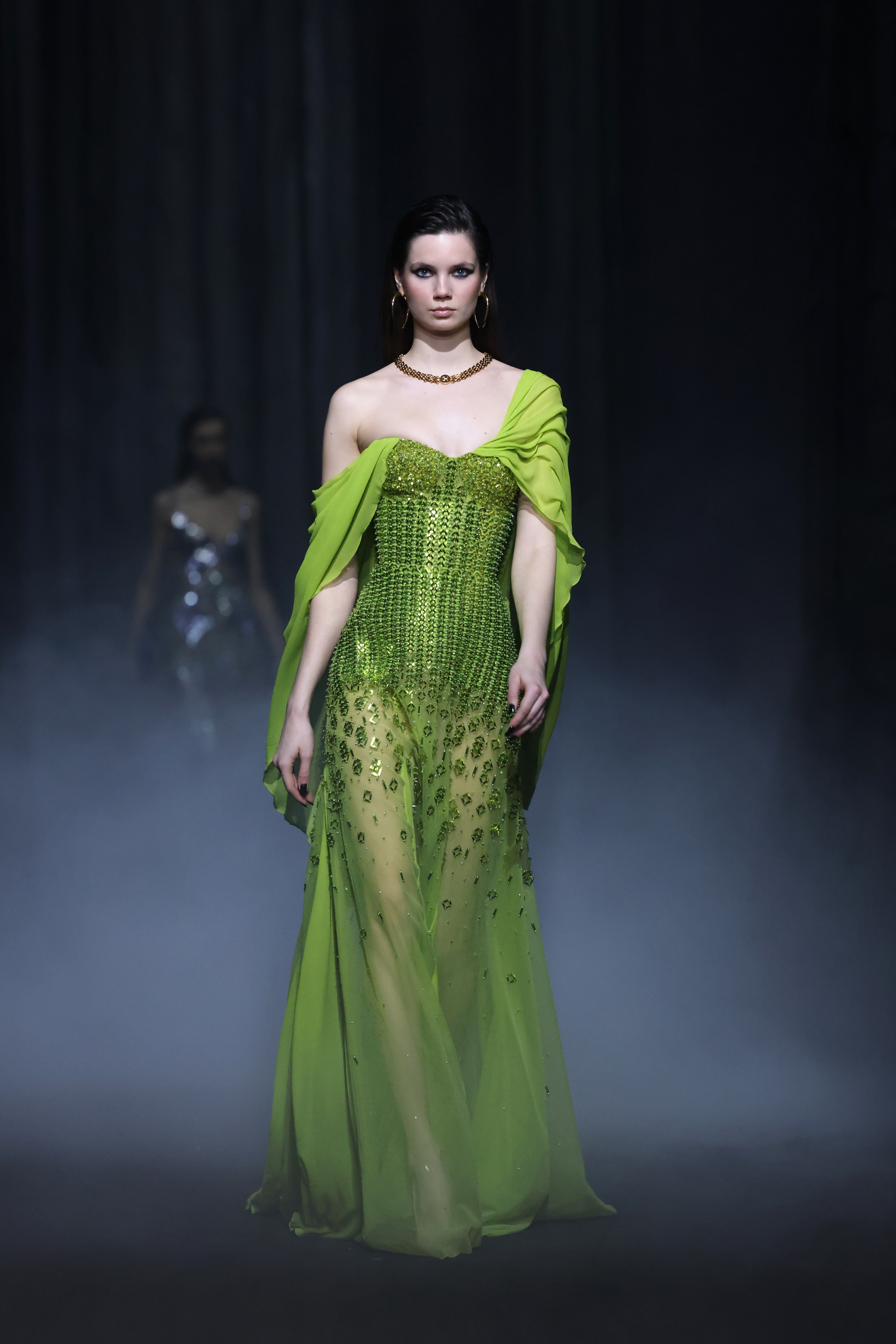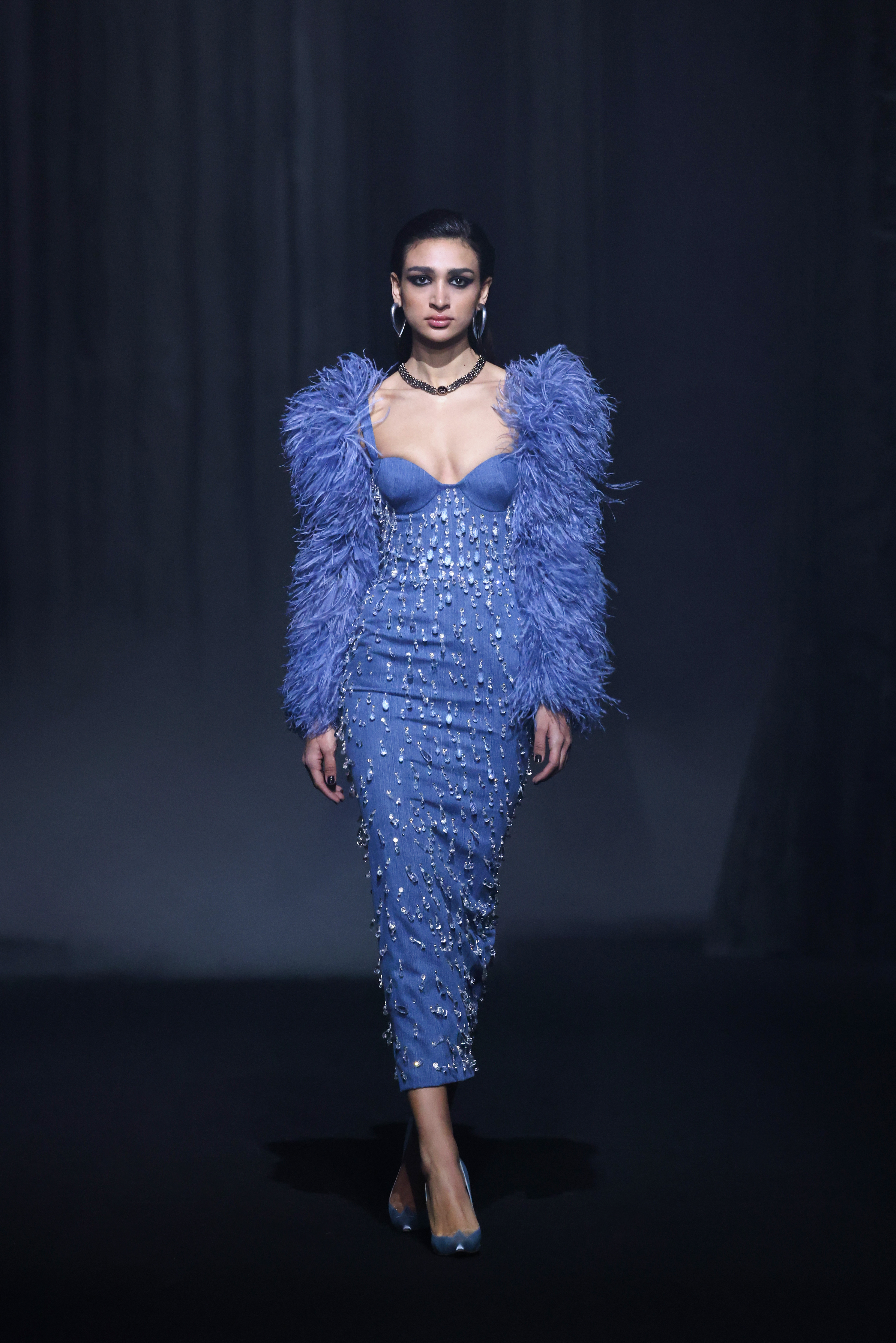 While references are resolutely other-worldly, shapes and materials bring a sense of reality to ornate silhouettes, with playful bomber jackets and the omnipresence of denim – a first for the Maison – treated here as a base for embroidery and dramatic shapes. Sweeping dresses offer butterfly detailing at the neckline, and nude trompe-l’œil pieces add a sense of spectacle. Sparkle comes from chain detailing on garments as well as interlinked chain necklaces and belts, with glittering vampire fangs featured as earrings. These creatures of the night come and inhabit the day with the poise and panache that are quintessential to Maison Georges Hobeika.