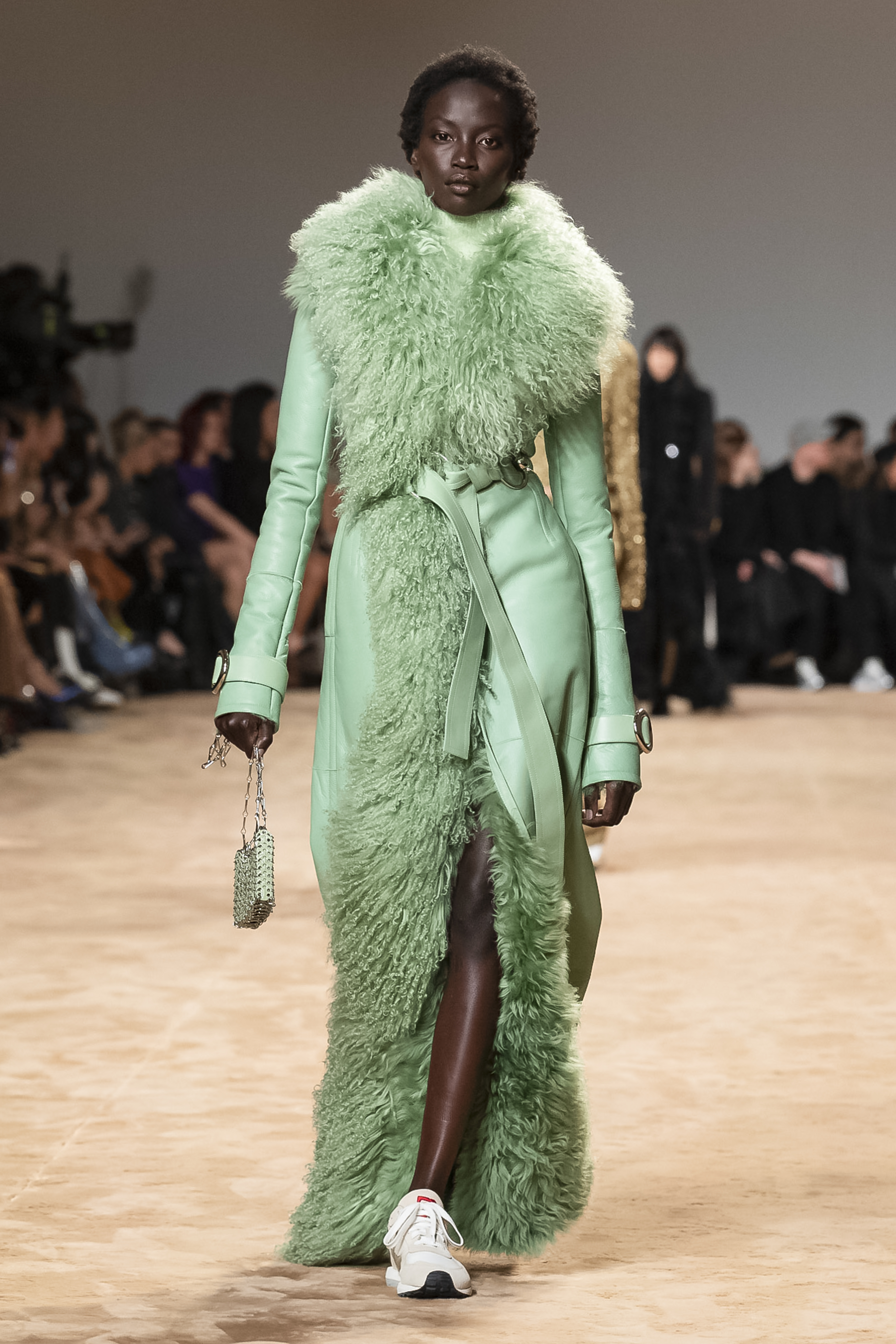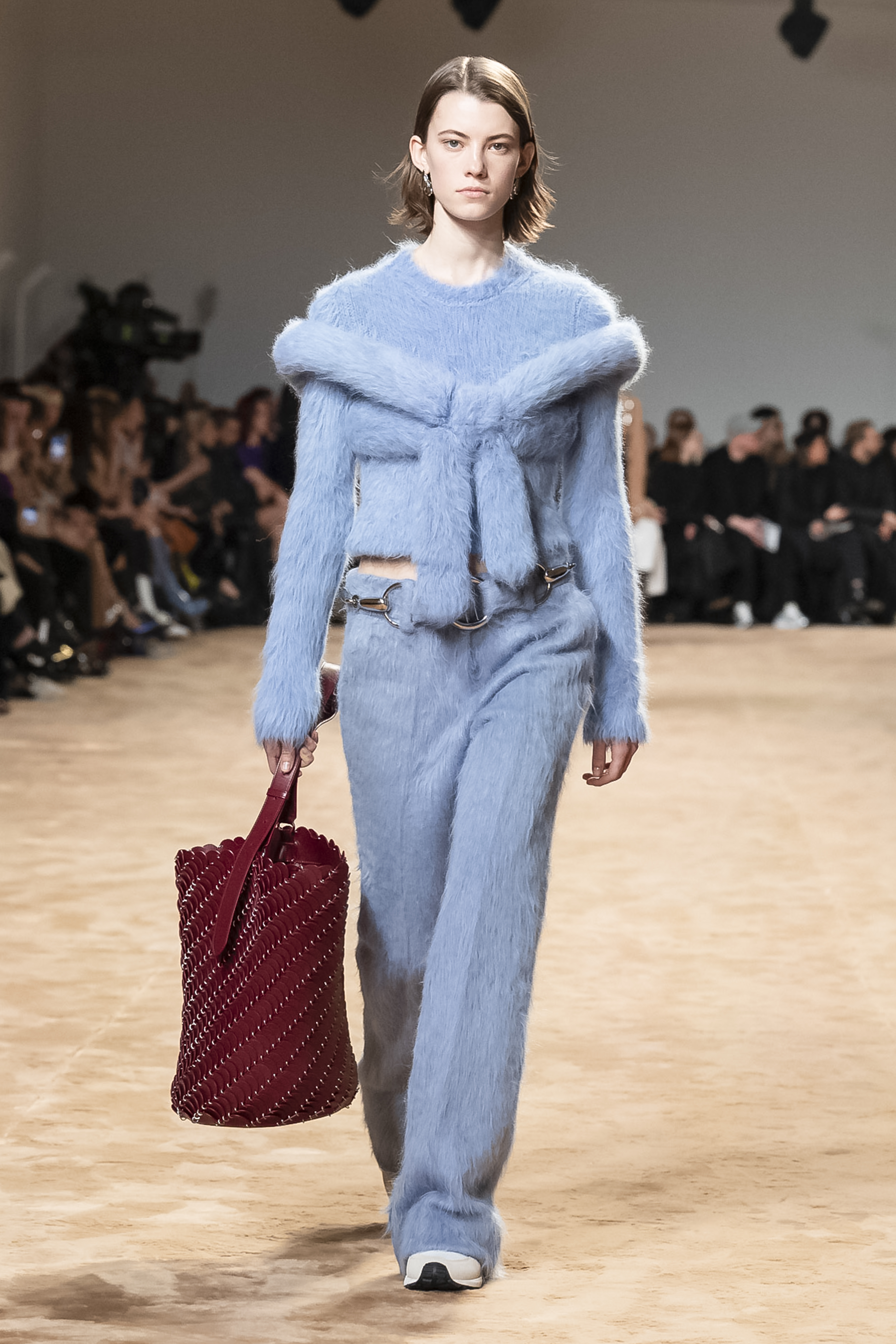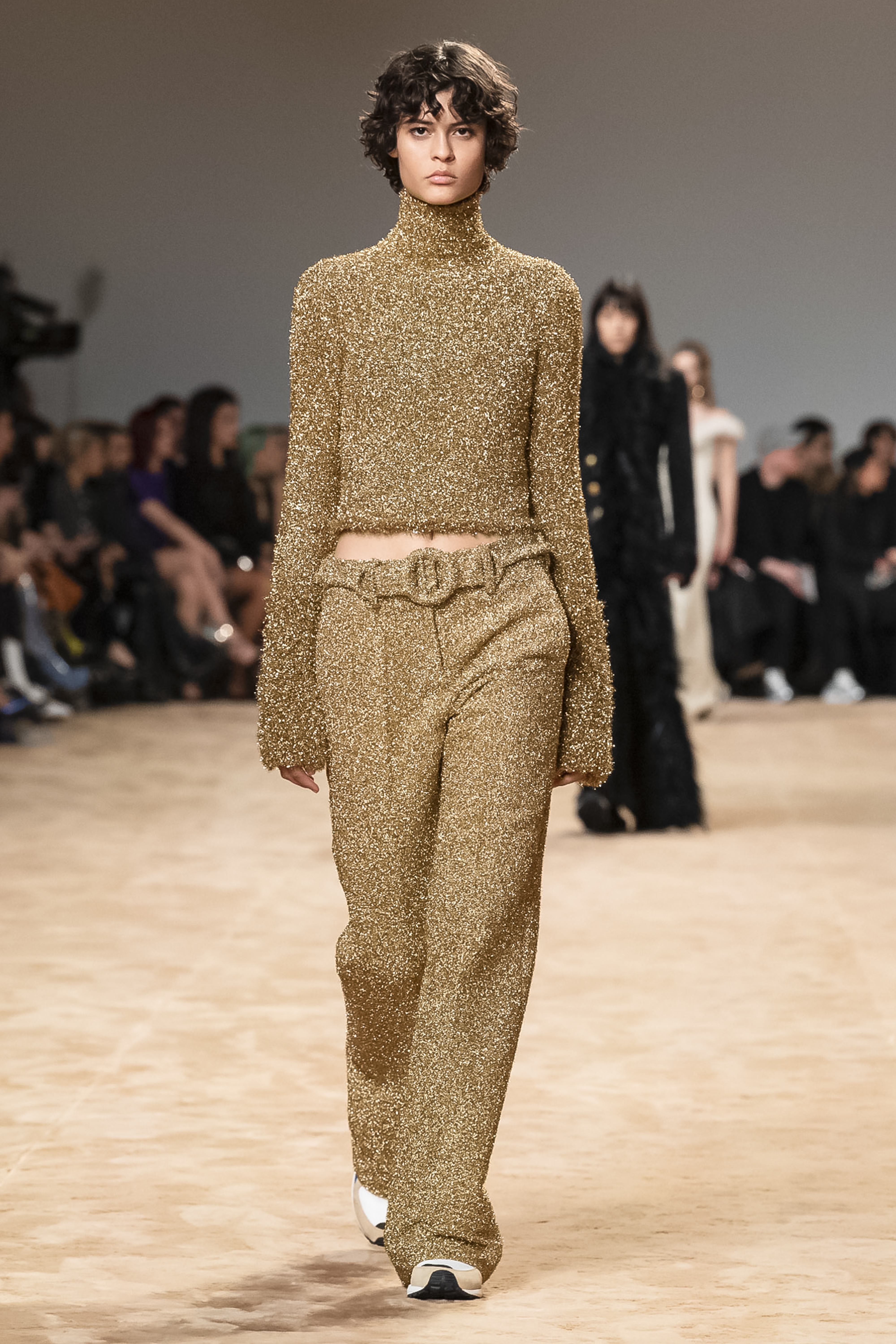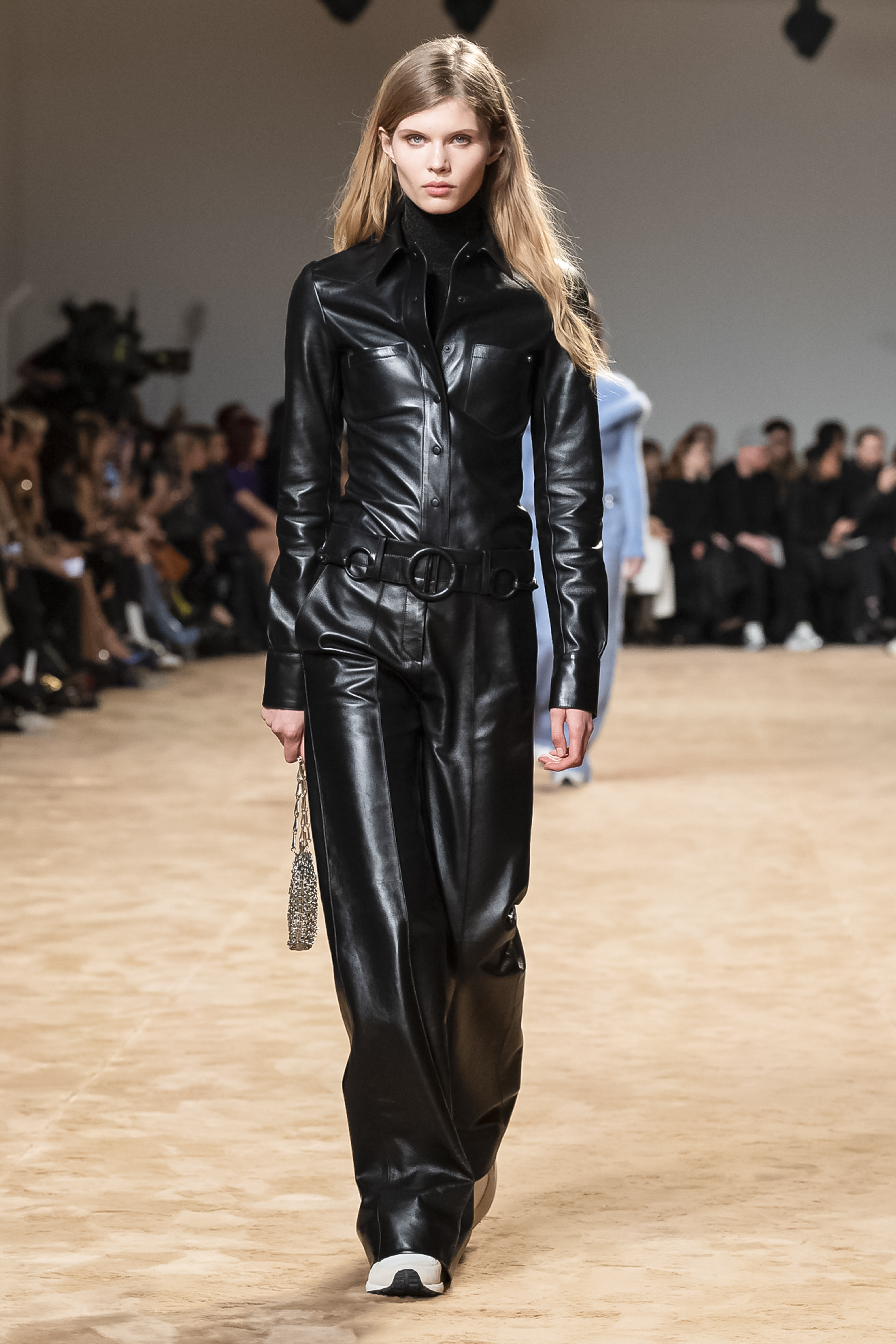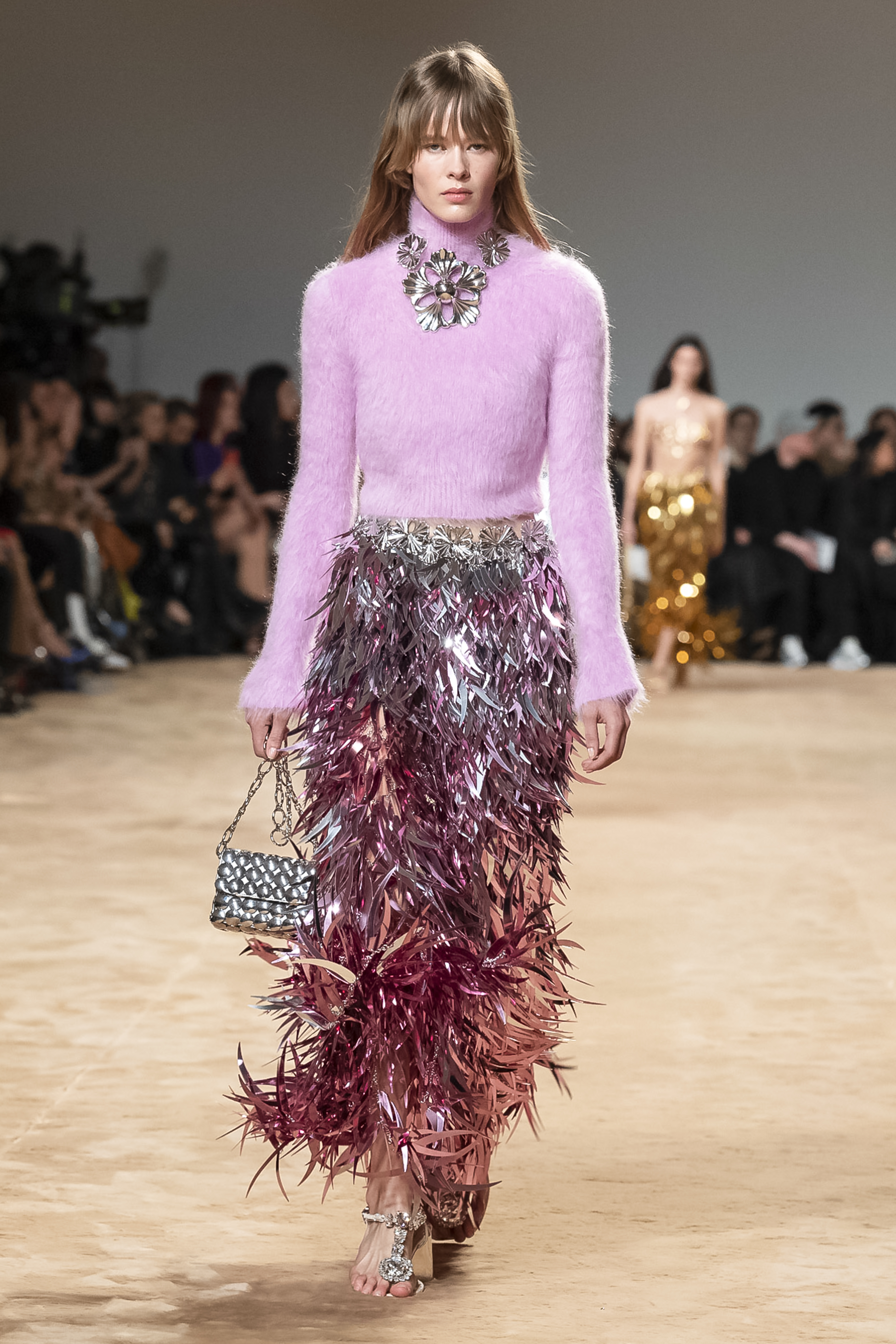 Interspersed throughout the sequence of looks, leather boots that fit like second skin boast reflective wedges as though floating. Pointy silver flats recall the earliest decade of Paco Rabanne, while a new retro sneaker grounds coordinated pieces with a ’90s allure. Bags revisit signature elements as evolved studies: pastilles torqued and twisting; glossy colour atop the assemblages; organic, compact shapes.