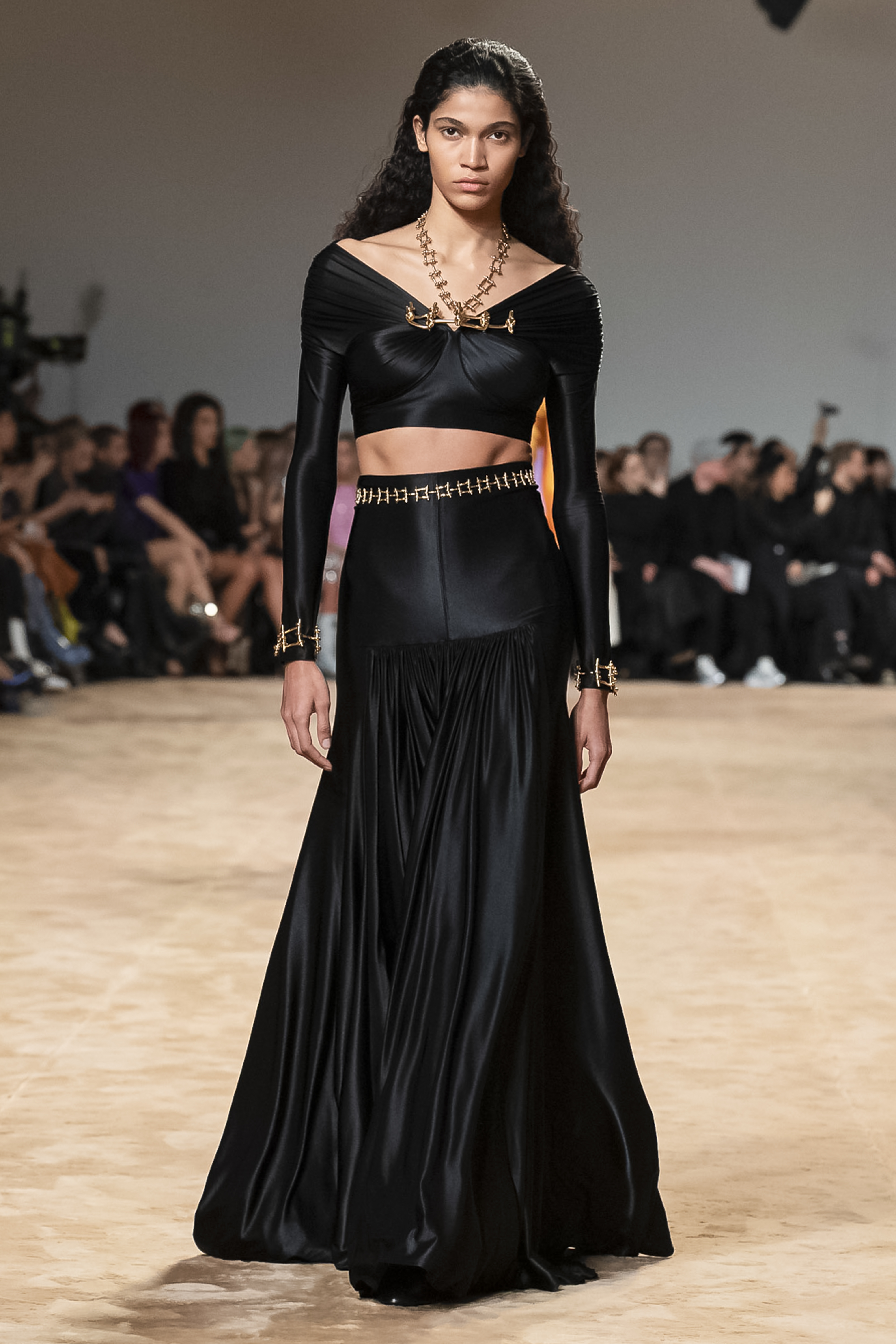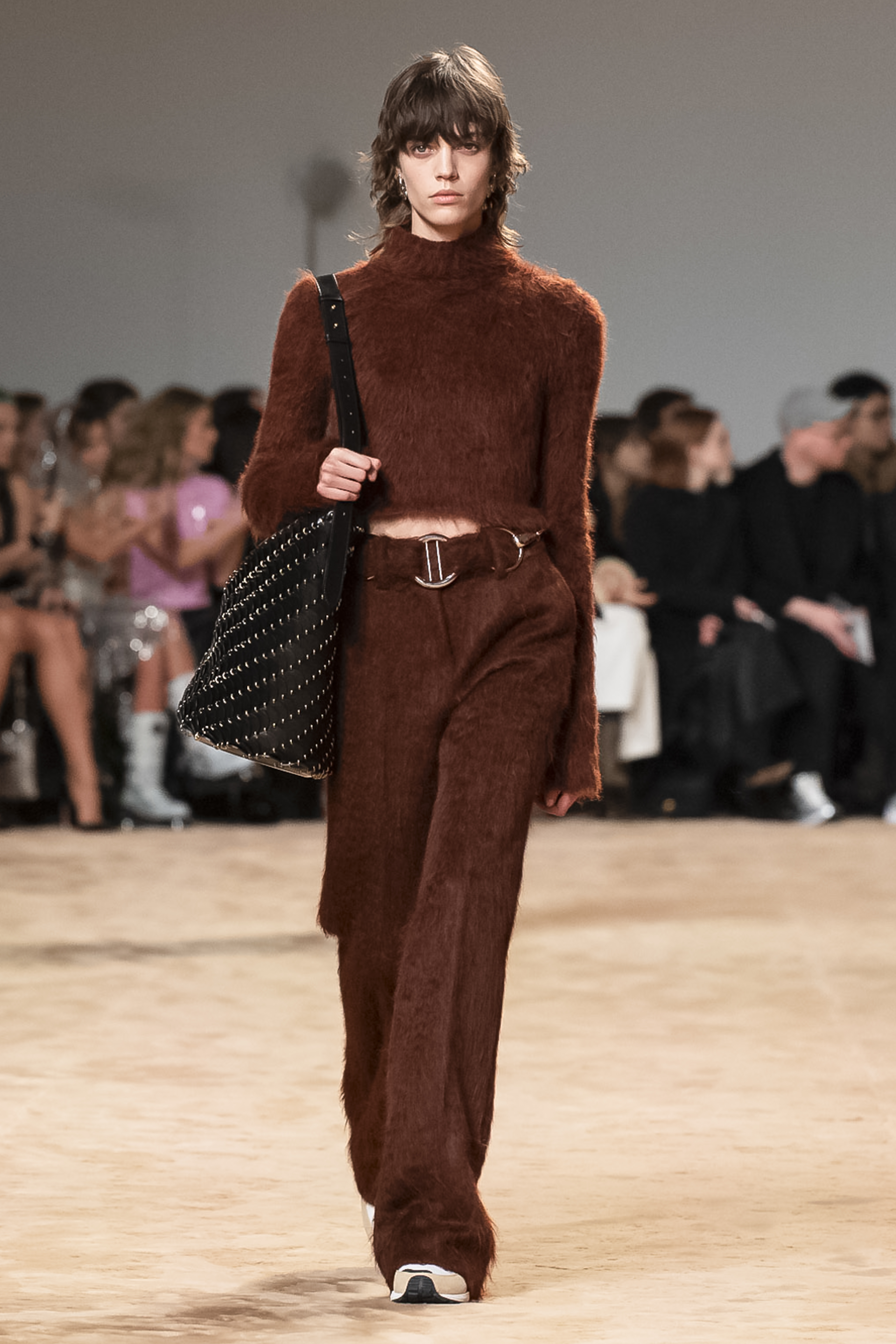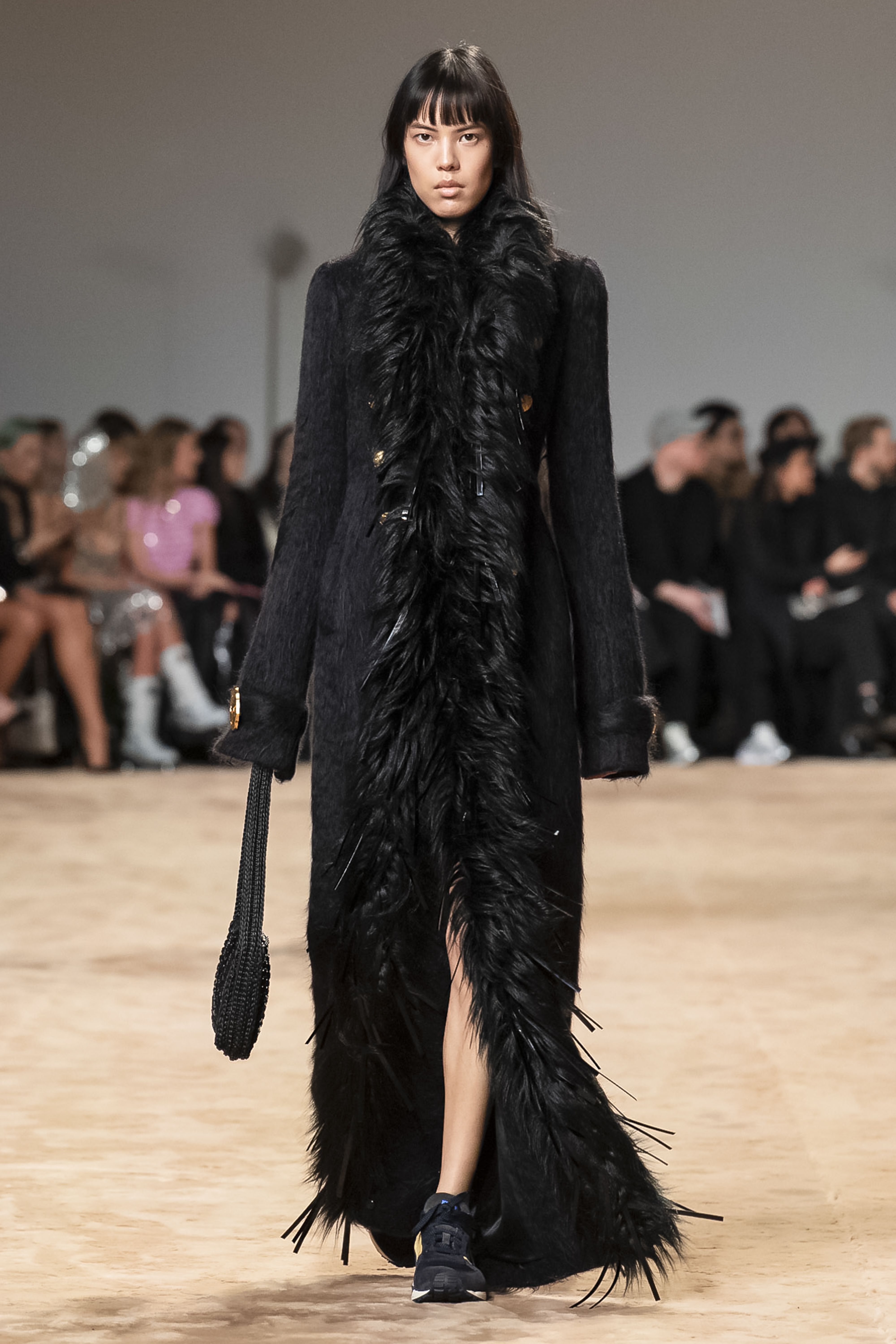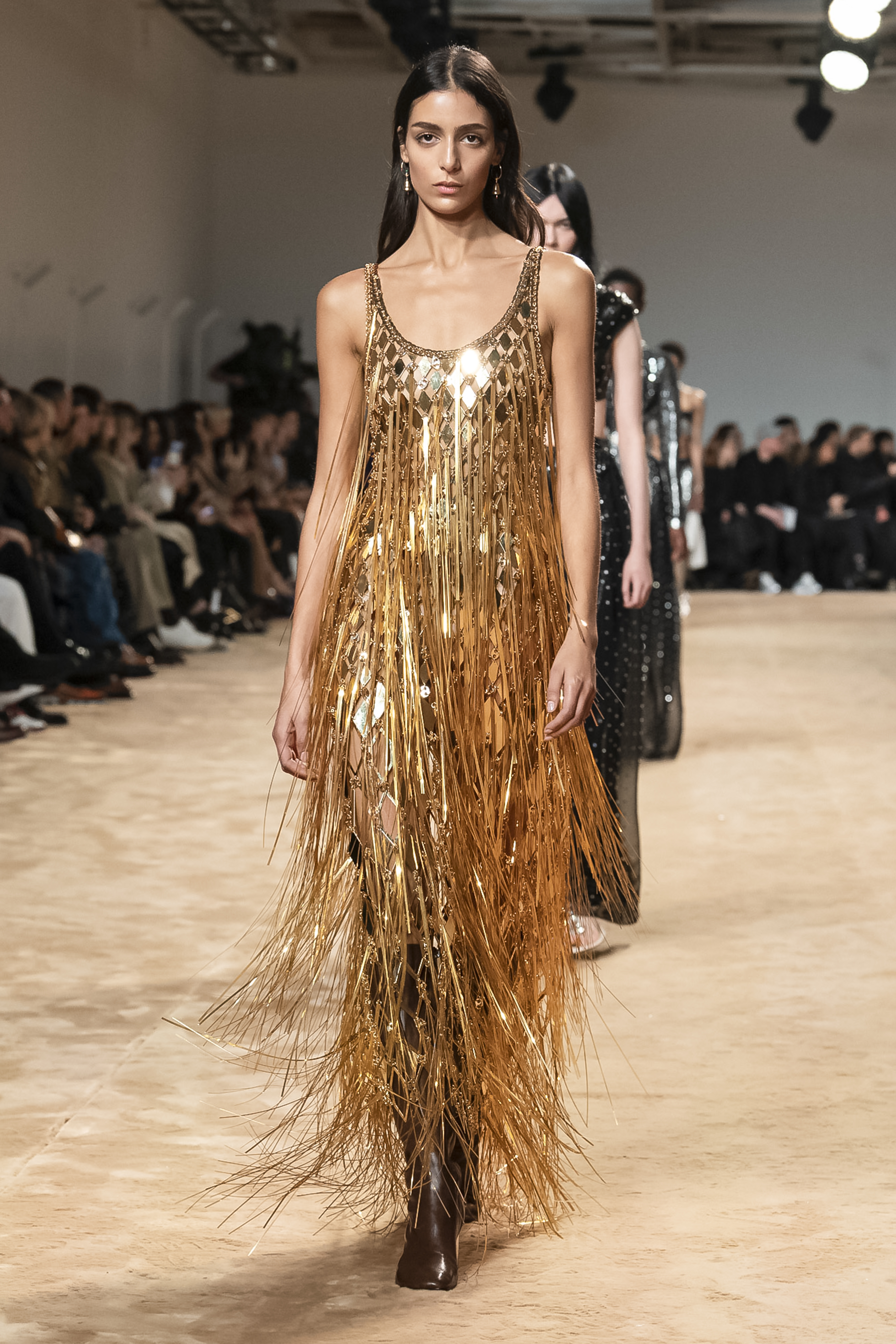 Interspersed throughout the sequence of looks, leather boots that fit like second skin boast reflective wedges as though floating. Pointy silver flats recall the earliest decade of Paco Rabanne, while a new retro sneaker grounds coordinated pieces with a ’90s allure. Bags revisit signature elements as evolved studies: pastilles torqued and twisting; glossy colour atop the assemblages; organic, compact shapes.