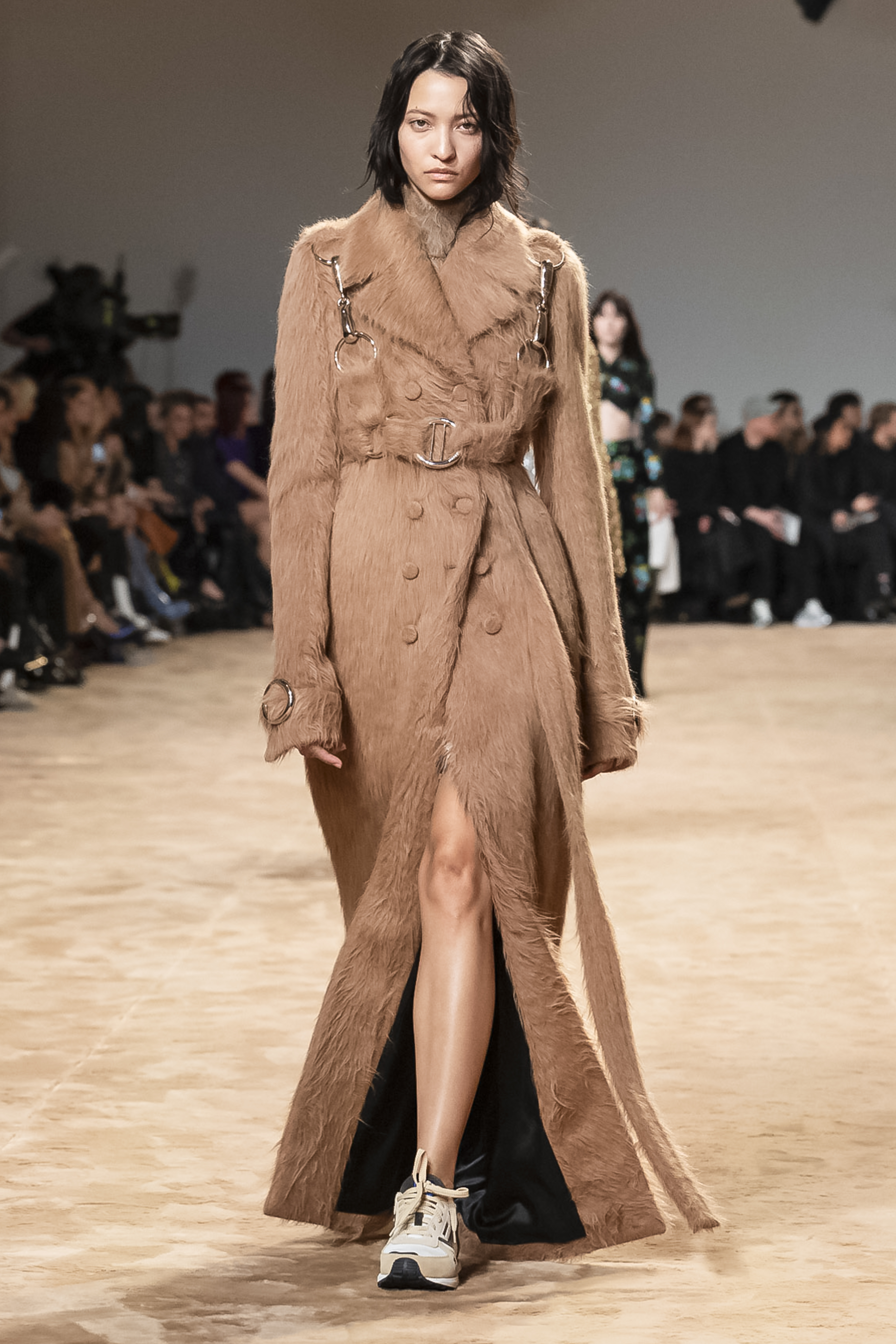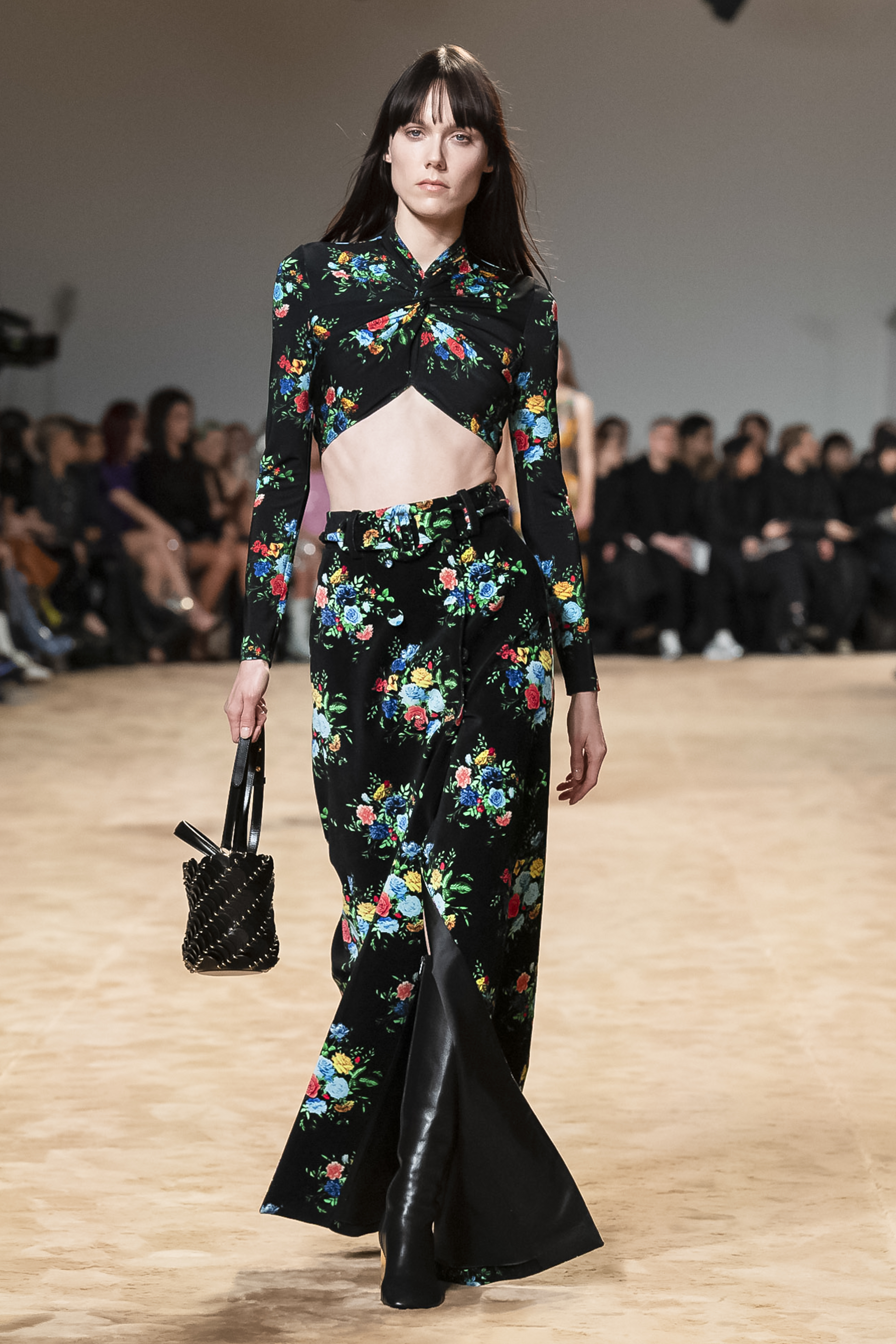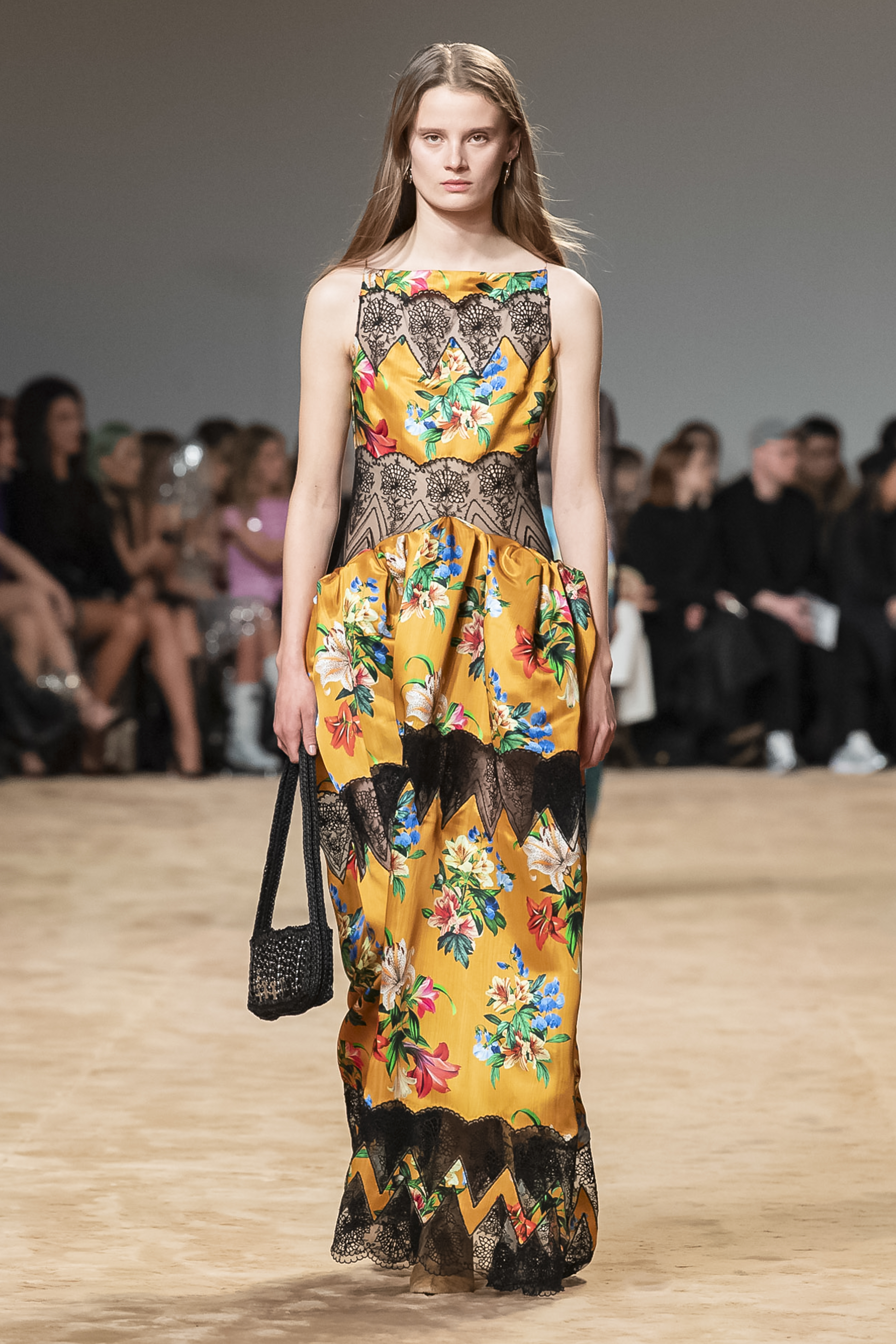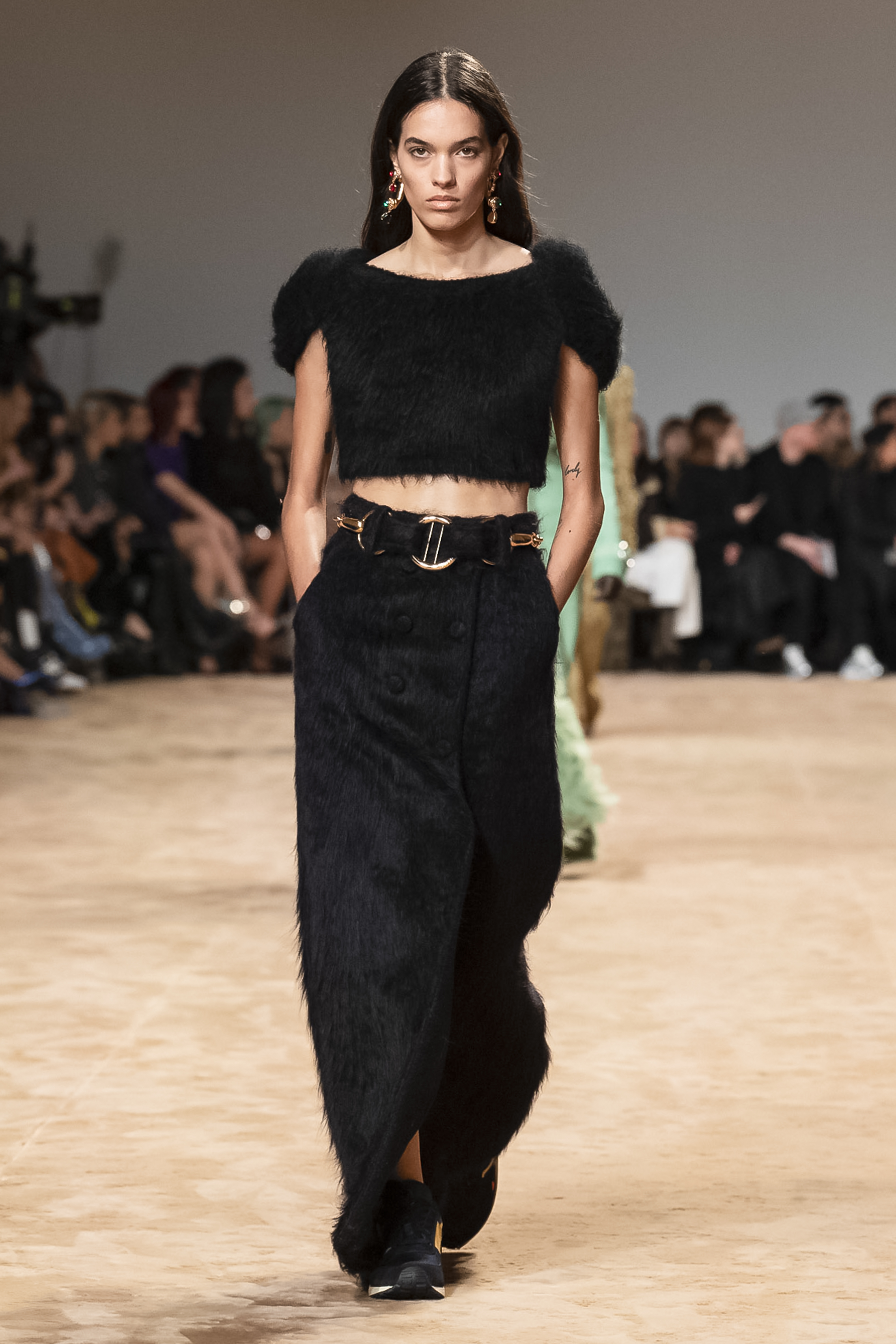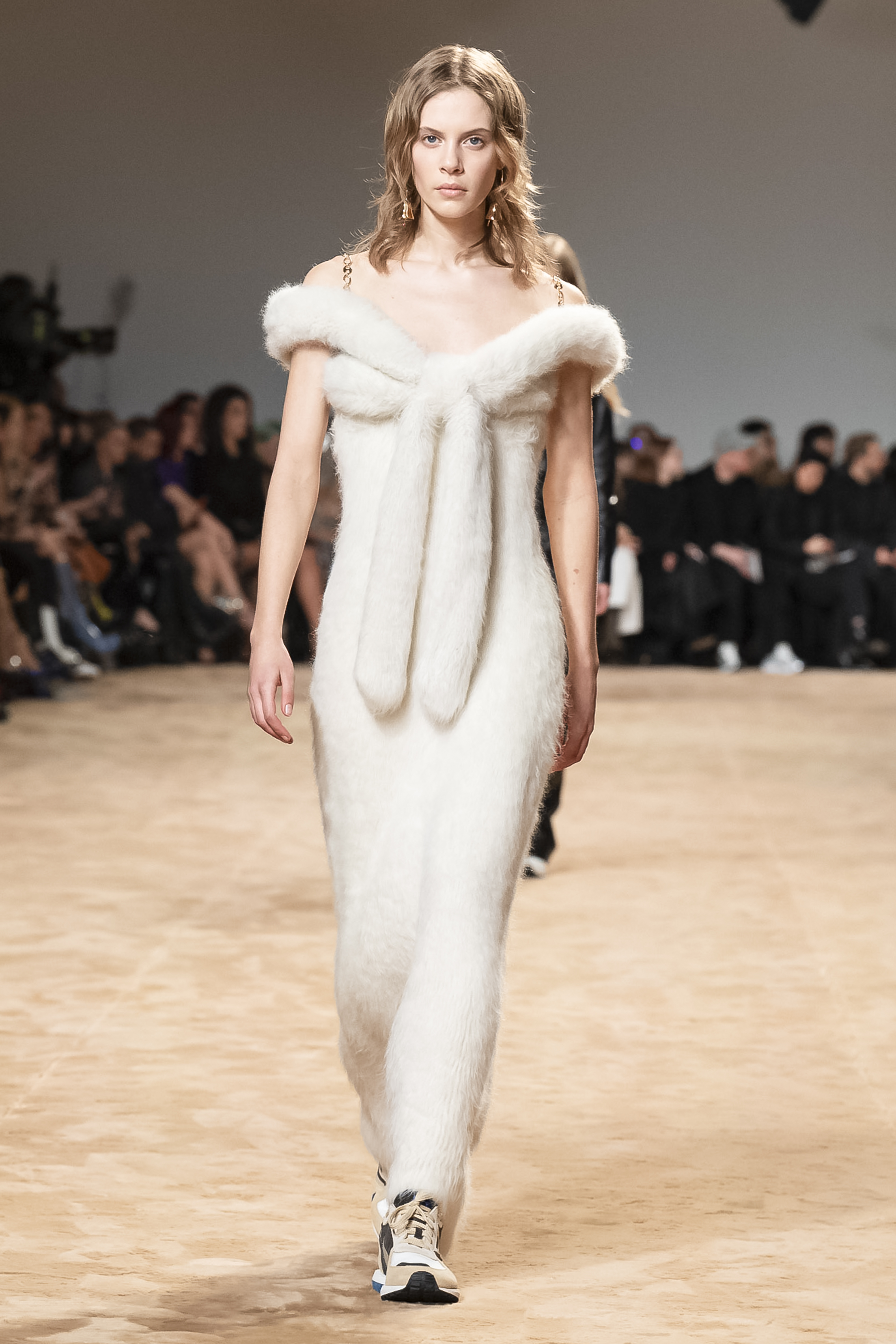 Interspersed throughout the sequence of looks, leather boots that fit like second skin boast reflective wedges as though floating. Pointy silver flats recall the earliest decade of Paco Rabanne, while a new retro sneaker grounds coordinated pieces with a ’90s allure. Bags revisit signature elements as evolved studies: pastilles torqued and twisting; glossy colour atop the assemblages; organic, compact shapes.