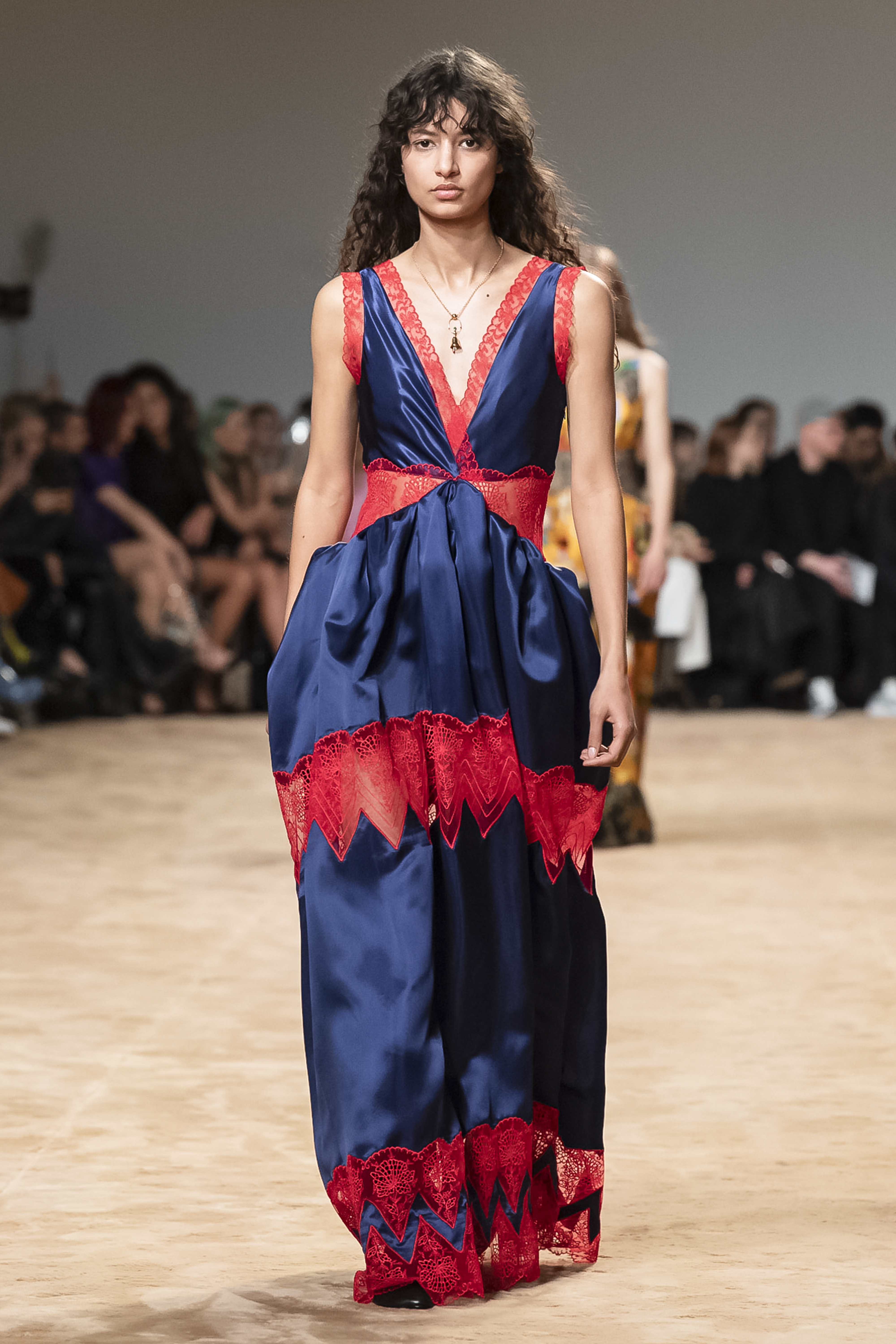 Extracts from the artists’ imagination show up elsewhere: a bejeweled pomegranate virtually throbs at the gathered heart of a flou dress; small telephones dangle from earlobes.