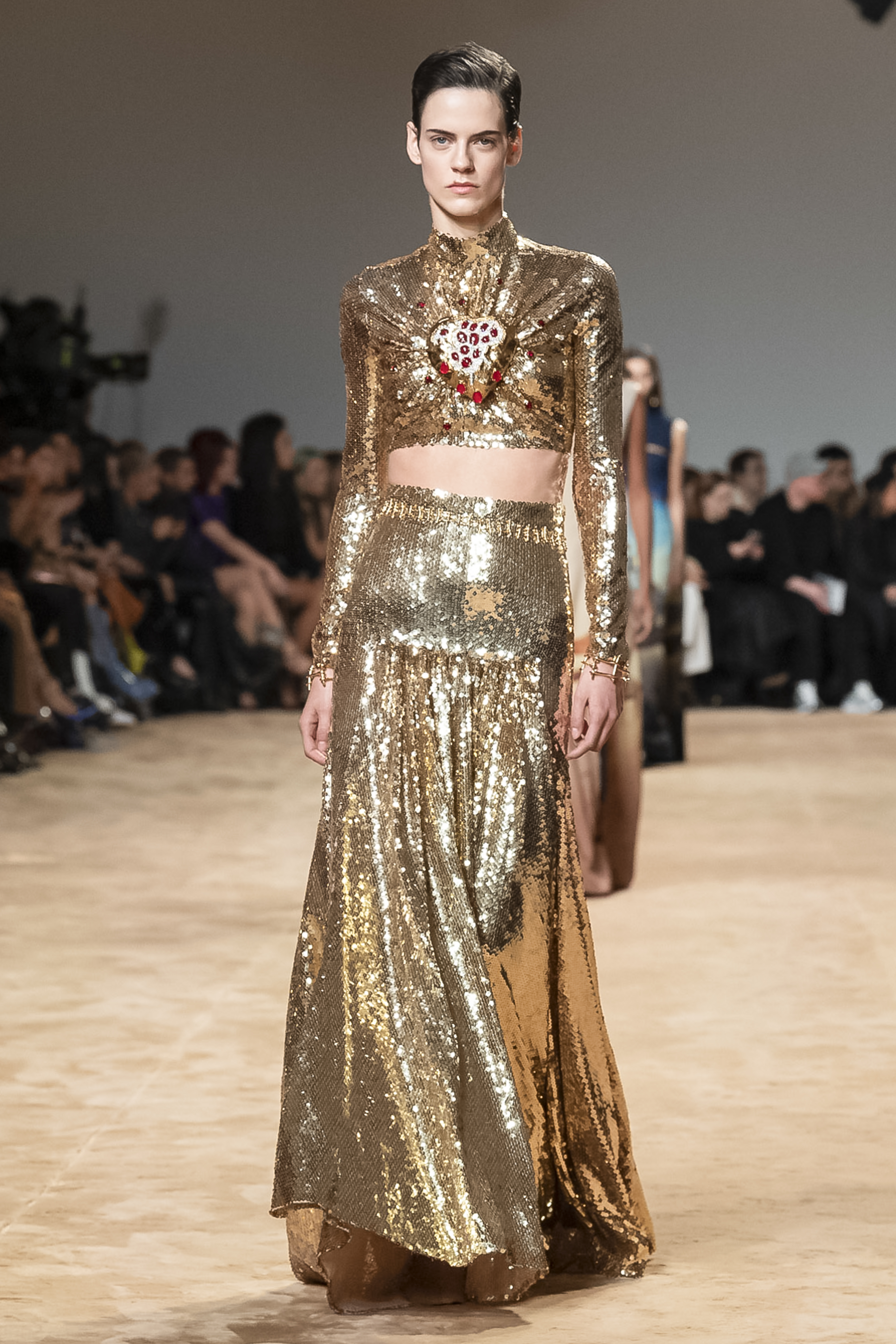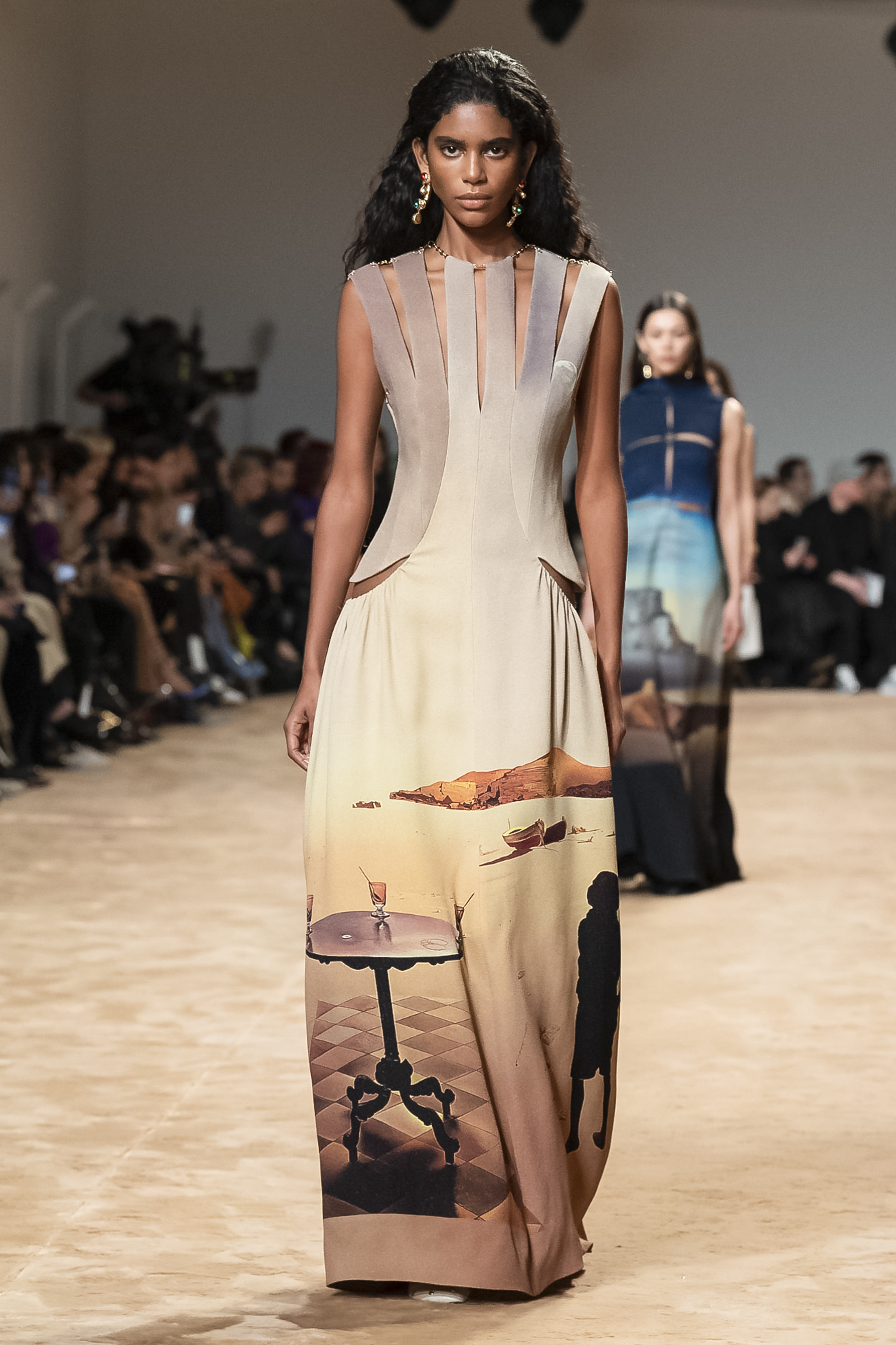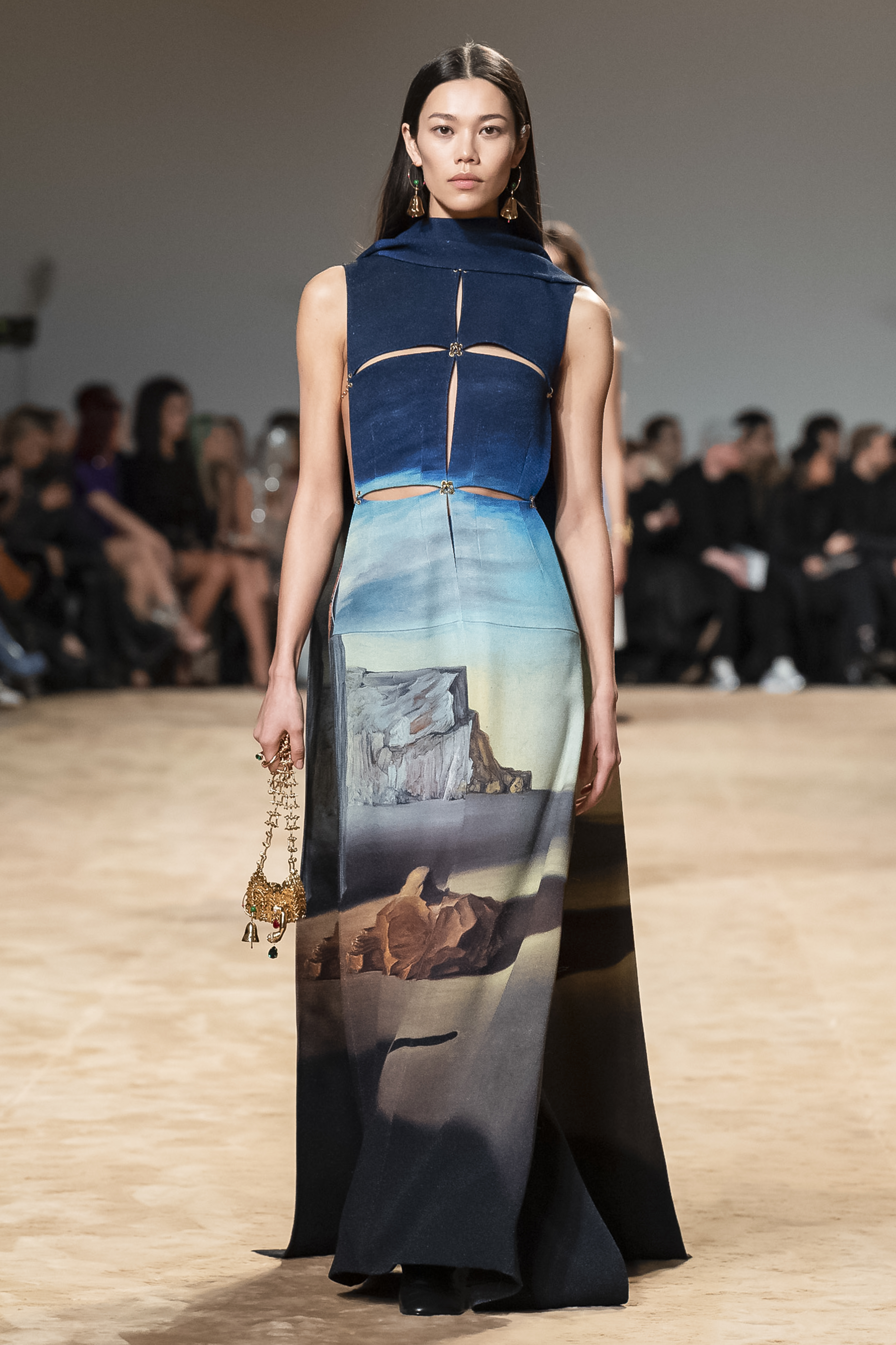 In this modern material awakening, Julien Dossena channels the historic friendship between Paco Rabanne and Salvador Dalí: two Spanish visionaries linked by their radical artistic expression. From women outfitted in contemporary armour to landscapes unbound by natural laws, they created parallel and, at times, overlapping worlds that were at once magical, mystic and mysterious.