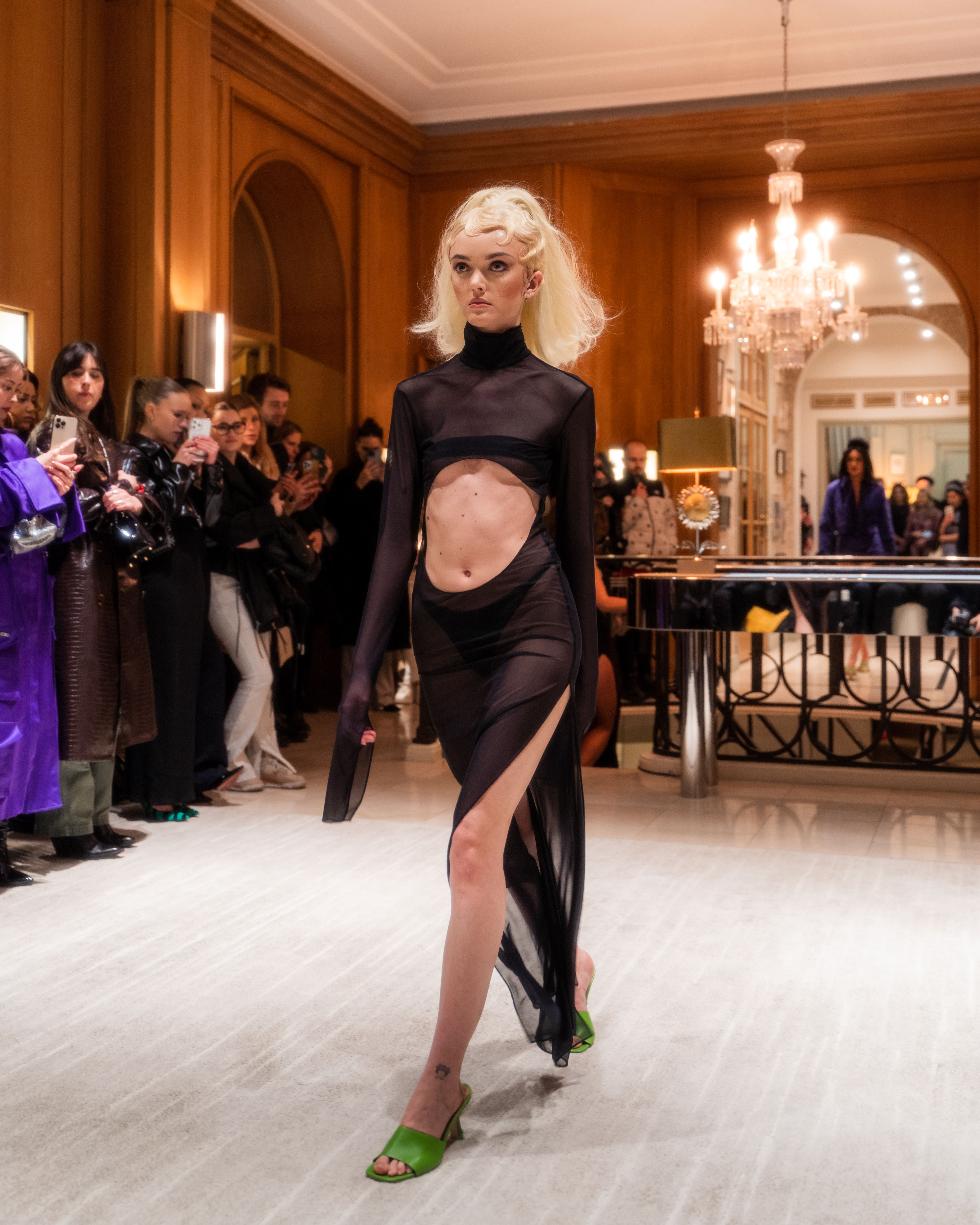 Mixing the fabrics, the designer works this season with transparent mesh and wool to create a marked contrast all around the show, allowing the body to reveal itself.