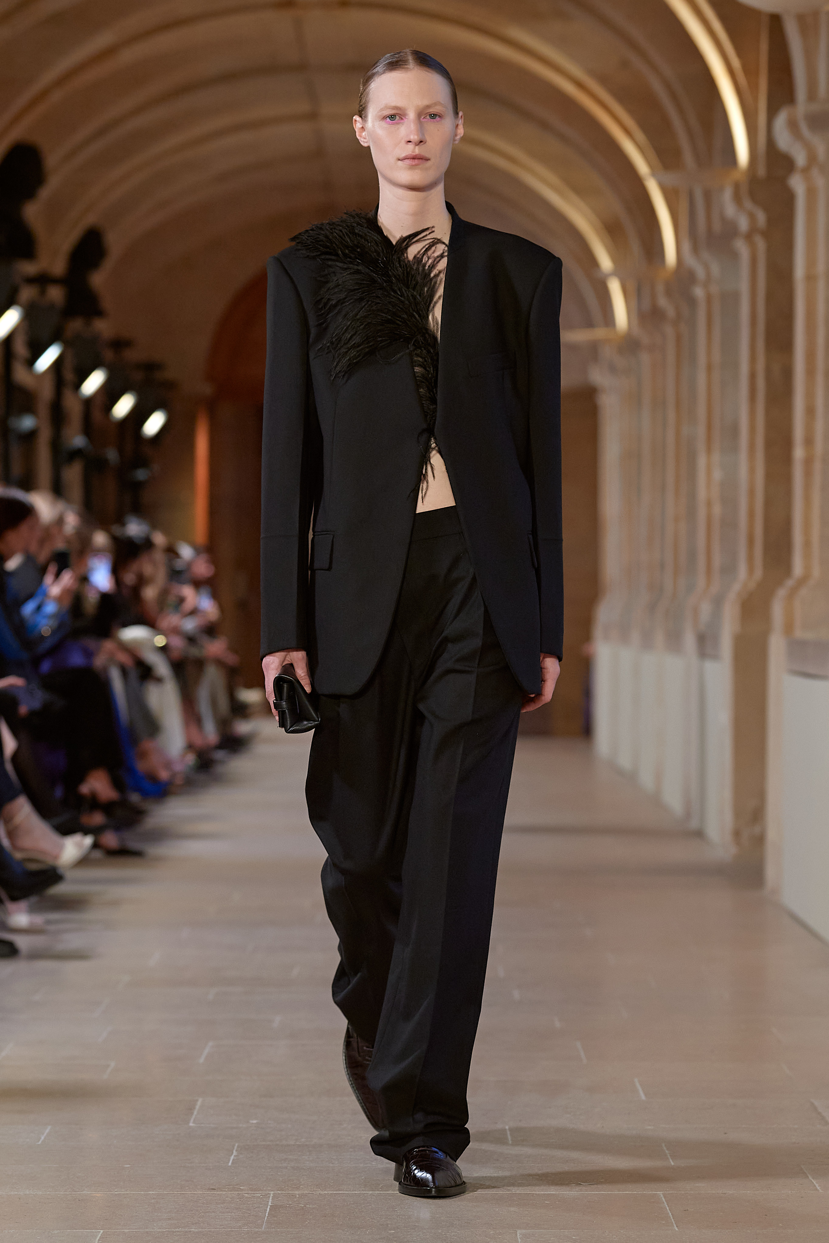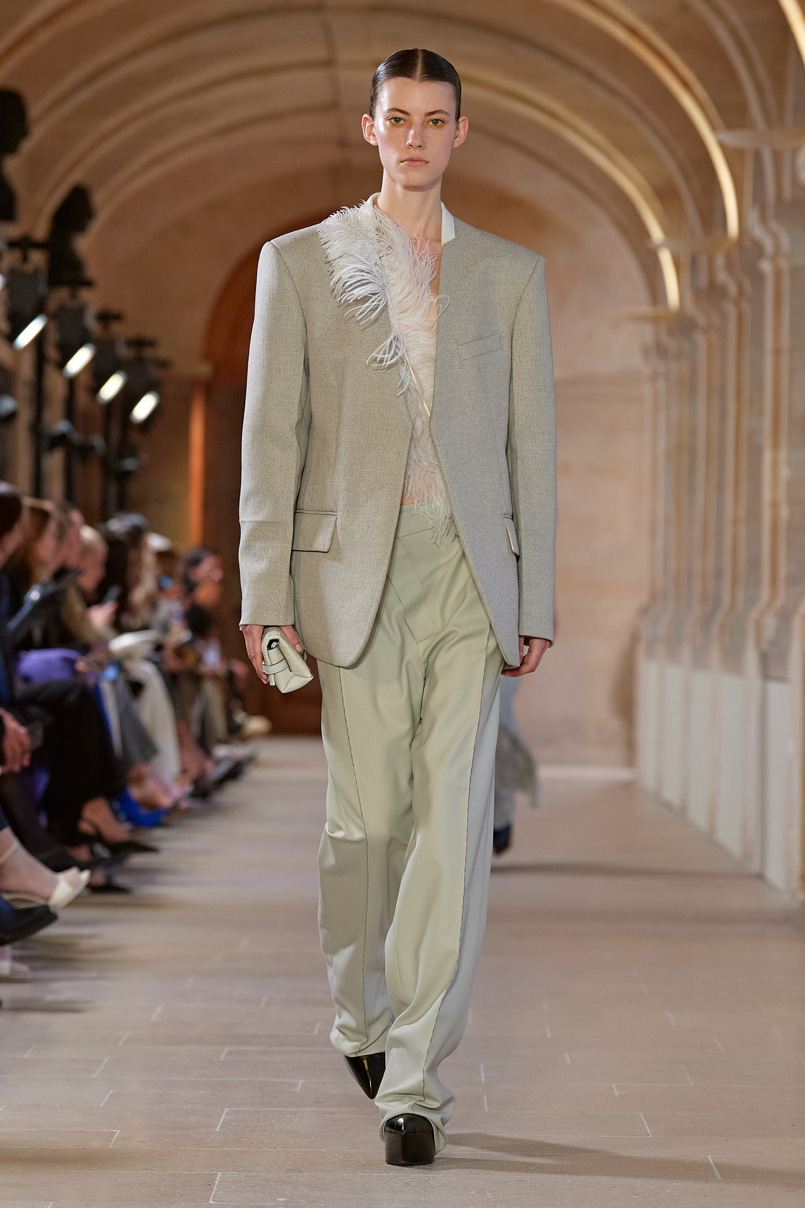 Dresses erratically composed from raw patchworks of plissé set an eccentric tone for the season silhouette. They are adorned with large feathers that serve as underpinnings in looks throughout, and enter into trippy plume prints on day and evening dresses. An optical illusion, the prints feed into a focus on texture central to the collection. From shadow plays on transparency to tactile surfaces and things that aren’t what they seem, the effects imbue garments and accessories with a magnetic sense of oddness. Informed by the work of the Brazilian artist Solange Pessoa – who spent decades gathering human hair for her formidable installations – crochet knitwear and bibs are woven from hair extensions, pumps are crafted in the same material, and locks of faux hair slither from hem and necklines.