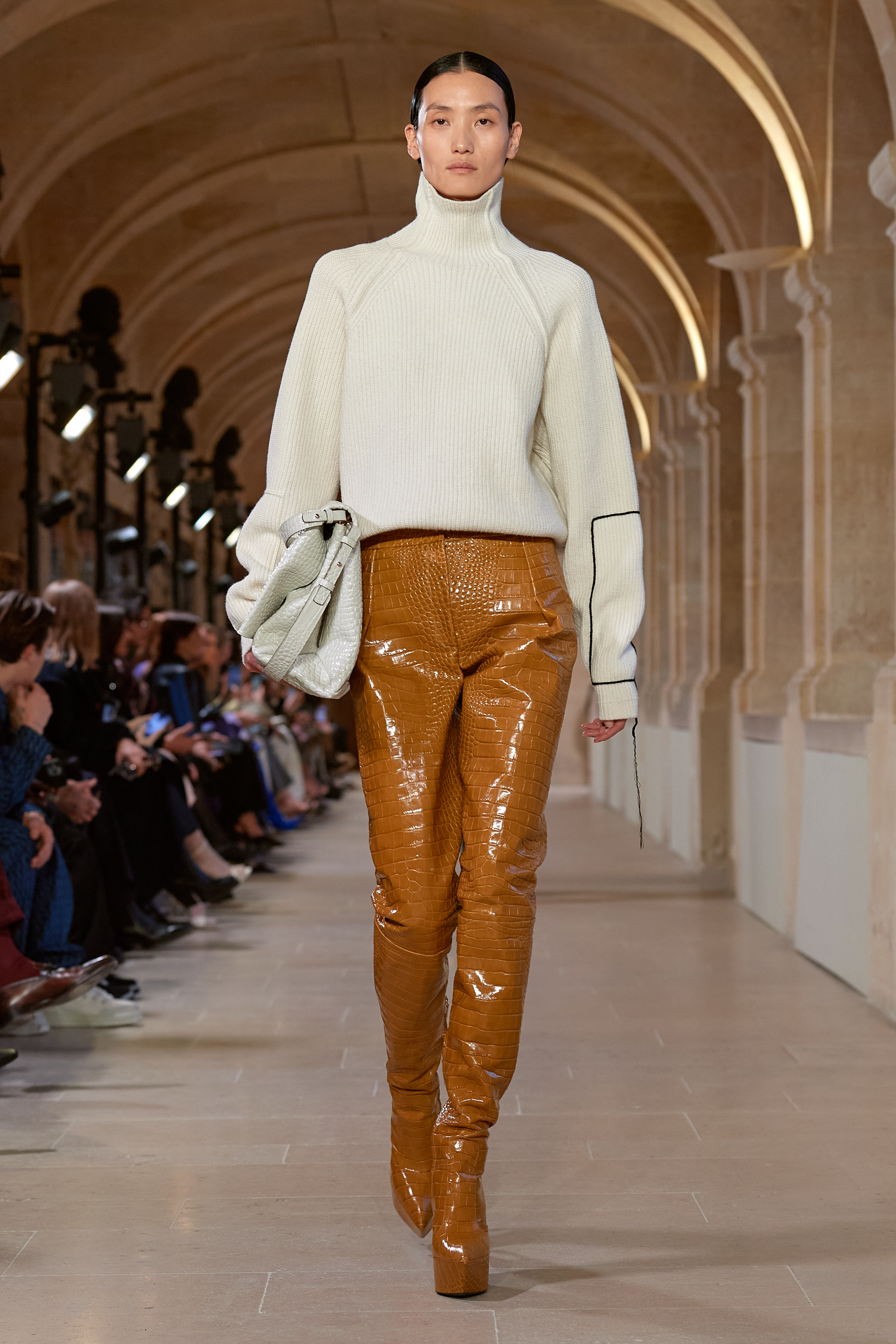 The pointed toe of sky-high platform shoes in glazed, patent or croc-embossed leather indicates a V, mirrored in a heel that forms the same letter. The collection introduces a new maxi take on the Victoria Beckham Bucket bag in croc-embossed leather. It is presented alongside the Chain Pouch in grained or croc-embossed leather, which manifests in its original size, as a jumbo, a mini, and as a new nano size.