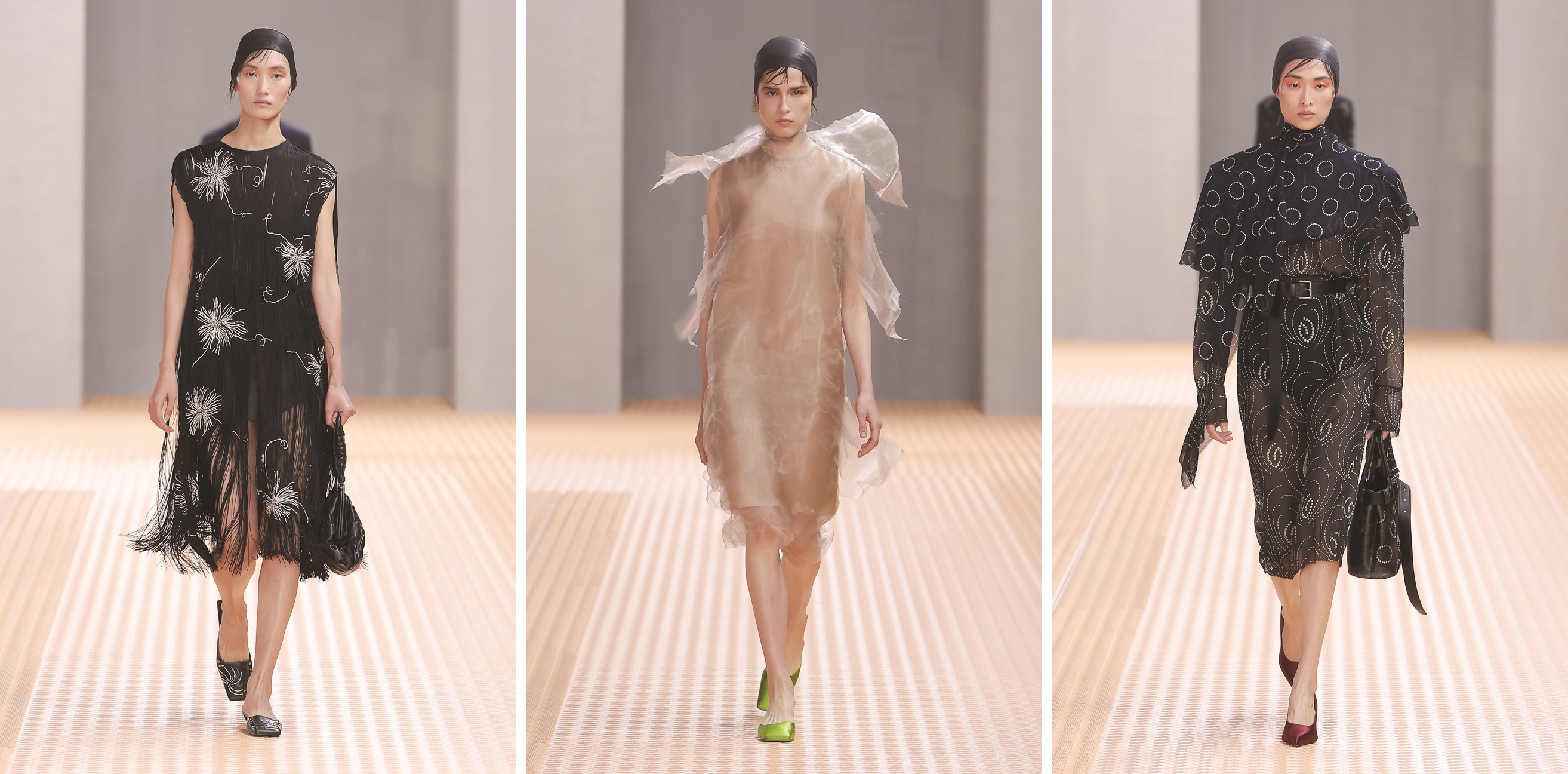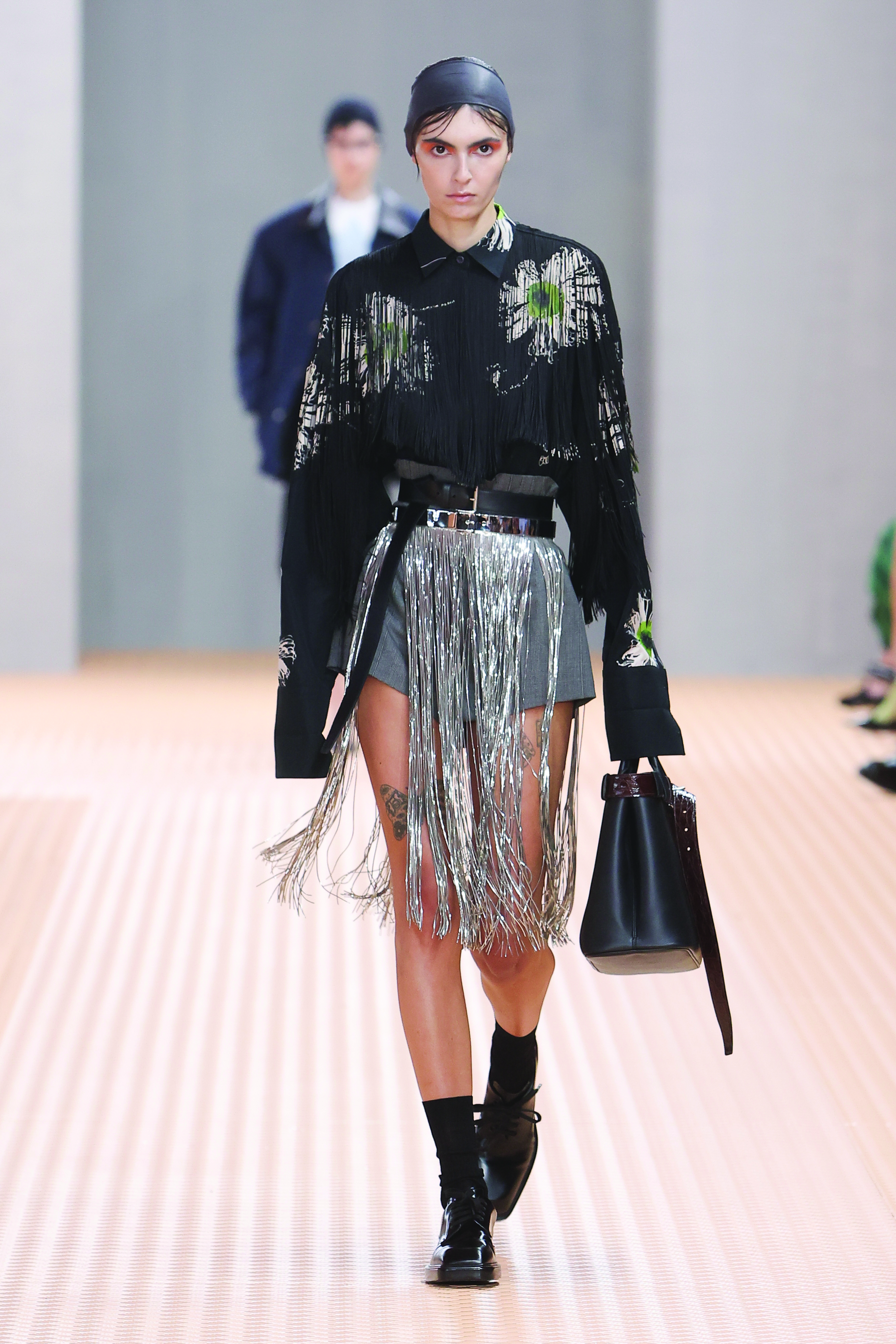 For the September 2023 Prada show, a bag designed by Mario Prada, originating around circa 1913 and held in the Prada archives, is both reproduced and reinterpreted. An evening bag with frame clasp, it features a hand-carved fastening depicting a mythological figure, a reflection of contemporary enthusiasm for historical Eastern artistic aesthetics and styles that exerted a great influence worldwide on decorative and fine arts across the late nineteenth and early twentieth century.