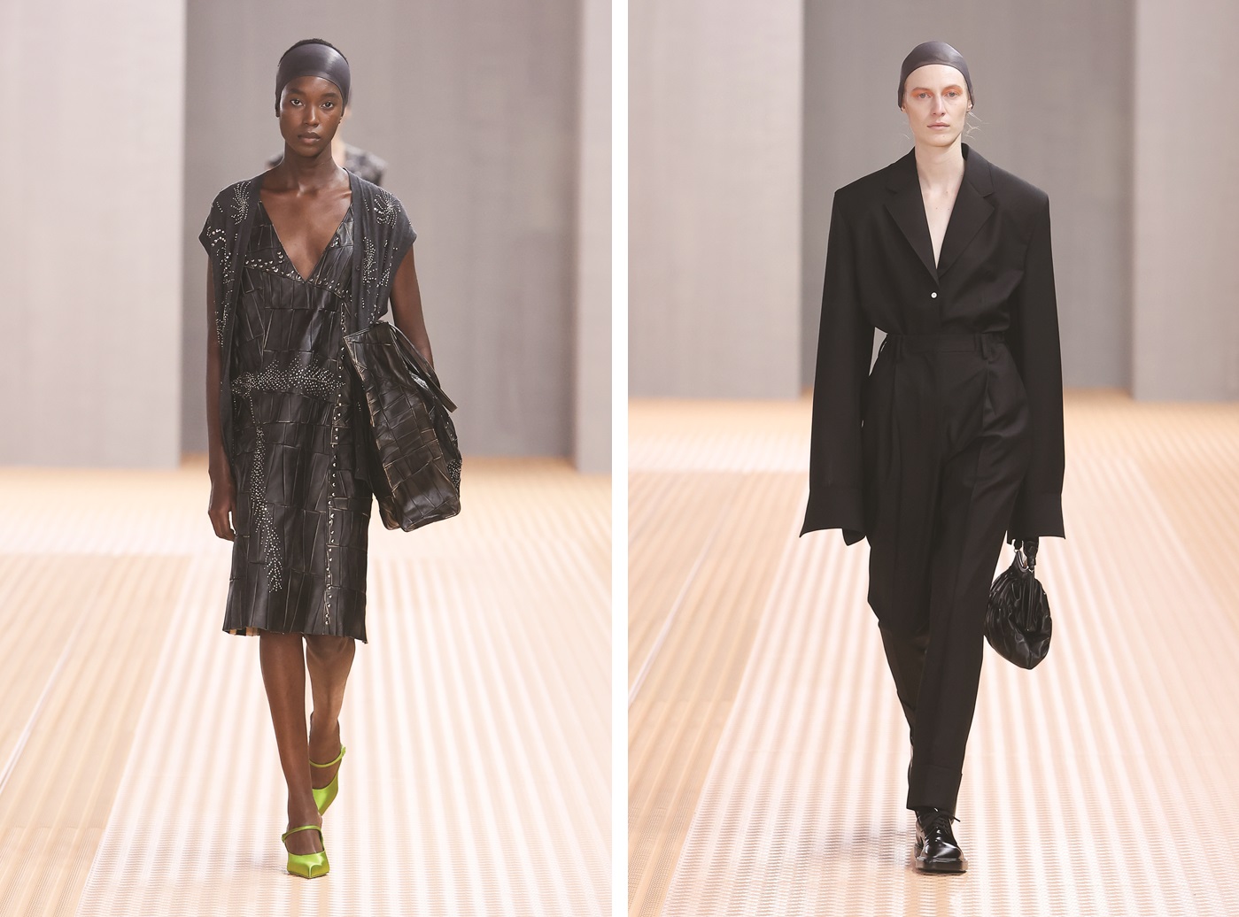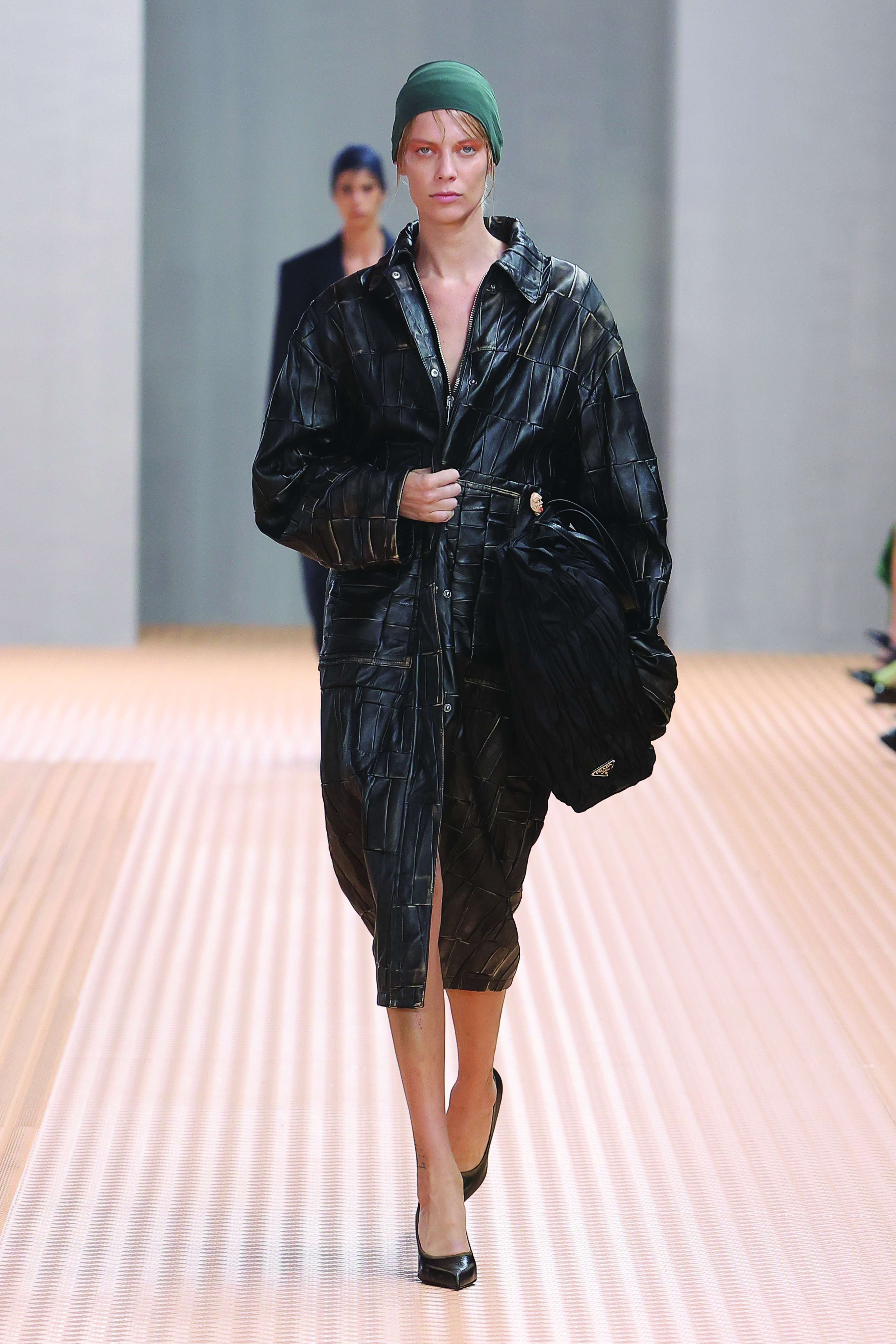 Originally proposed in silk moiré, the style is recreated in nappa leather and re-nylon. Alongside, a sequence of bags draw inspiration from the style, utilising its distinct clasp detail on oversized tote styles in leather or re-nylon. Both reflect directly Prada’s exceptional 110-year history, hallmark savoir-faire and continual curiosity.