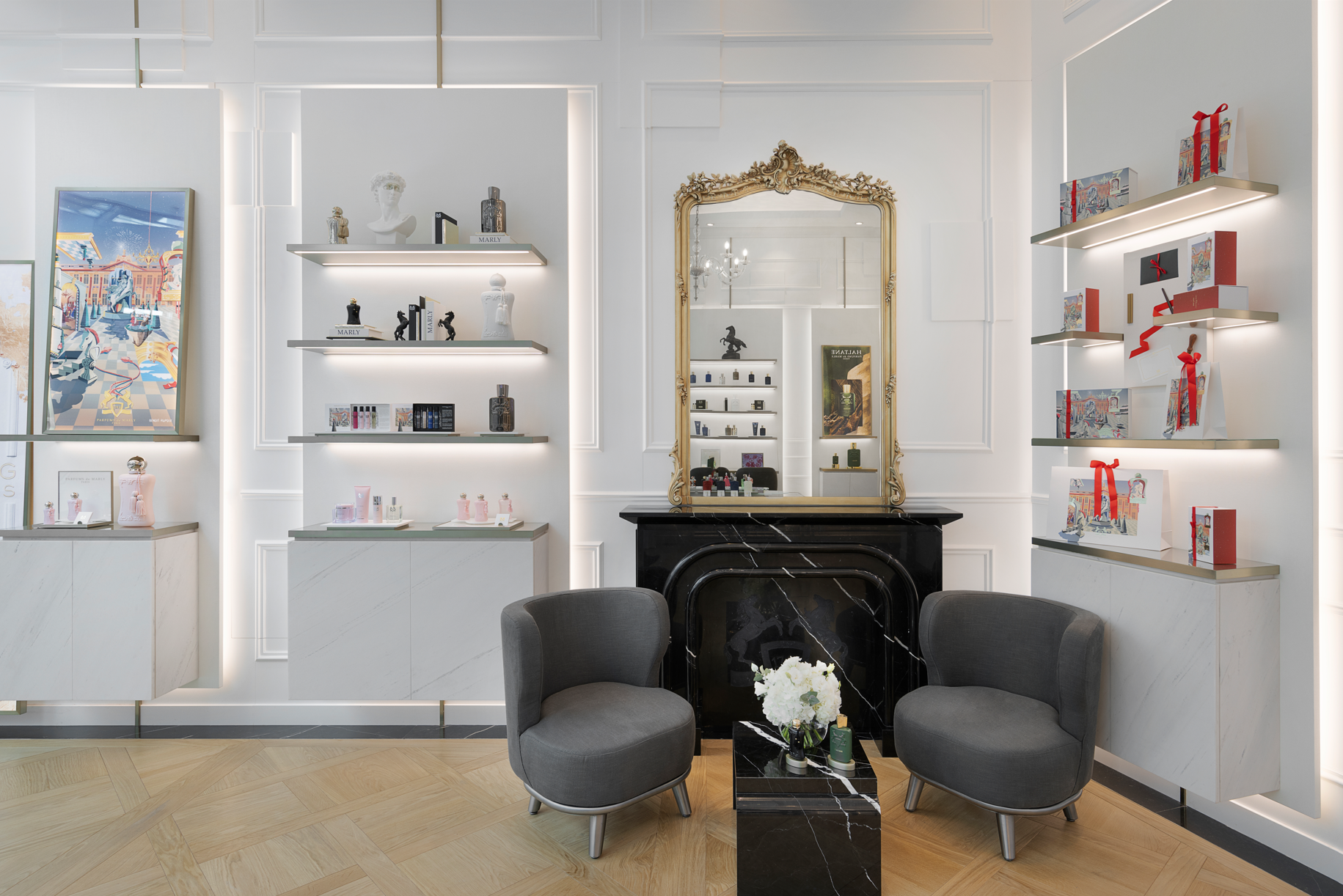 Step into a world of splendour, savoir-faire and boldness, brought to life through the vision of Parfums de Marly’s Founder and Artistic Director, Julien Sprecher. Translating the house’s duality, French architect Hubert de Malherbe designed a unique concept fusing heritage and modernity, channelling the spirit of an 18th-century French château with the atmosphere of a contemporary Parisian apartment. Deconstructed mouldings and Versailles parquet reinterpreted in oak and gold metal marquetry, an interactive olfactorium, and a digitised Château de Marly come together in the luminous space finished in marble. Echoes of the 18th century are featured through the hearth with curved lines reminiscent of Louis XV’s style, finished in black marble and a large antique mirror with gilded wooden frames.