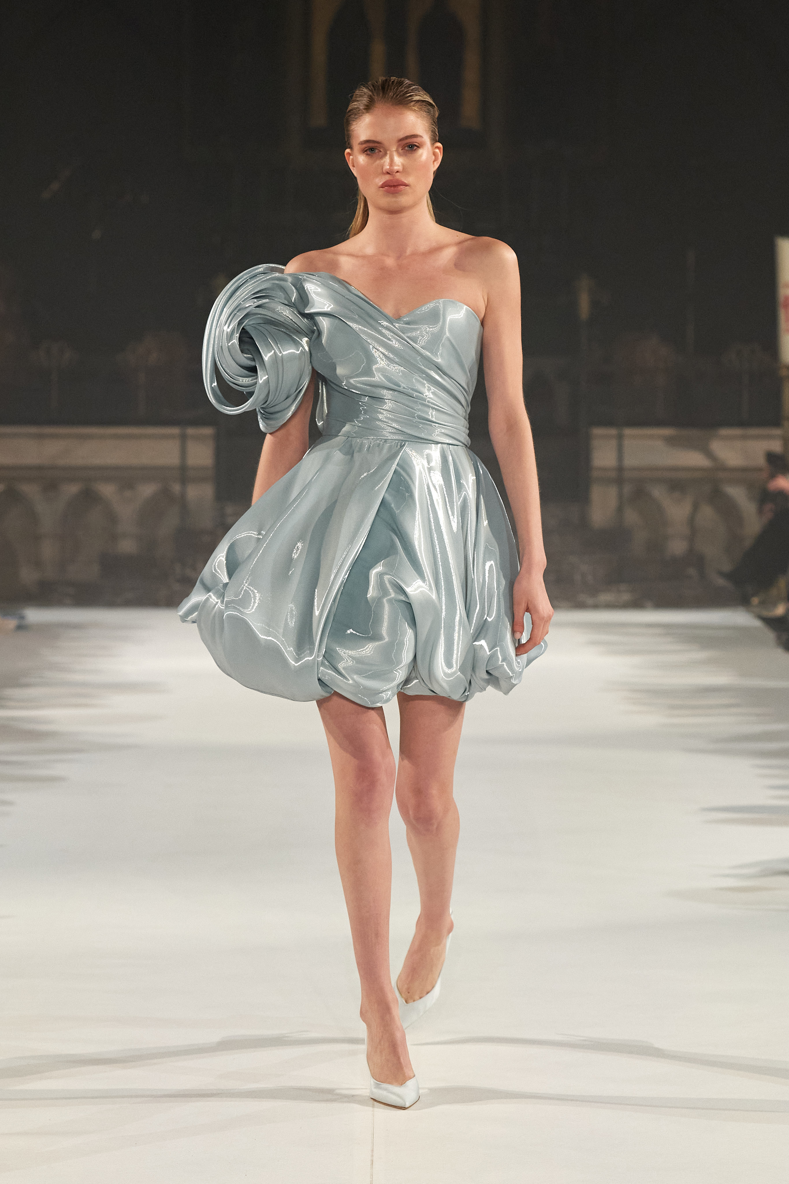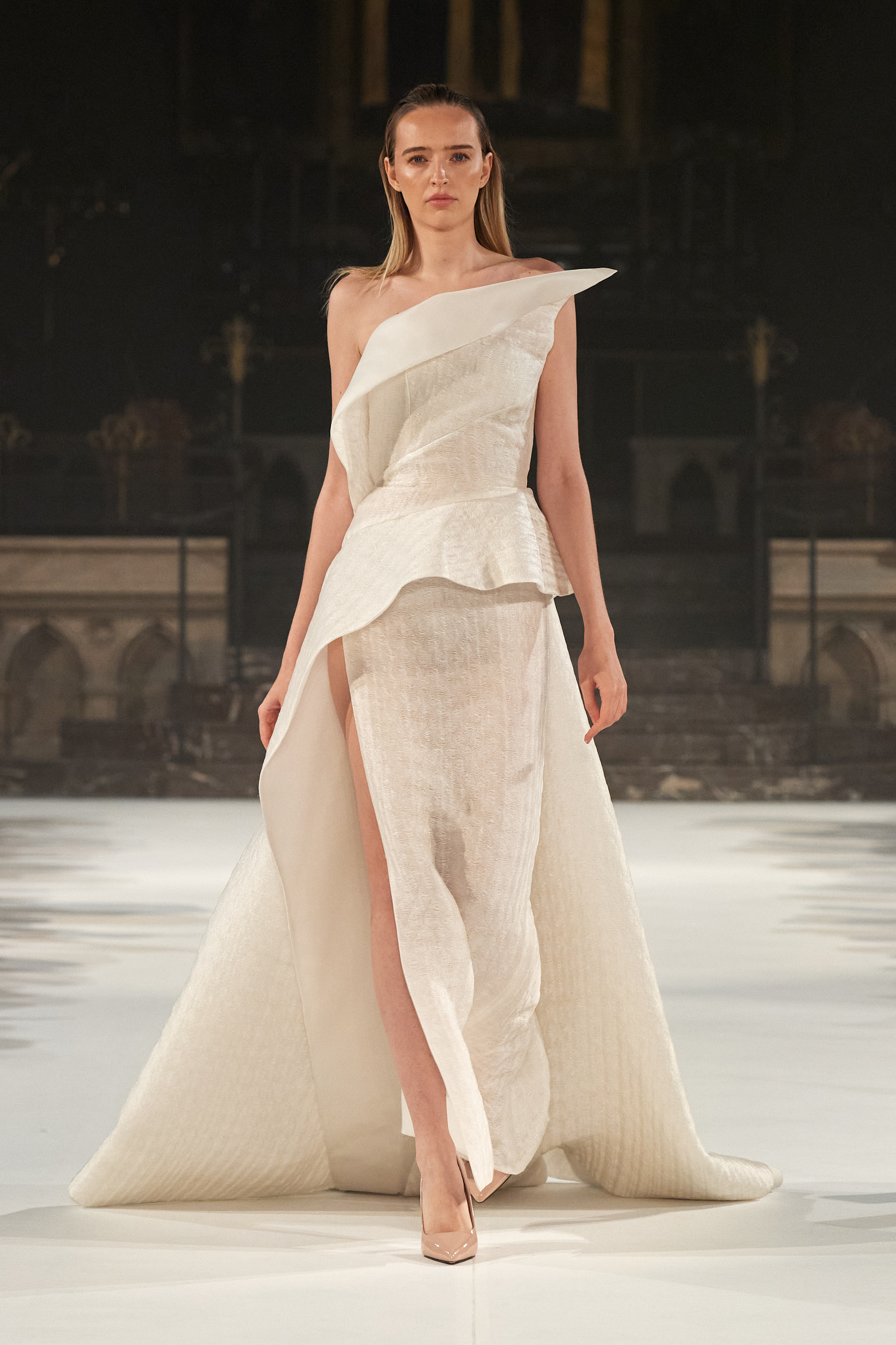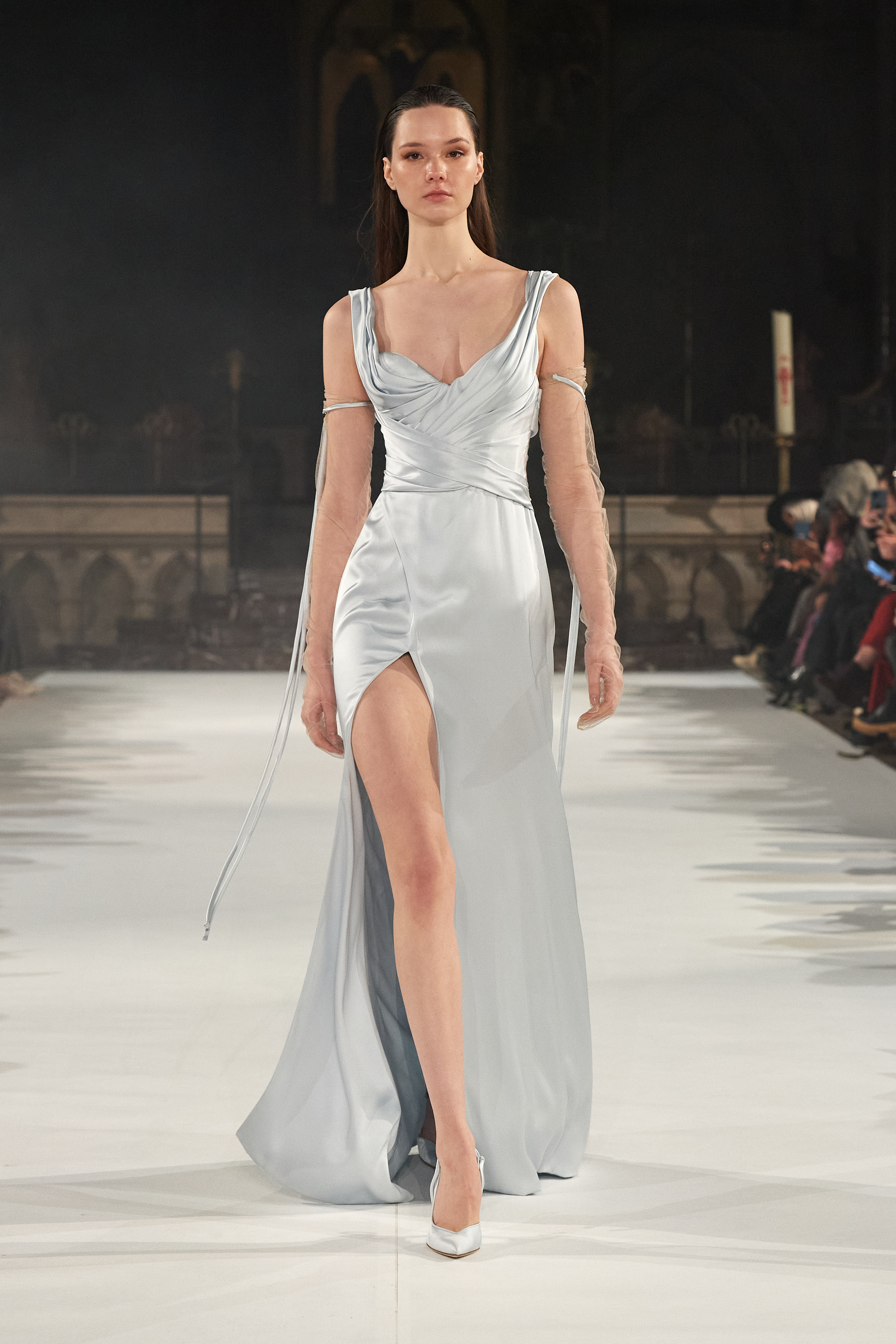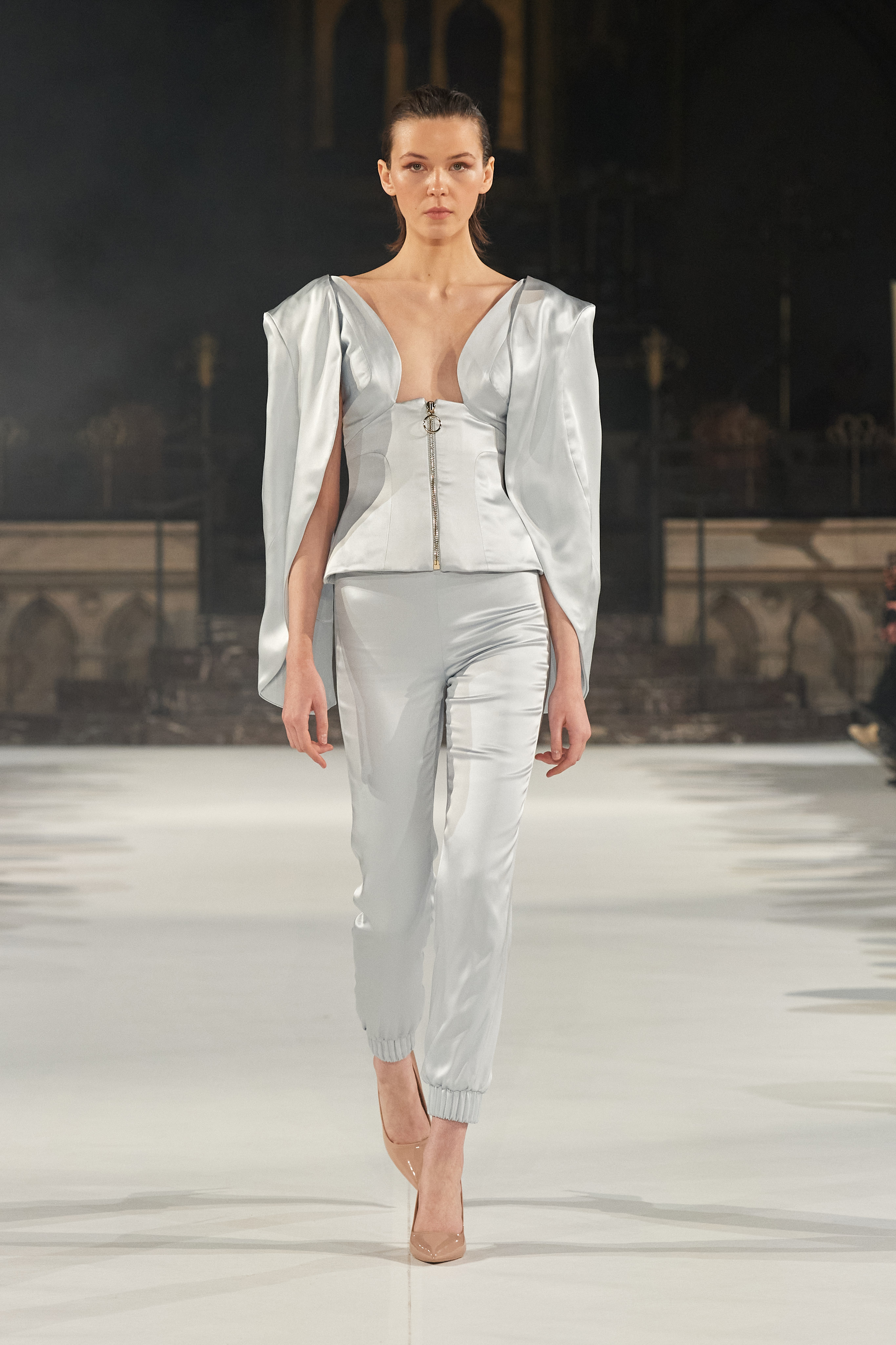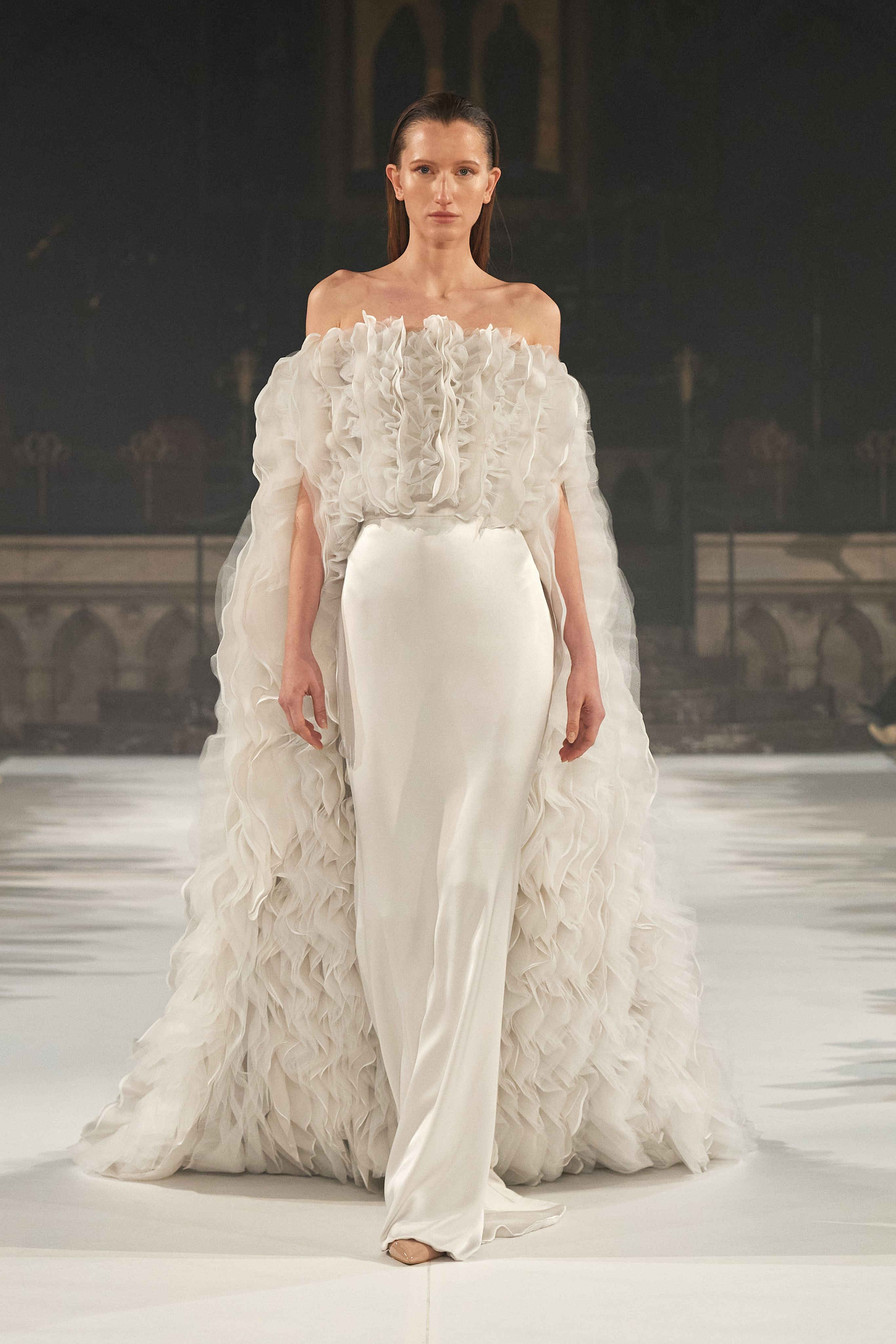 Masterful draping mimics the rolling slopes of mountaintops. Custom made zippers and artful ropes take their inspiration from trekking equipment. And duchess satin in snow white, sky blue, and dark noir bring the serene colors of Mount Everest to the Parisian runway.