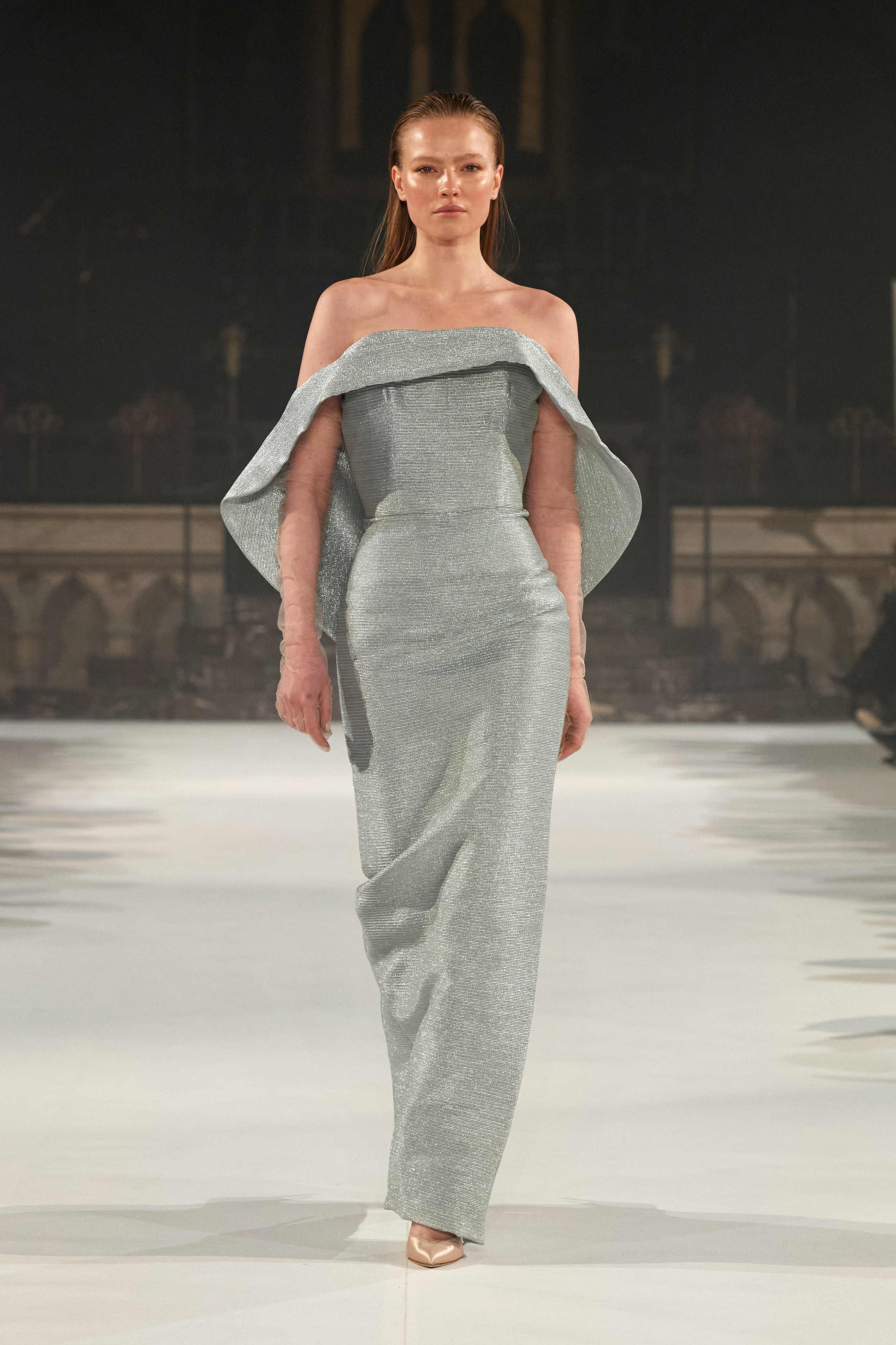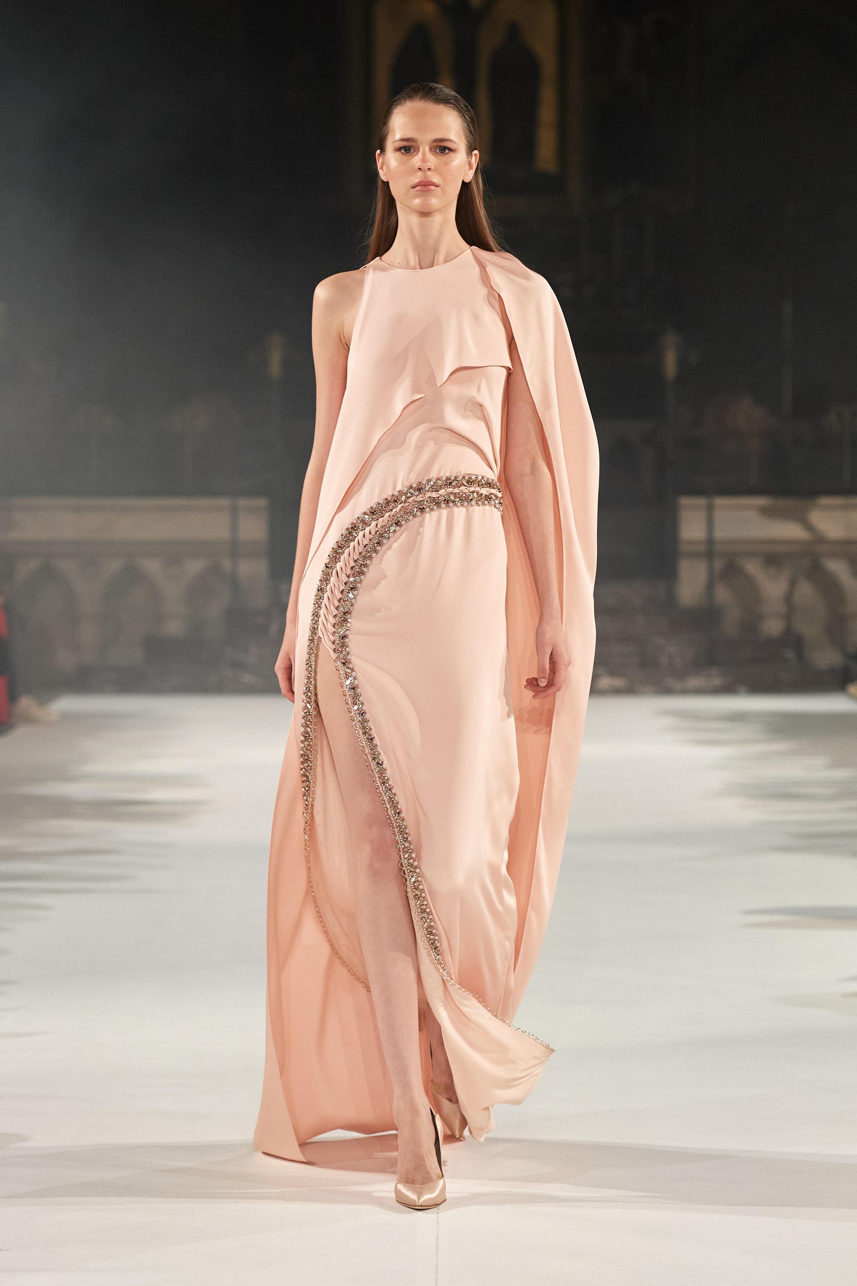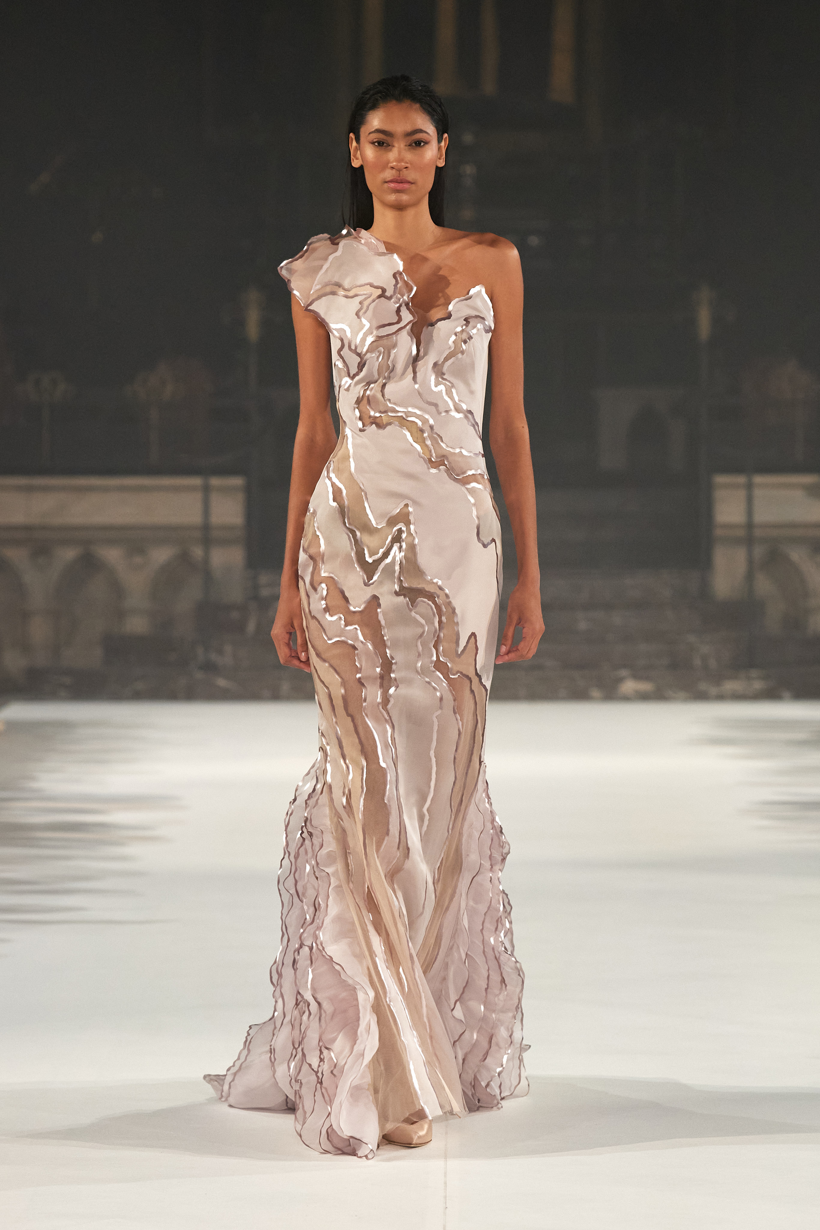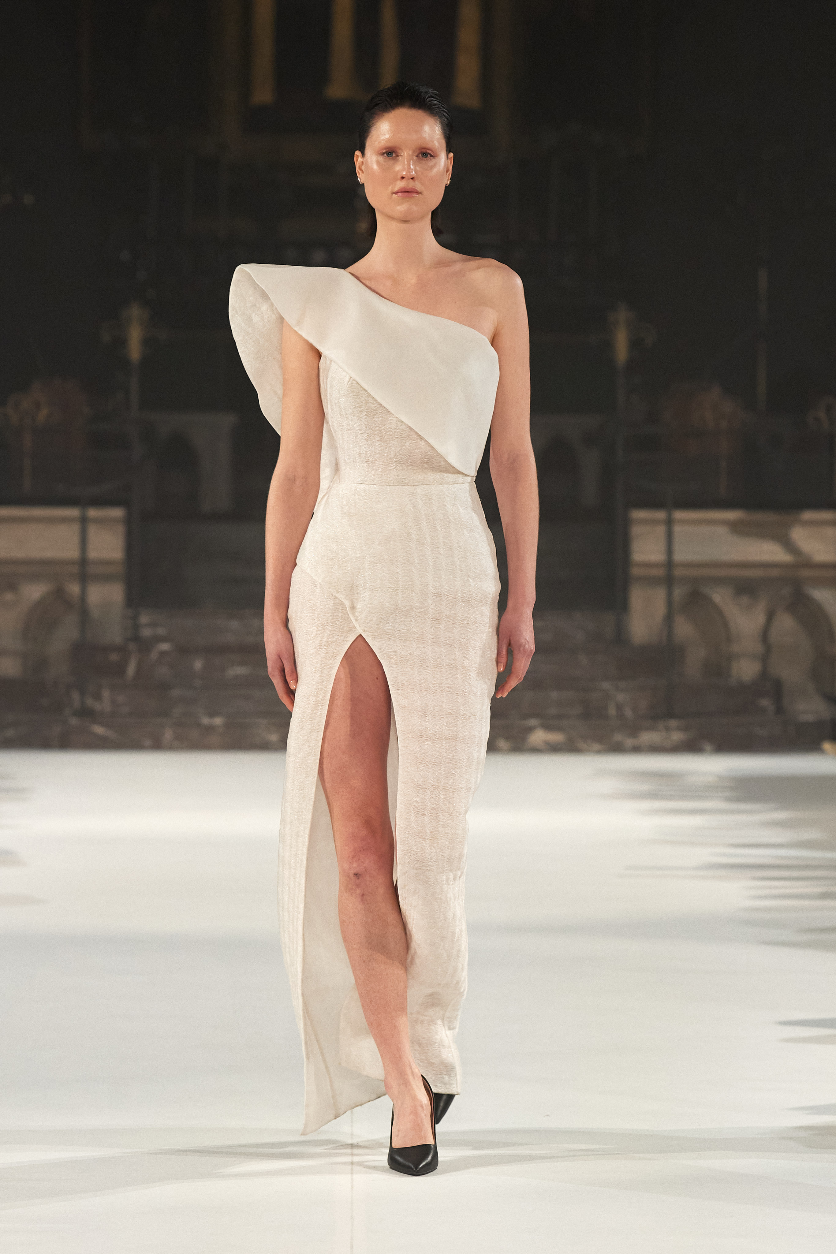 Masterful draping mimics the rolling slopes of mountaintops. Custom made zippers and artful ropes take their inspiration from trekking equipment. And duchess satin in snow white, sky blue, and dark noir bring the serene colors of Mount Everest to the Parisian runway.
