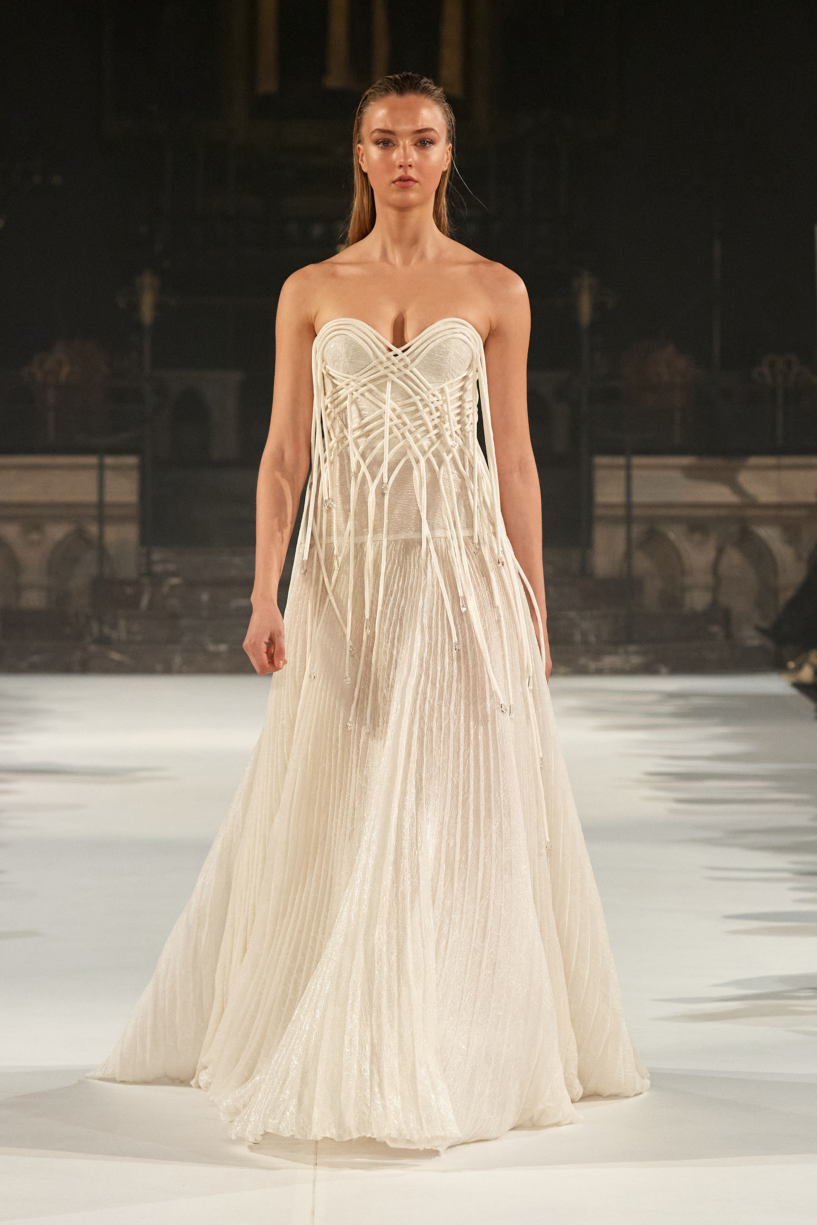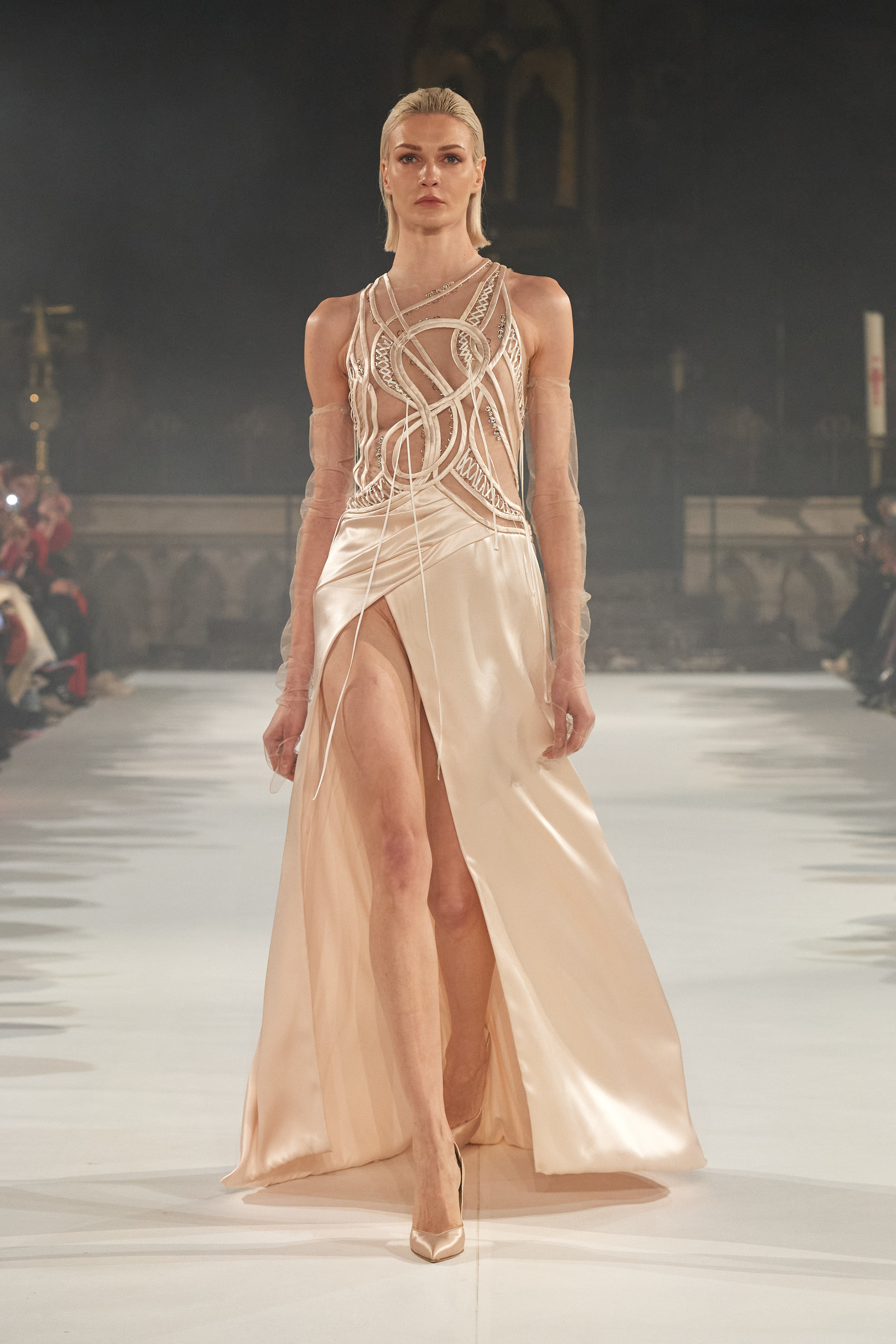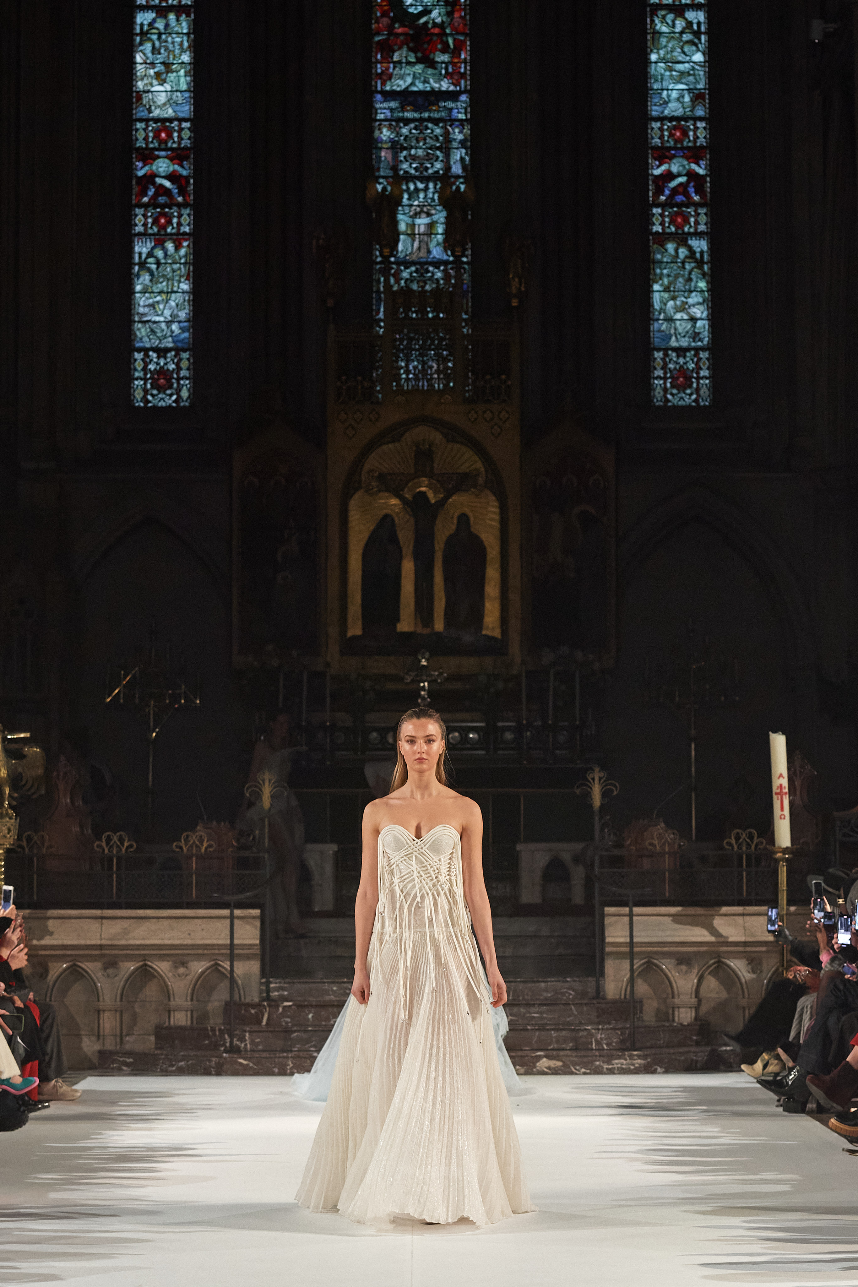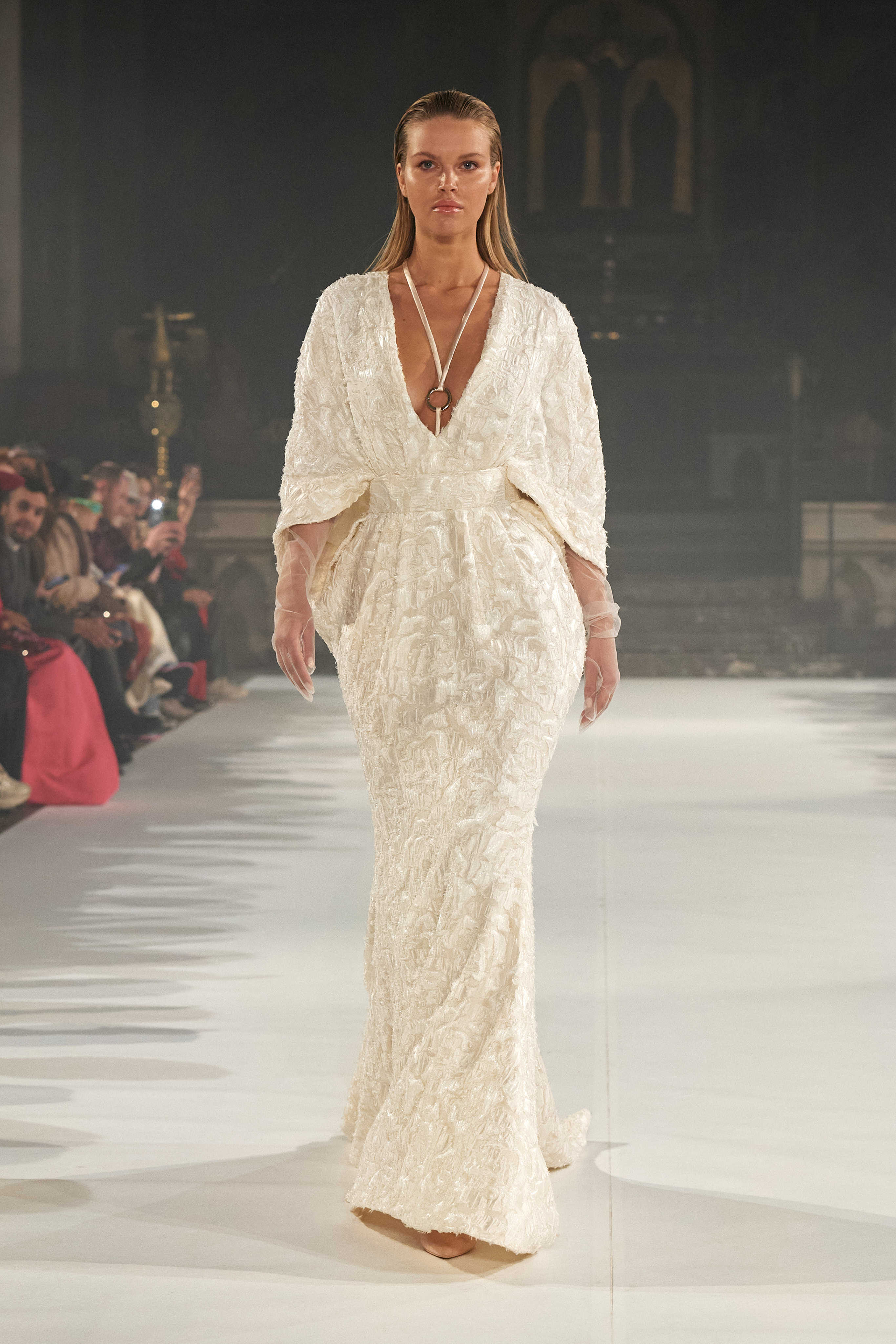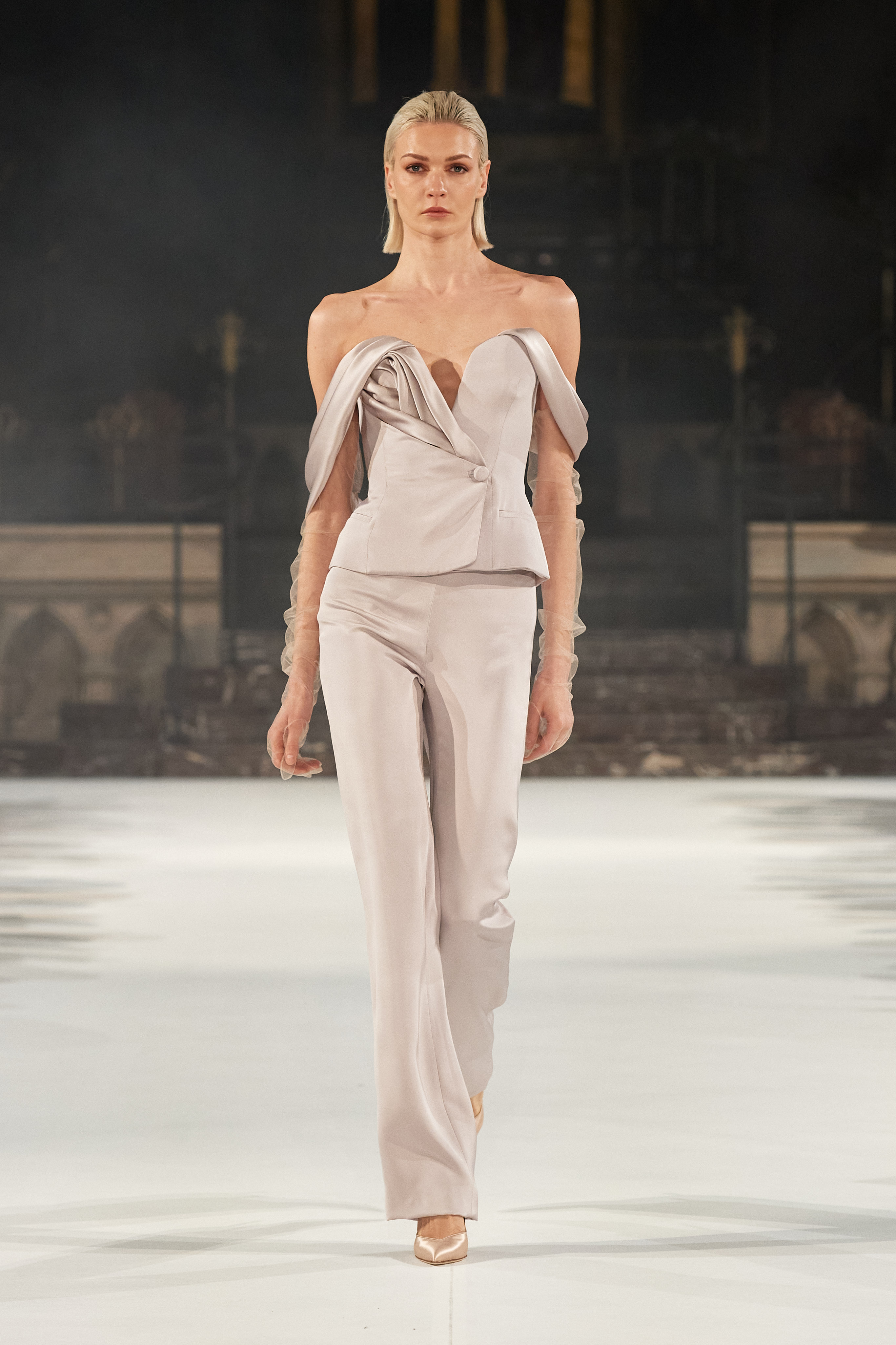 Masterful draping mimics the rolling slopes of mountaintops. Custom made zippers and artful ropes take their inspiration from trekking equipment. And duchess satin in snow white, sky blue, and dark noir bring the serene colors of Mount Everest to the Parisian runway.