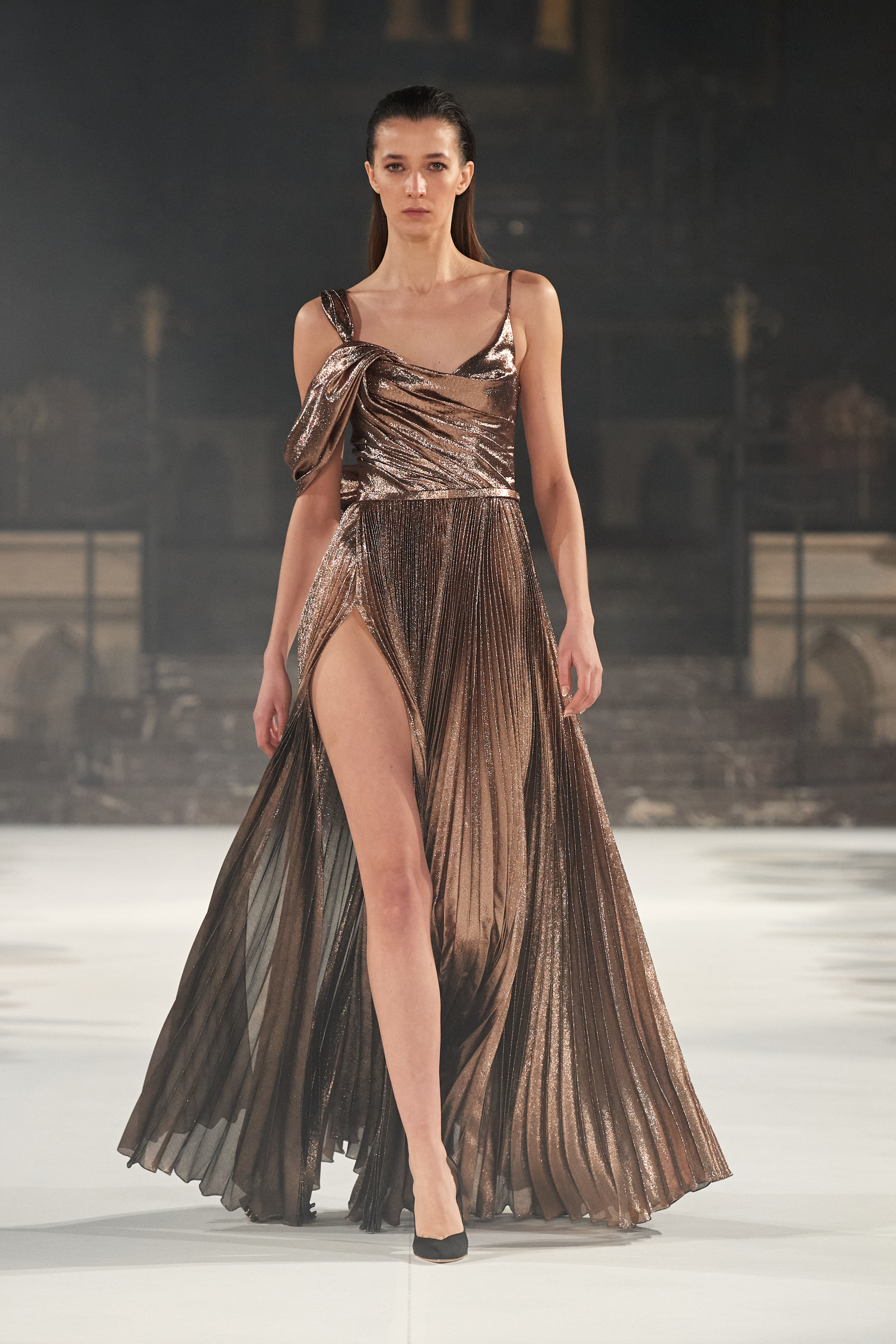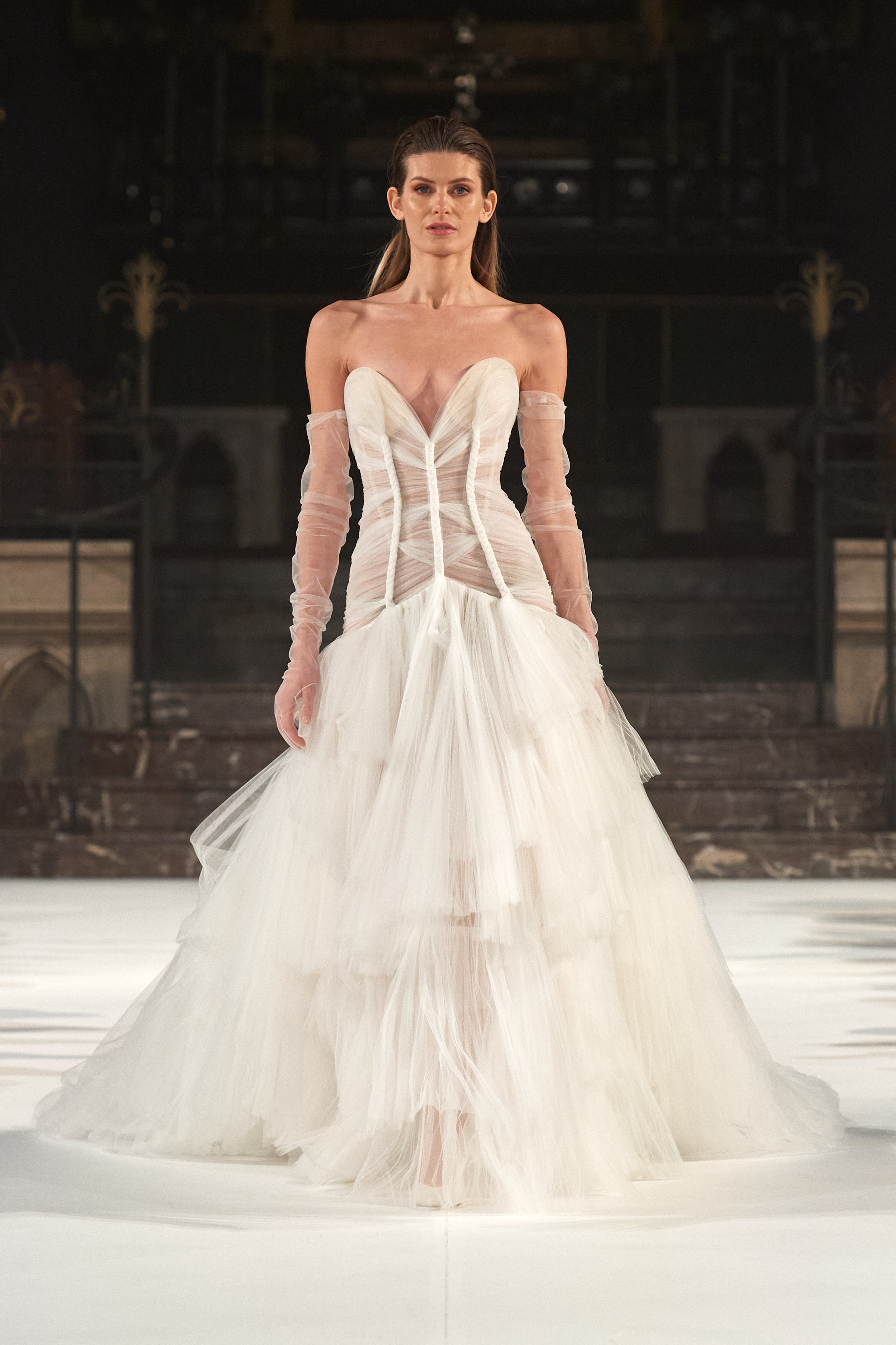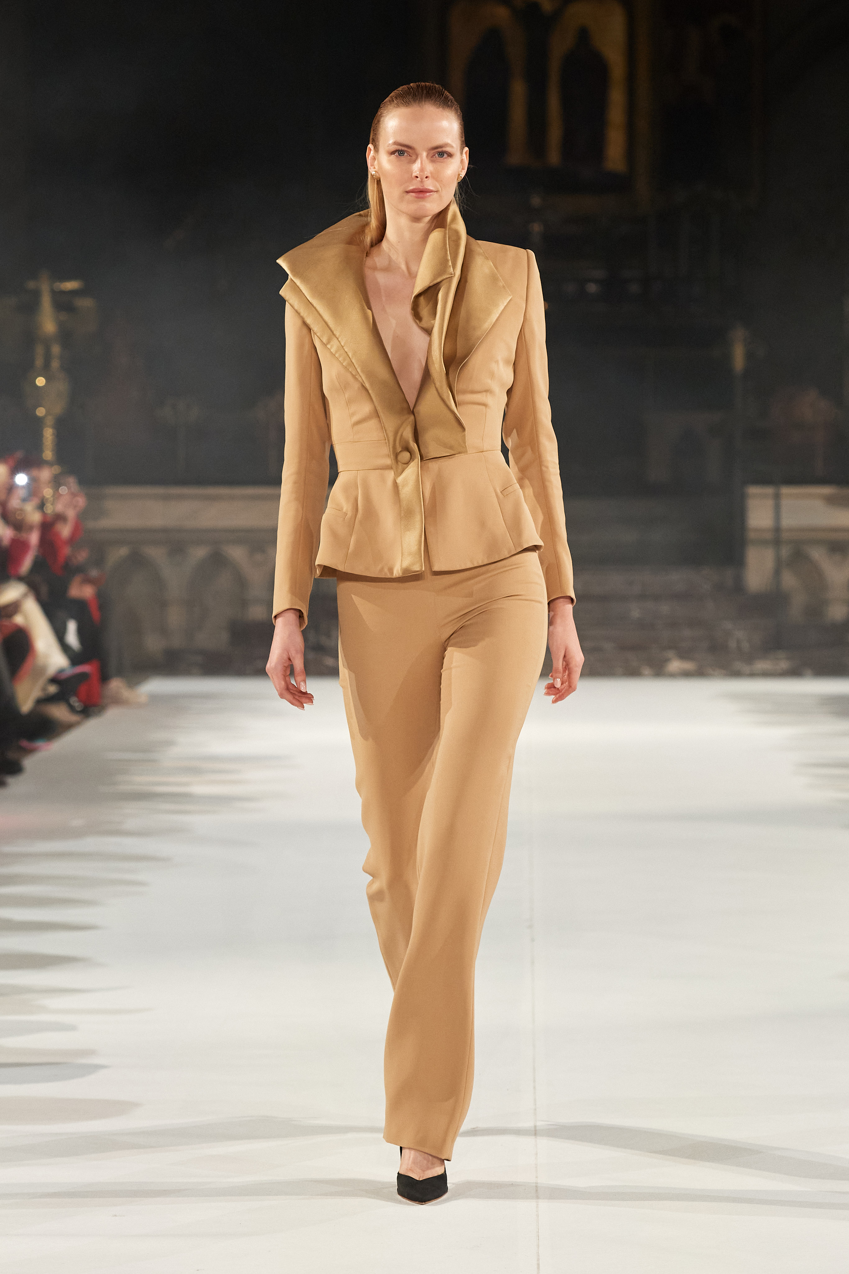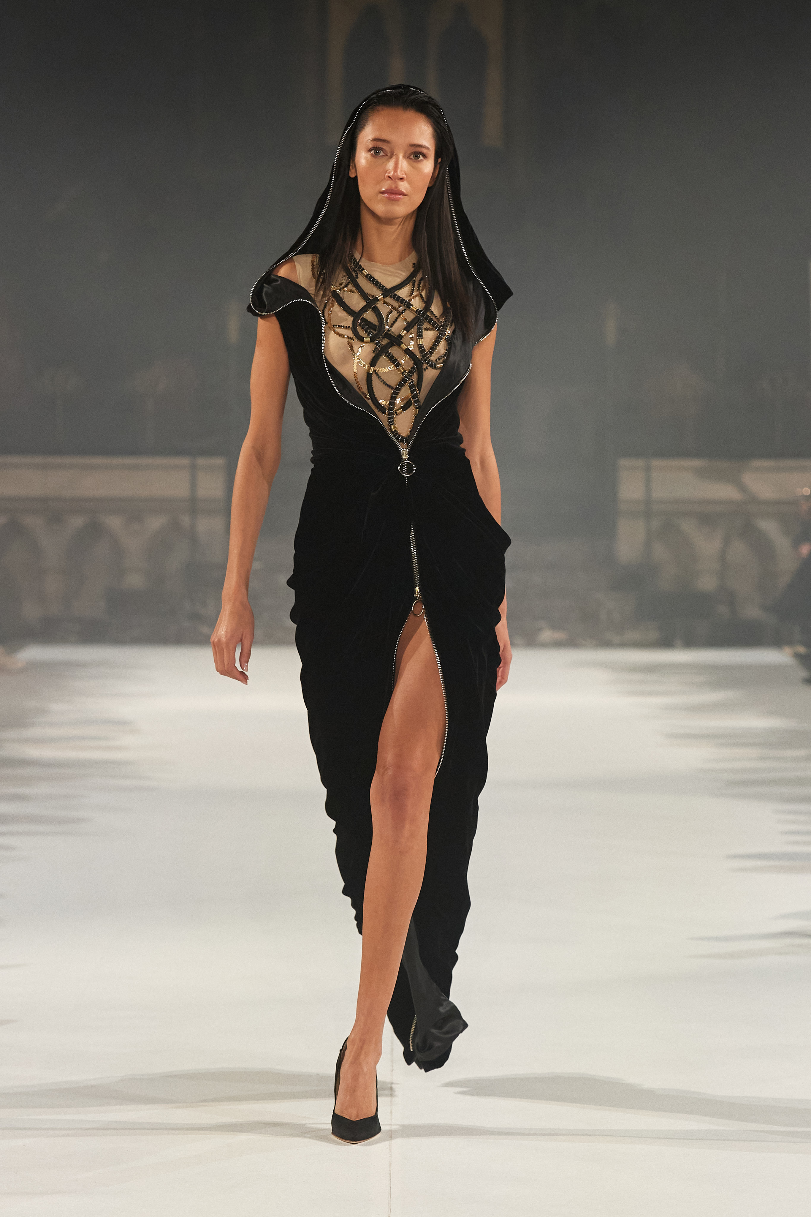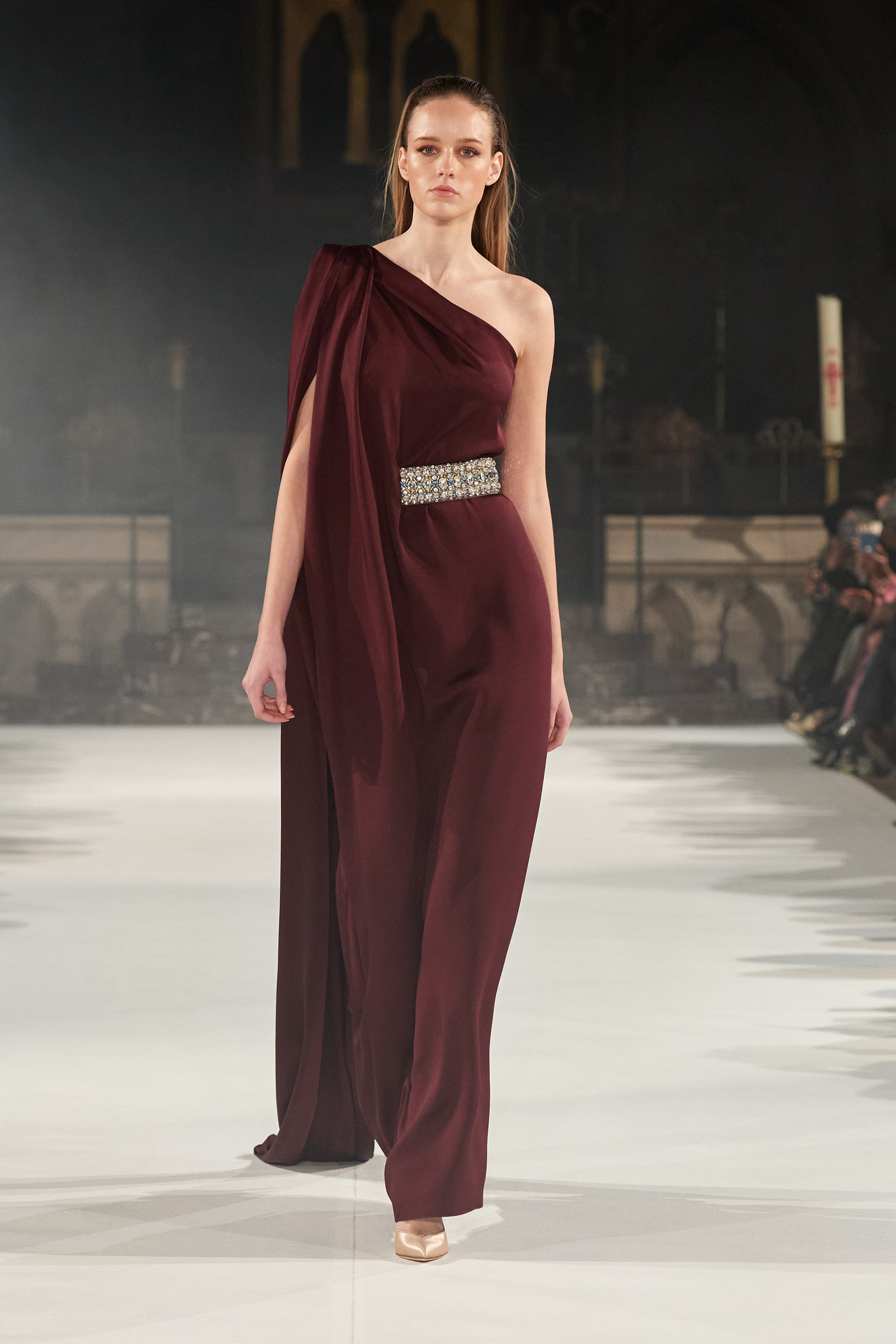 Masterful draping mimics the rolling slopes of mountaintops. Custom made zippers and artful ropes take their inspiration from trekking equipment. And duchess satin in snow white, sky blue, and dark noir bring the serene colors of Mount Everest to the Parisian runway.