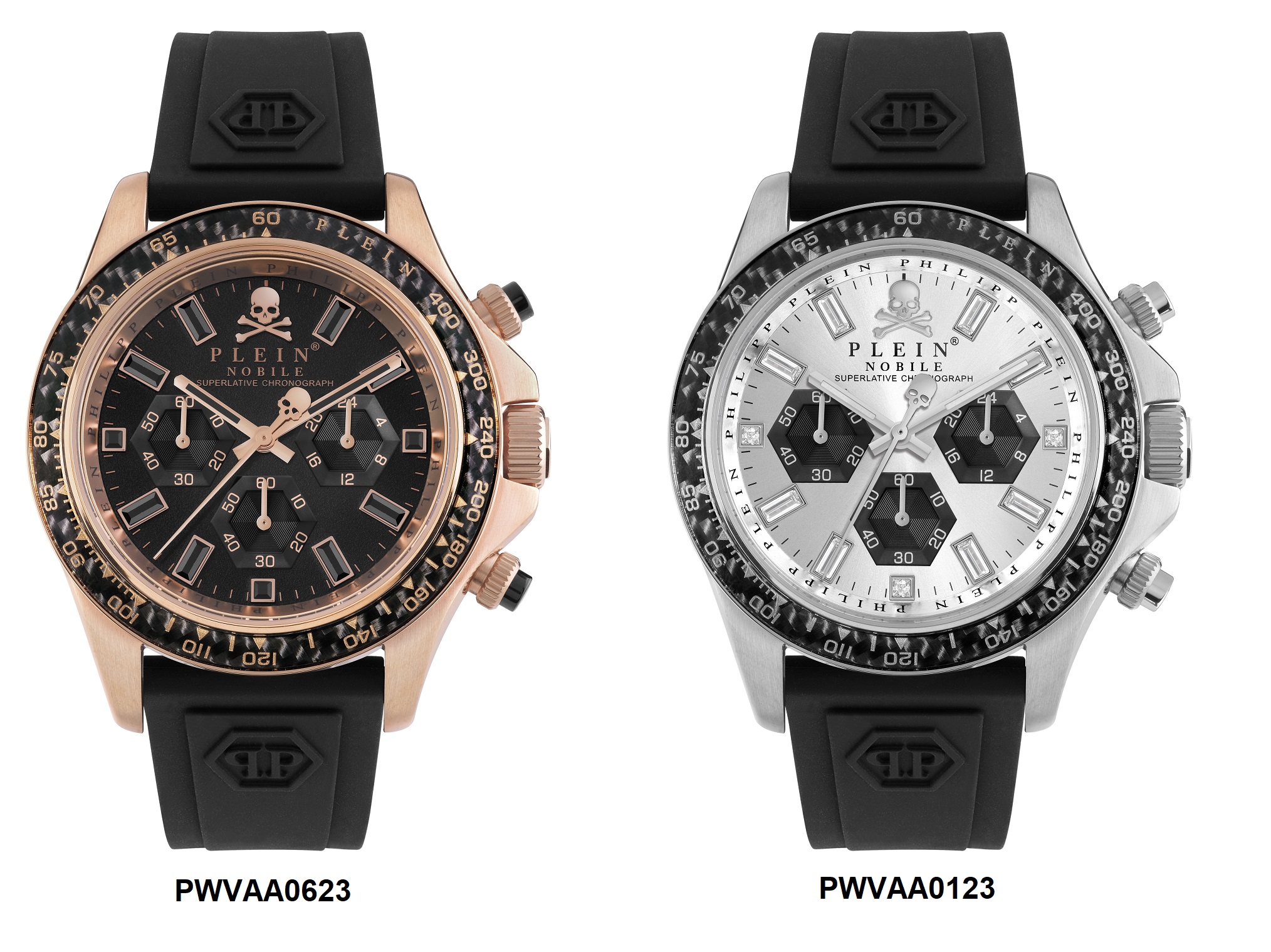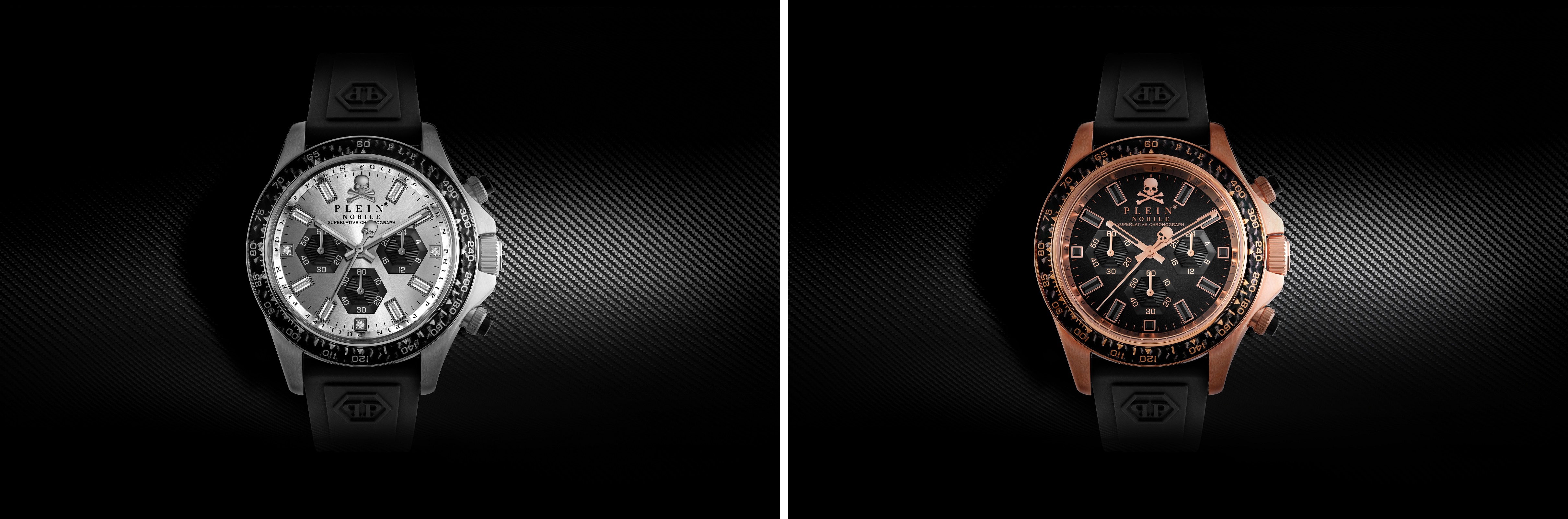 PHILIPP PLEIN knows how to keep track of speed both on and off the track. With its emblematic counters and pushers, the Nobile Racing Superlative Chronograph is designed for those who keep pushing the limits. Coming with a tachymeter bezel or a baguette setting on the top ring, the 44 mm case exudes confidence while the colour combinations make it more sophisticated than ever. Available either in stainless steel or IP rose gold with black carbon fibre tachymeter.
