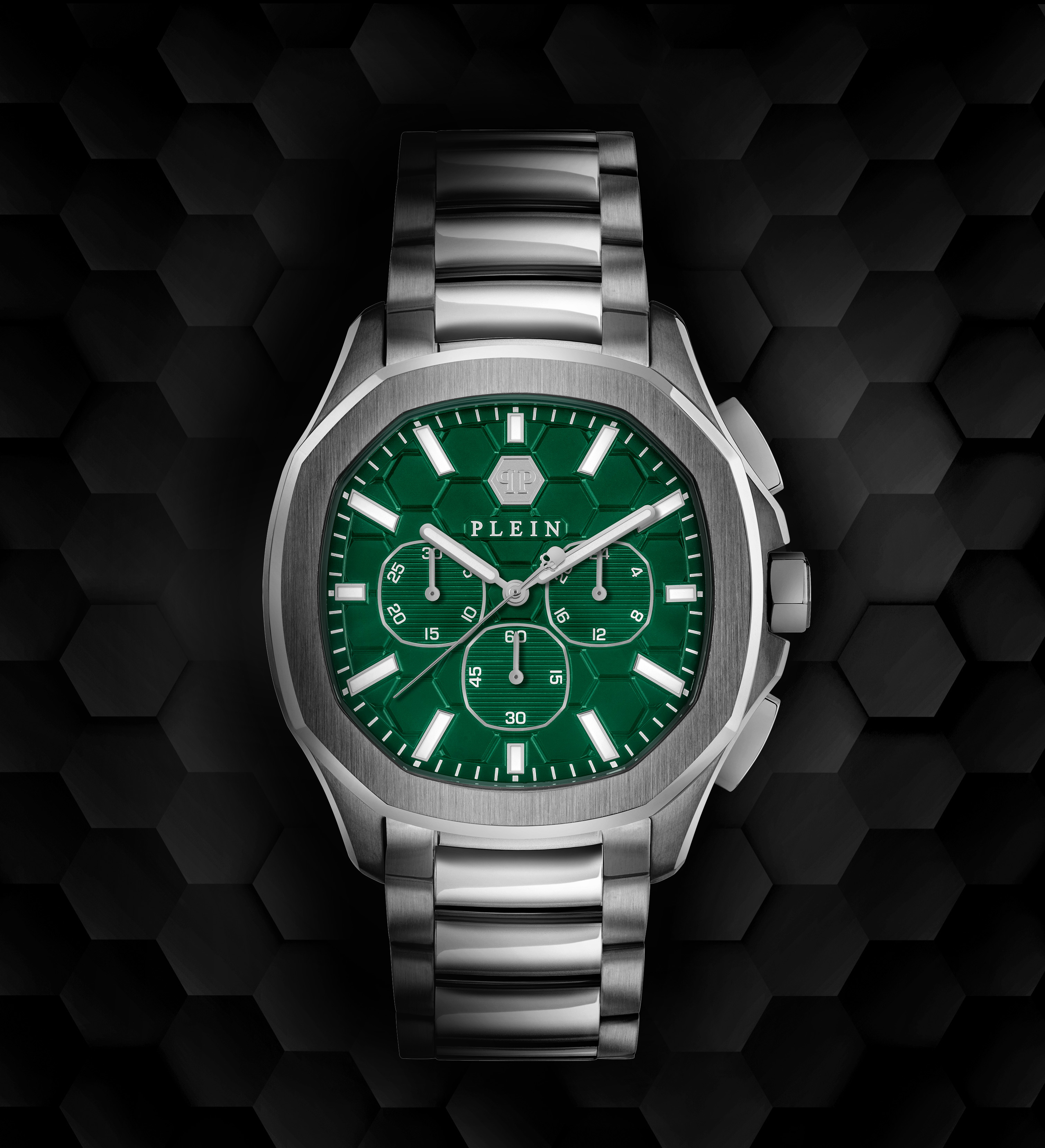 A never- before-seen aesthetic with combined sport performance give the model uniqueness and power. With its 44 mm case, the $pectre Chrono conveys precision, excellence, and cutting-edge technology. The stainless-steel version graces the wrists of those who aim at accomplishing greatness. The Philipp Plein brand DNA is expressed by the logo at 12 o’clock and hexagon pattern on dial.