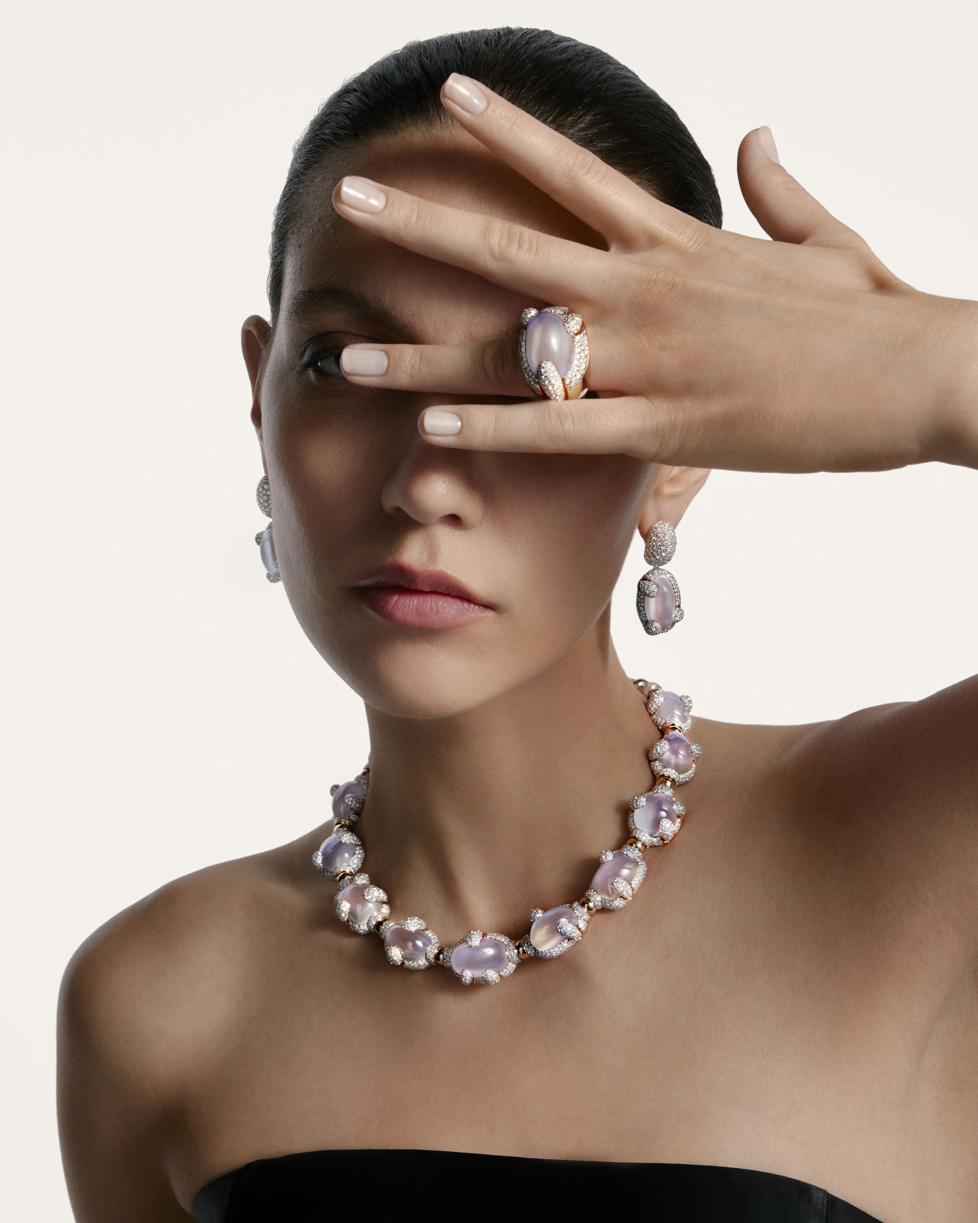 PINK RUBELLITES – Pomellato’s iconic Princess necklace, a true cult favorite among the Maison’s high jewelry collections, takes center stage with a purple-red rubellite. Renowned for its mastery of chain-making, Pomellato showcases its expertise by intertwining different chain styles. A 17.07 carat rubellite, encircled by a pavé of 484 red spinels, which is connected to the rose gold necklace by two diamond-pavé links. Complementing this piece is a rose-gold ring featuring a 32.36 carat pyrope-spessartine garnet embraced by a pavé of blue and violet sapphires. Rounding out the set, rose gold chain-link earrings adorned with a diamond pavé and two rubellites.