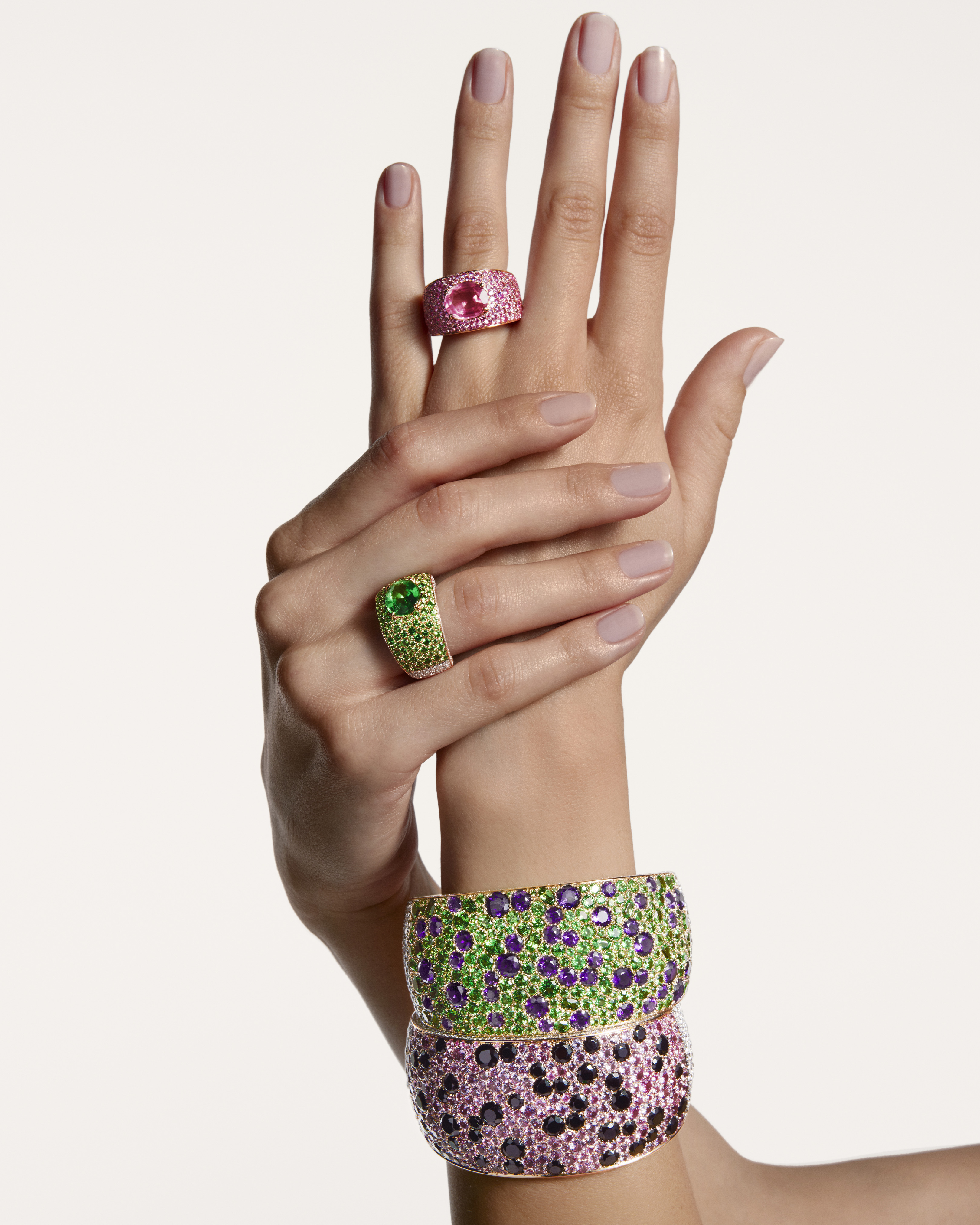 PRECIOUS PAVÉ - Pomellato's pavé technique is showcased in this collection of cuffs, rings, and earrings, where each stone is set with precision and an unparalleled sense of softness. A rose gold bracelet dazzles with the brilliance of 1,145 white diamonds, enhanced by an additional 460 brown diamonds. Complementing this piece are a band of white and brown diamonds and a pair of hoop earrings. For a burst of color, Pomellato presents a set of cuffs with a leopard print effect adorned with 247 pink sapphires and 44 black tourmalines, framed by white diamond edges. A matching ring, featuring a 4.89 carat pink spinel. The green bracelet is resplendent with 165 tsavorites and 44 amethysts that give way to a white diamond pavé. Accompanying this piece is a ring showcasing a 3.45-carat tsavorite.