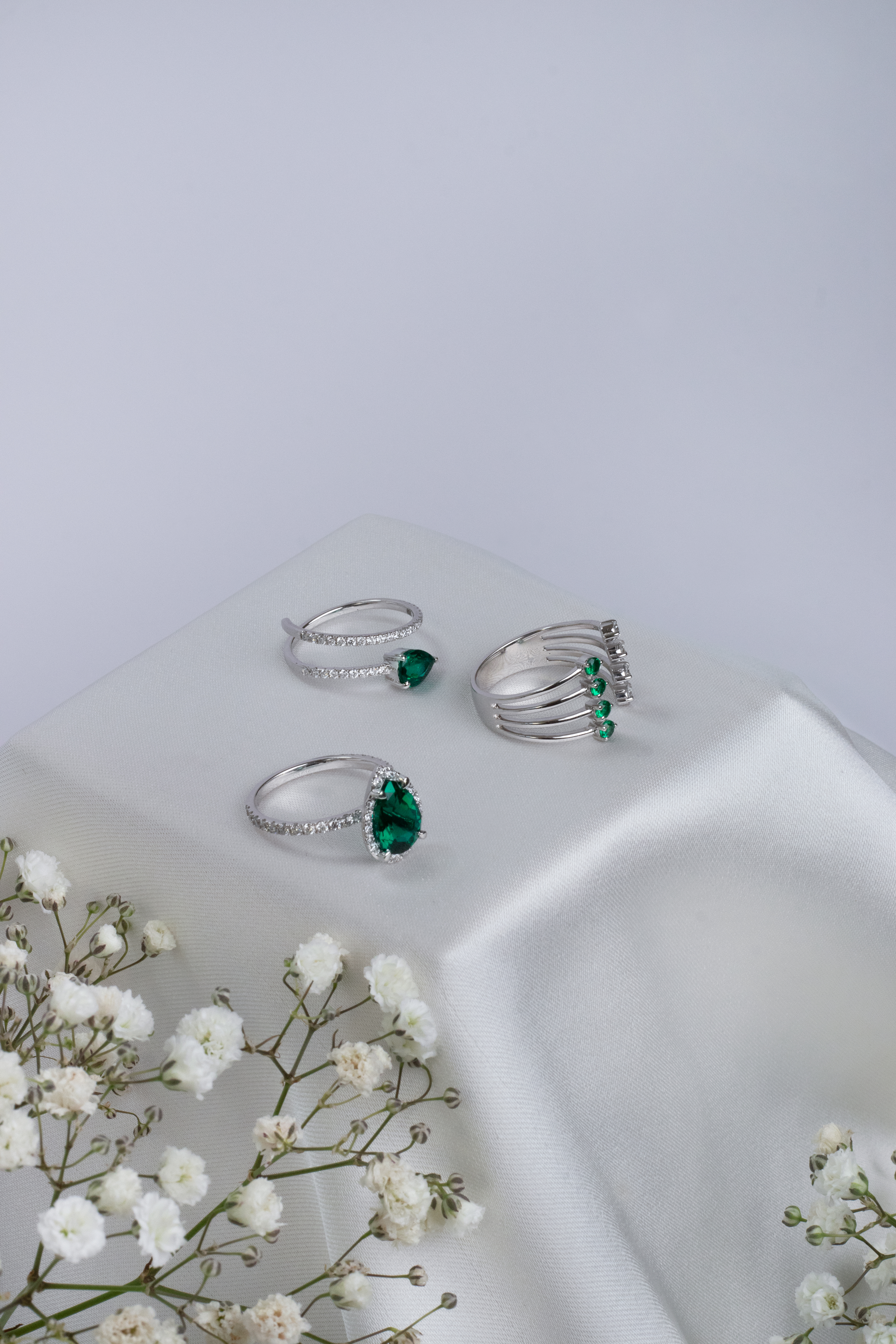 Floating settings, asymmetries, and deliberate contrasts liberate the stones, giving them an ethereal weightlessness.