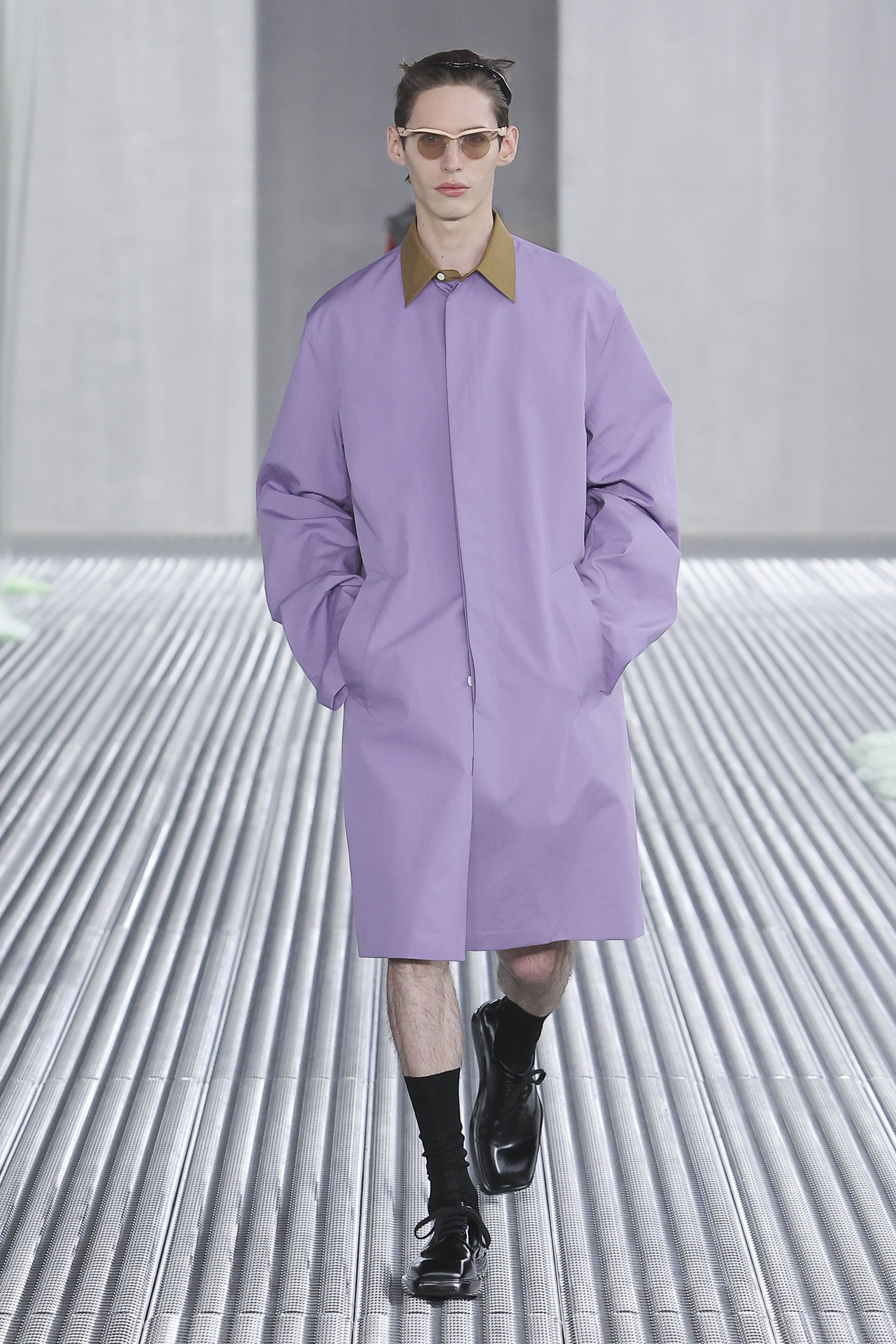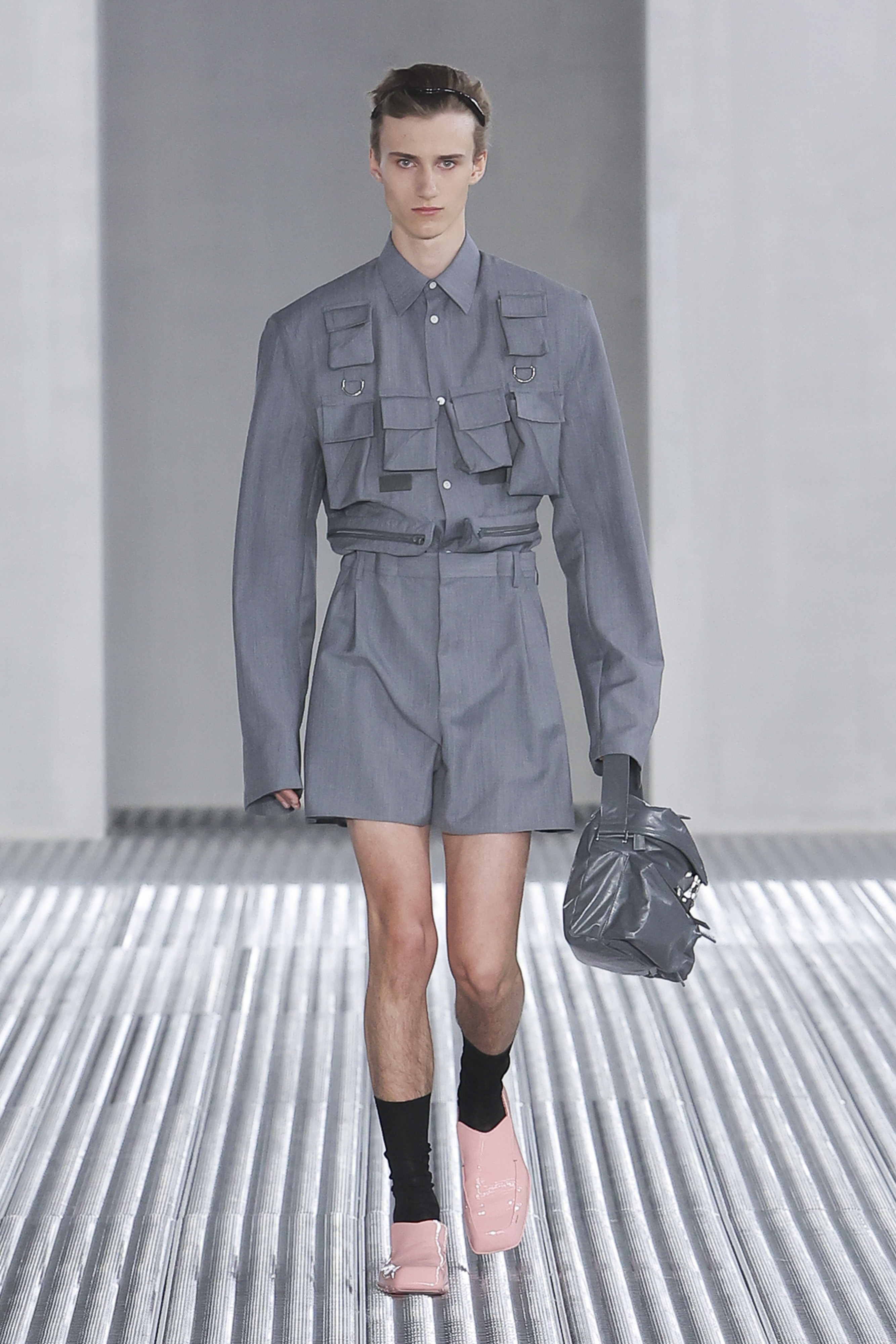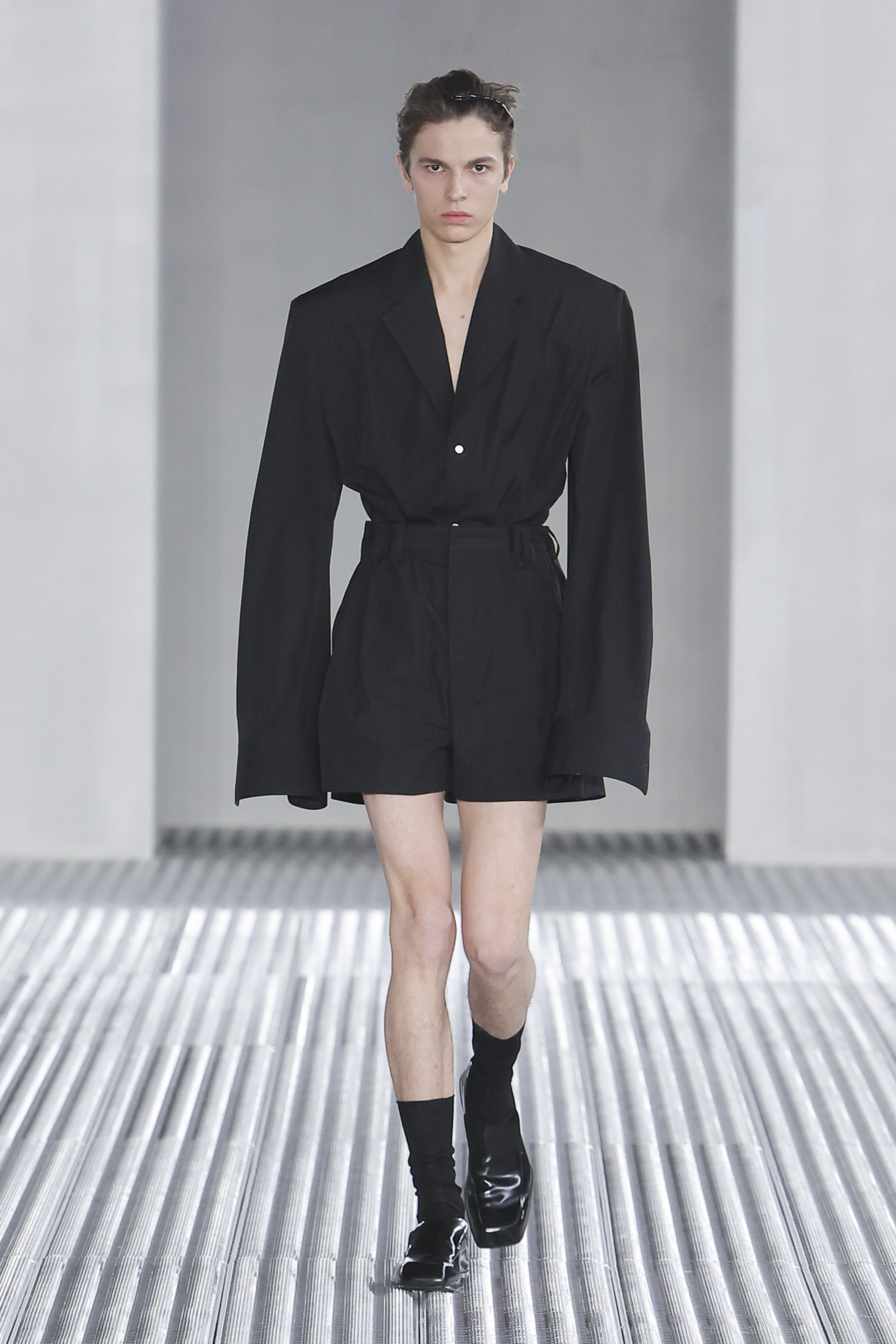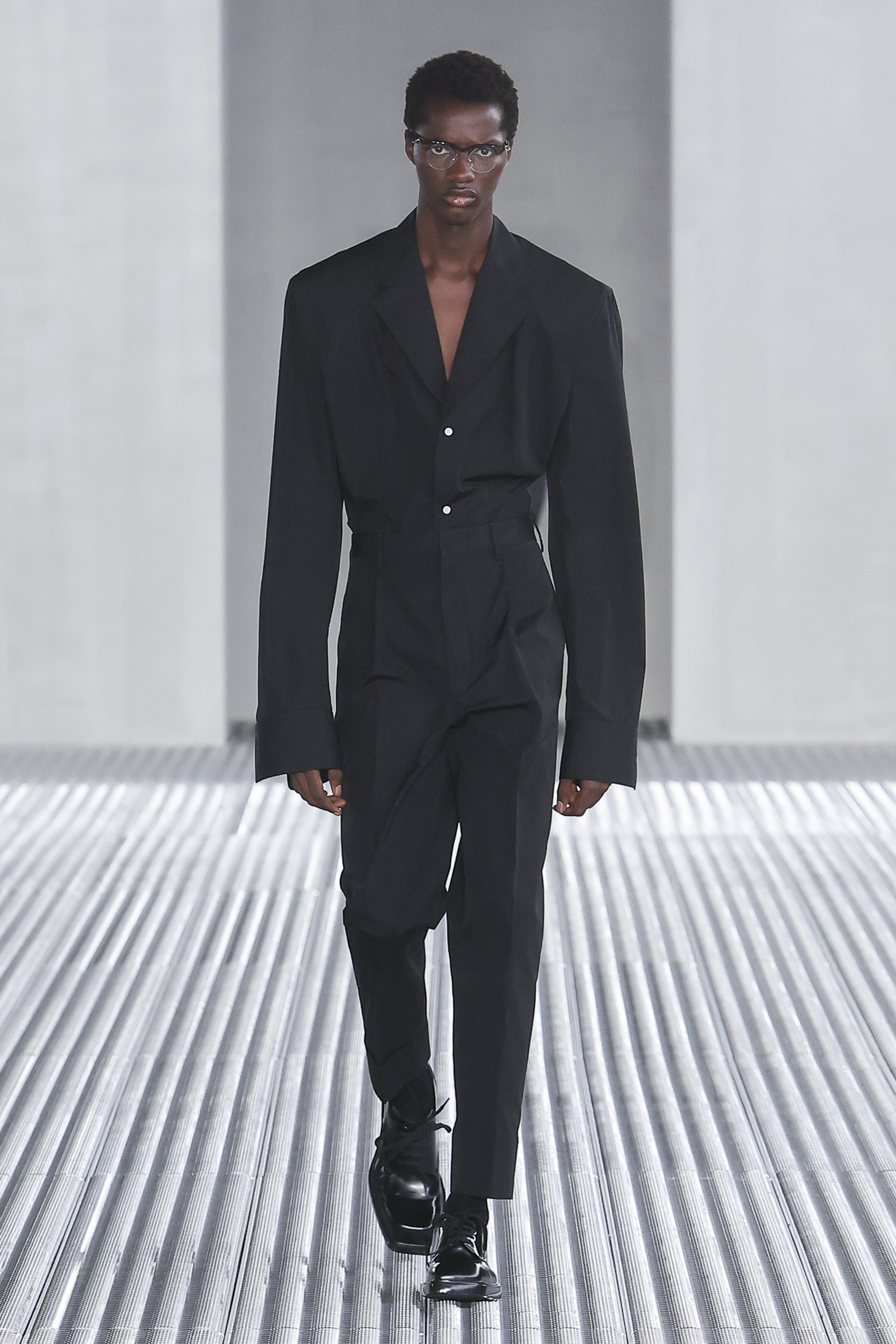 The shirt is a point of departure, its structure and details borrowed as a base to transform an entire stable of menswear - suits, raincoats, active sportswear, reporter jackets. Reconsidered construction, re-constructed. Beginning with simplicity, the collection proposes a notion of expansion, amplification of an idea - a paradox between silhouette and materiality. The ultimate aim is a constant awareness of the body within, and its liberation.