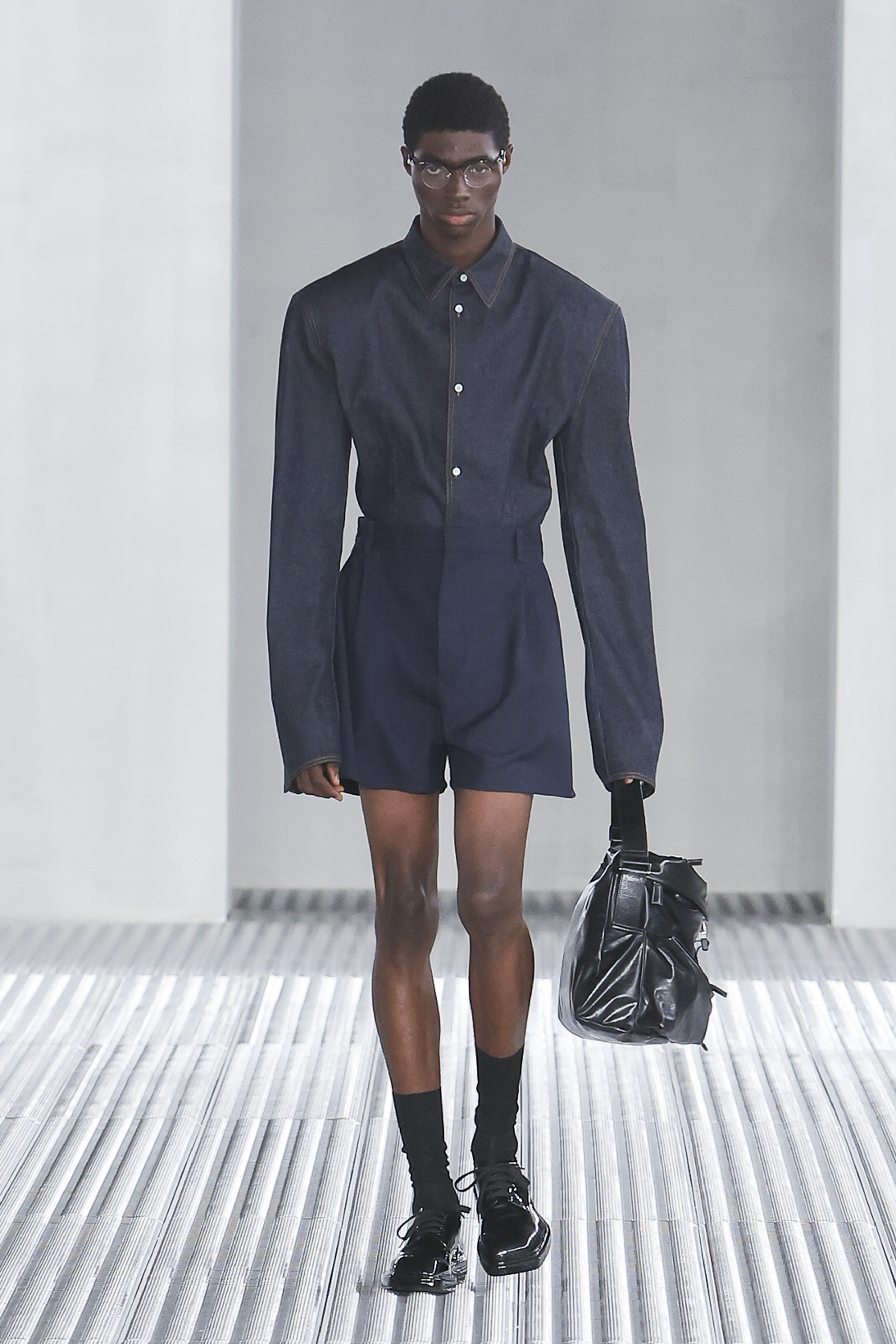 A fluidity questions the conventional language of rigid tailoring. Centrally, qualities of lightness and softness are brought to garments throughout, creating a fluctuating rapport between the body and its clothes. These ideas infiltrate every aspect of dress: headbands and eyewear, molded of singular pieces, appear like captured fragments of motion; leather bags are unexpectedly softened to the touch.