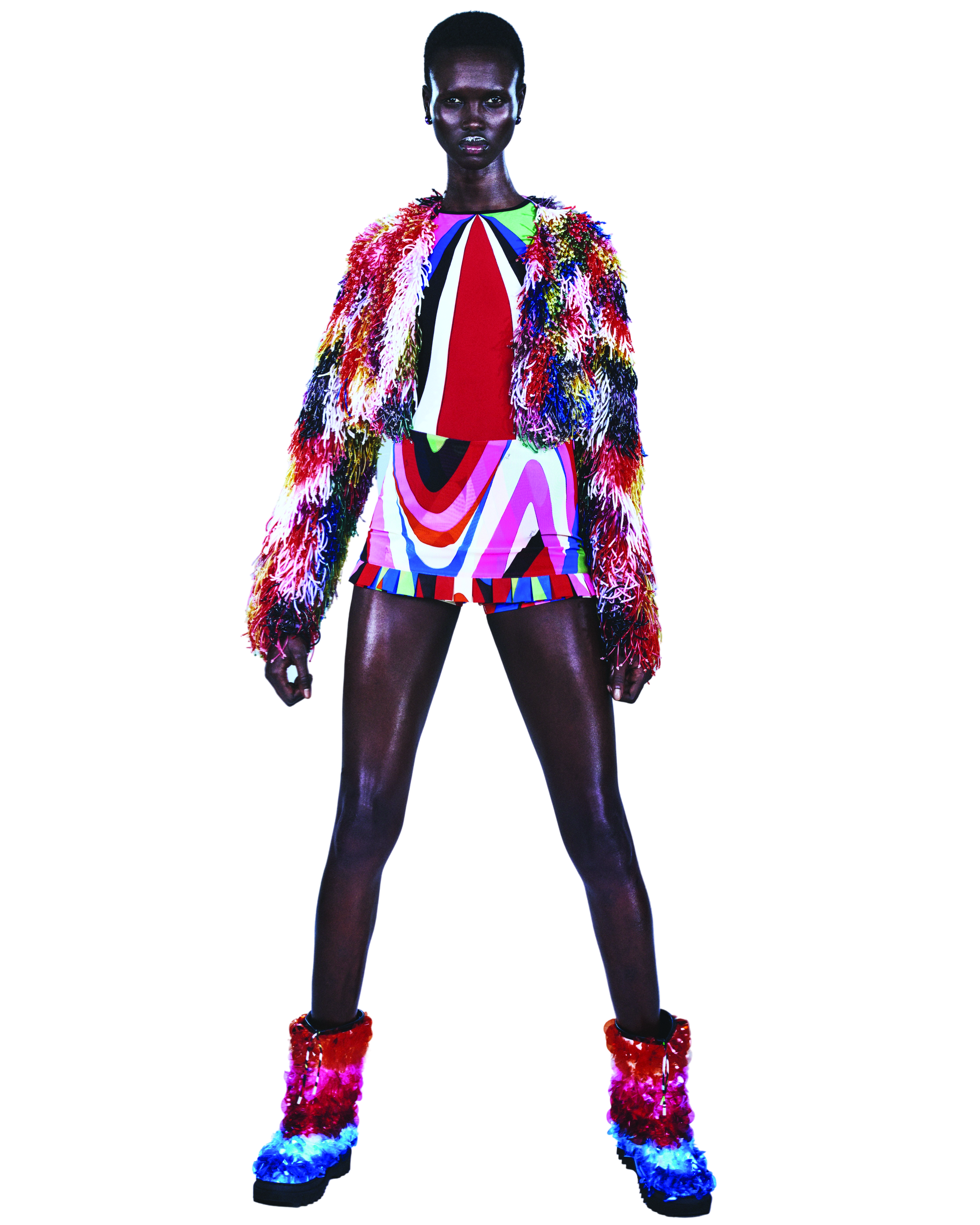 The new Pucci monogram becomes an instant classic, whether on fine silk or spongy beachside jacquard. Gold leather — a lustrous trench or motocross bolero — and metallic cable-knit emerge in time for the holidays. As a crisp counterpoint, several looks are awash in white: a dress spliced with fringes; soft feminine tailoring; and sporty separates. Here, color pops up in small ornamental ways, such as buttons in leftover silk, to subtly signal the Pucci touch.
