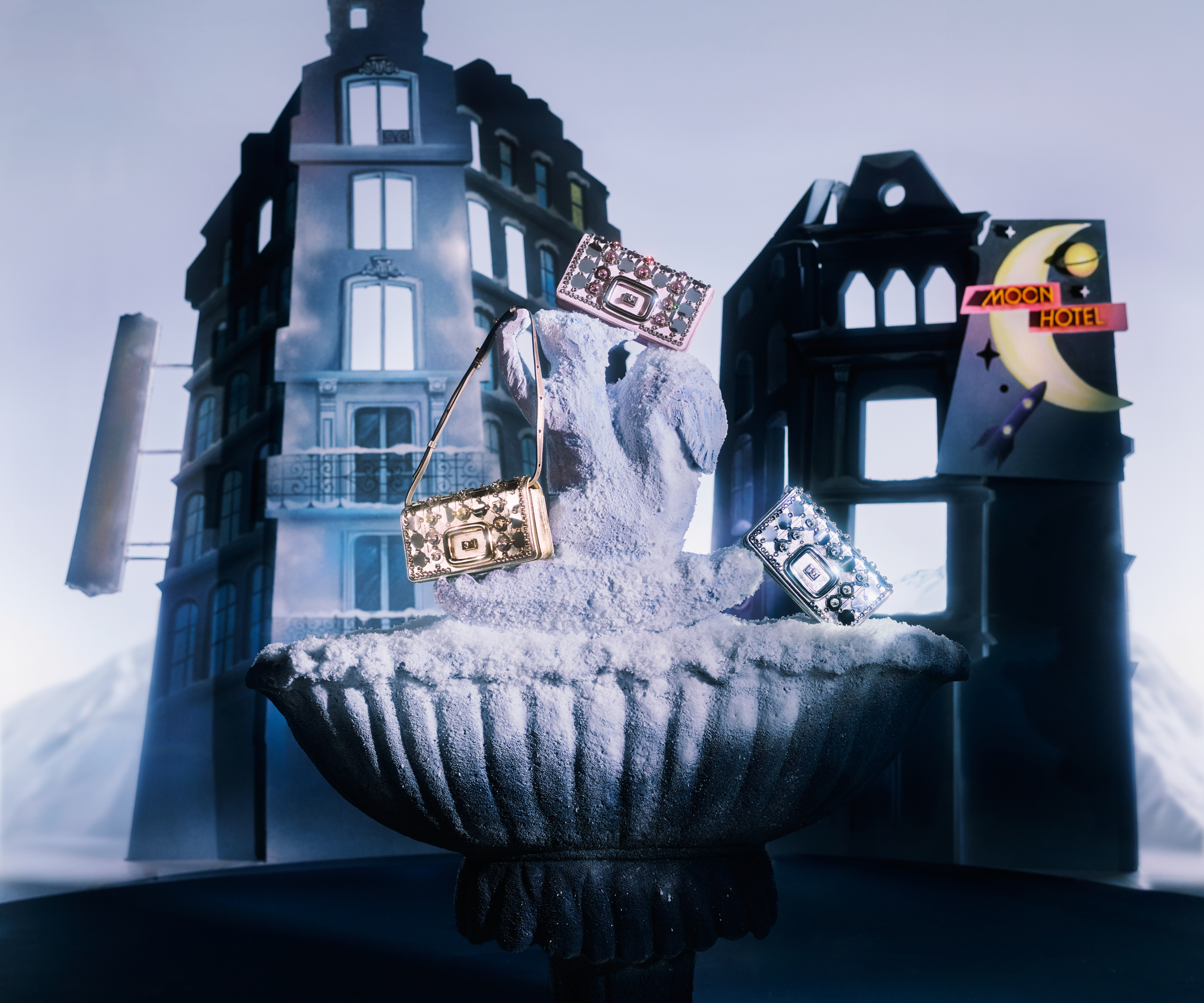 Imagining the City of Light submerged in soft blankets of pure white snow, the visual campaign features French actress Camille Razat photographed by Marcin Kempski. The Emily in Paris star is depicted in the centre of a cinematic white landscape, where Haussmanian buildings and scrolled iron streetlamps are joined by the playful spirit of a white squirrel carved in ice and snow and watched over by a crescent moon.