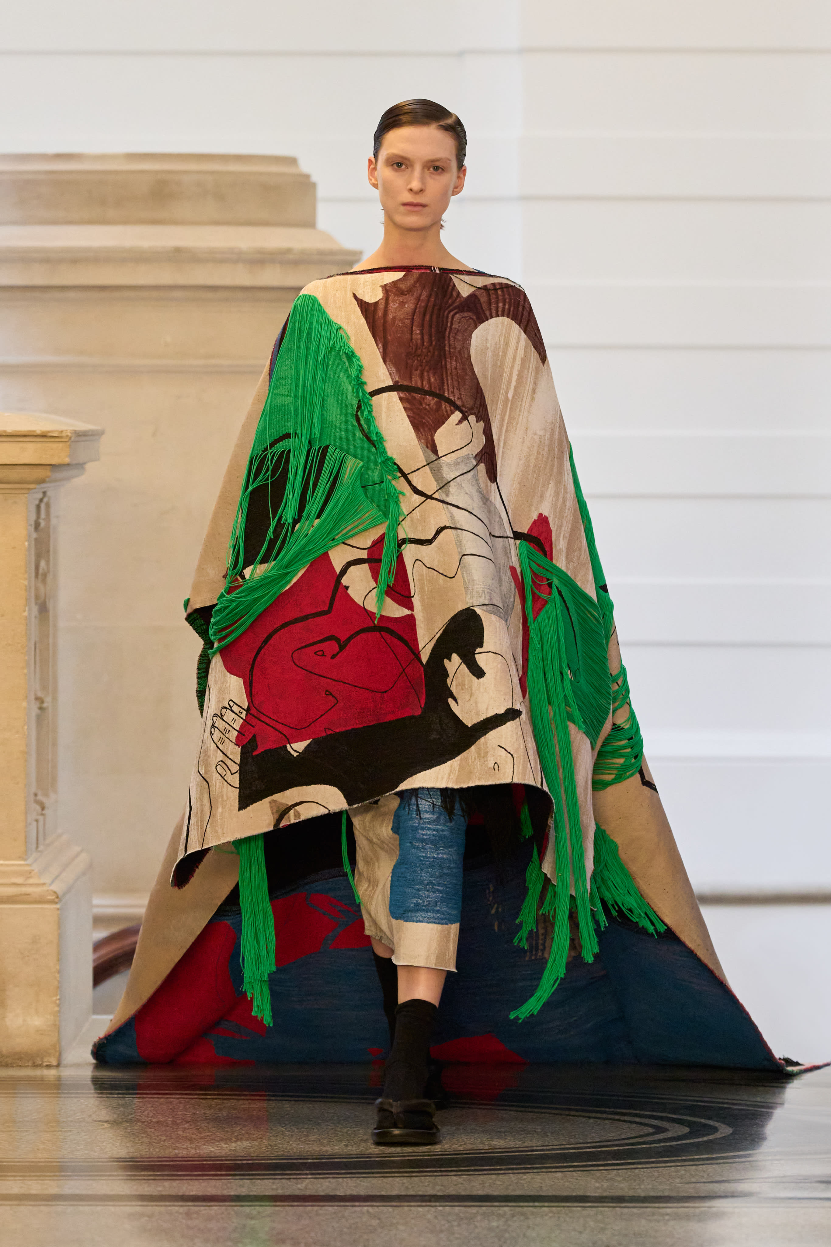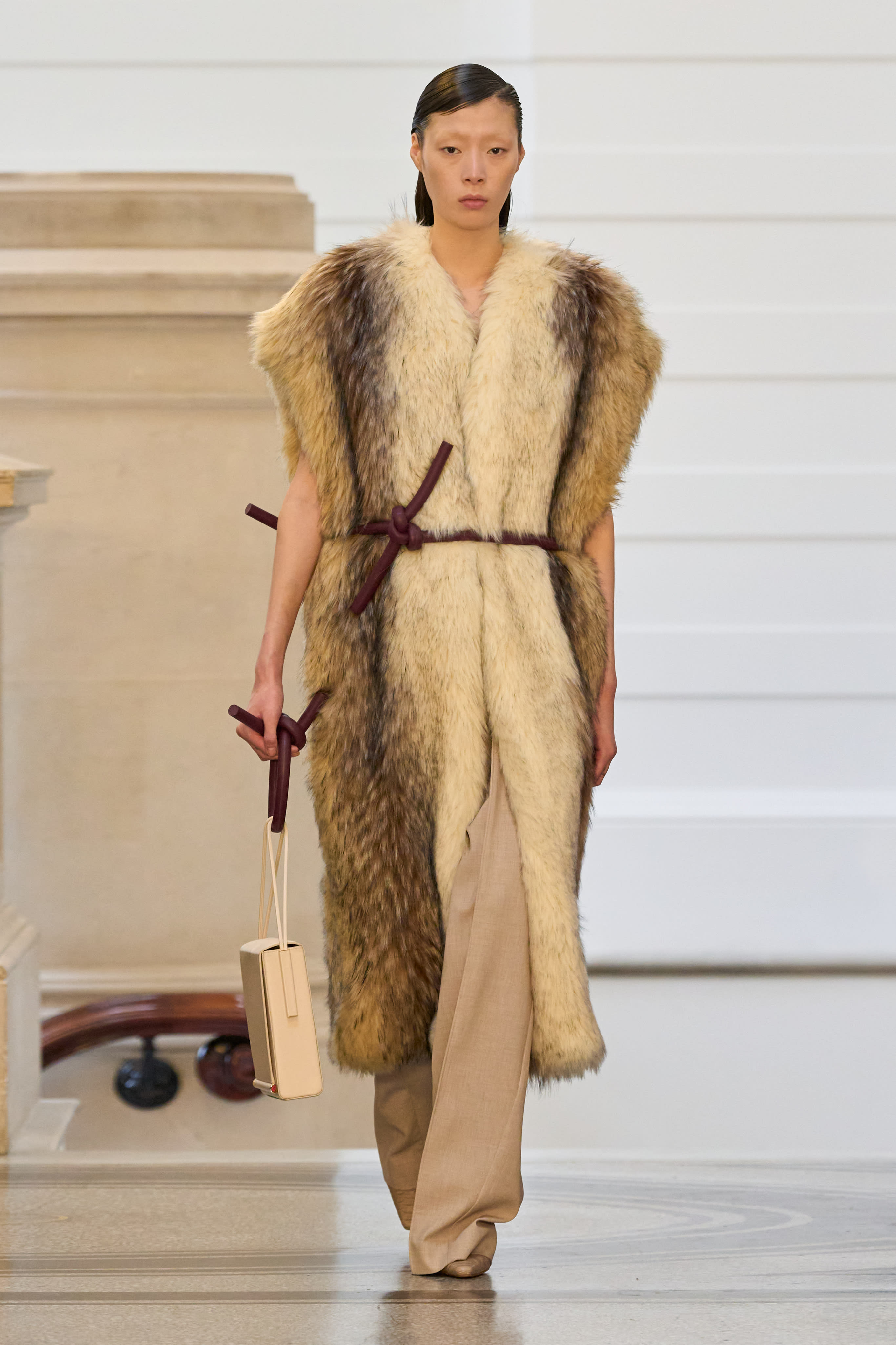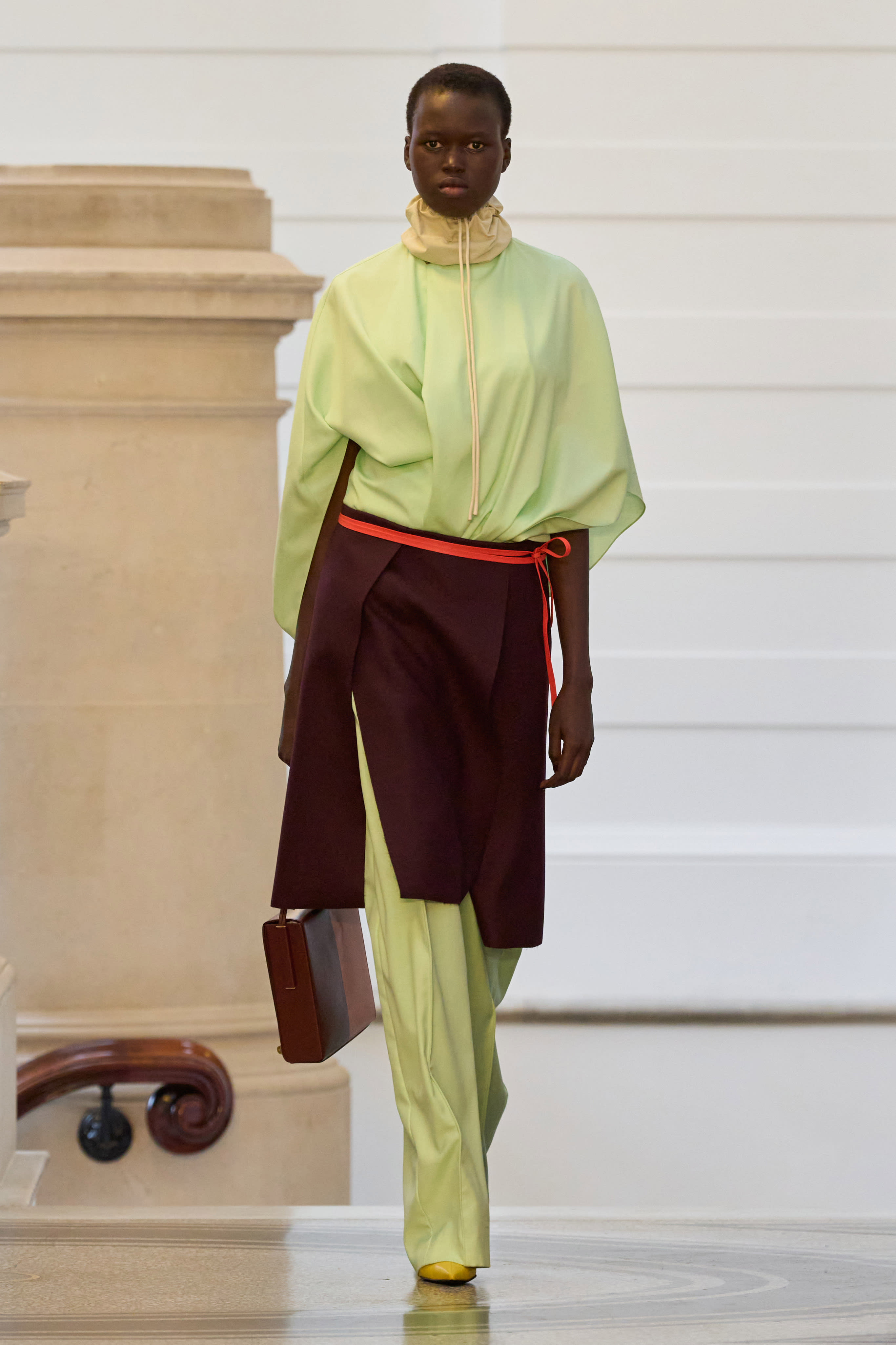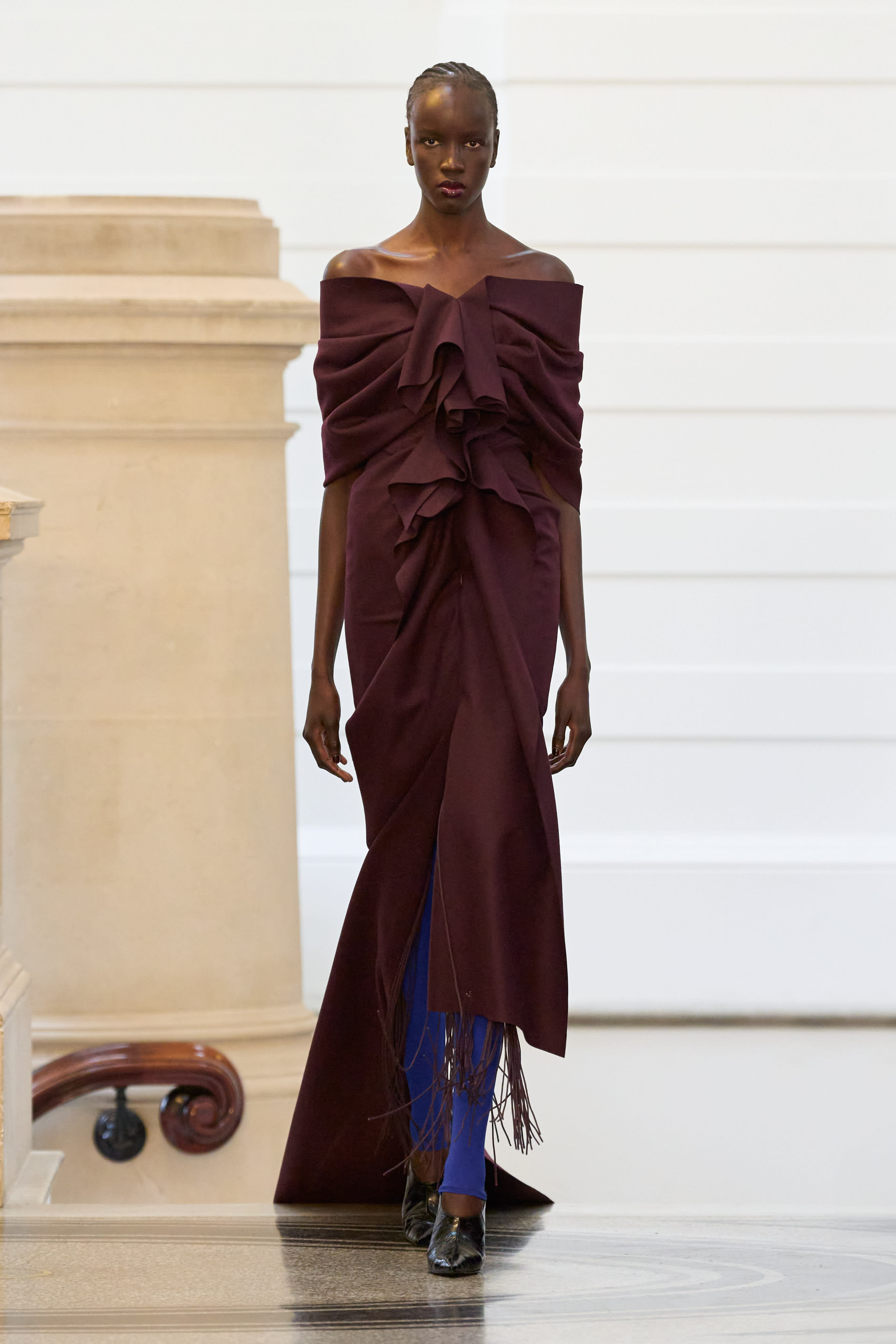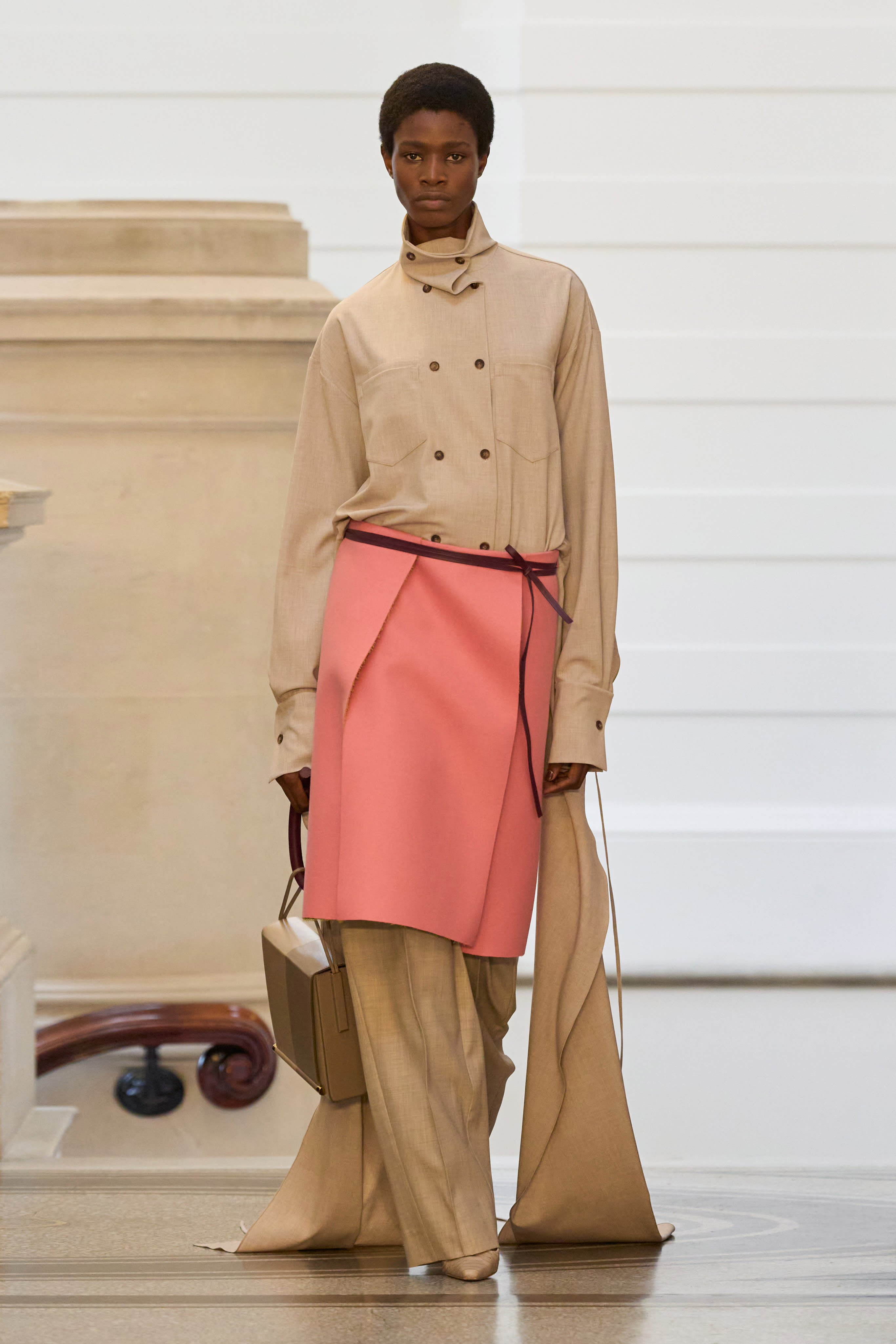 Tailoring boasts a distinctive silhouette, juxtaposed against a meticulously tailored waistline in hues of Hickory and Dusk. Notably present is the introduction of slashed skirts, overlayed on top of trousers crafted from the same Melton Wool. Elsewhere, panels akin to blankets wrap meticulously around the body, with sweeping long trains that epitomise a marriage of historical inspiration and contemporary elegance.