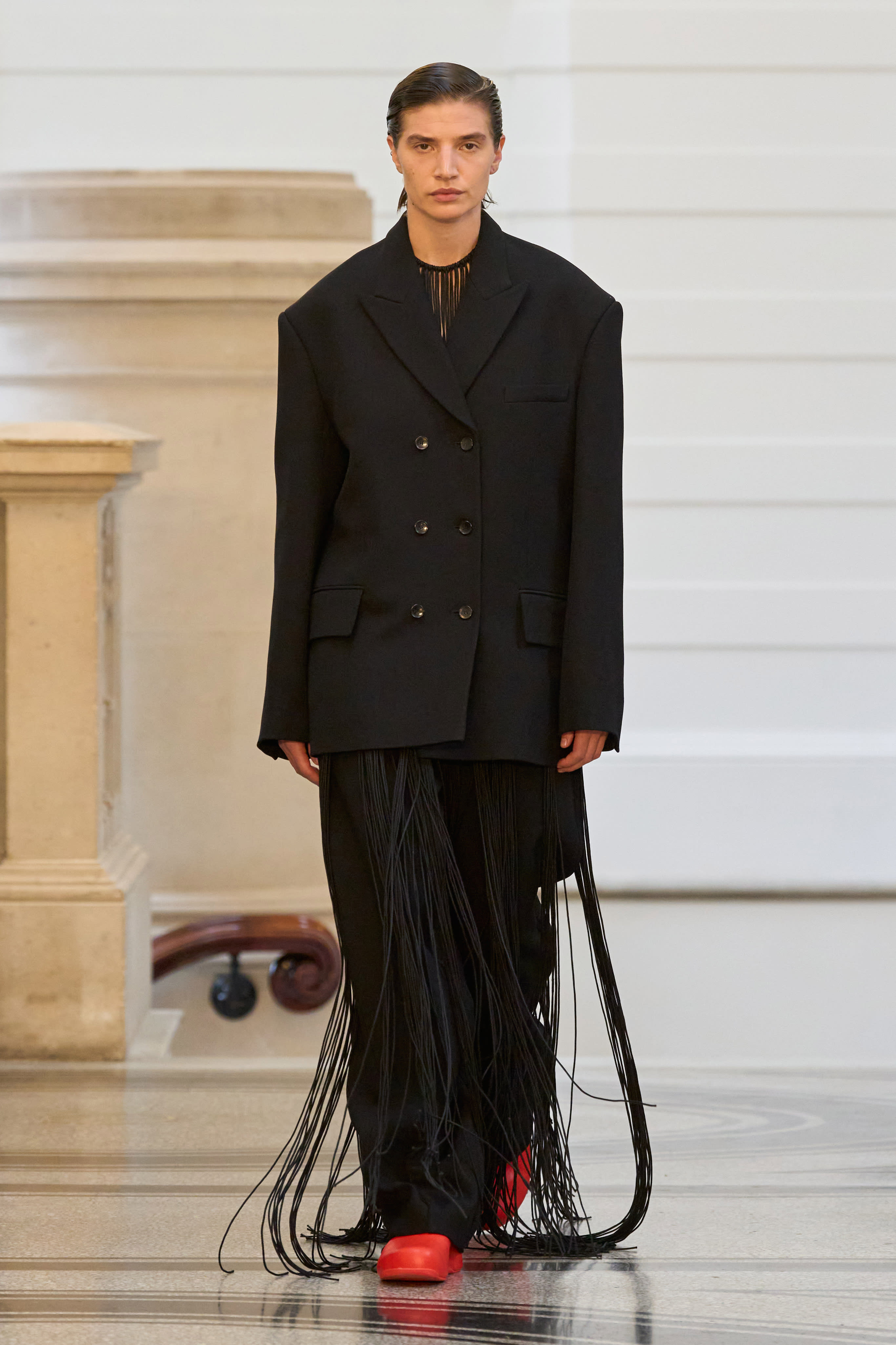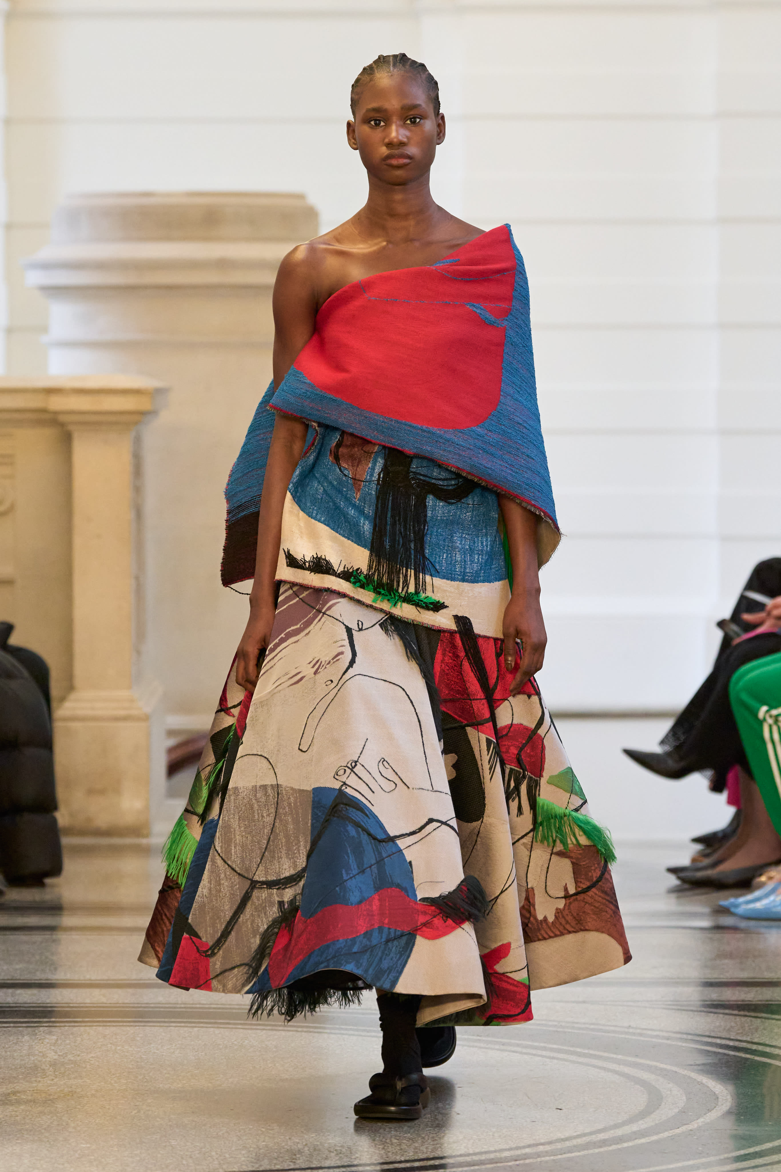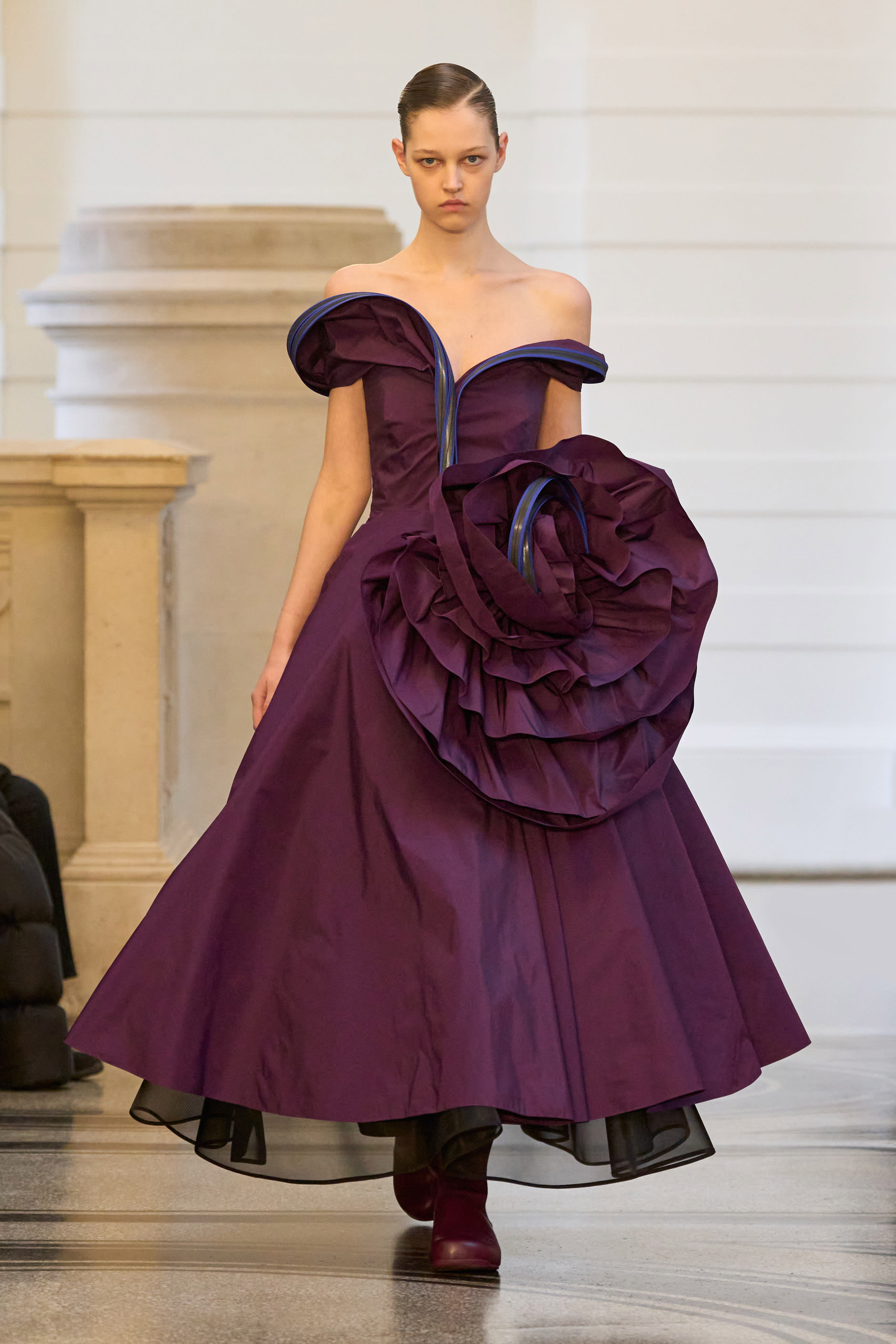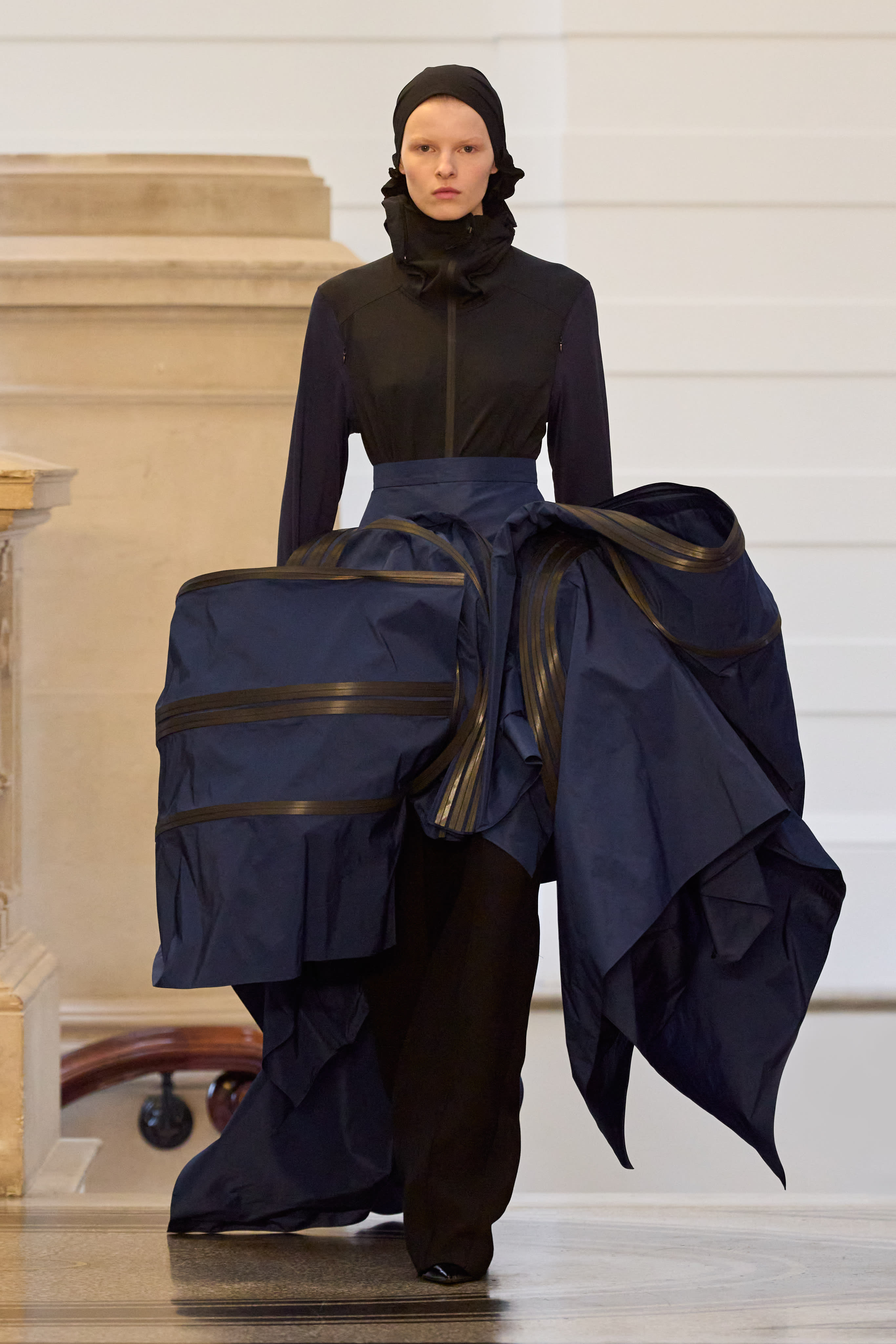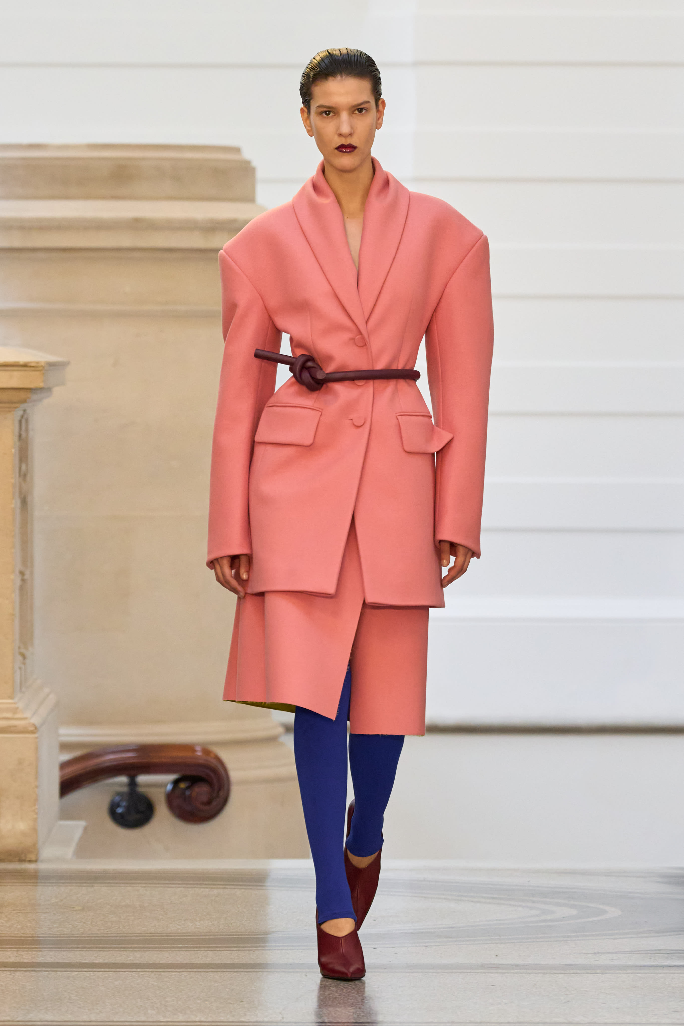 Tailoring boasts a distinctive silhouette, juxtaposed against a meticulously tailored waistline in hues of Hickory and Dusk. Notably present is the introduction of slashed skirts, overlayed on top of trousers crafted from the same Melton Wool. Elsewhere, panels akin to blankets wrap meticulously around the body, with sweeping long trains that epitomise a marriage of historical inspiration and contemporary elegance.