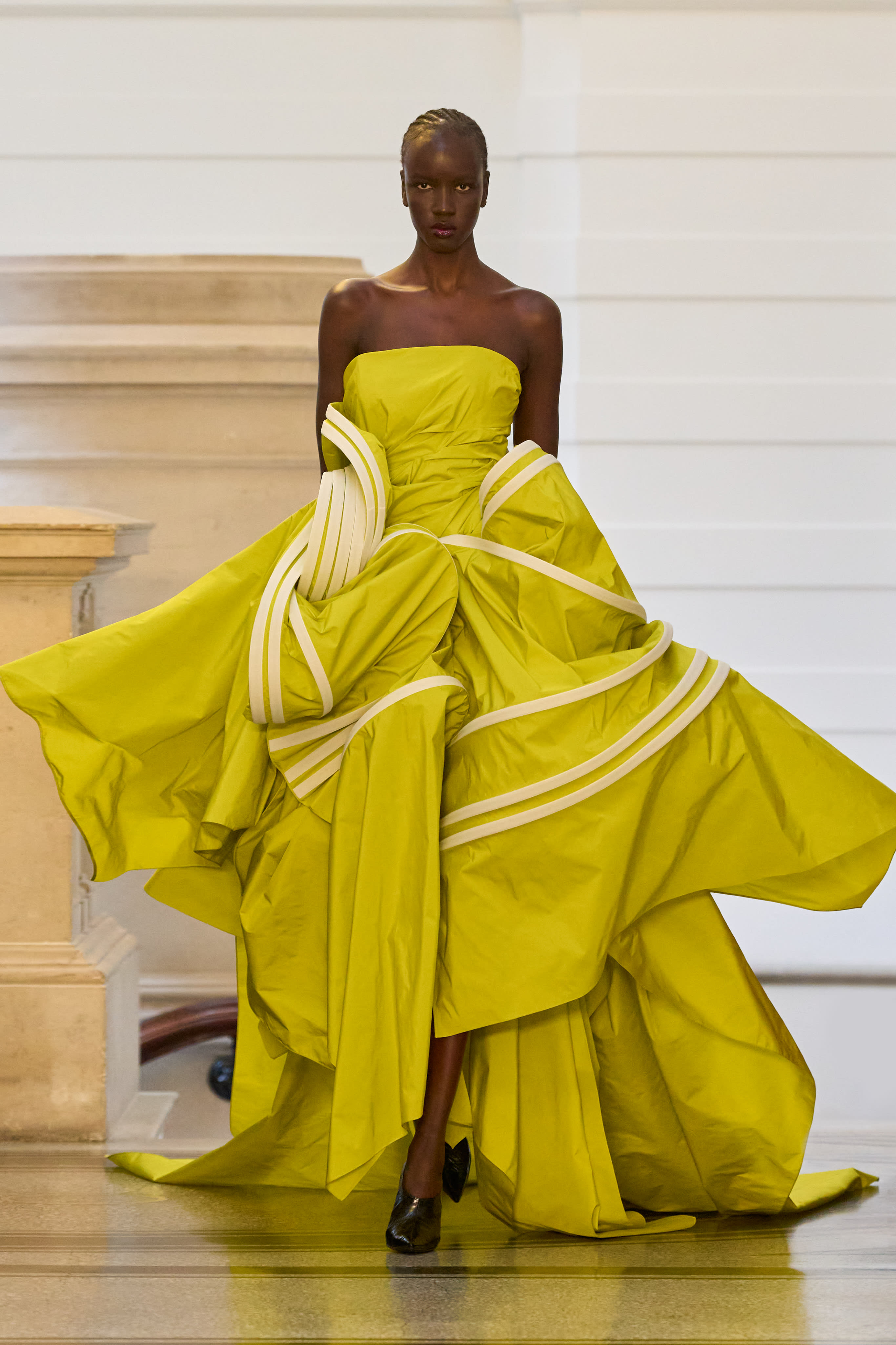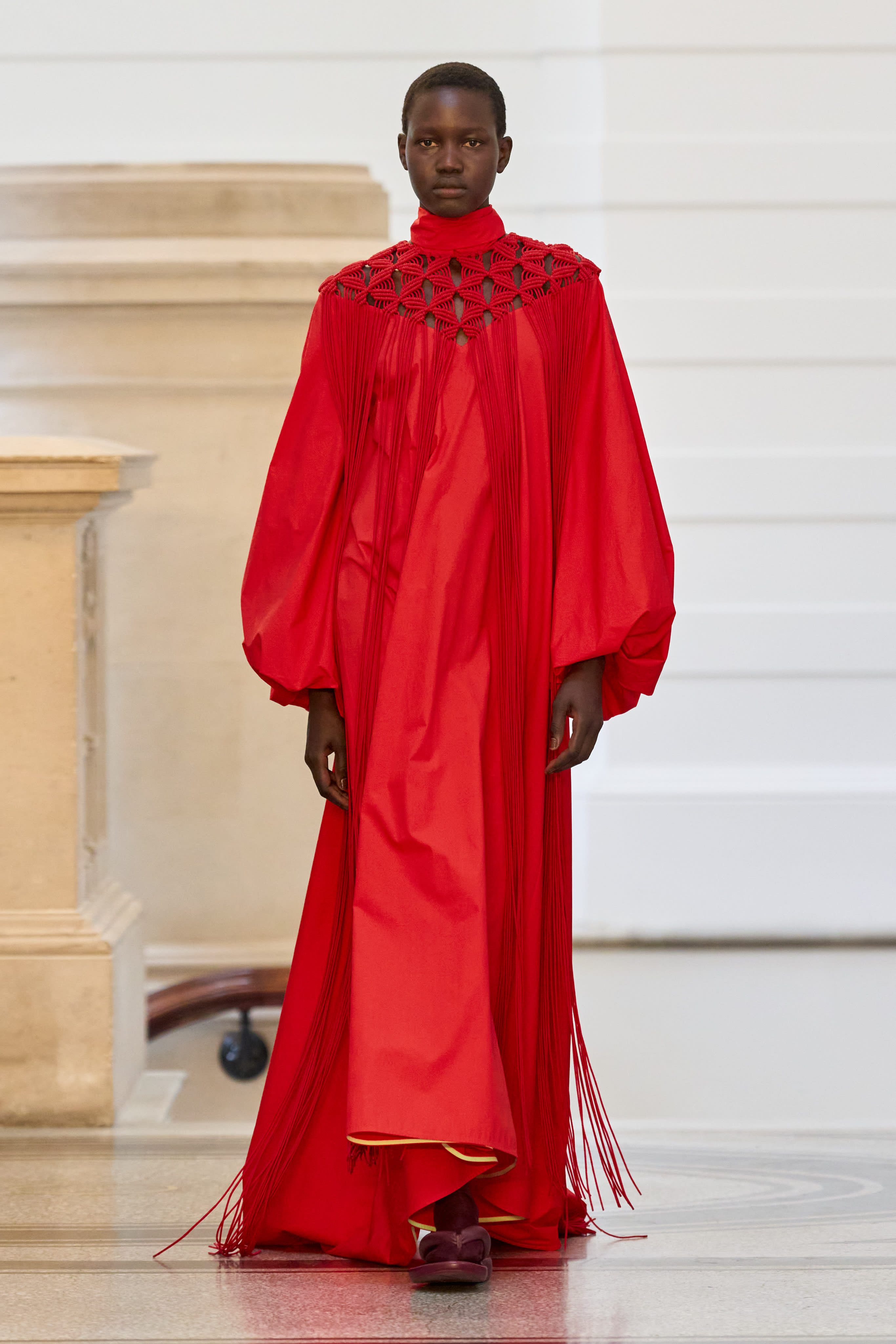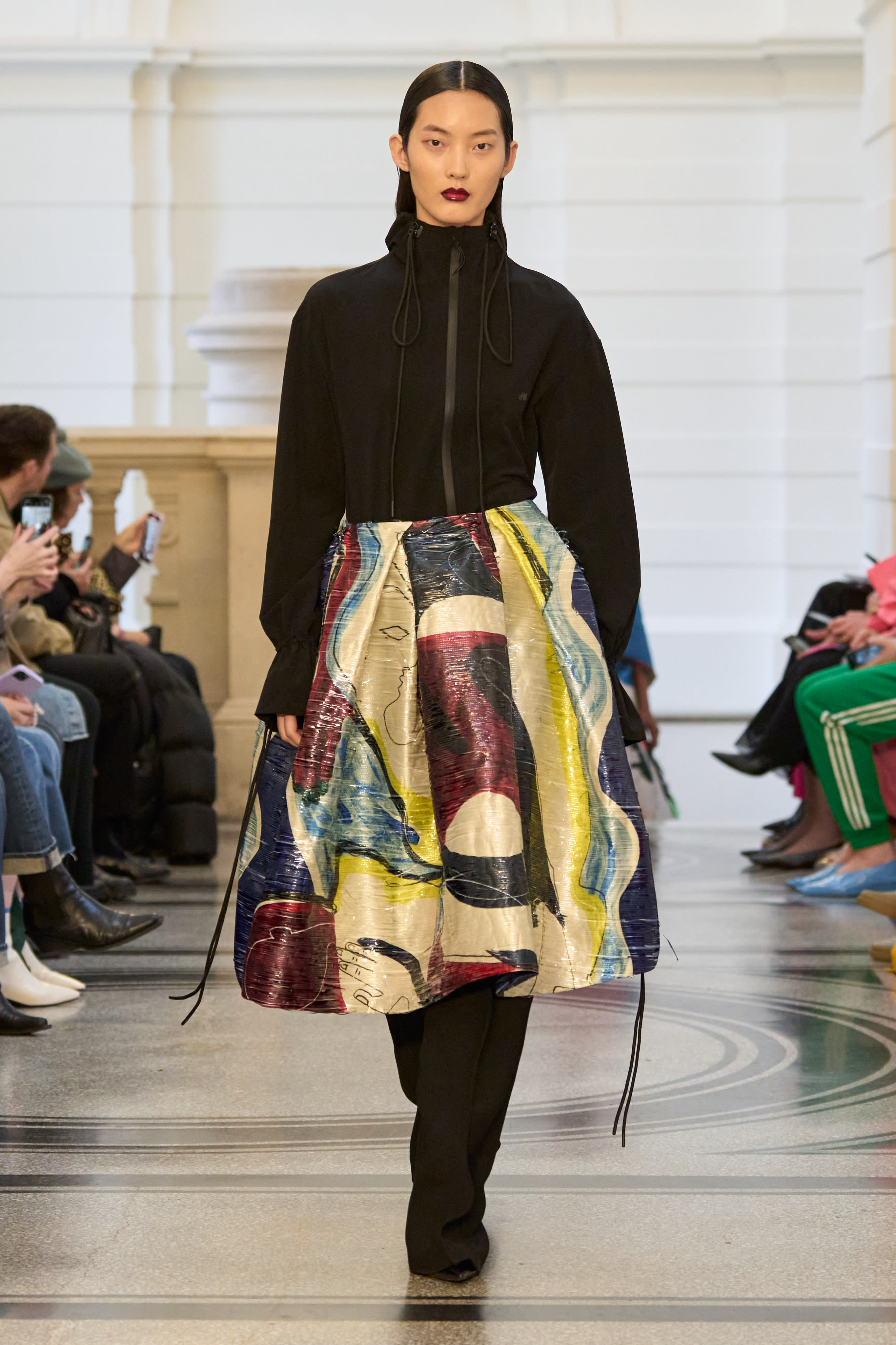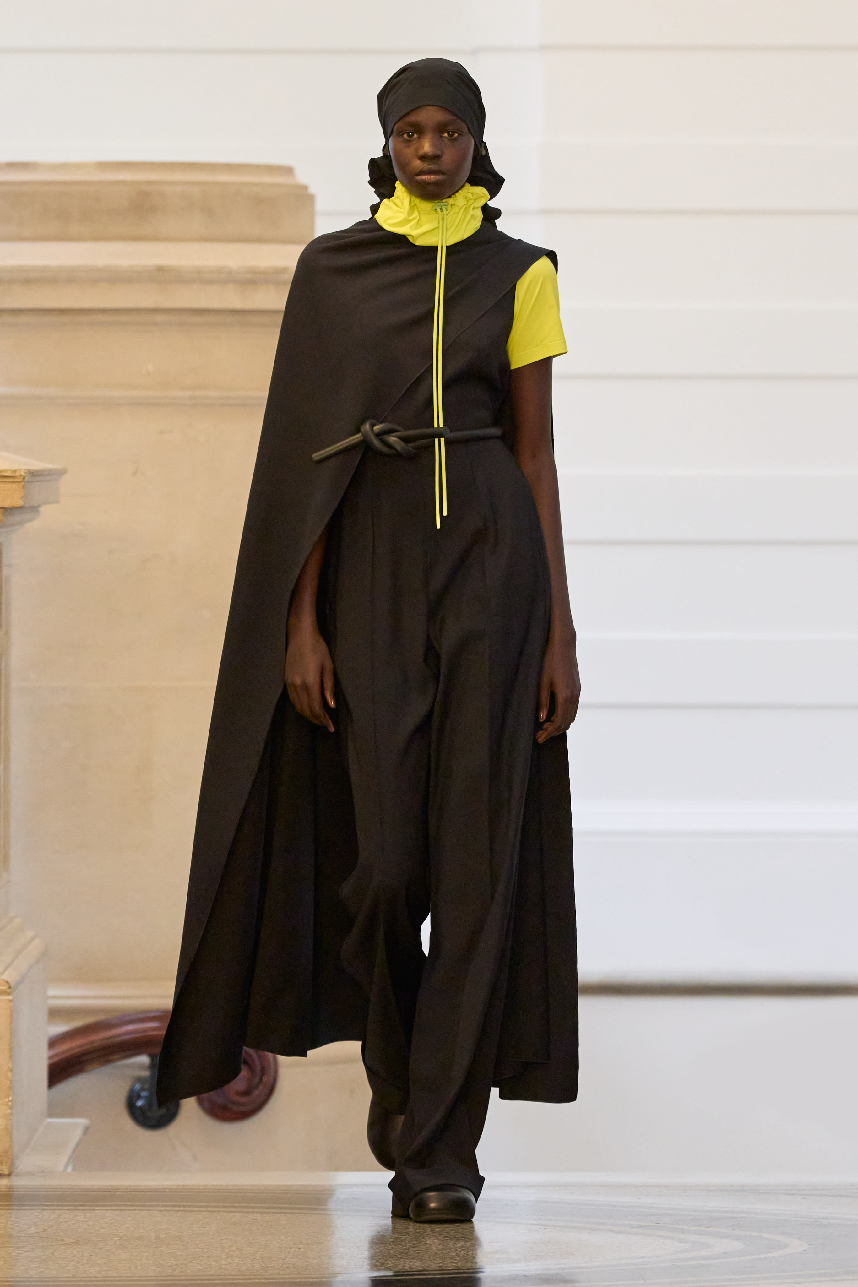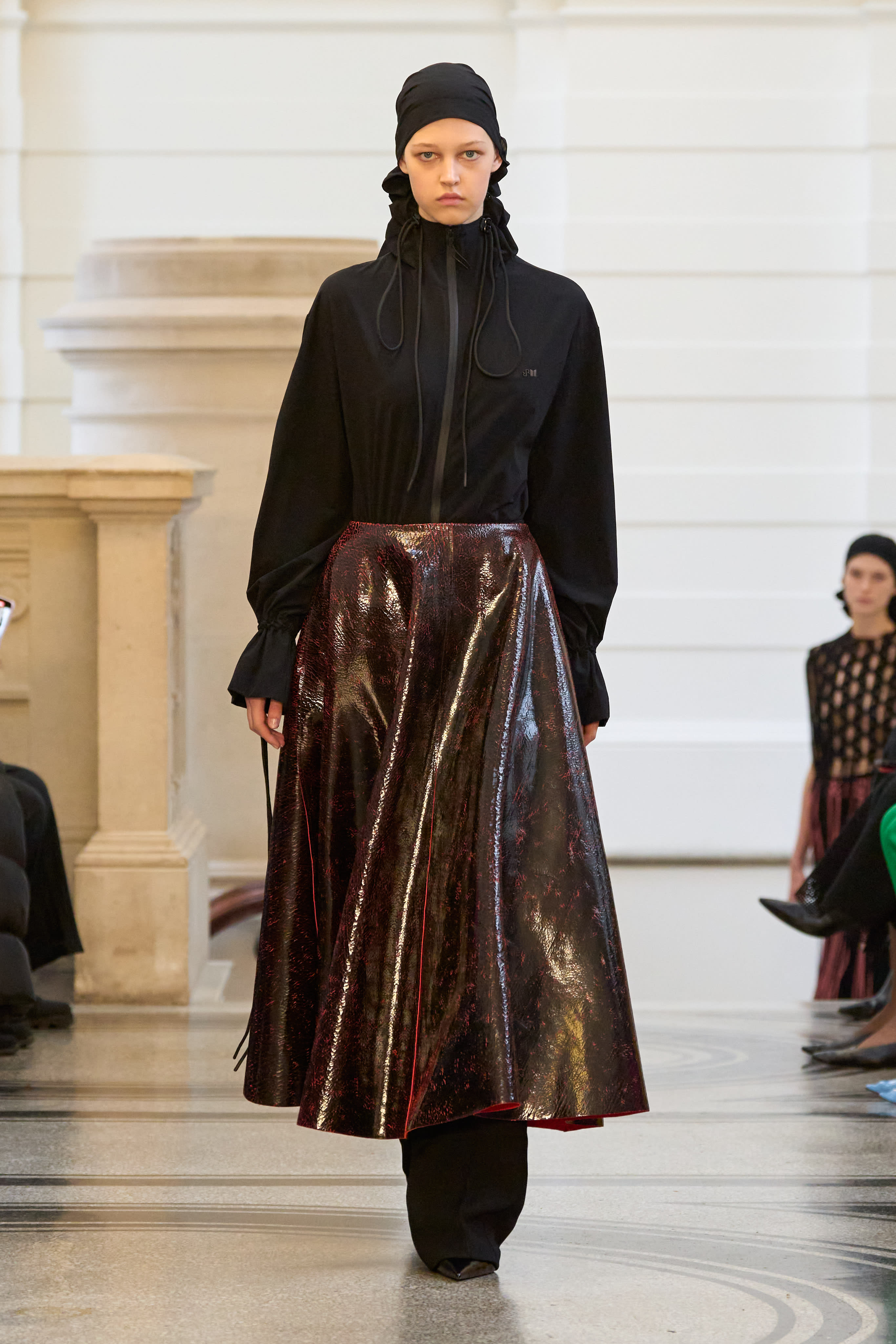 Tailoring boasts a distinctive silhouette, juxtaposed against a meticulously tailored waistline in hues of Hickory and Dusk. Notably present is the introduction of slashed skirts, overlayed on top of trousers crafted from the same Melton Wool. Elsewhere, panels akin to blankets wrap meticulously around the body, with sweeping long trains that epitomise a marriage of historical inspiration and contemporary elegance.