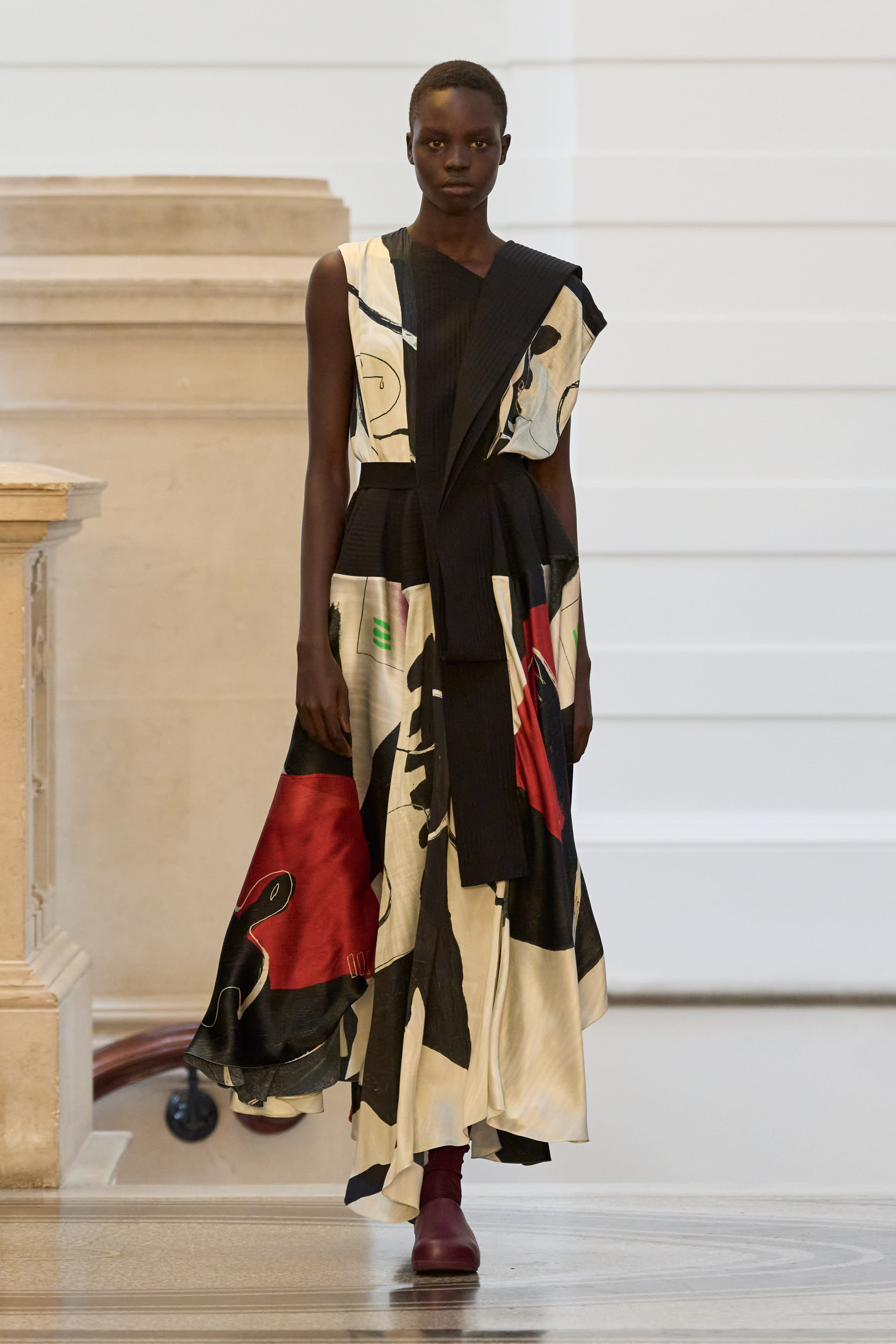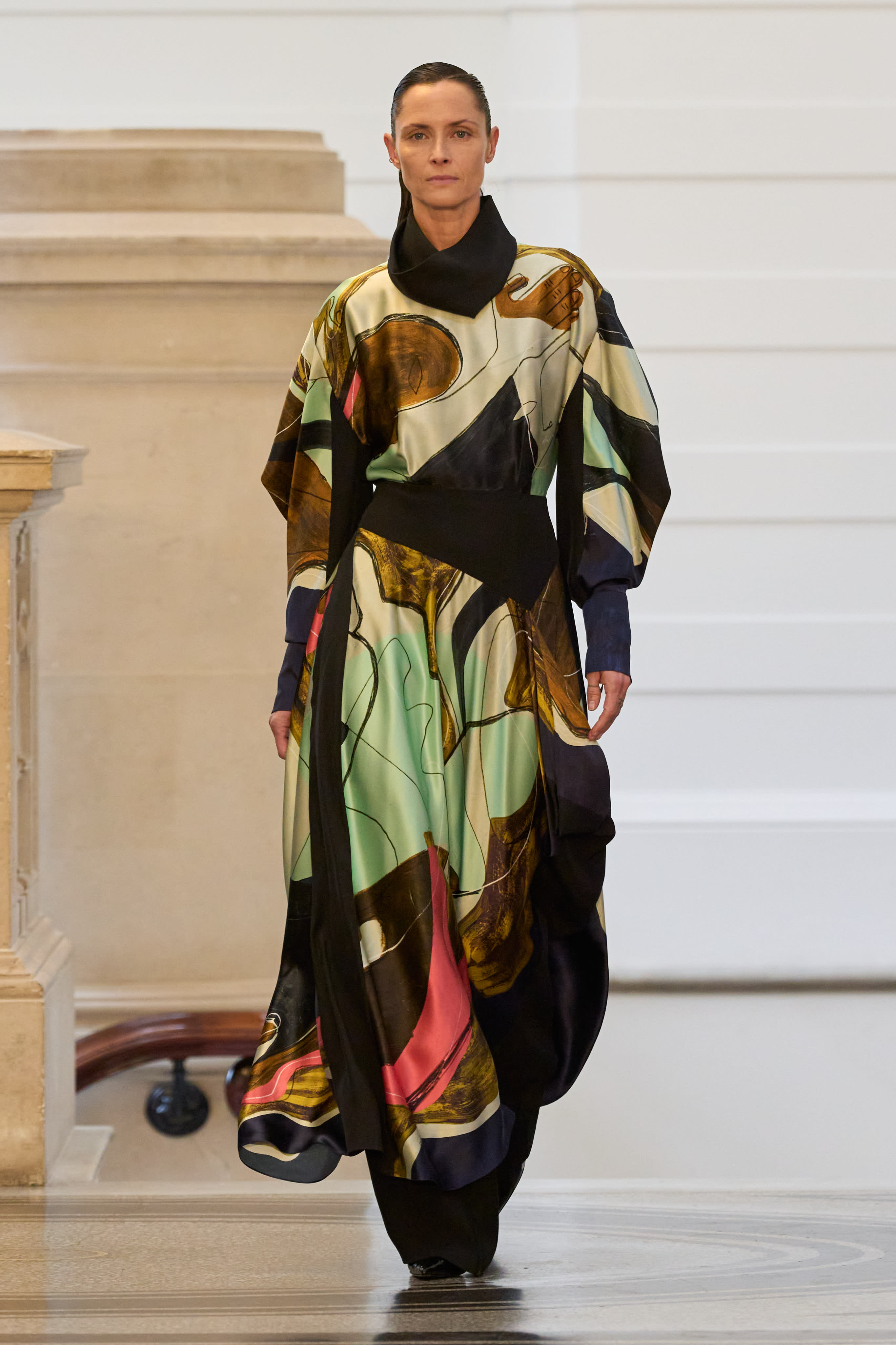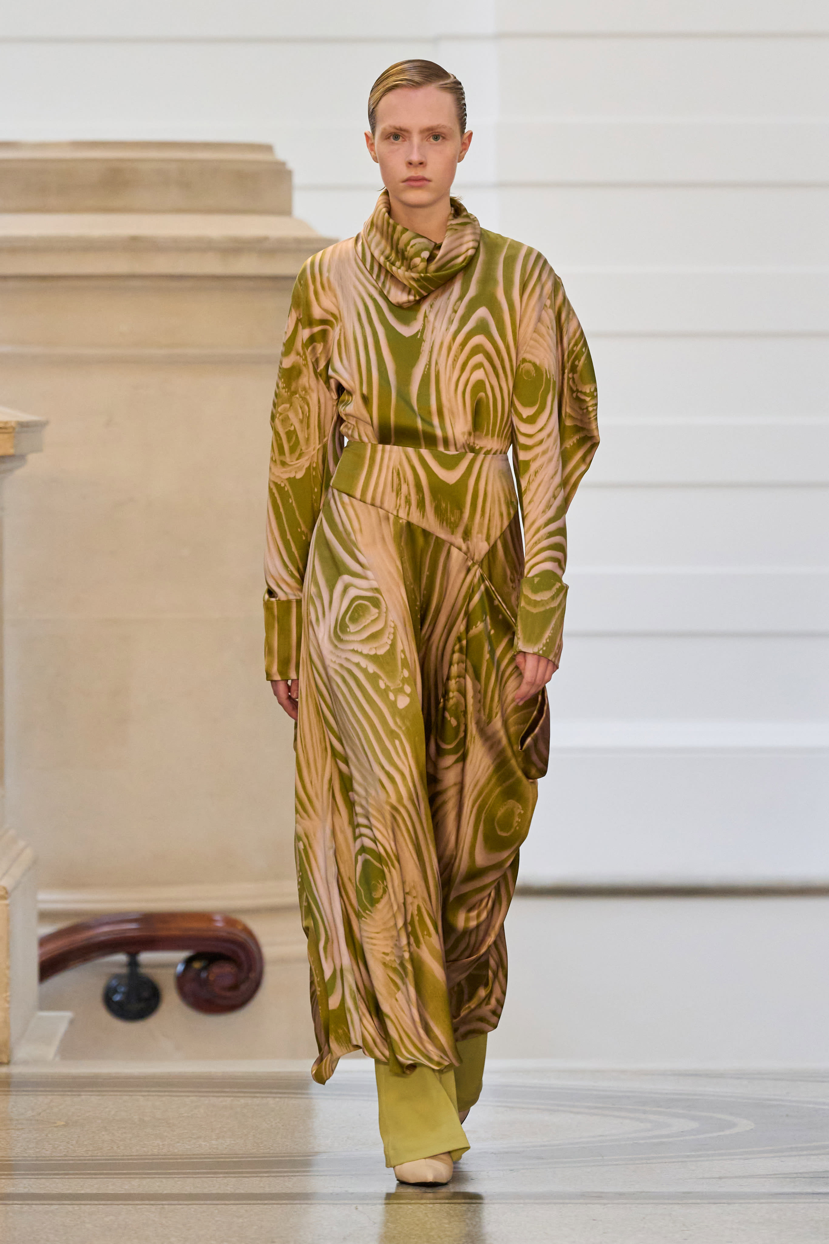 ROKSANDA embarks on a journey of tactility, reimagining original imagery in an ode to everyday life. An ‘Oak Wood’ print in hues of moss-green and rose, pays homage to the blank canvas witnessed by Le Corbusier before commencing his artistic journey. The same ‘Oak Wood’ serves as a background for rich tapestries that depict narratives of the everyday, with illustrious fringes in vivid green that dance around the body. Hand-made sculptural jewellery' in light-gold manipulated silk satin around the form, echoing the spirit of Le Corbusier's later life artworks.