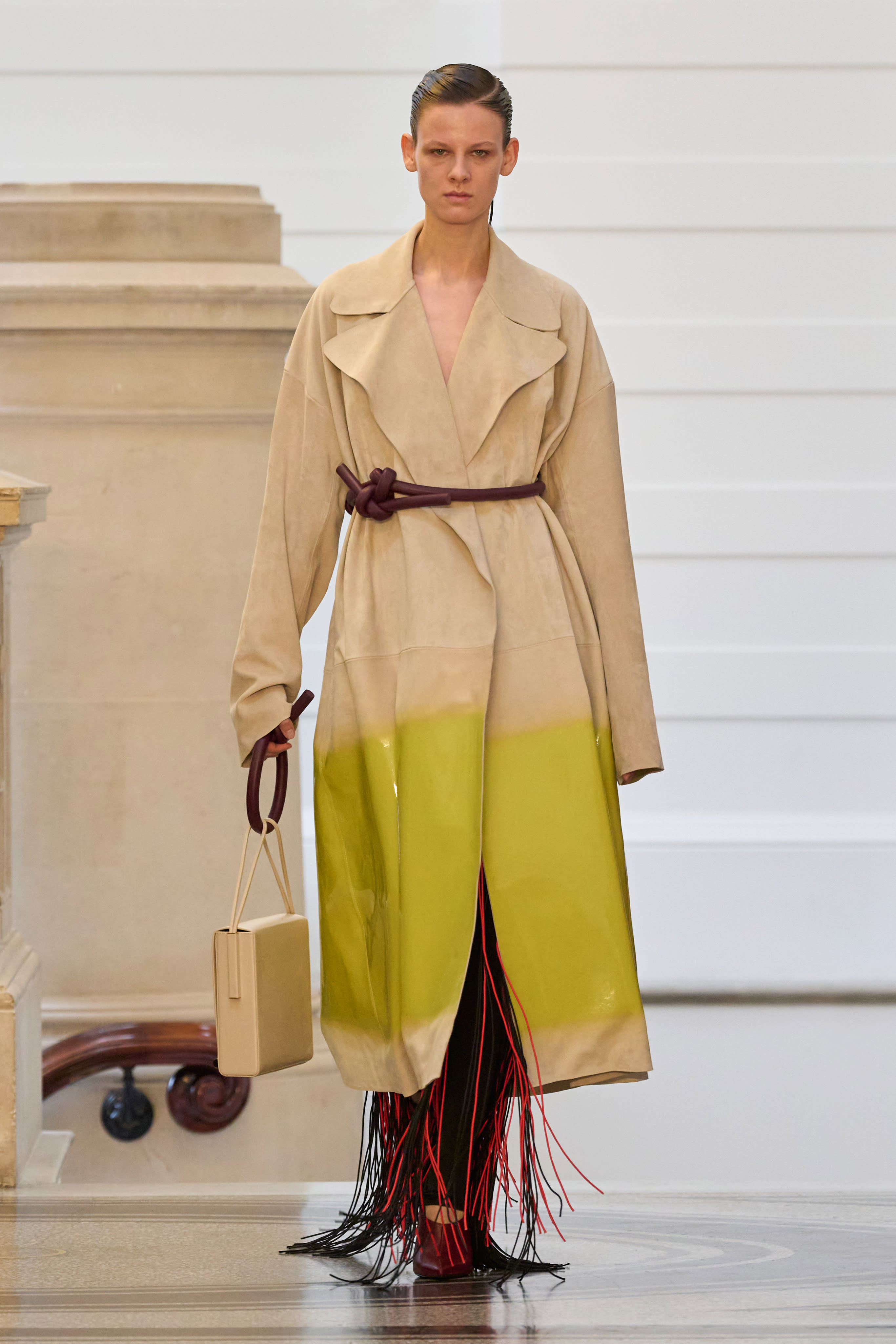 Leather is introduced to the collection, coming to form in a Sienna Suede skirt coated in a high-gloss black ‘cracked’ finish, revealing the deep Sienna colour beneath. In a similar style, a Sage leather trench coat, hand-sprayed with Chartreuse panelling, is a neat contrast against the matte suede.