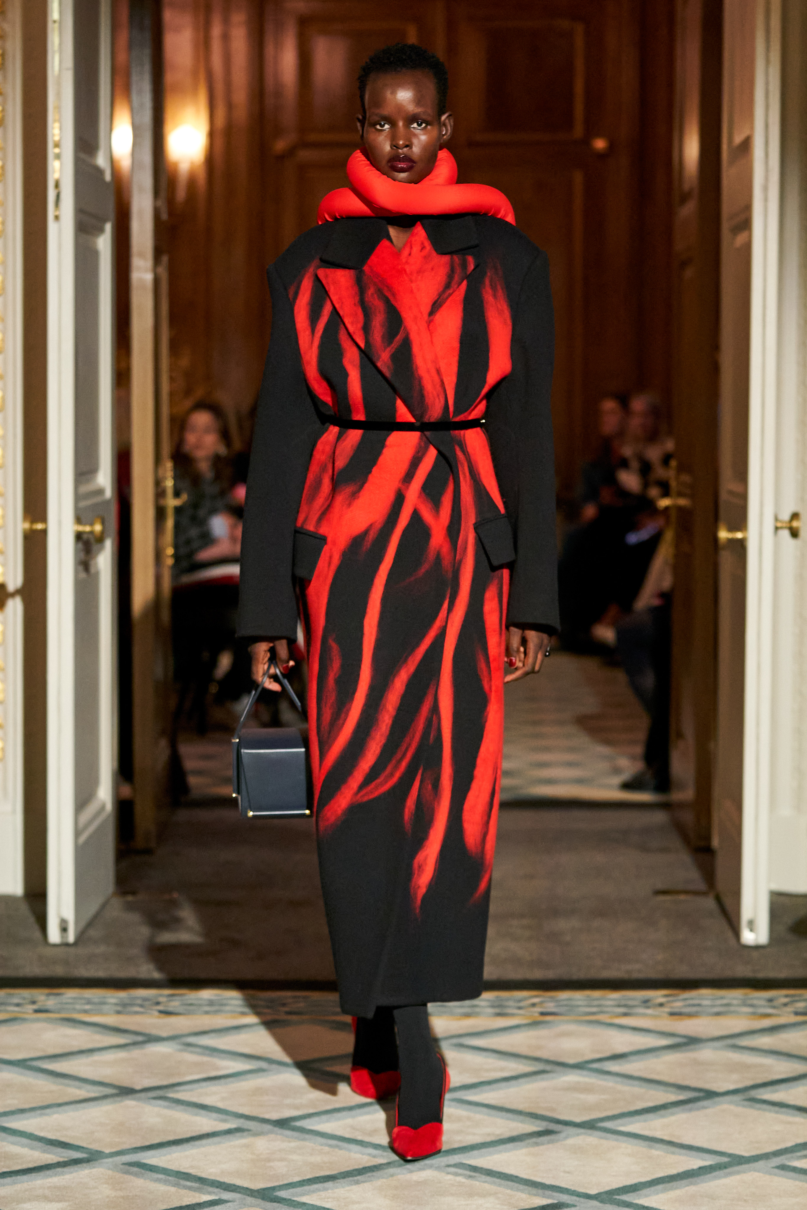 Tailoring and outerwear remains powerful while new structures are introduced through increasingly defined waistlines. Exaggerated proportions and extended panels of fabric wrapped around the bodice form new-found silhouettes, neither feminine nor masculine. Original hand-made patterns in bright crimson and yellow are applied by needle punching - using the artisanal technique Agugliatura to form organic, abstract lines, elevating fine wool coats and over-layers. Surface and swaths become one inseparable fabric.