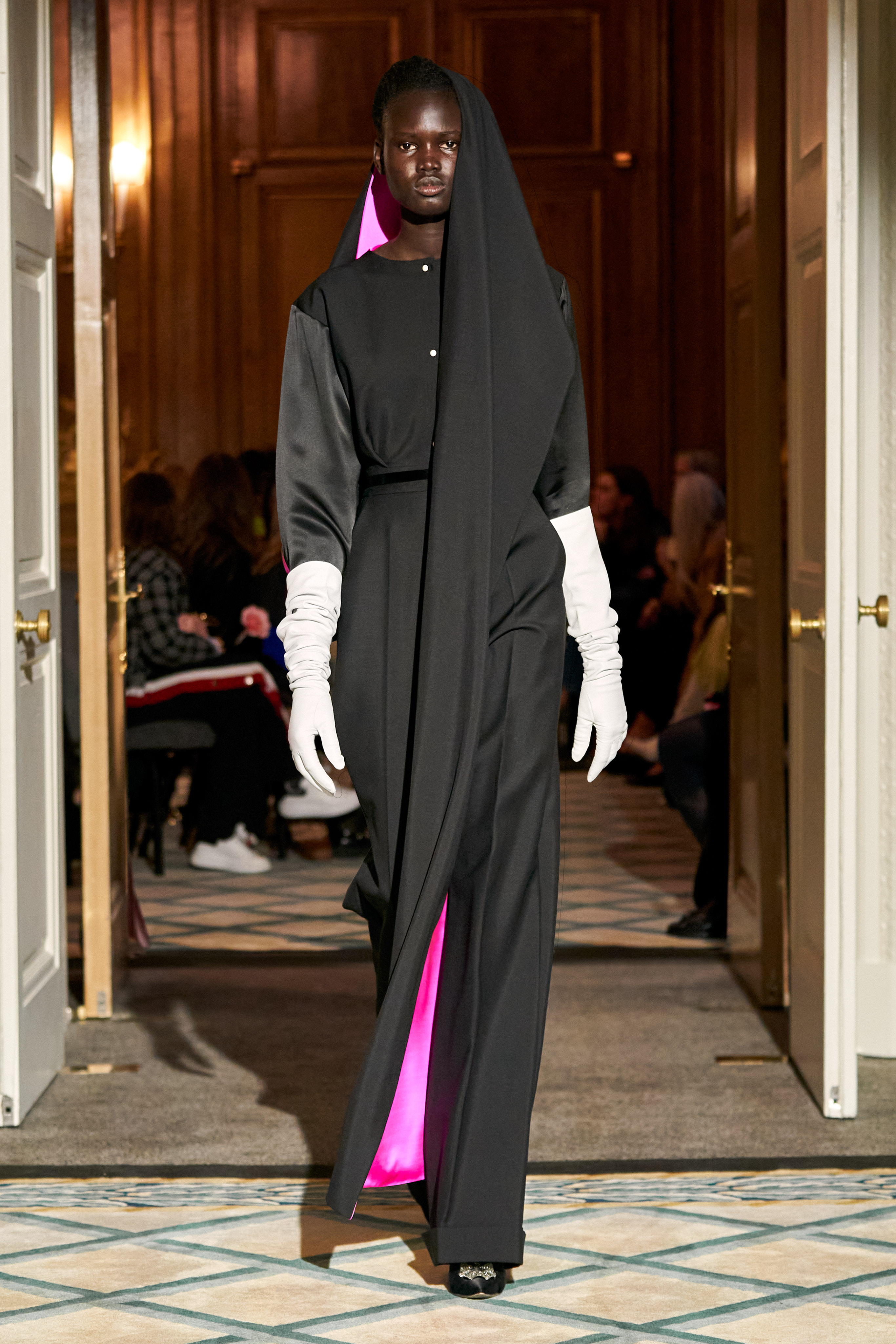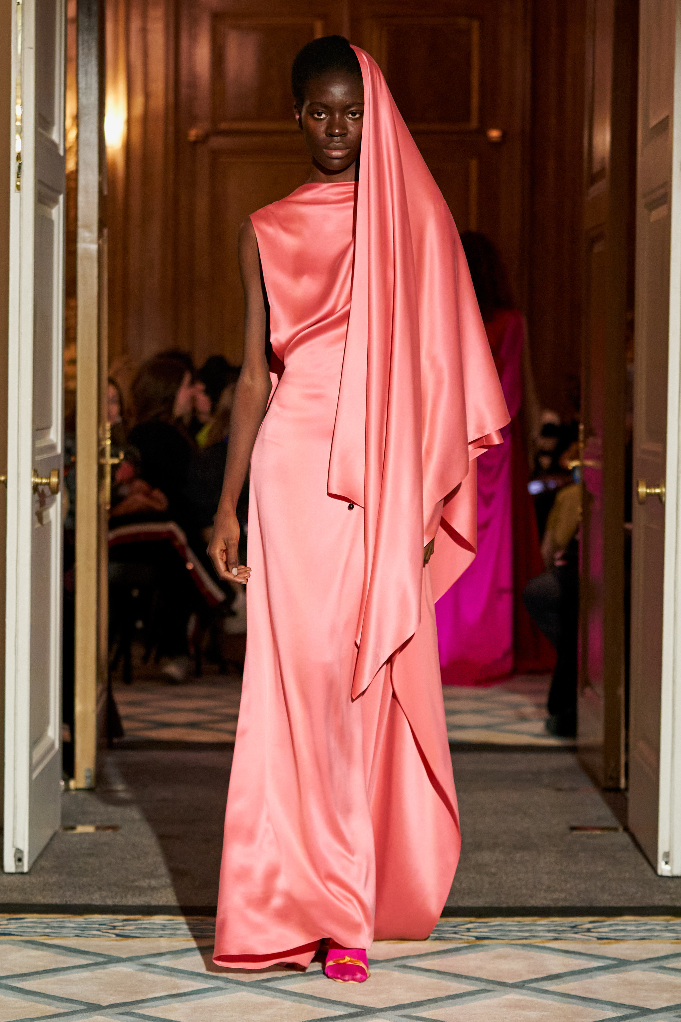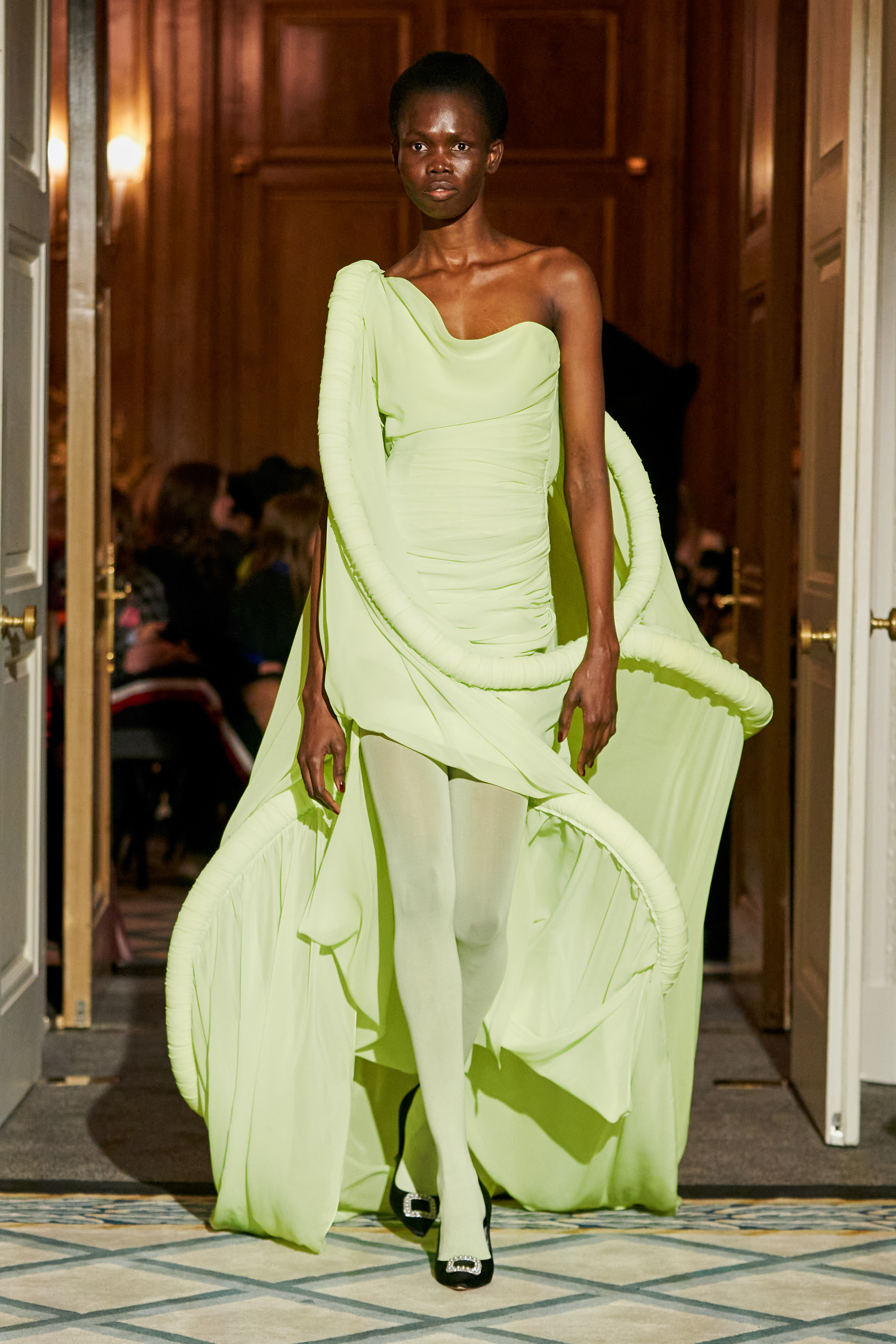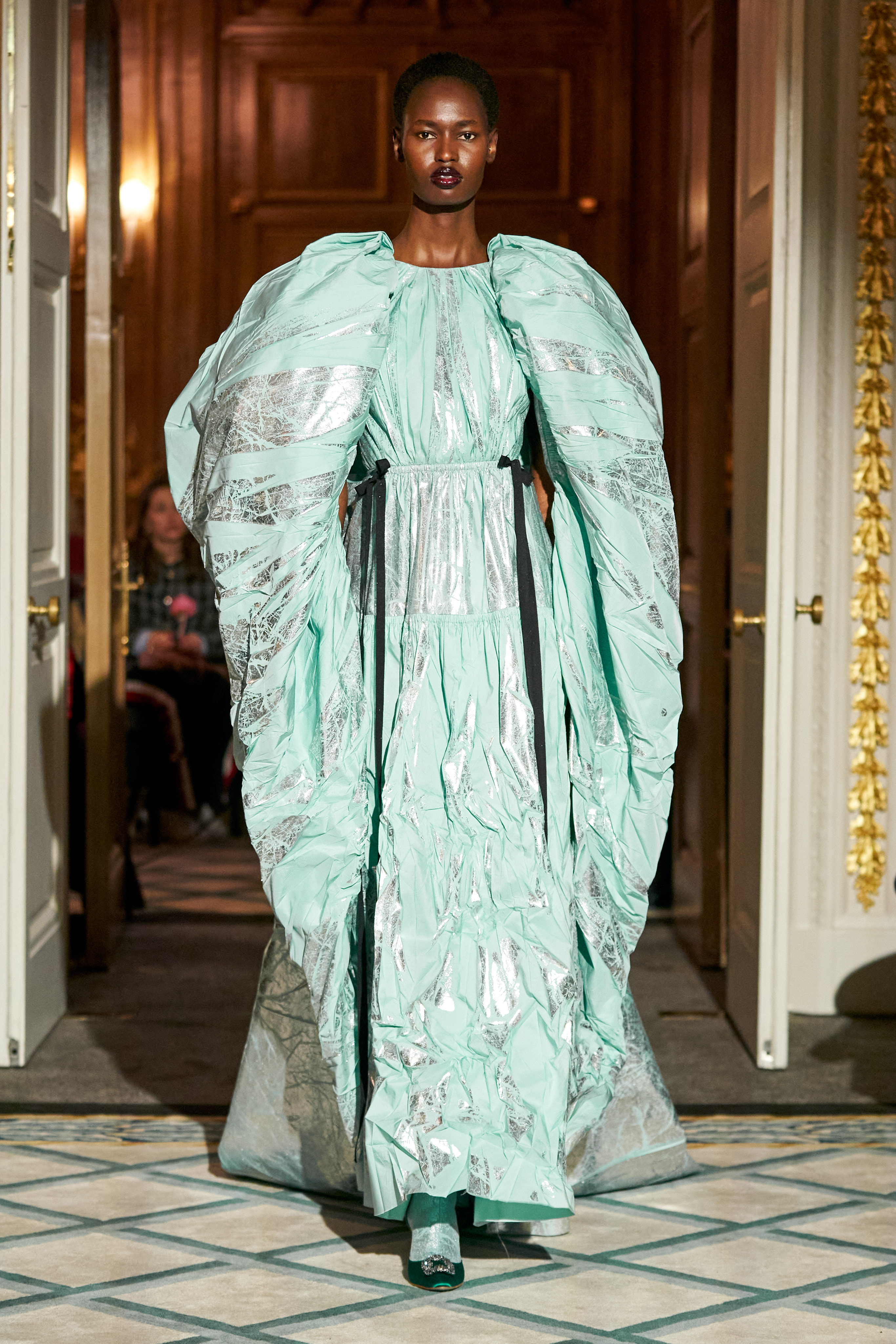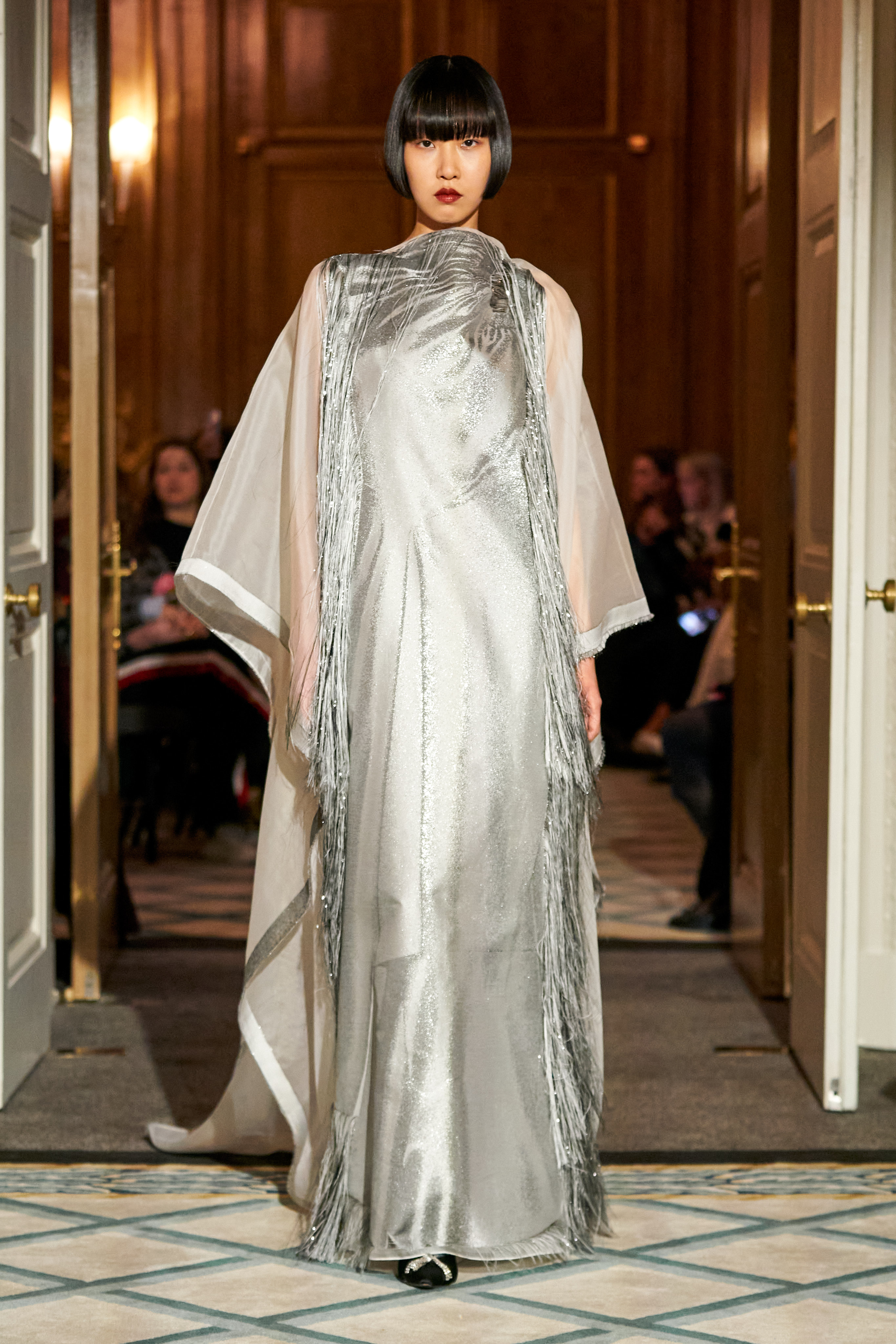 Championing the brand's rich artistic oeuvre, abstract expressionism is interpreted as luxurious silks become canvases to explorative print techniques creating illusions of layered silhouettes, allowing multiple areas of colour to create a distinct trompe-l'oeil effect. The technique is further extended to develop a fil-coupé fabric, woven onto a delicate silk organza base, from which gravity seems to be melting elements of the gown. Elsewhere, recycled crushed taffeta in foiled gold and silver are applied onto innovative architectural constructions allowing unexpected negative spaces. The thematic continuity of sheltering, unapologetic femininity, and a sense of refuge highlights the feminine body and its envelope - emphasised through delicate silks overlaid by floor-sweeping woollen capes.
