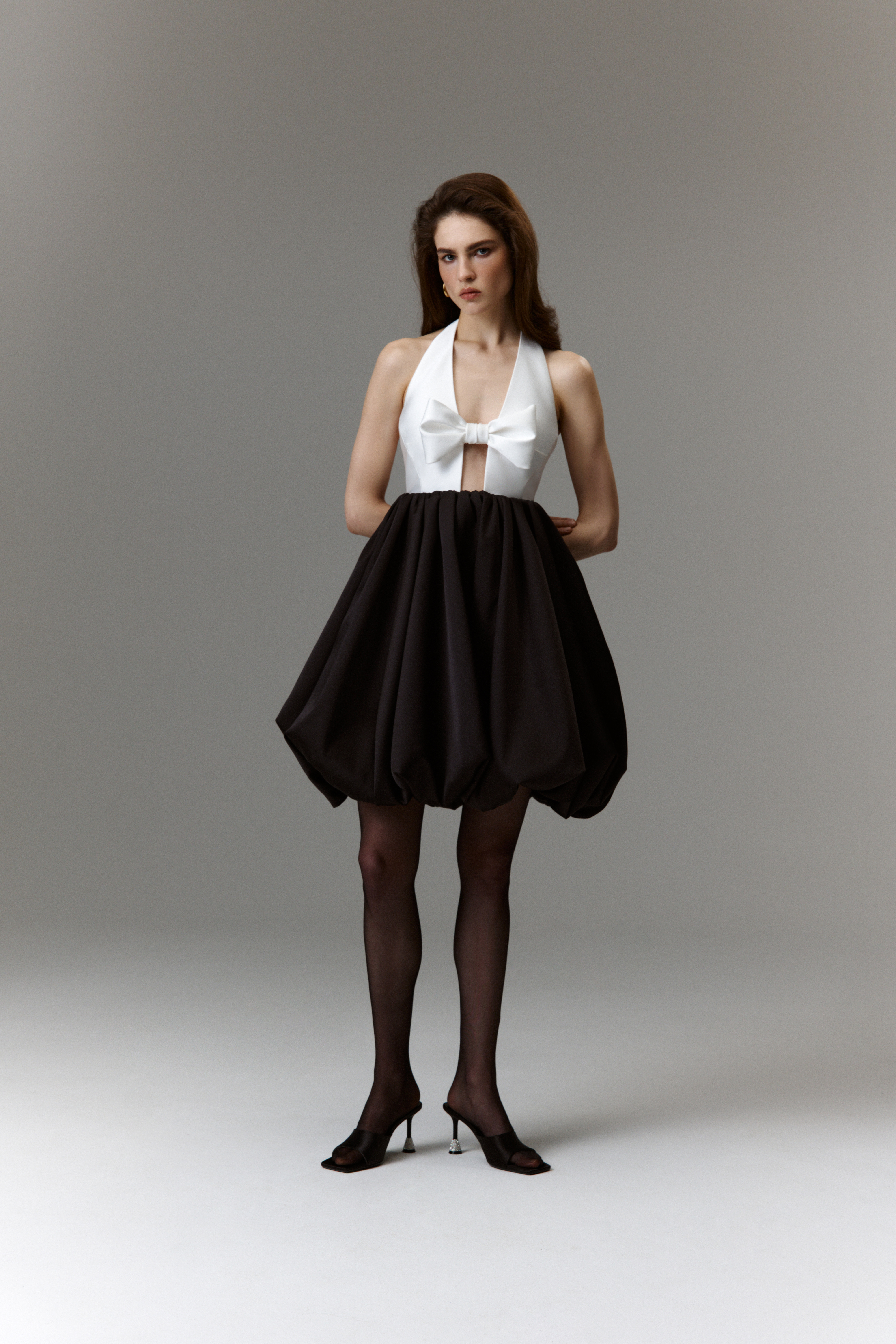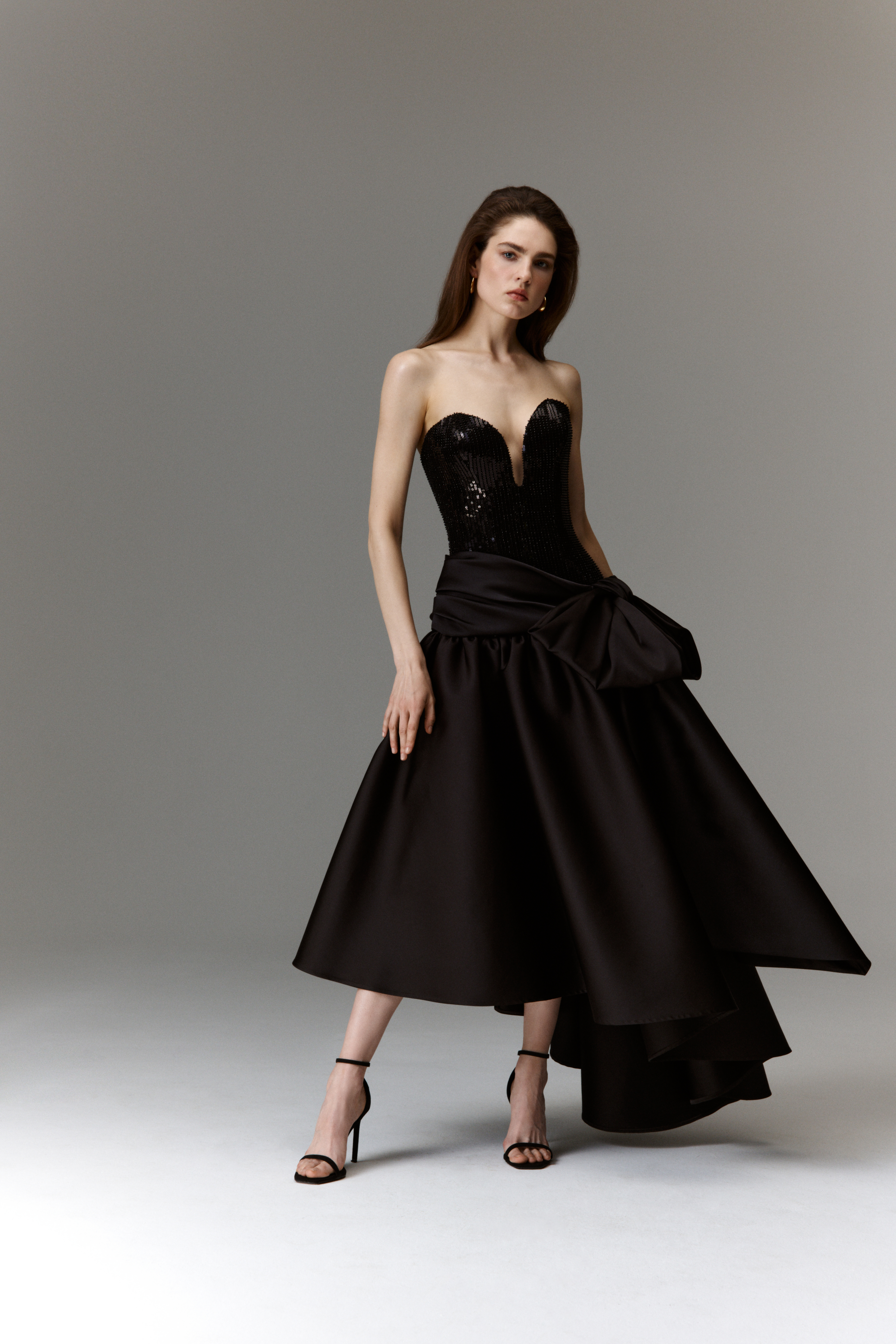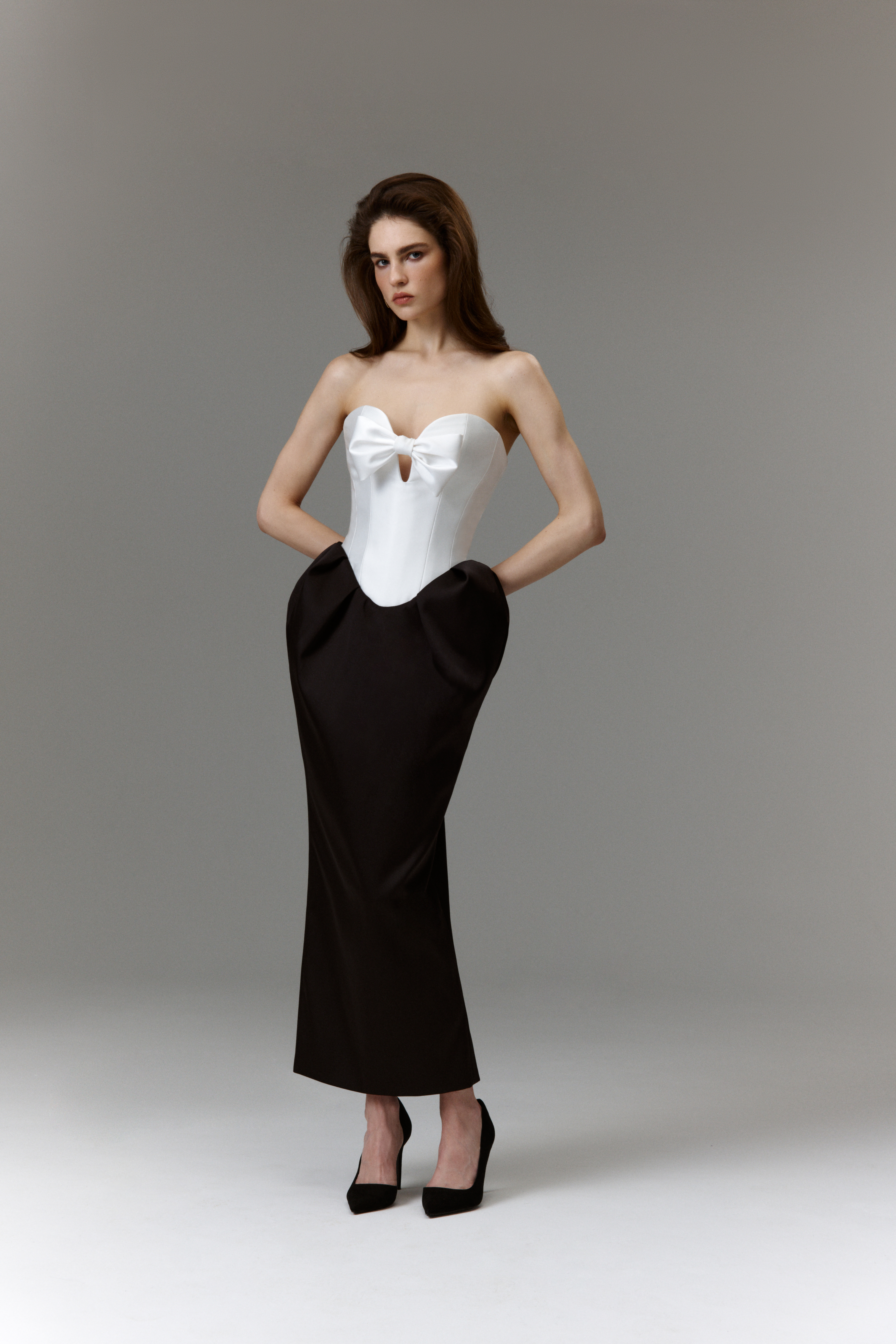 By seamlessly blending classic silhouettes with romantic touches, the collection radiates a whimsical charm. Intricate detailing and graceful evening dresses define its core, offering versatility for various occasions. A range of delicate bows, nostalgic godet dresses, open-back gowns, and corset-based bustiers are all designed to enhance and bring harmony the female figure, elevating the wearers' elegance.